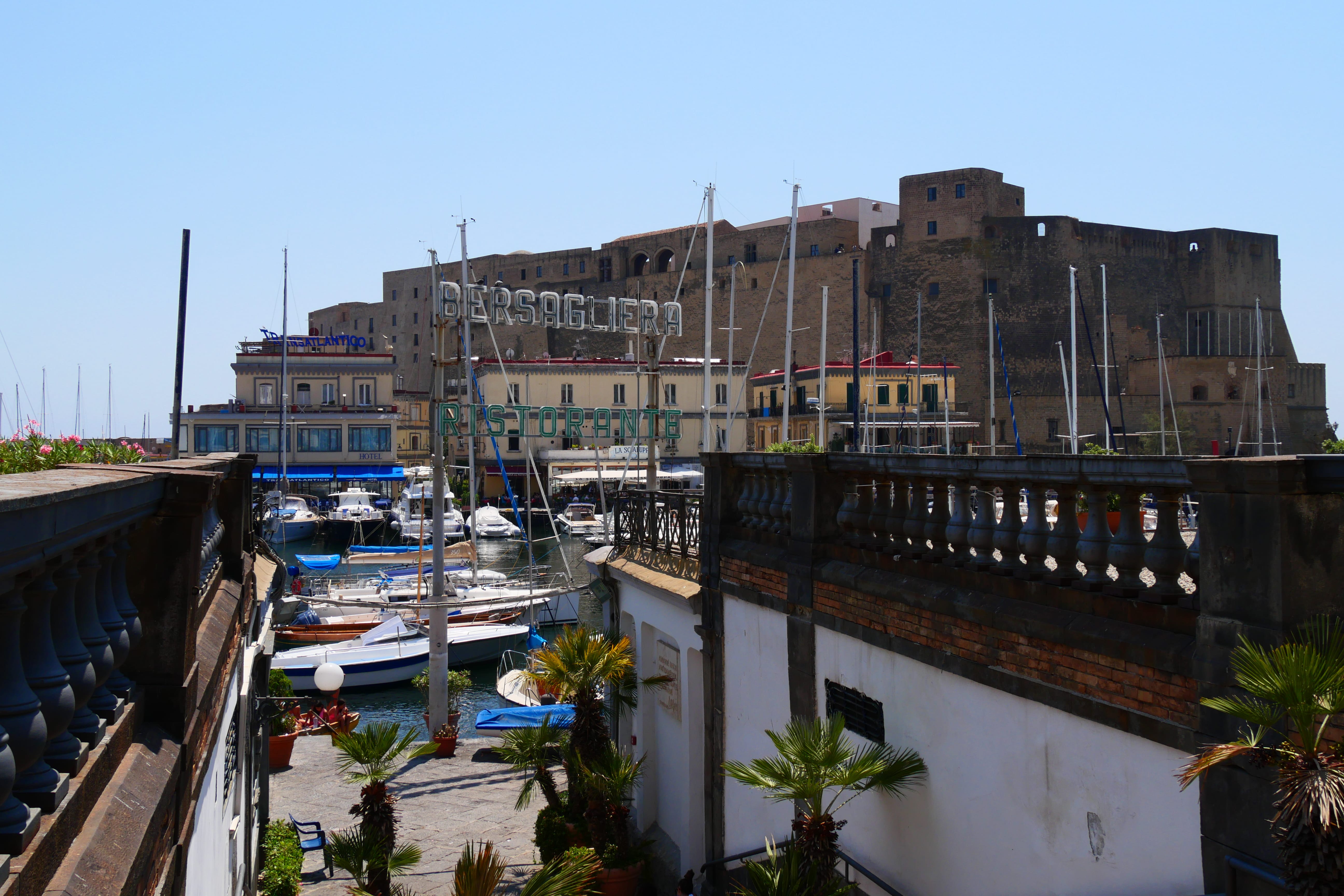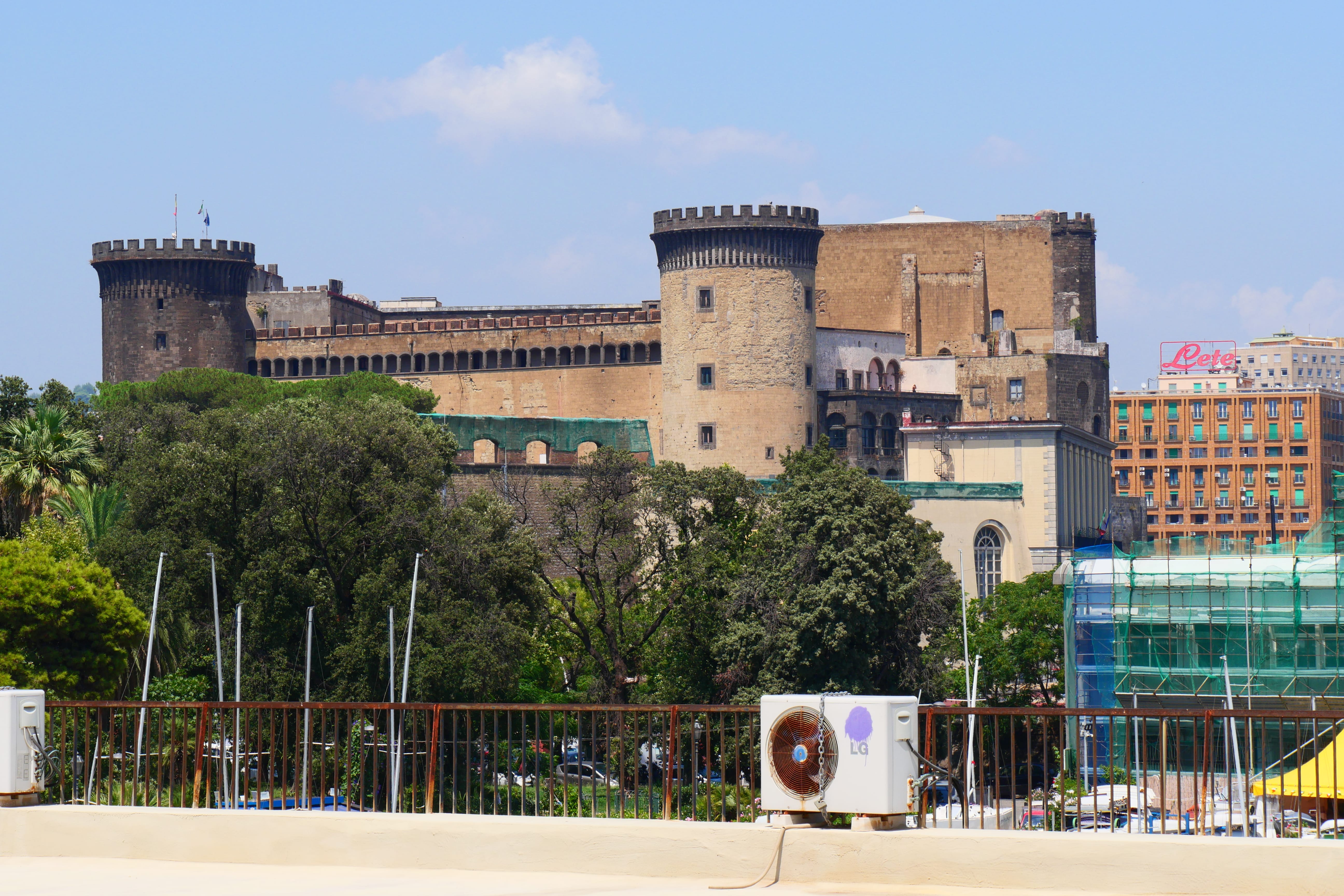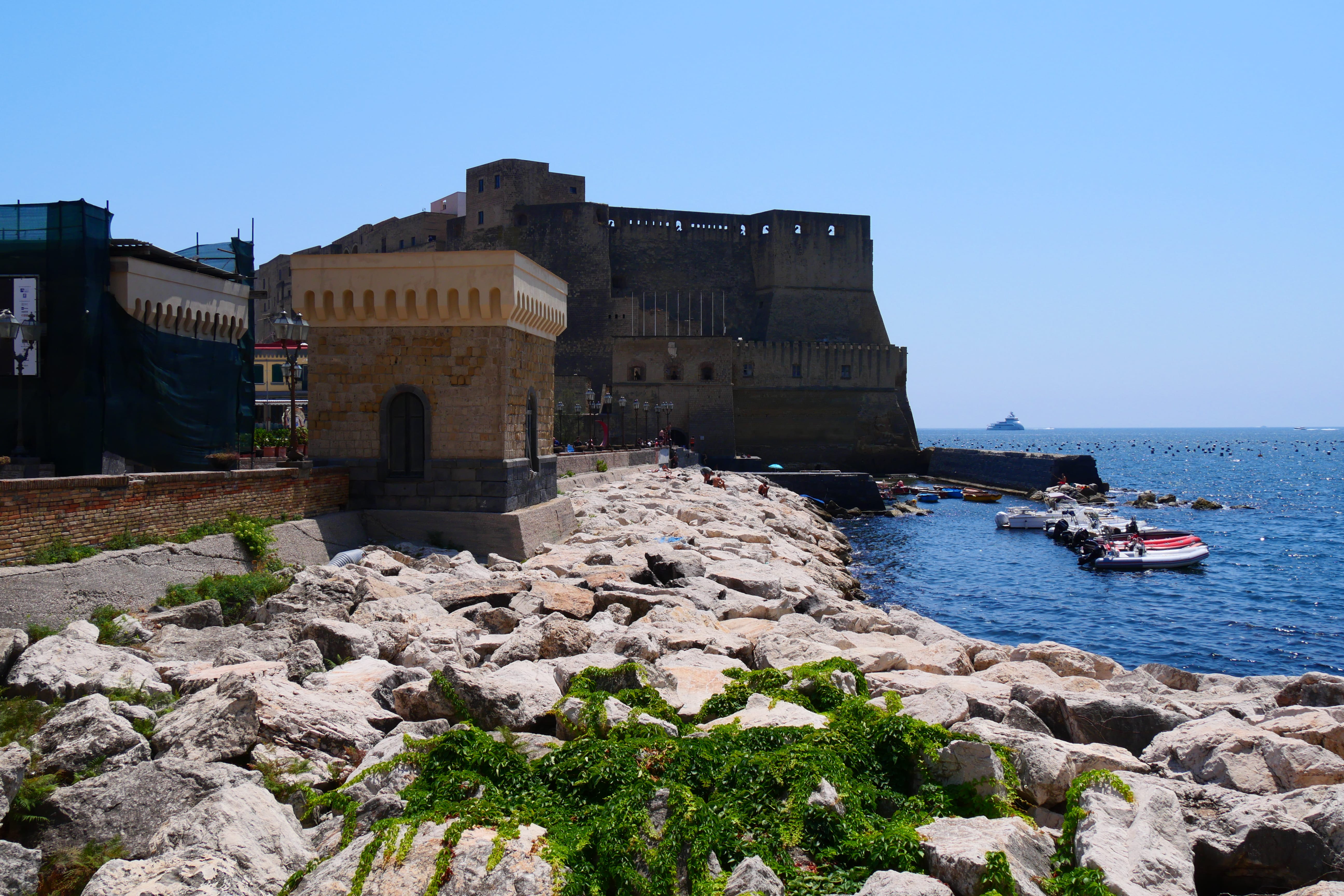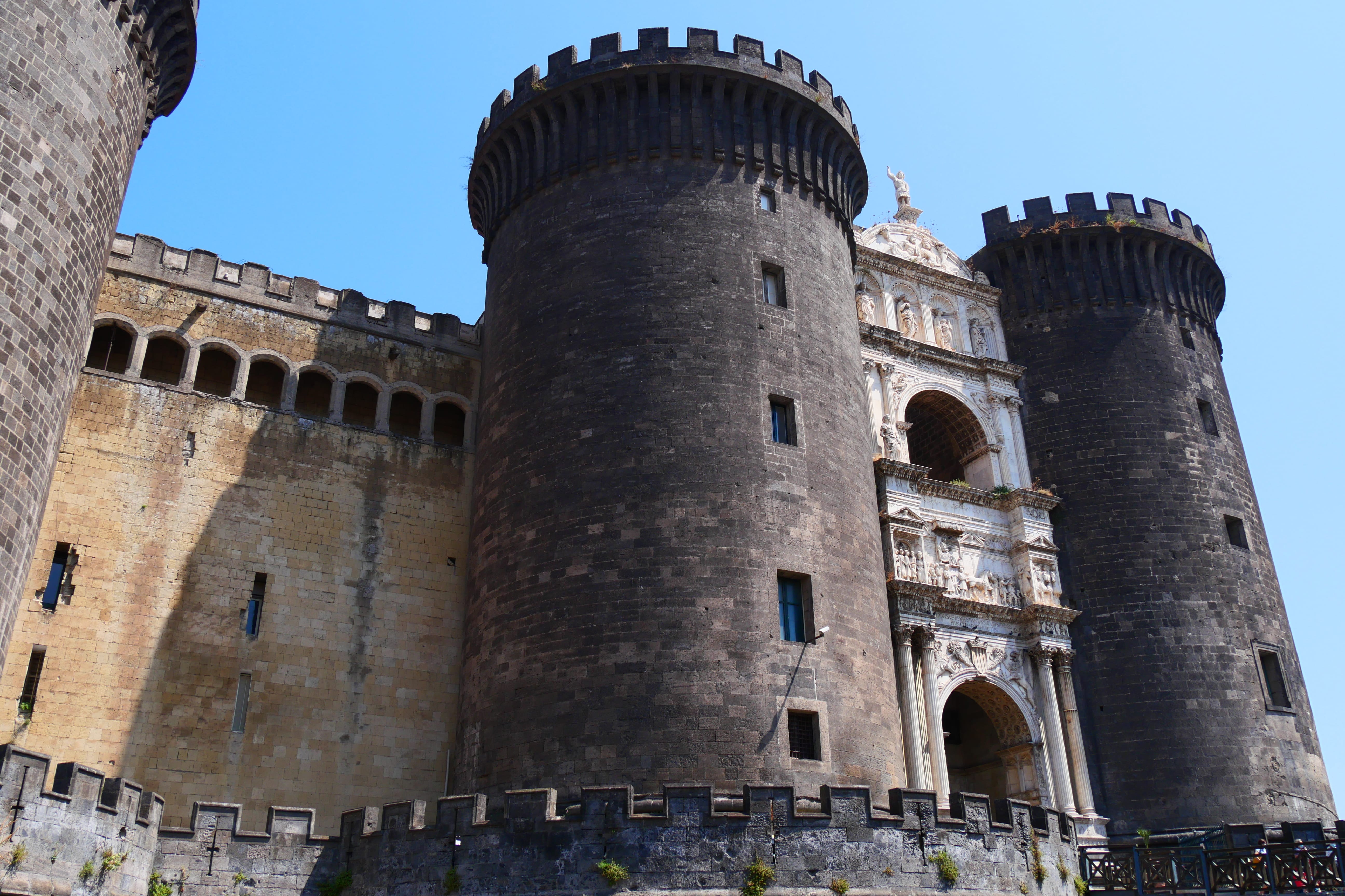 Impossible de venir à Naples sans y manger une vraie pizza napolitaine. Impossible également de faire le tri pour savoir où il serait mieux d’aller la trouver. Nous avons donc fait un choix de proximité. Puisque nous étions tout près de la Piazza del Plebiscito, nous avons sélectionné la Pizzeria Pavia à quelques dizaines de mètres de là. Se trouvant dans une ruelle à l’écart, elle était très petite, peu voire pas fréquentée par les touristes, et pratiquait des prix défiant toute concurrence. Une pizza Margherita toute simple à 3,50€ et une pizza Capricciosa à 6,50€ plus tard, satisfait de notre repas et de cette expérience, nous repartons en direction de la mer. Se dressent sur le front de mer deux châteaux : le Castel dell’ Ovo et le Castel Nuovo. Le premier est un château fort construit pour la première fois au VIIe siècle, le plus ancien de Naples. Le second, date de l’époque médiéval et a une structure plus gothique et plus particulière avec ses 5 tours.