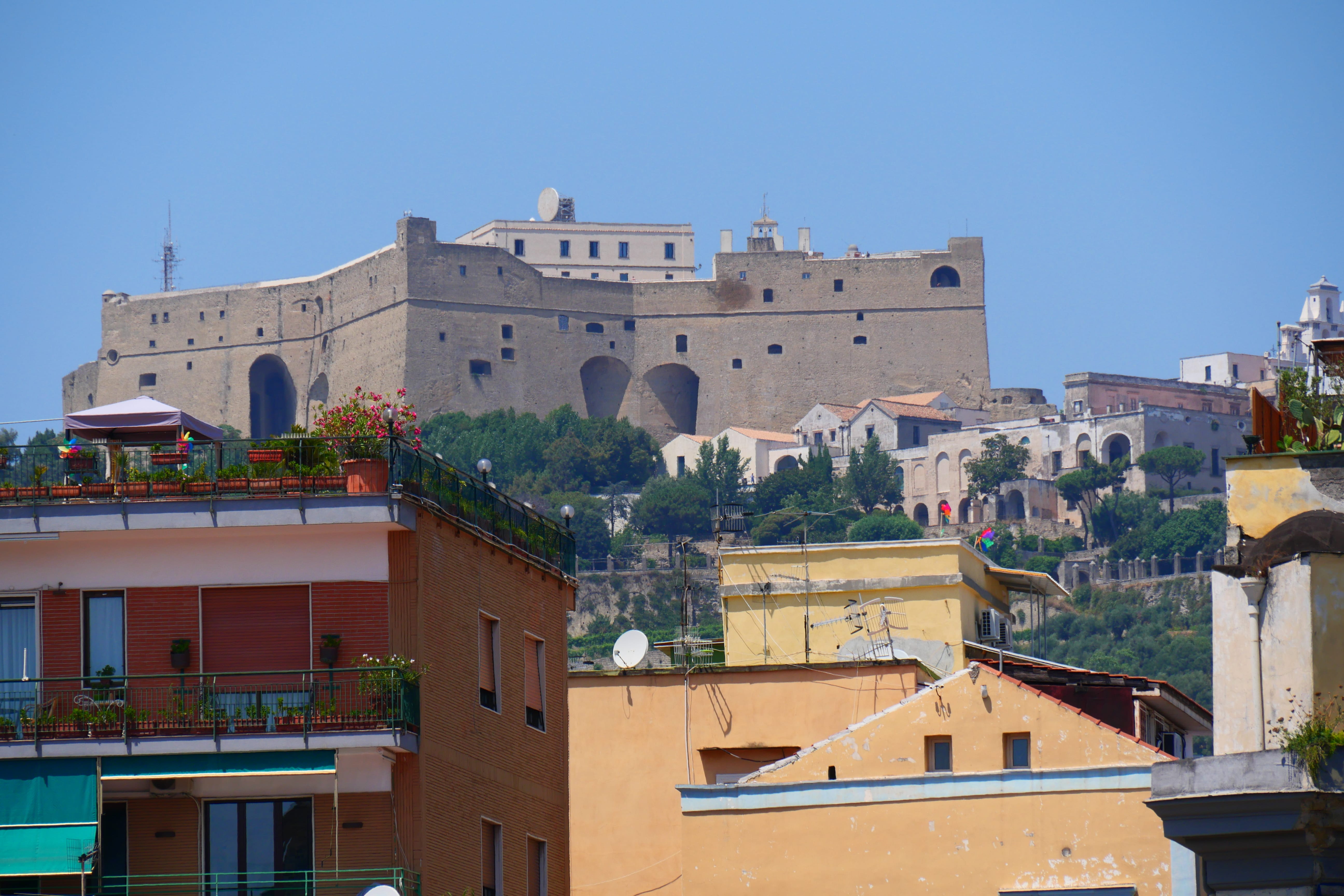 Les transports en commun à Naples ne sont pas particulièrement fiables ni bien développés dans toute la ville. Cependant, la fatigue nous gagnant en plus de la chaleur qui commençait à se faire plus imposante, nous avons choisi de rejoindre le Castel Sant’Elmo en funiculaire. Grâce à l’application UNICOCAMPANIA, nous avons pu prendre des billets de transports journaliers à 3,50€ par personne pour la fin de la journée. Encore une fois, il n’a pas été facile de trouver un trajet qui permettait de se rendre au plus près du château. En effet, à la sortie du funiculaire, il a encore fallu marcher pendant une vingtaine de minutes pour y arriver. Après tout ce périple, nous n’allions pas nous défiler et ne pas payer les 5€ d’entrée par personne qui permettent d’avoir accès au château et surtout à sa terrasse panoramique. Il n’y a rien d’autre à y voir, mais la vue à 360° sur la ville et ses environs en vaut la peine. Nous en profiterons pendant de longues minutes avant de reprendre la direction du centre puis d’un supermarché pour nous ravitailler pour le soir et rentrer nous reposer.