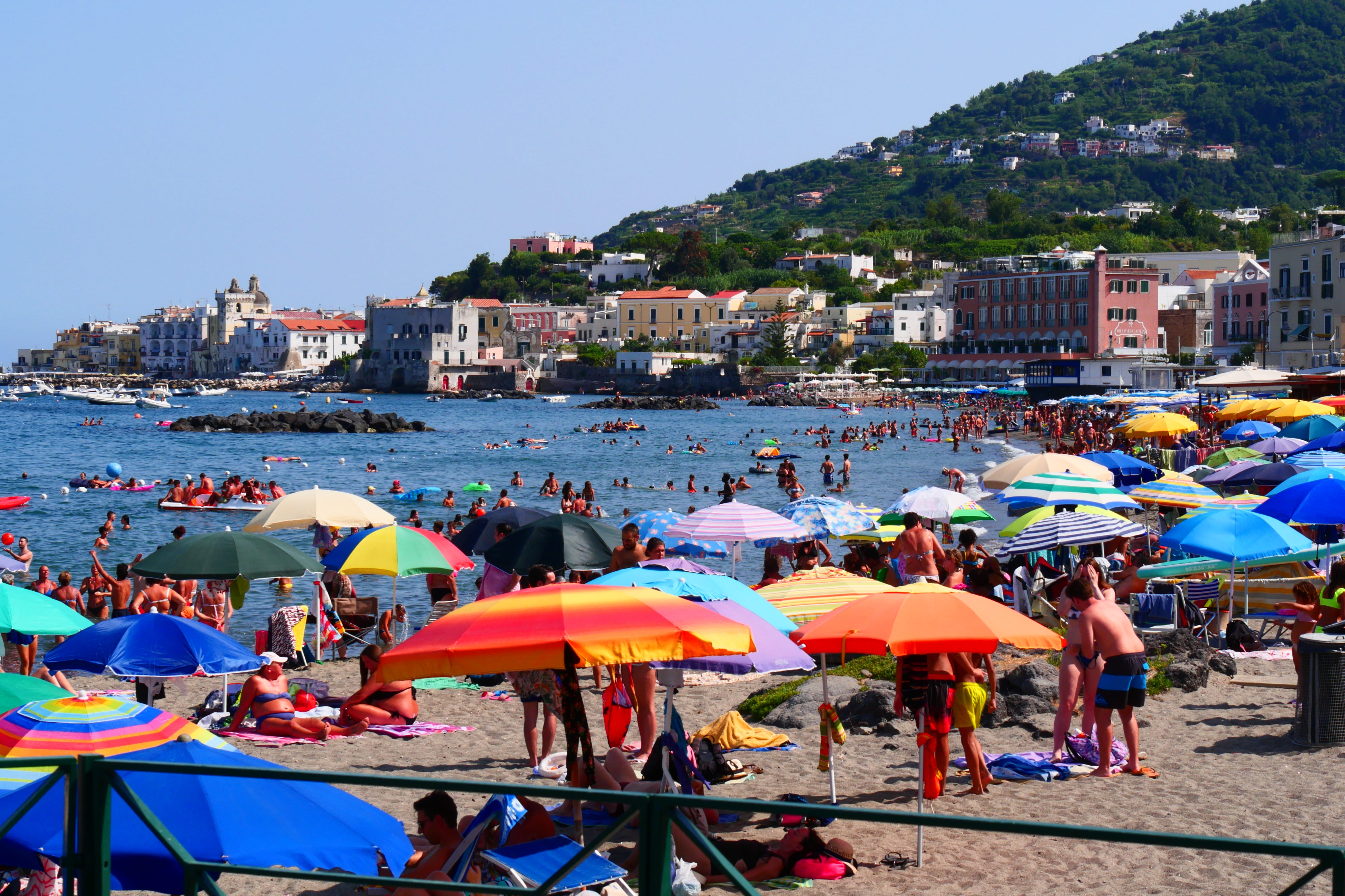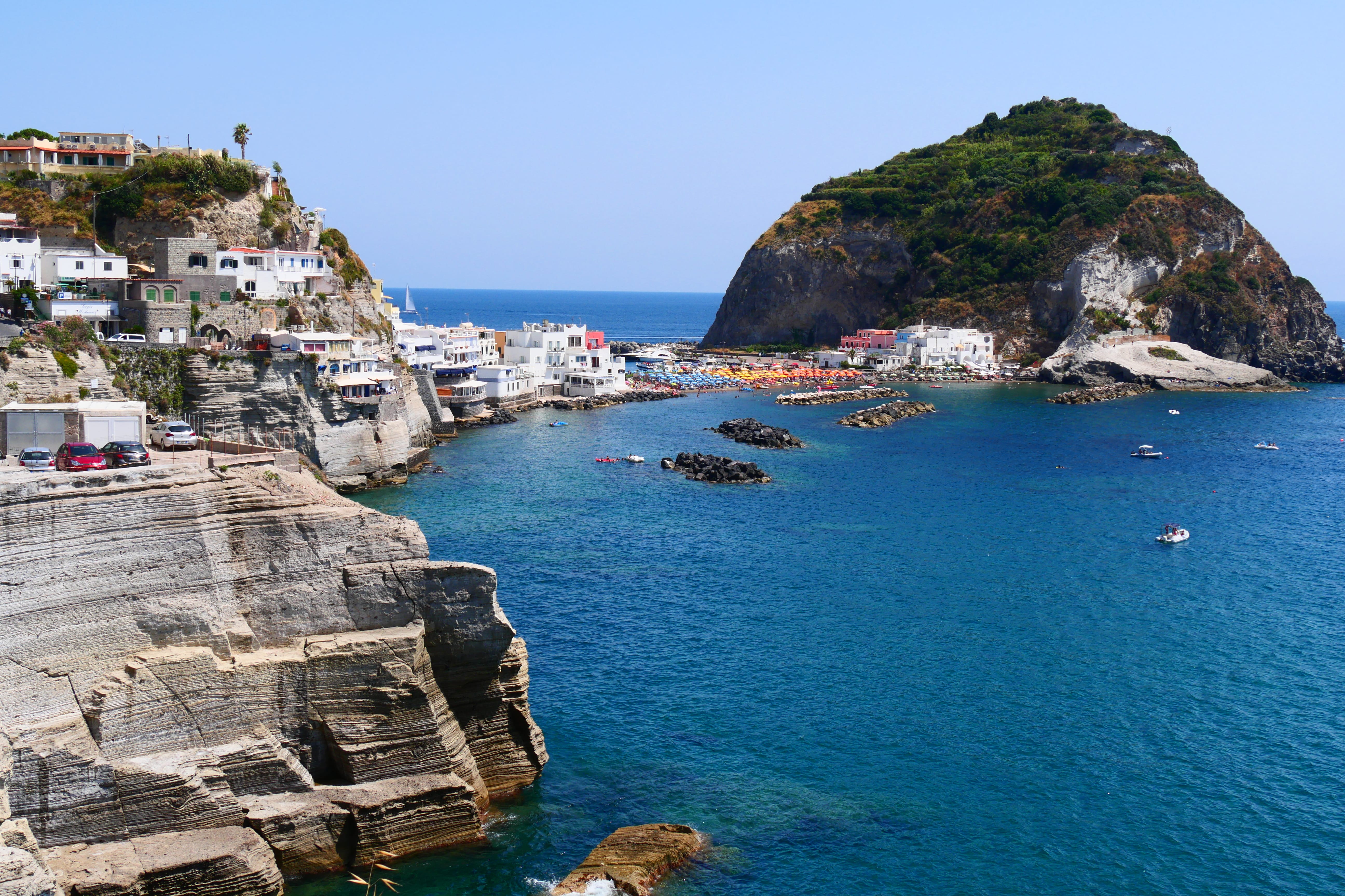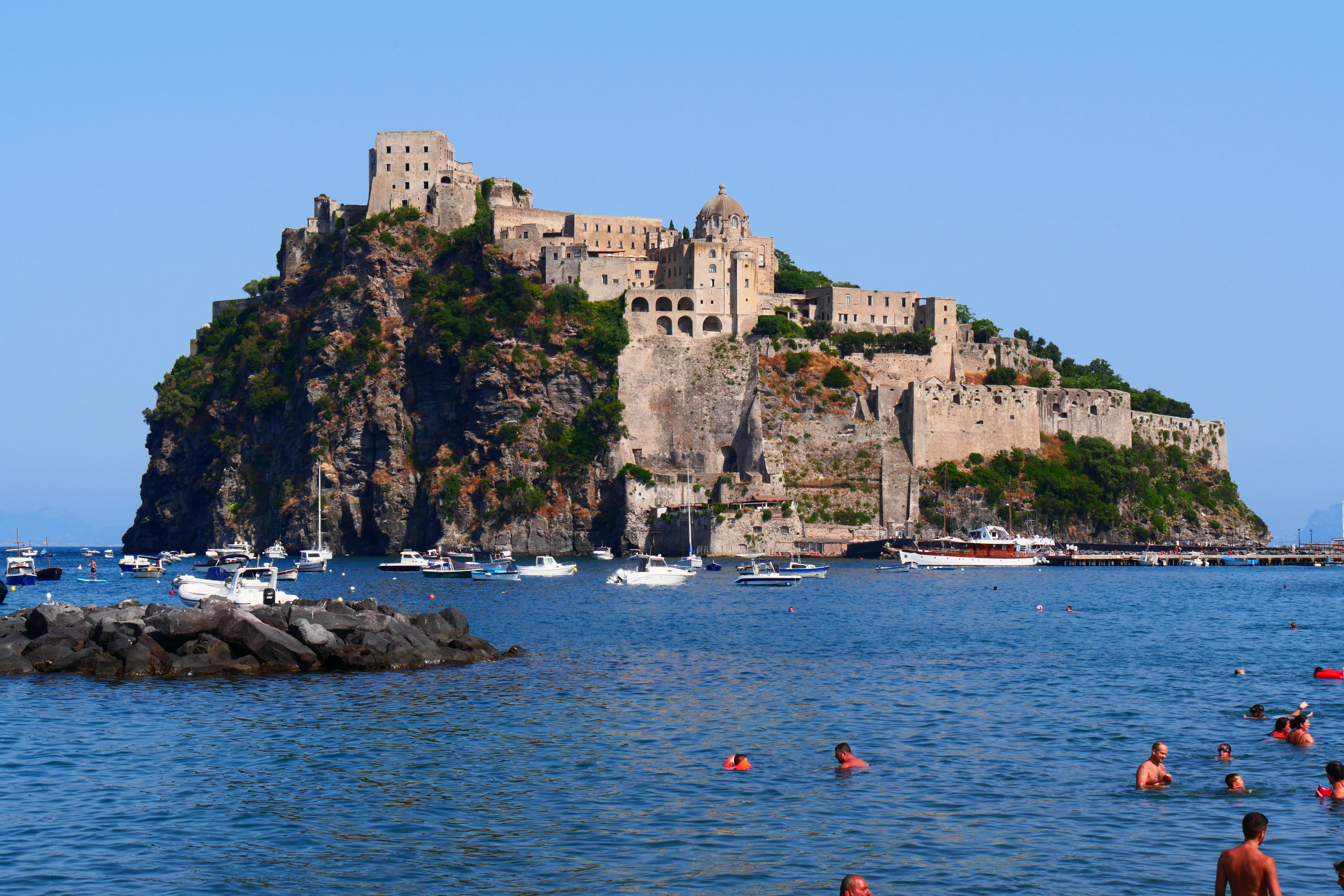 Le trajet vers l’île dure environ 1h30 avec un arrêt sur l’île de Procida sur le chemin. En arrivant, nous nous dirigeons directement vers la gare de bus. Il y a un guichet où il est possible d’acheter les billets de bus. L’île étant assez vaste, nous savons que nous ne pourrons pas nous passer des transports et choisissons donc de prendre des billets journaliers à 4,50€ par personne. Comme nous pouvions l’anticiper, les bus sont pleins et il faut jouer des coudes pour pouvoir y monter. A cause des horaires de bateau, nous n’aurons finalement que 5 petites heures à consacrer à la visite de l’île et nous commencerons donc par un arrêt à Casamicciola puis Forio, où nous déjeunerons en terrasse. Ces villages sont assez similaires mais chacun à son charme propre. Nous nous approcherons ensuite de Sant’Angelo. Ce village n’est pas accessible en transports et il faut donc y descendre à pied le long d’une rue bordée de maisonnettes blanches et qui mène aux plages et à la Punta Sant’Angelo. Nous reprendrons ensuite le bus pour finir notre tour de l’île et descendrons à proximité de la Spiaggia dei Pescatori (la plage des pêcheurs). Nous l’avons longée jusqu’au Castello Aragonese pour finalement reprendre le bus jusqu’au port, l’heure de notre ferry approchant rapidement.
