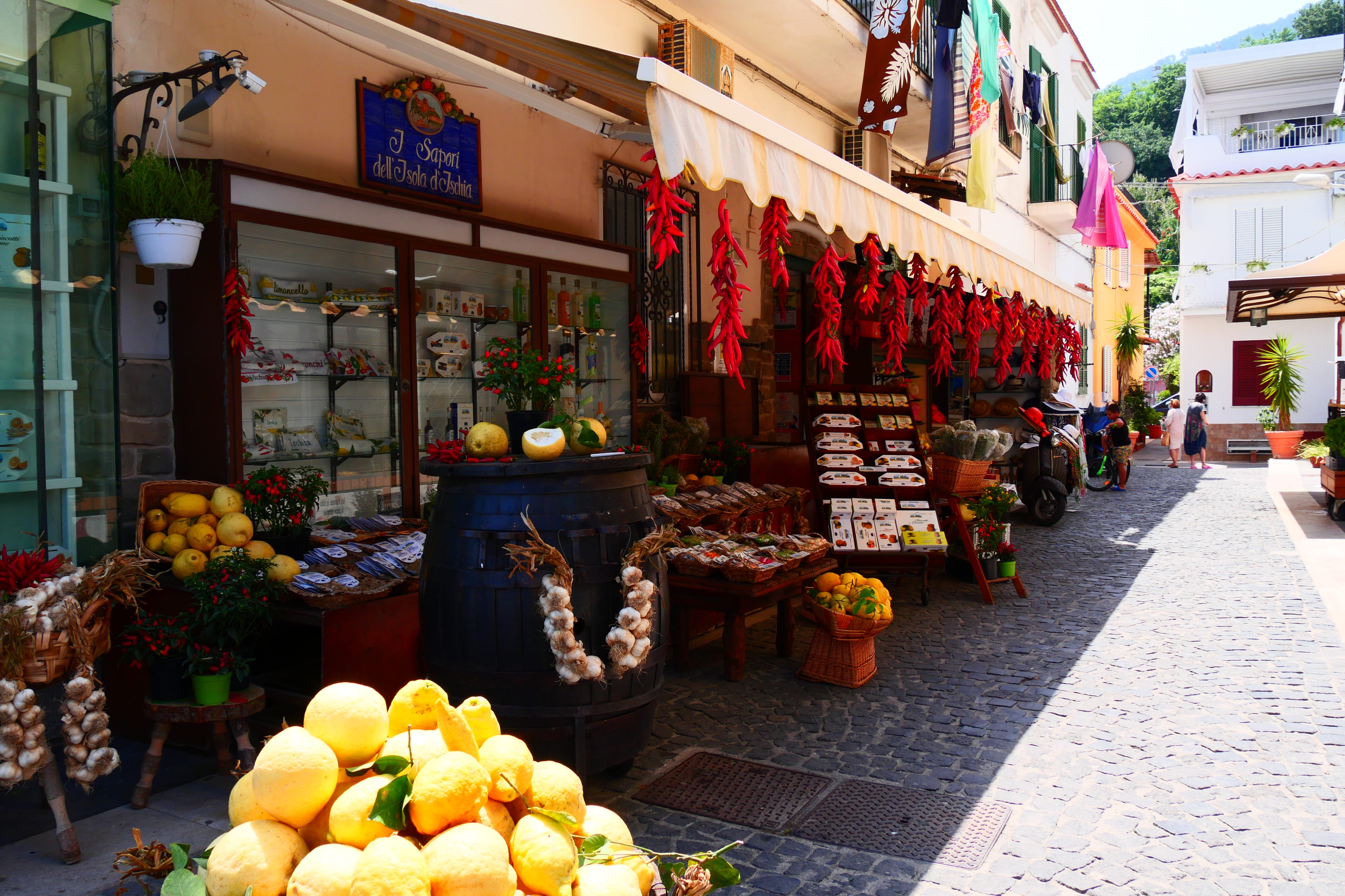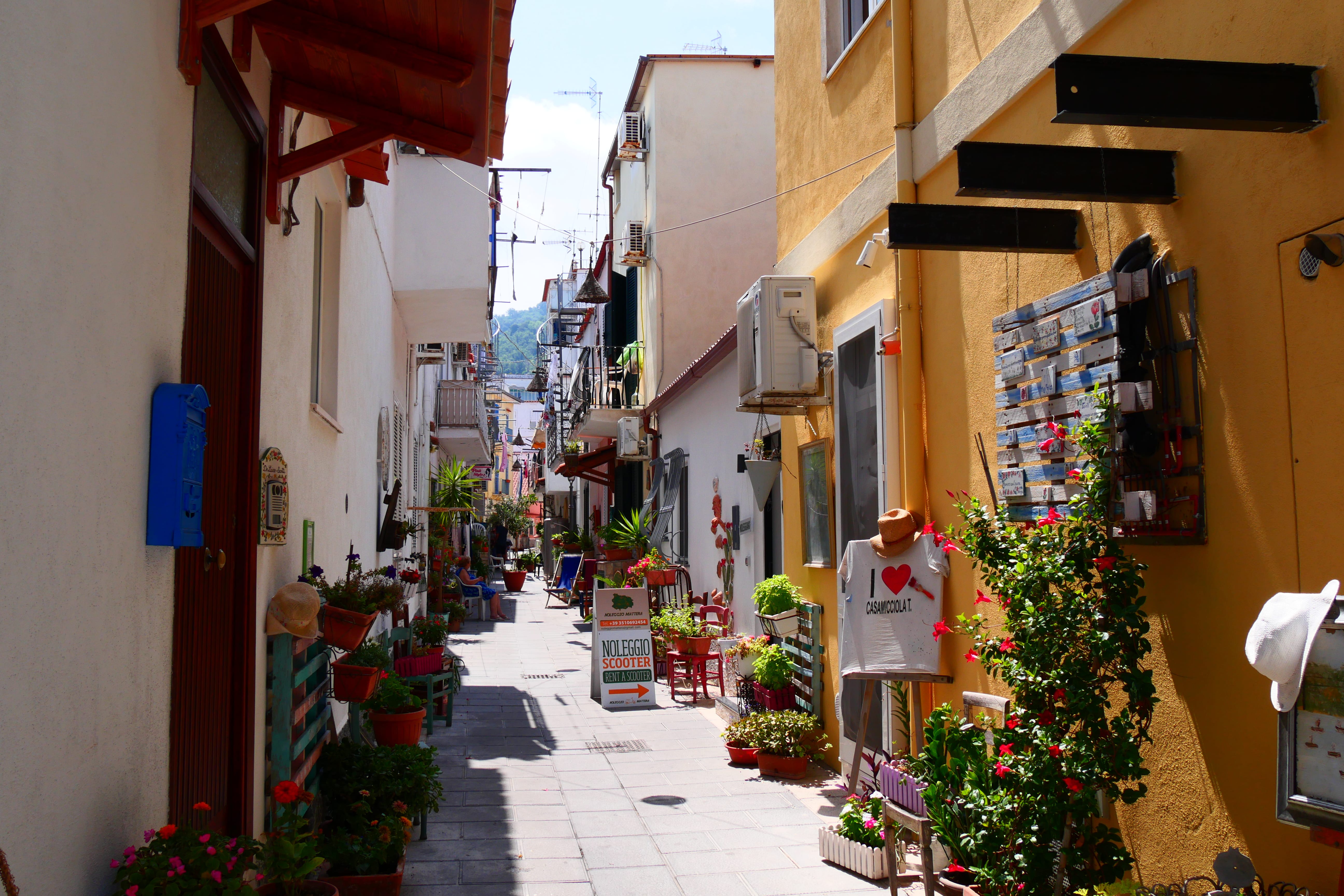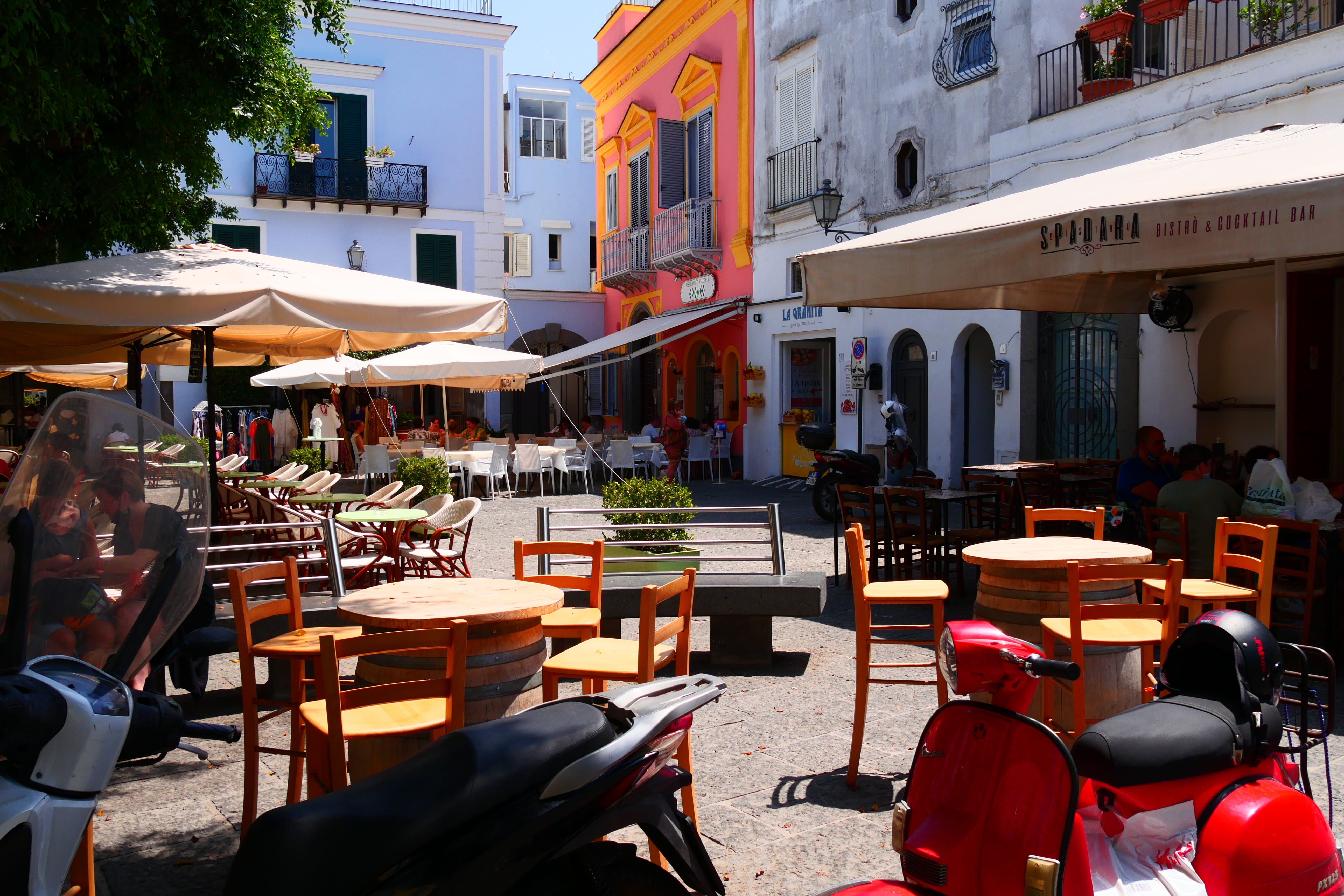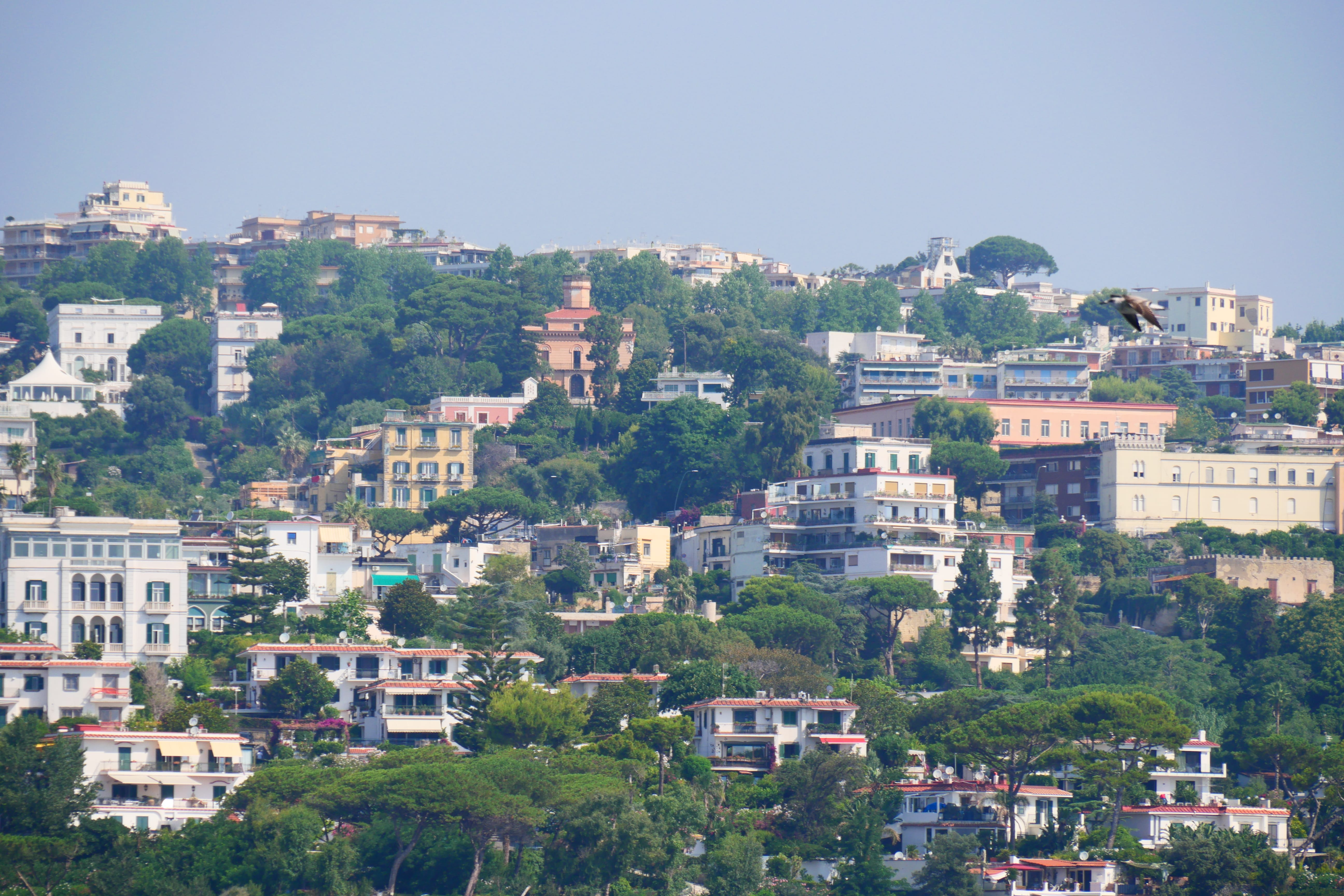 Le trajet vers l’île dure environ 1h30 avec un arrêt sur l’île de Procida sur le chemin. En arrivant, nous nous dirigeons directement vers la gare de bus. Il y a un guichet où il est possible d’acheter les billets de bus. L’île étant assez vaste, nous savons que nous ne pourrons pas nous passer des transports et choisissons donc de prendre des billets journaliers à 4,50€ par personne. Comme nous pouvions l’anticiper, les bus sont pleins et il faut jouer des coudes pour pouvoir y monter. A cause des horaires de bateau, nous n’aurons finalement que 5 petites heures à consacrer à la visite de l’île et nous commencerons donc par un arrêt à Casamicciola puis Forio, où nous déjeunerons en terrasse. Ces villages sont assez similaires mais chacun à son charme propre. Nous nous approcherons ensuite de Sant’Angelo. Ce village n’est pas accessible en transports et il faut donc y descendre à pied le long d’une rue bordée de maisonnettes blanches et qui mène aux plages et à la Punta Sant’Angelo. Nous reprendrons ensuite le bus pour finir notre tour de l’île et descendrons à proximité de la Spiaggia dei Pescatori (la plage des pêcheurs). Nous l’avons longée jusqu’au Castello Aragonese pour finalement reprendre le bus jusqu’au port, l’heure de notre ferry approchant rapidement.