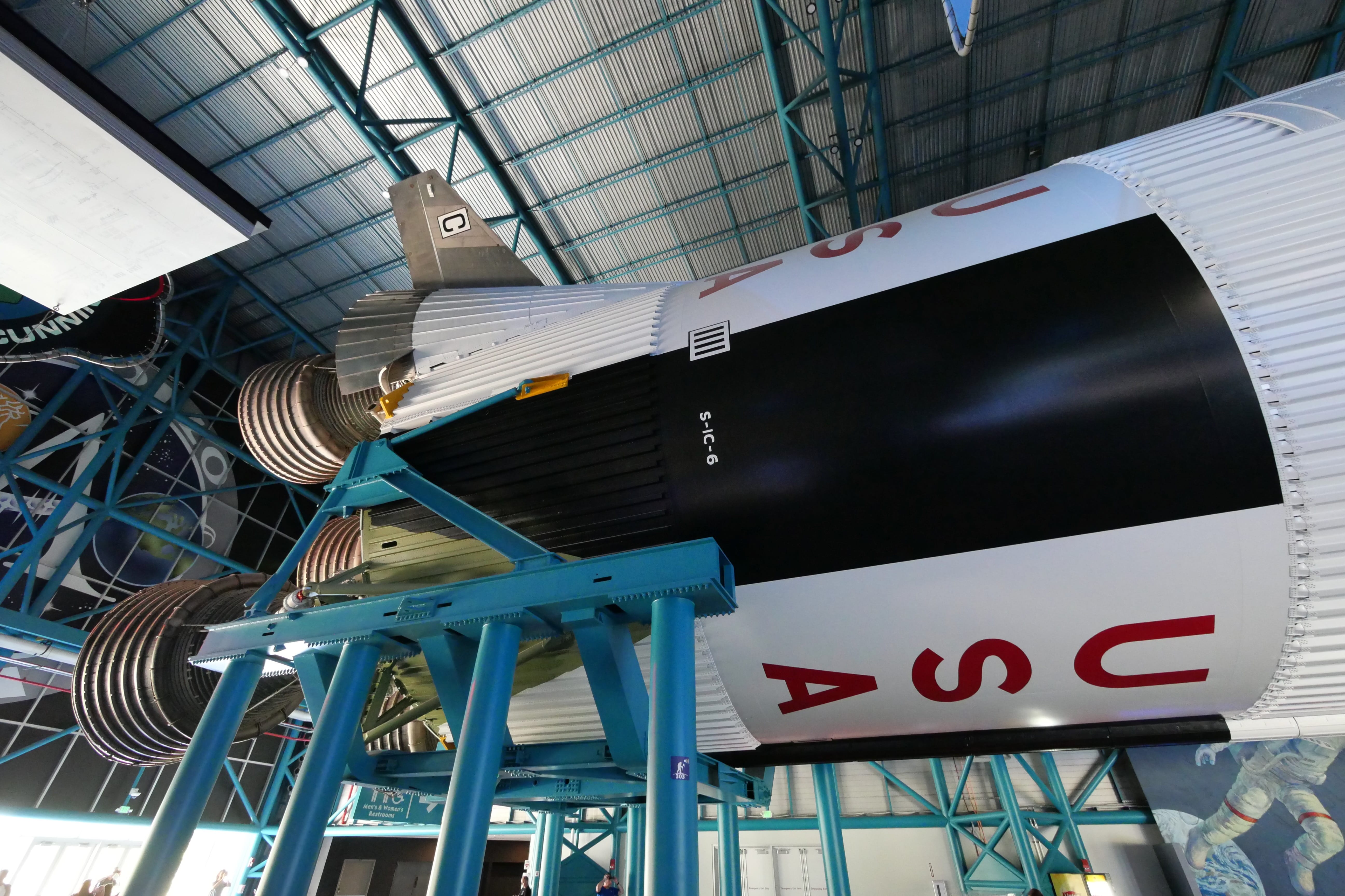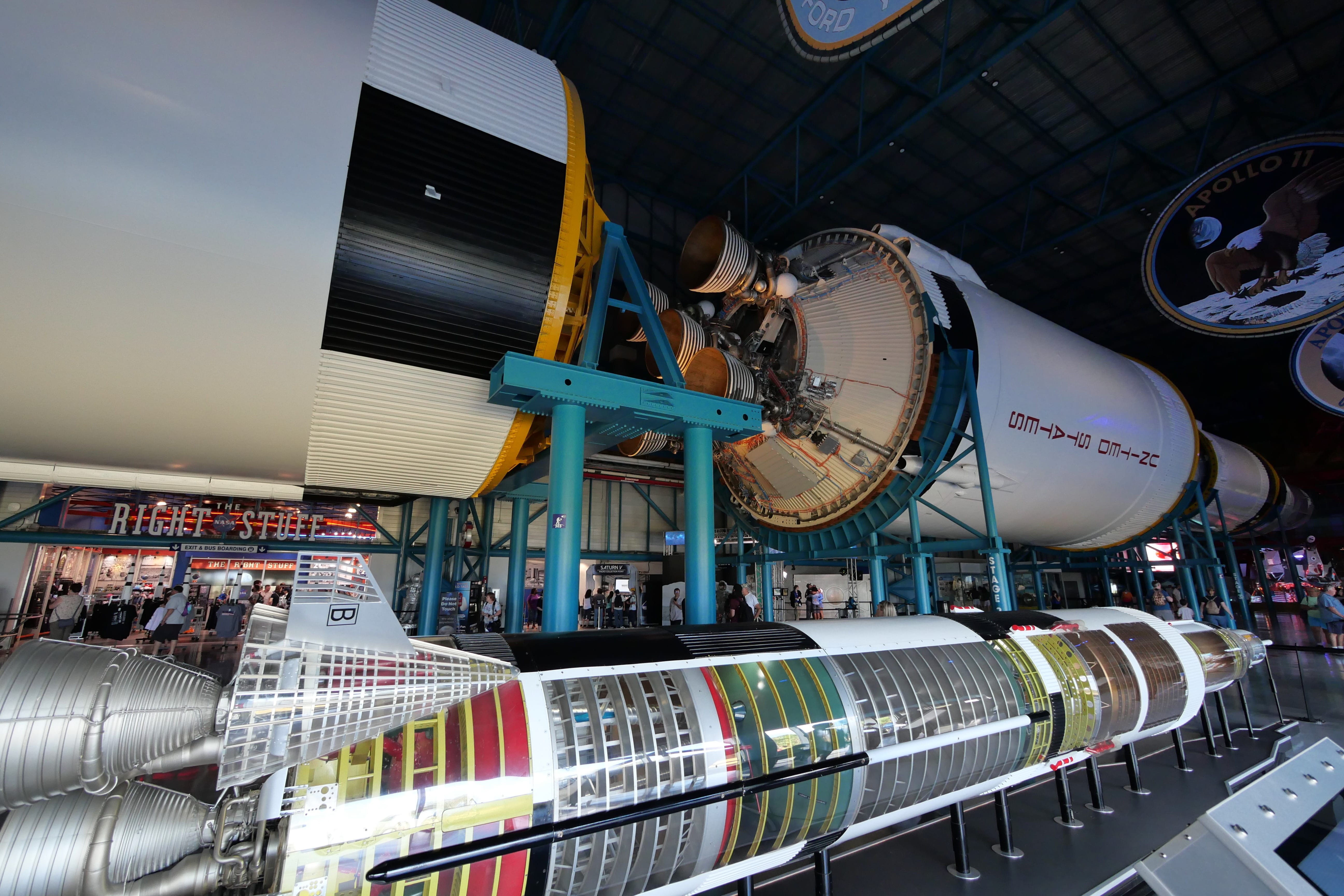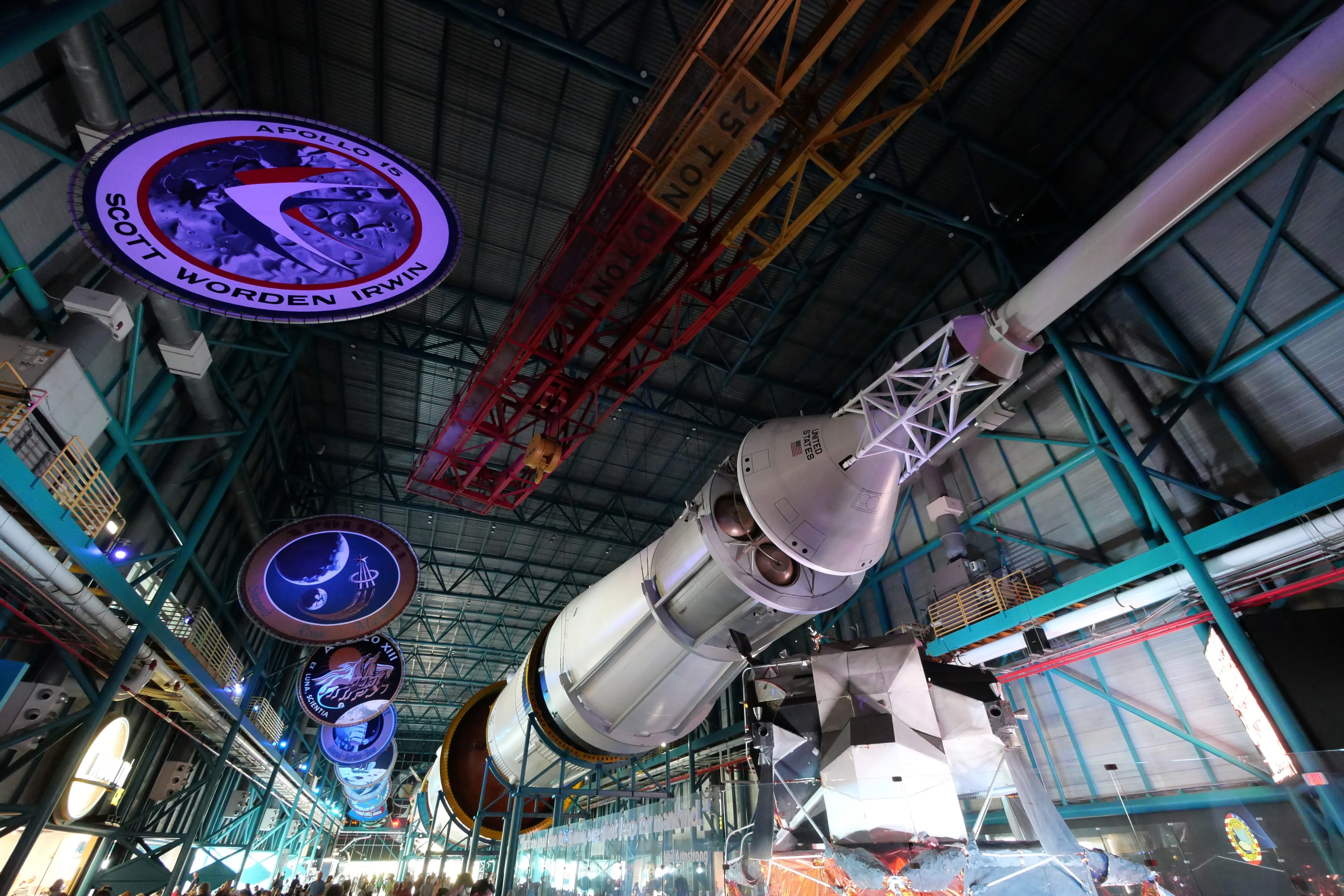 C’est donc en agençant les heures suivantes en fonction de ce que l’un et l’autre nous voulions voir, que nous avons décidés d’assurer notre visite de l’autre incontournable du KSC, le hangar du lanceur Saturn V, pour le programme des missions Apollo. Malgré la très bonne organisation pour les navettes emmenant les visiteurs du KSC jusqu’au complexe où se situe la fusée, nous aurons largement le temps de la file pour déjeuner sur le pouce et ainsi optimiser notre temps. Une fois dans le bus, une vidéo et notre chauffeur à l’accent plutôt russe que texan, nous permettront d’en apprendre un peu plus sur ce que nous voyons, à la condition près de comprendre ces explications. Nous passons une première fois devant le VAB, orné d’un immense drapeau américain, et arrivons quelques minutes plus tard au hangar de Saturn V. Encore une fois, la mise en scène est au rendez-vous, et l’impatience d’apercevoir enfin la fusée grandit au fur et à mesure que l’on enchaîne les salles et les explications. On finit par entrer dans un immense hall, dans lequel on se retrouve au pied des tuyères à la base de la fusée, si grandes que l’on ne comprend pas tout de suite ce que l’on voit. On contourne la base du lanceur, pour en prendre la pleine mesure. Assurément, c’est pour nous la pièce maîtresse de la visite, la chose à faire absolument au KSC, et nous ne regrettons pas un instant d’en avoir fait notre priorité. L’autre attraction au moment où nous y étions était d’apercevoir Artemis 1, fusée du nouveau programme de la Nasa, avec pour objectif la Lune puis Mars dans les années à venir. On a pu l’apercevoir au téléobjectif alors qu’elle s’apprêtait à faire l’objet de tests préparatifs. Autant dire que l’occasion était assez unique, et qu’il nous était difficile de comprendre que certains ne semblaient même pas la remarquer…! Nous reprendrons notre tour de cette annexe après avoir pris le temps de faire quelques clichés souvenirs d’Artemis, et entre aperçus d’alunissage, de pierres de lune et autres artefacts de l’espace, nous profiterons d’un passage par la boutique pour rapporter un patch du programme Artemis 1, comme un symbole d’un petit moment d’histoire au KSC que nous aurons vécu.
