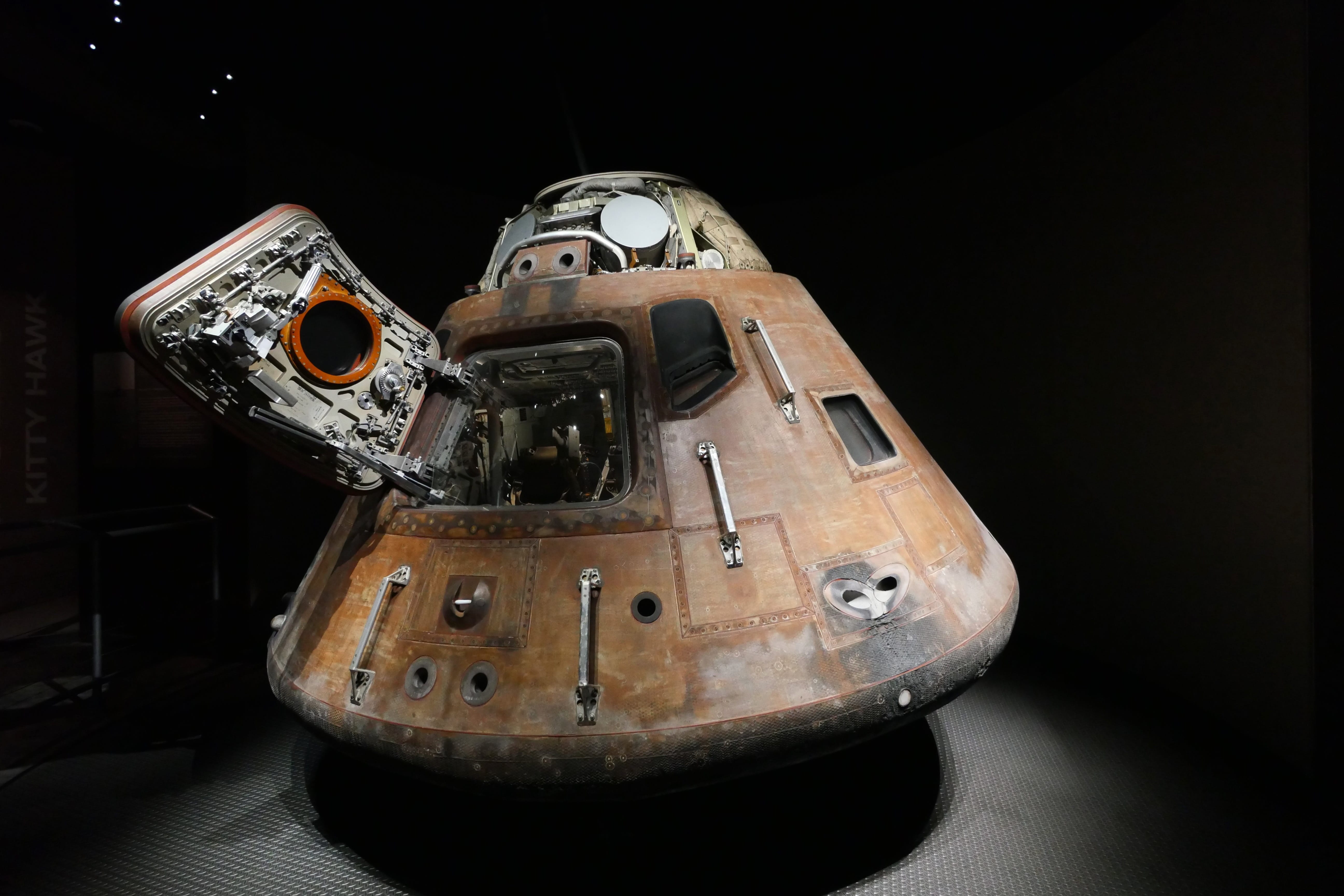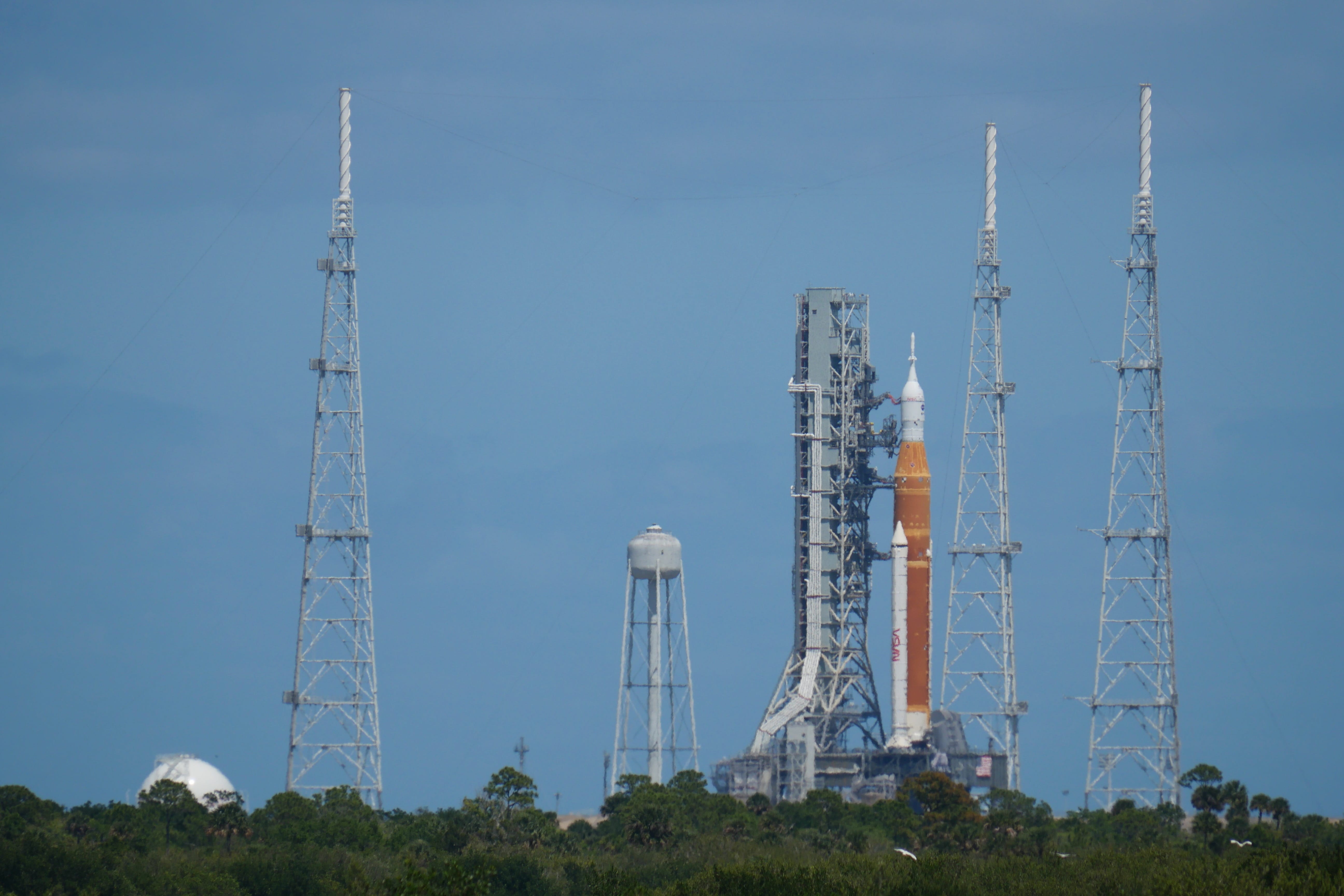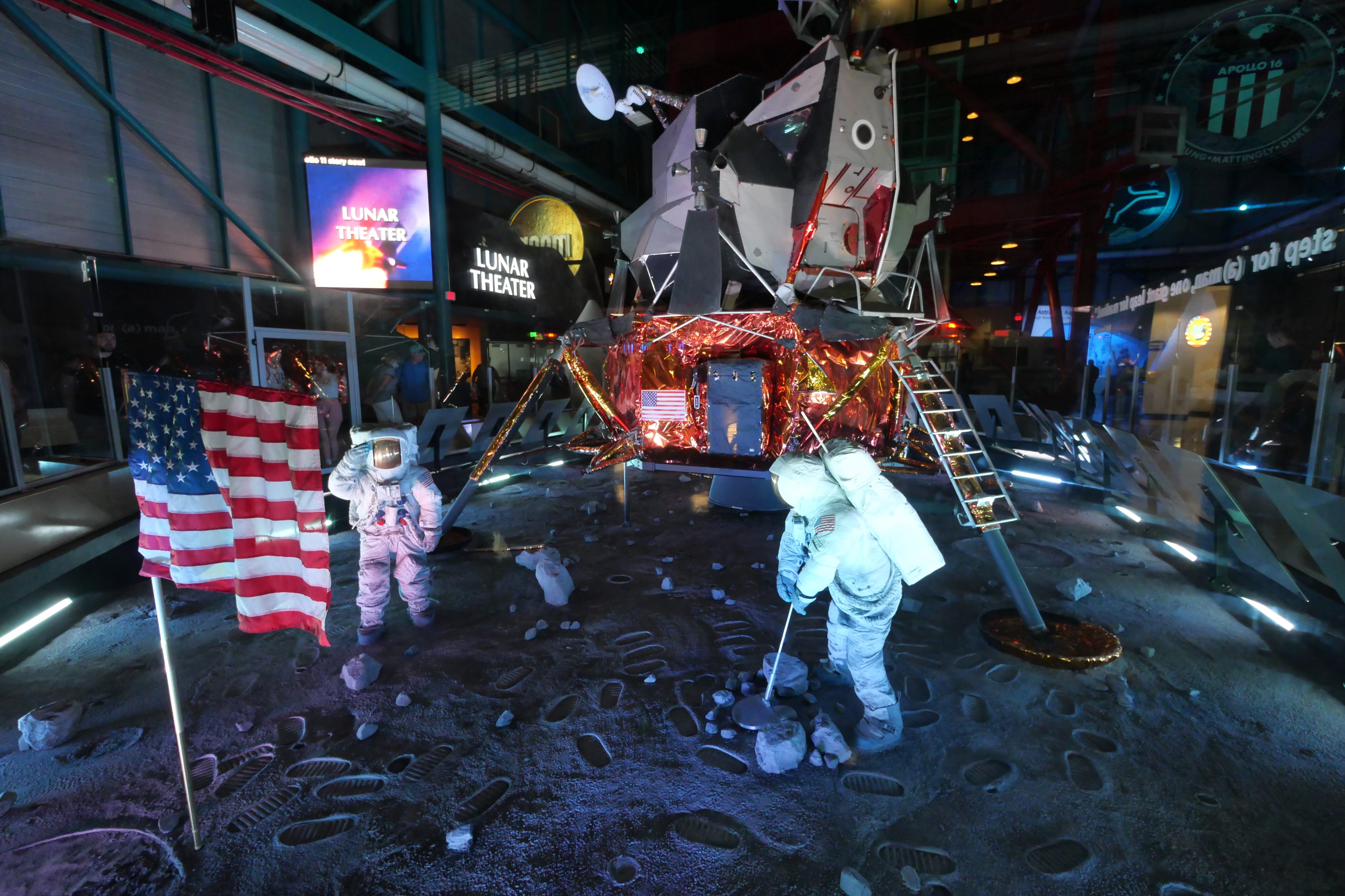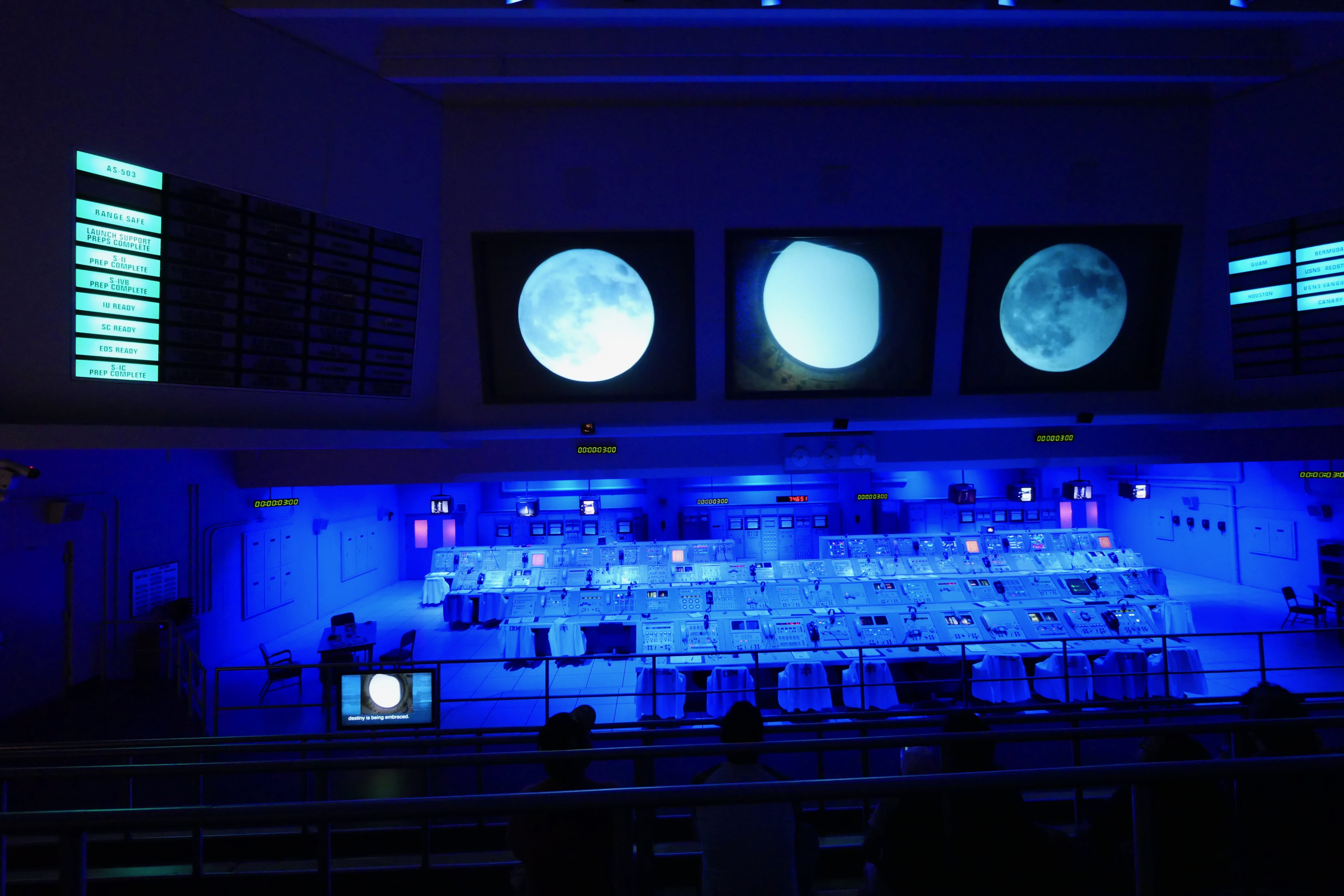 C’est donc en agençant les heures suivantes en fonction de ce que l’un et l’autre nous voulions voir, que nous avons décidés d’assurer notre visite de l’autre incontournable du KSC, le hangar du lanceur Saturn V, pour le programme des missions Apollo. Malgré la très bonne organisation pour les navettes emmenant les visiteurs du KSC jusqu’au complexe où se situe la fusée, nous aurons largement le temps de la file pour déjeuner sur le pouce et ainsi optimiser notre temps. Une fois dans le bus, une vidéo et notre chauffeur à l’accent plutôt russe que texan, nous permettront d’en apprendre un peu plus sur ce que nous voyons, à la condition près de comprendre ces explications. Nous passons une première fois devant le VAB, orné d’un immense drapeau américain, et arrivons quelques minutes plus tard au hangar de Saturn V. Encore une fois, la mise en scène est au rendez-vous, et l’impatience d’apercevoir enfin la fusée grandit au fur et à mesure que l’on enchaîne les salles et les explications. On finit par entrer dans un immense hall, dans lequel on se retrouve au pied des tuyères à la base de la fusée, si grandes que l’on ne comprend pas tout de suite ce que l’on voit. On contourne la base du lanceur, pour en prendre la pleine mesure. Assurément, c’est pour nous la pièce maîtresse de la visite, la chose à faire absolument au KSC, et nous ne regrettons pas un instant d’en avoir fait notre priorité. L’autre attraction au moment où nous y étions était d’apercevoir Artemis 1, fusée du nouveau programme de la Nasa, avec pour objectif la Lune puis Mars dans les années à venir. On a pu l’apercevoir au téléobjectif alors qu’elle s’apprêtait à faire l’objet de tests préparatifs. Autant dire que l’occasion était assez unique, et qu’il nous était difficile de comprendre que certains ne semblaient même pas la remarquer…! Nous reprendrons notre tour de cette annexe après avoir pris le temps de faire quelques clichés souvenirs d’Artemis, et entre aperçus d’alunissage, de pierres de lune et autres artefacts de l’espace, nous profiterons d’un passage par la boutique pour rapporter un patch du programme Artemis 1, comme un symbole d’un petit moment d’histoire au KSC que nous aurons vécu.