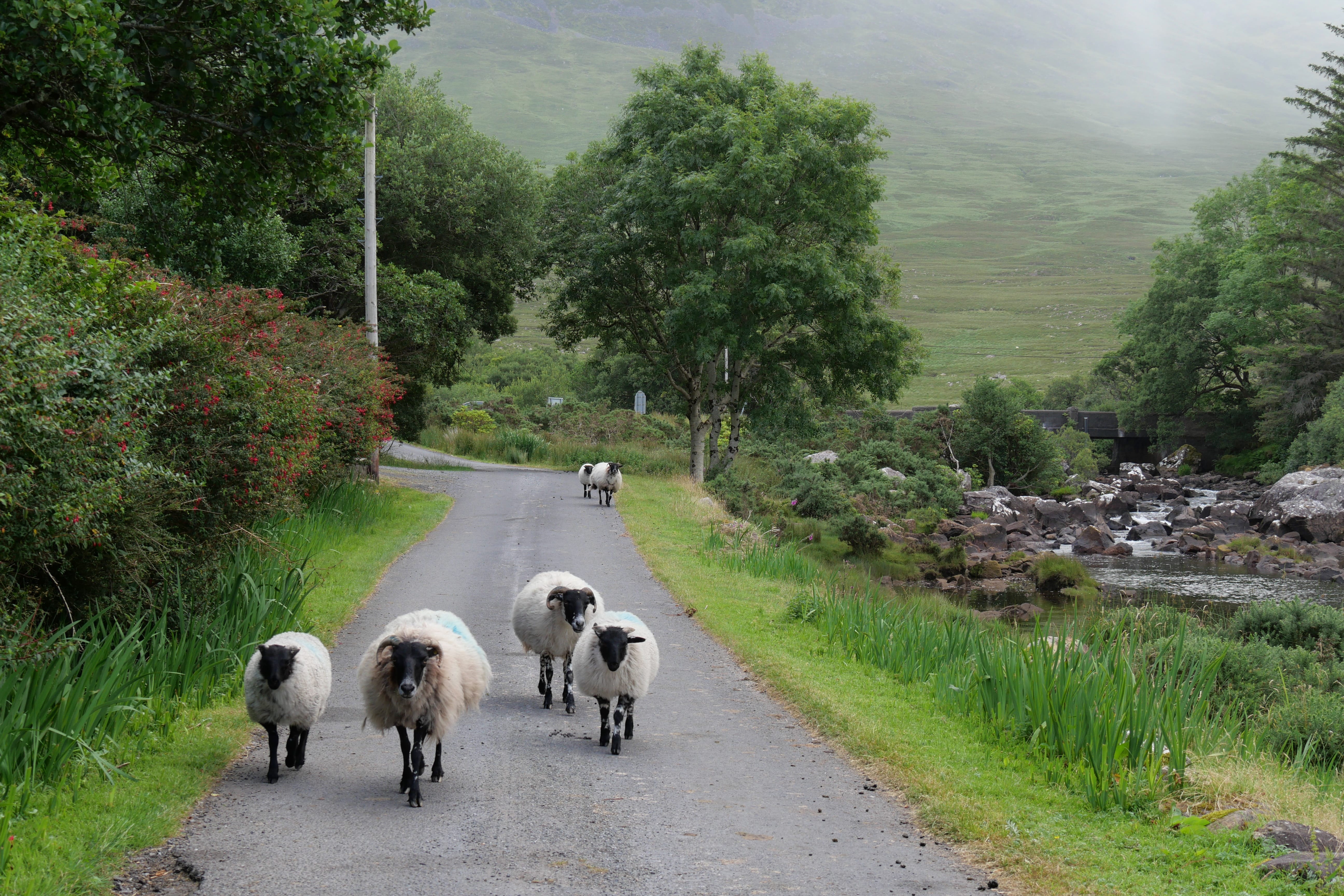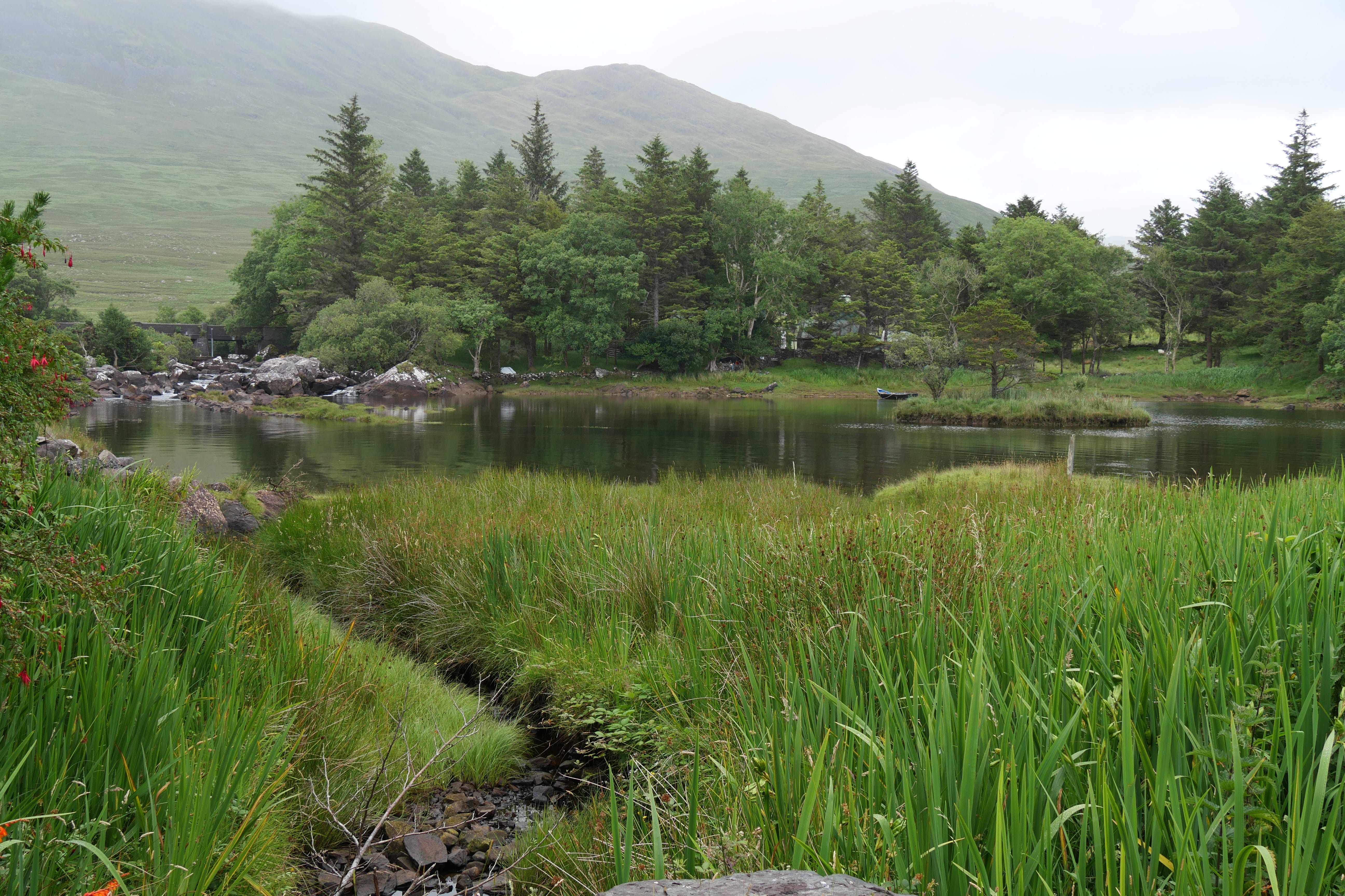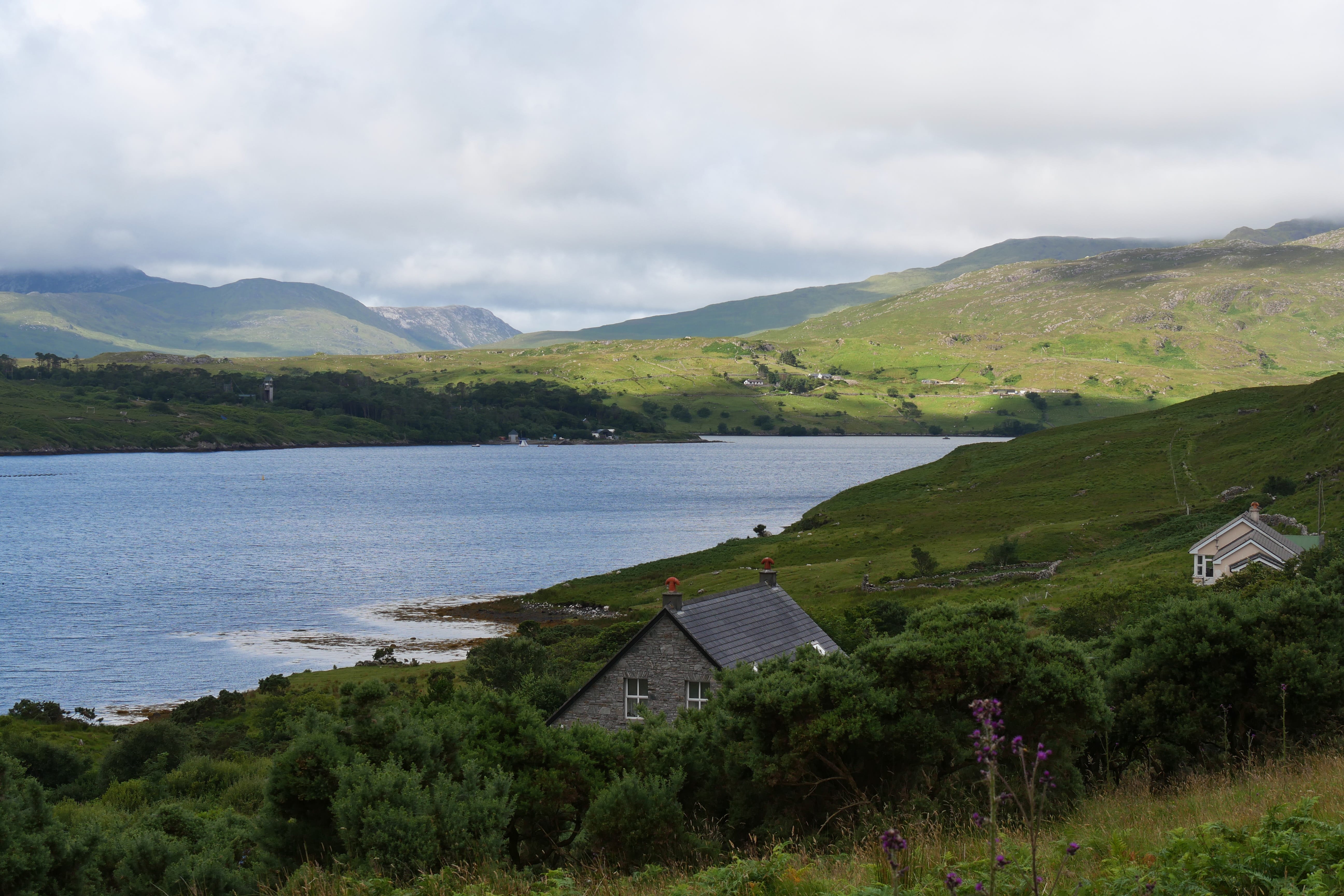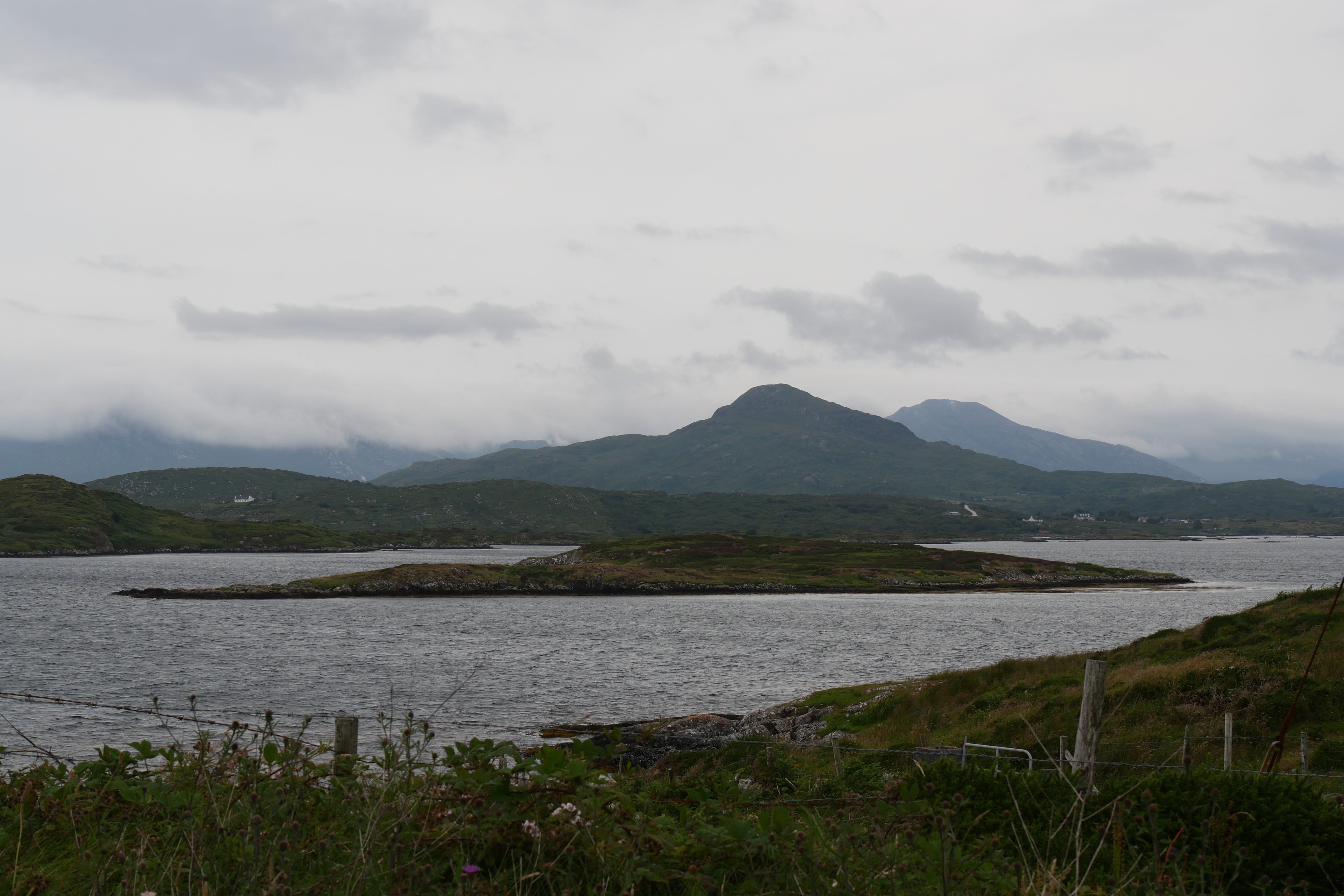 Après notre nuit à Galway, c’est en direction du Connemara que nous reprenons la route, avec une toute autre mélodie en tête ! Clairement, nous n’espérions pas vraiment mieux en termes de météo, avec un ciel bien gris, un peu d’humidité et parfois même de belles nappes de brouillard. Notre objectif, ce jour-là, était d’atteindre l’entrée du parc national du Connemara située à Letterfrack ni trop tôt, notre logement n’étant plus loin de ce point ensuite, ni trop tard, voulant profiter de la randonnée offerte à cet endroit, sur laquelle nous reviendrons plus tard. Entre temps donc, nous passerons par Barna, longeant une nouvelle fois la côte autant que possible avant de fatalement devoir la quitter pour entrer un peu plus dans les terres mystérieuses du Connemara. Juste avant midi, nous ferons la Connemara sky road, nettement plus intéressante que le littoral juste après Galway, et mangerons dans la voiture face à Omey Island. Cette petite île a la particularité d’être accessible par un passage à guet sur le sable. L’eau n’était pas très haute quand nous y sommes allés, mais pas suffisamment basse non plus pour que nous nous sentions prêts à traverser. Nous en profiterons de loin, et c’était déjà bien dépaysant ainsi. Il était temps à présent de rejoindre le Visitor center du parc du Connemara afin de décider quelle randonnée nous permettrait d’en voir un maximum tout en étant un bon compromis difficulté/temps requis.