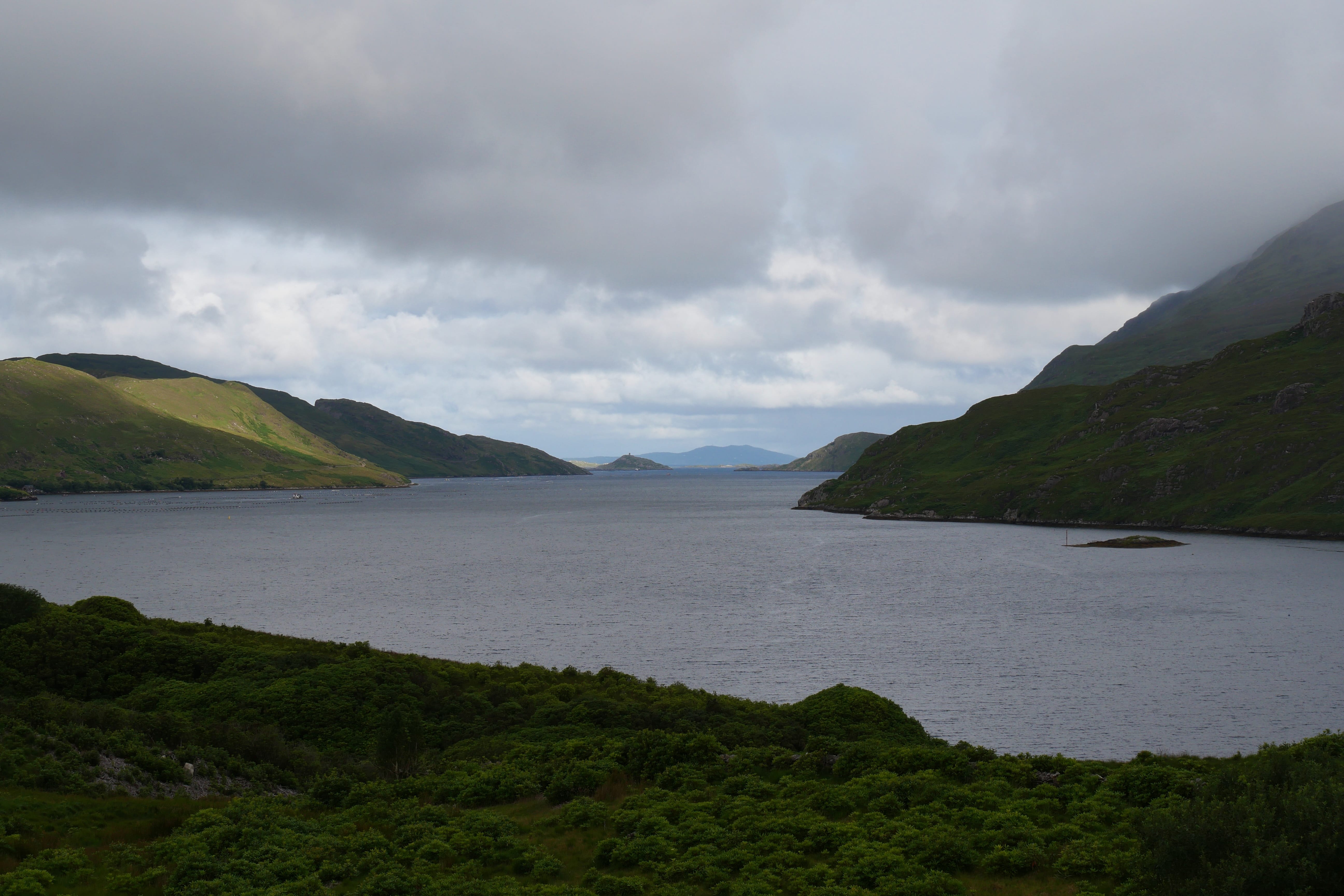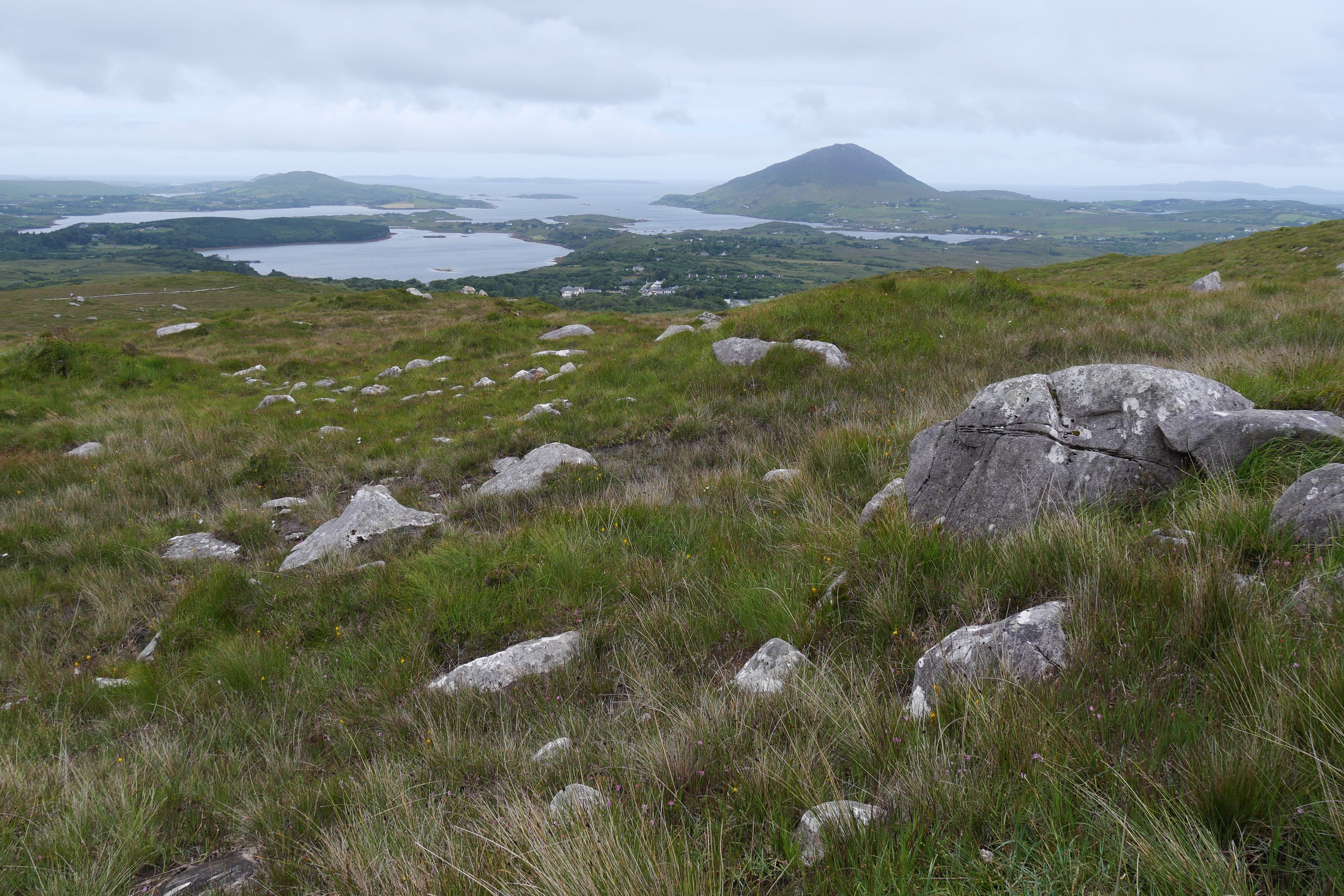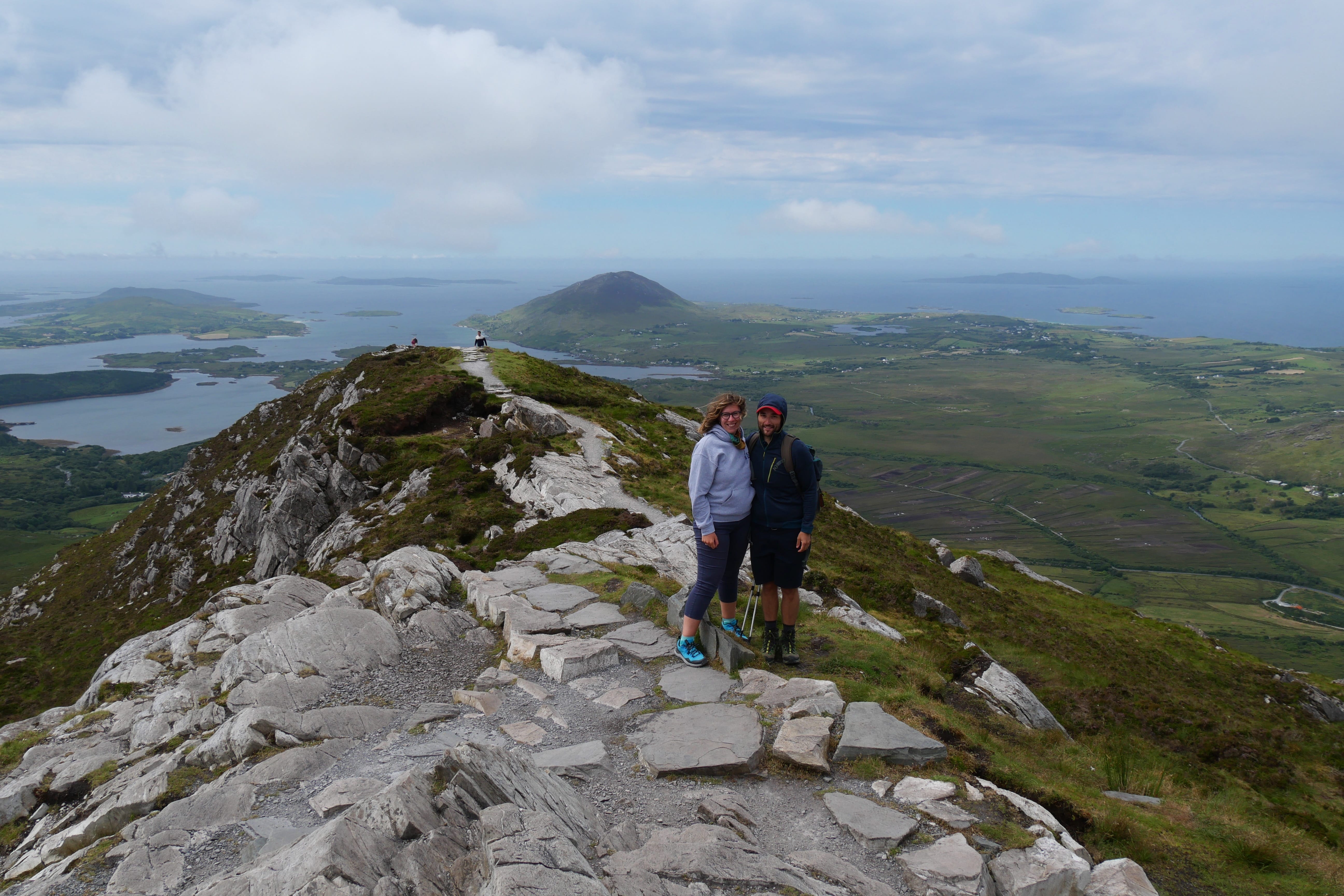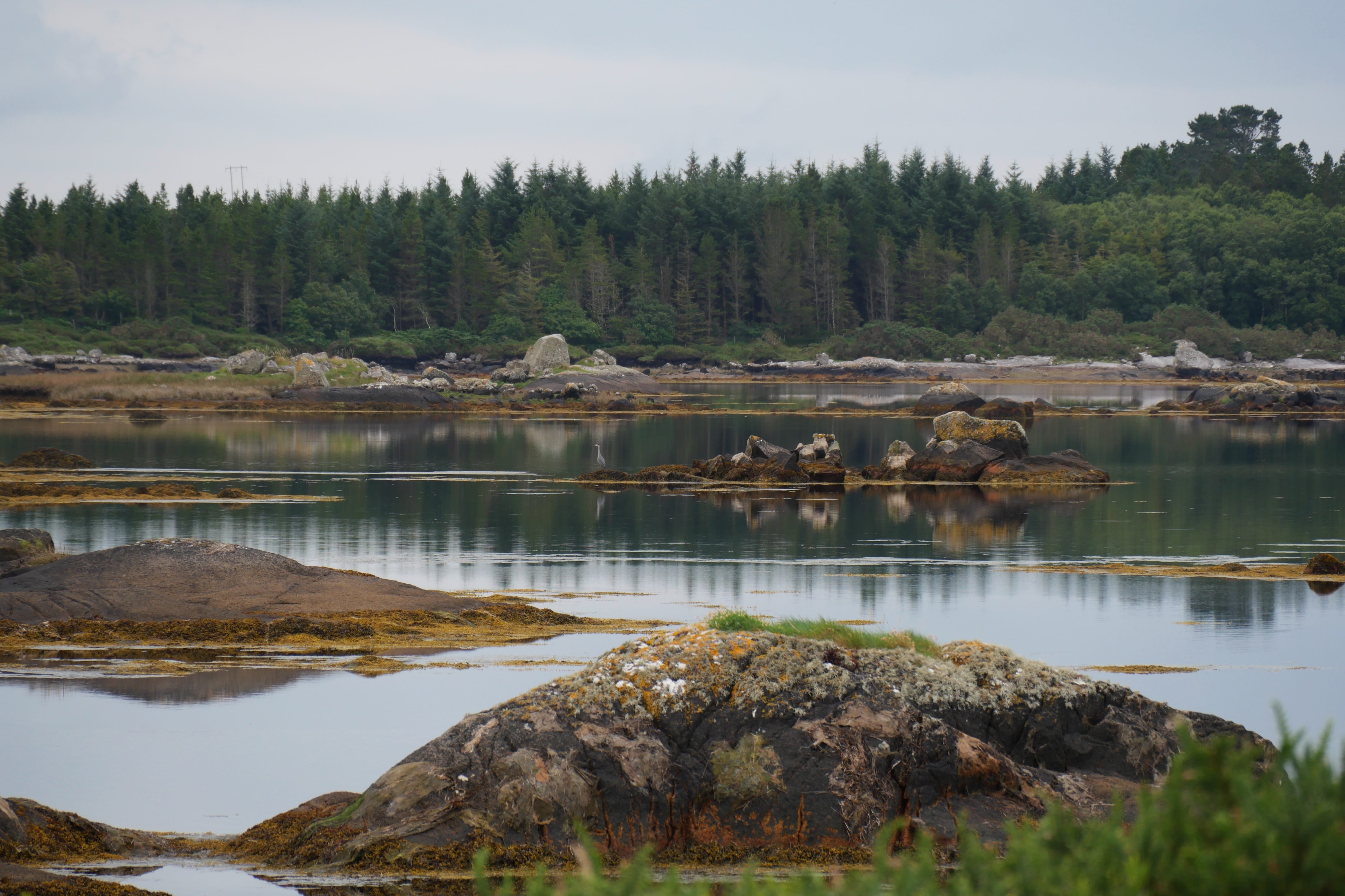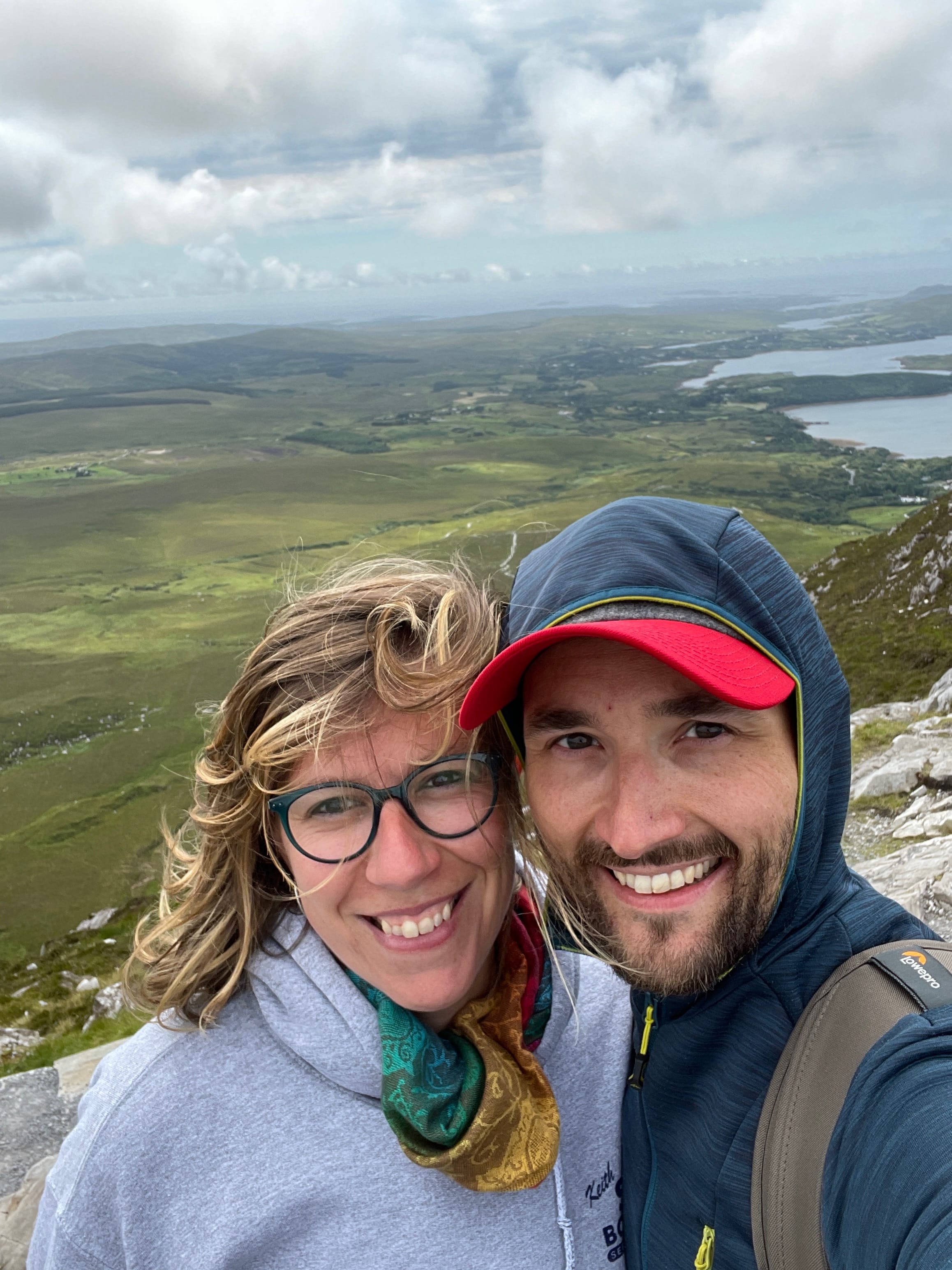 Après notre nuit à Galway, c’est en direction du Connemara que nous reprenons la route, avec une toute autre mélodie en tête ! Clairement, nous n’espérions pas vraiment mieux en termes de météo, avec un ciel bien gris, un peu d’humidité et parfois même de belles nappes de brouillard. Notre objectif, ce jour-là, était d’atteindre l’entrée du parc national du Connemara située à Letterfrack ni trop tôt, notre logement n’étant plus loin de ce point ensuite, ni trop tard, voulant profiter de la randonnée offerte à cet endroit, sur laquelle nous reviendrons plus tard. Entre temps donc, nous passerons par Barna, longeant une nouvelle fois la côte autant que possible avant de fatalement devoir la quitter pour entrer un peu plus dans les terres mystérieuses du Connemara. Juste avant midi, nous ferons la Connemara sky road, nettement plus intéressante que le littoral juste après Galway, et mangerons dans la voiture face à Omey Island. Cette petite île a la particularité d’être accessible par un passage à guet sur le sable. L’eau n’était pas très haute quand nous y sommes allés, mais pas suffisamment basse non plus pour que nous nous sentions prêts à traverser. Nous en profiterons de loin, et c’était déjà bien dépaysant ainsi. Il était temps à présent de rejoindre le Visitor center du parc du Connemara afin de décider quelle randonnée nous permettrait d’en voir un maximum tout en étant un bon compromis difficulté/temps requis.