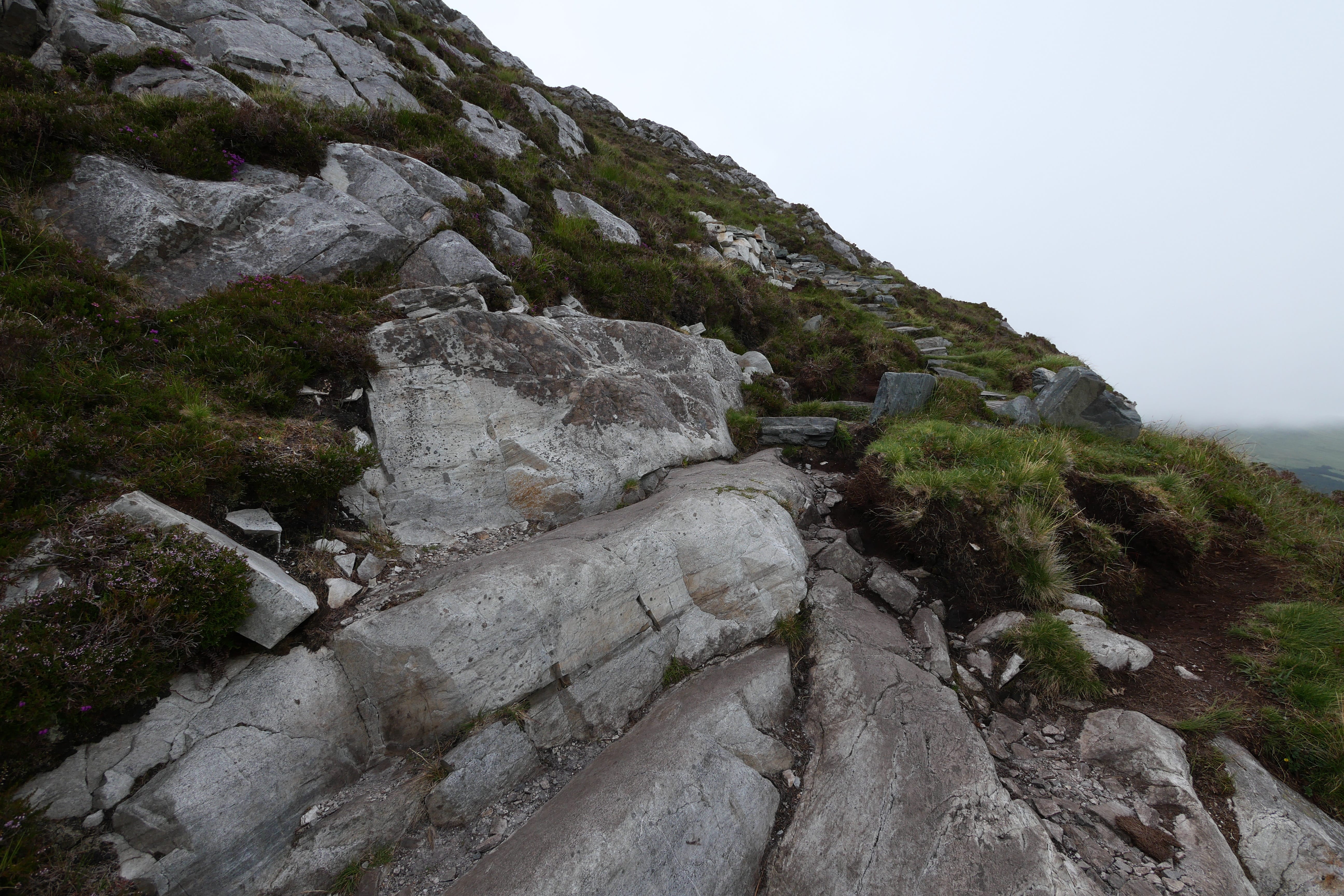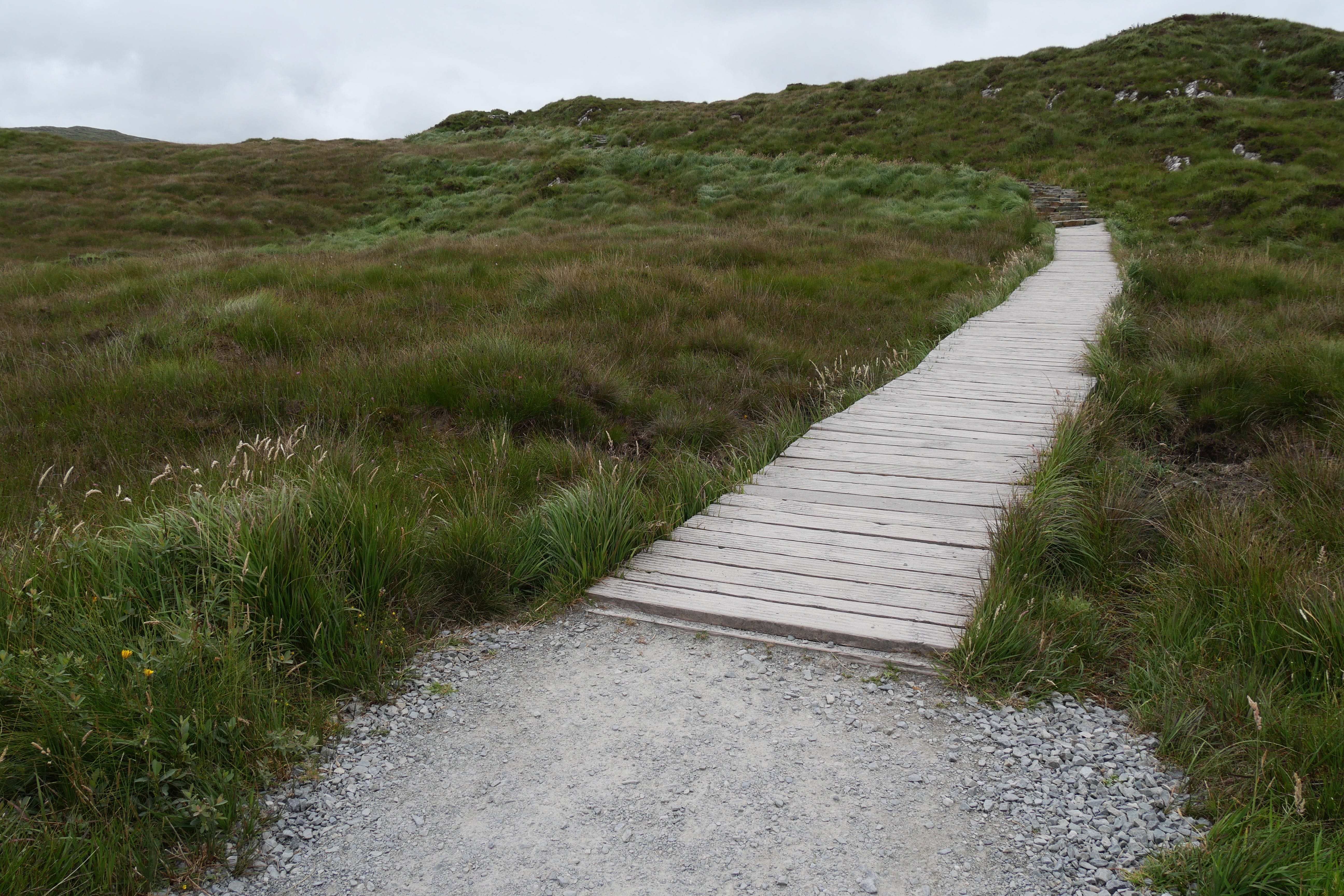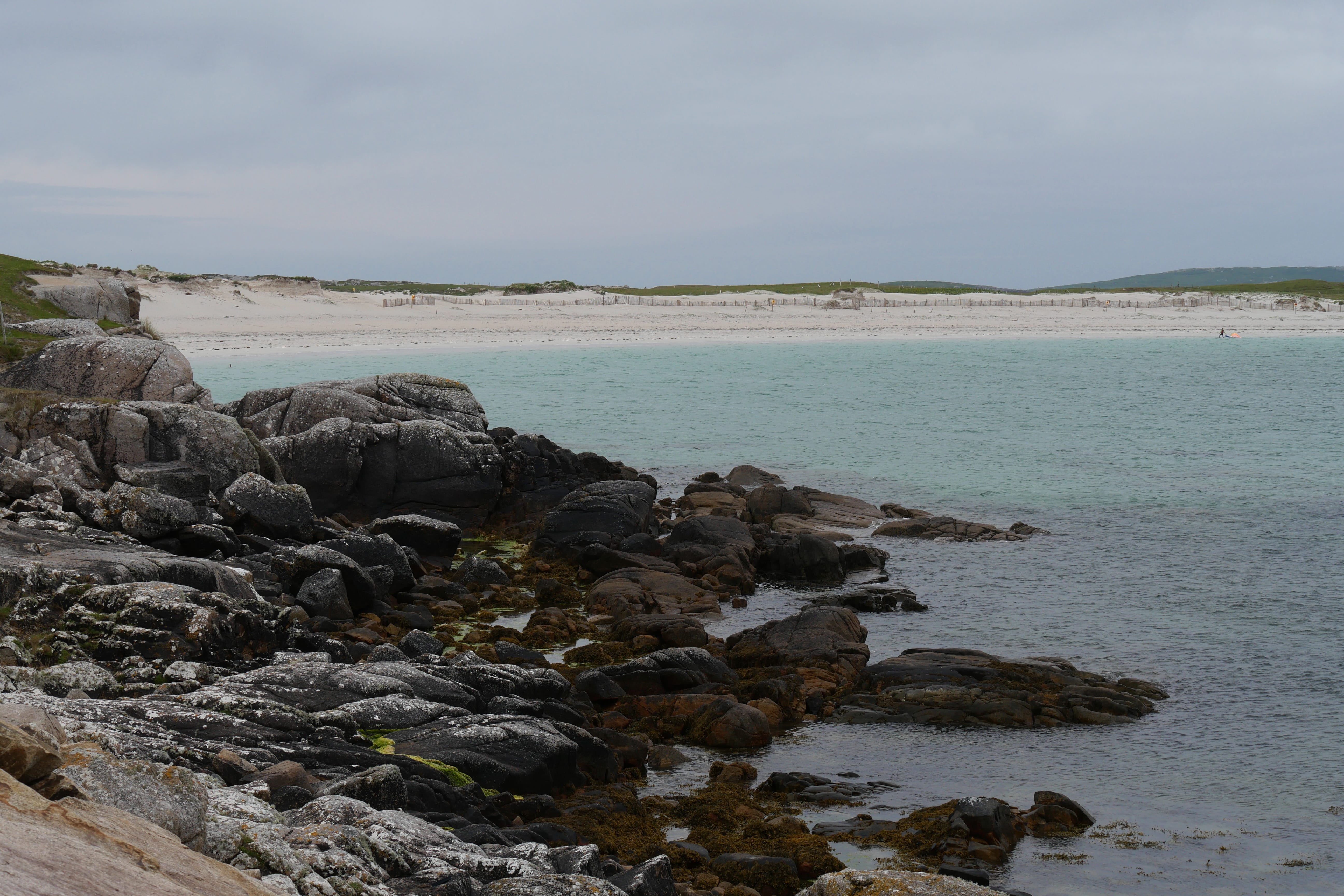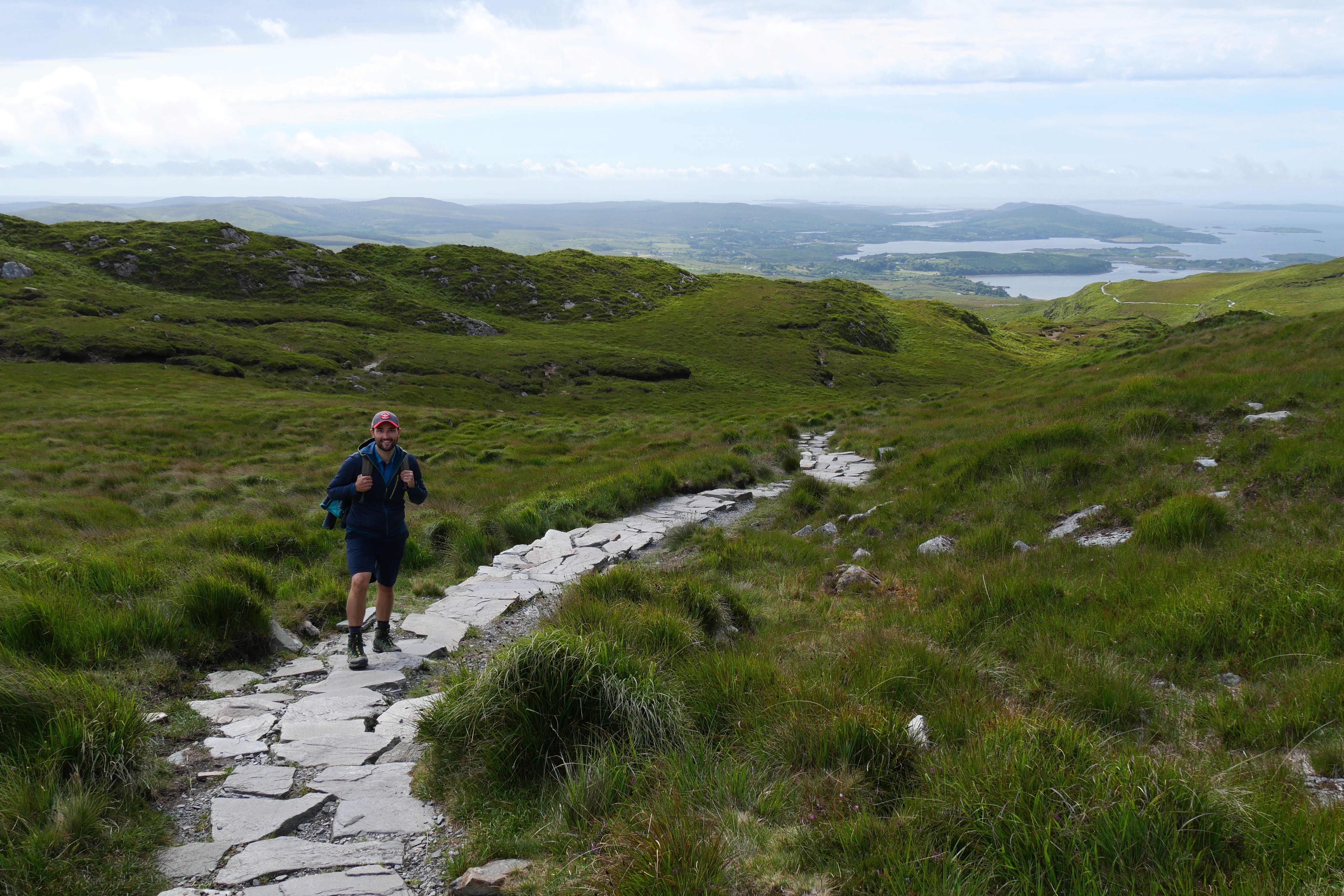 Après notre nuit à Galway, c’est en direction du Connemara que nous reprenons la route, avec une toute autre mélodie en tête ! Clairement, nous n’espérions pas vraiment mieux en termes de météo, avec un ciel bien gris, un peu d’humidité et parfois même de belles nappes de brouillard. Notre objectif, ce jour-là, était d’atteindre l’entrée du parc national du Connemara située à Letterfrack ni trop tôt, notre logement n’étant plus loin de ce point ensuite, ni trop tard, voulant profiter de la randonnée offerte à cet endroit, sur laquelle nous reviendrons plus tard. Entre temps donc, nous passerons par Barna, longeant une nouvelle fois la côte autant que possible avant de fatalement devoir la quitter pour entrer un peu plus dans les terres mystérieuses du Connemara. Juste avant midi, nous ferons la Connemara sky road, nettement plus intéressante que le littoral juste après Galway, et mangerons dans la voiture face à Omey Island. Cette petite île a la particularité d’être accessible par un passage à guet sur le sable. L’eau n’était pas très haute quand nous y sommes allés, mais pas suffisamment basse non plus pour que nous nous sentions prêts à traverser. Nous en profiterons de loin, et c’était déjà bien dépaysant ainsi. Il était temps à présent de rejoindre le Visitor center du parc du Connemara afin de décider quelle randonnée nous permettrait d’en voir un maximum tout en étant un bon compromis difficulté/temps requis.