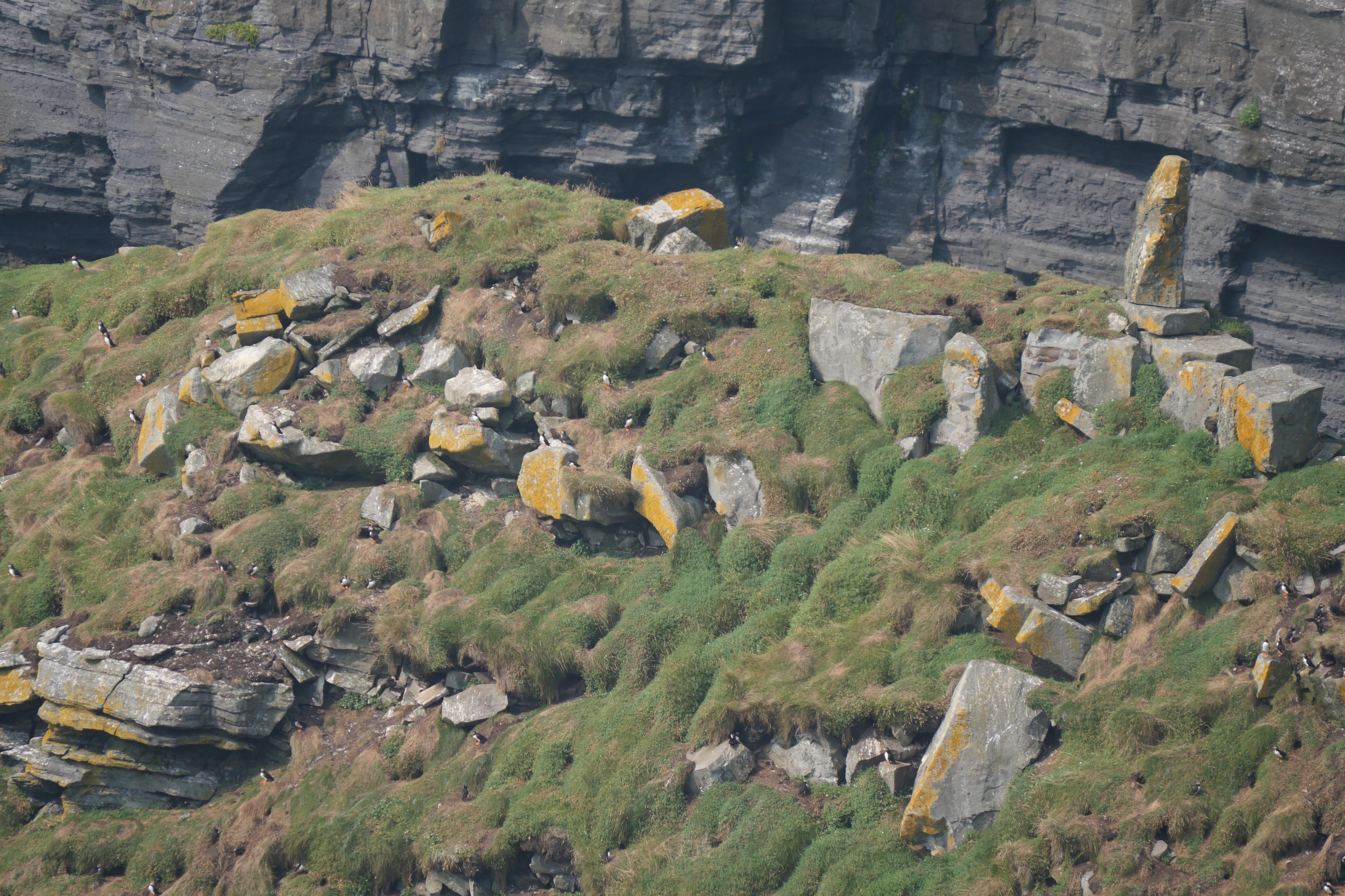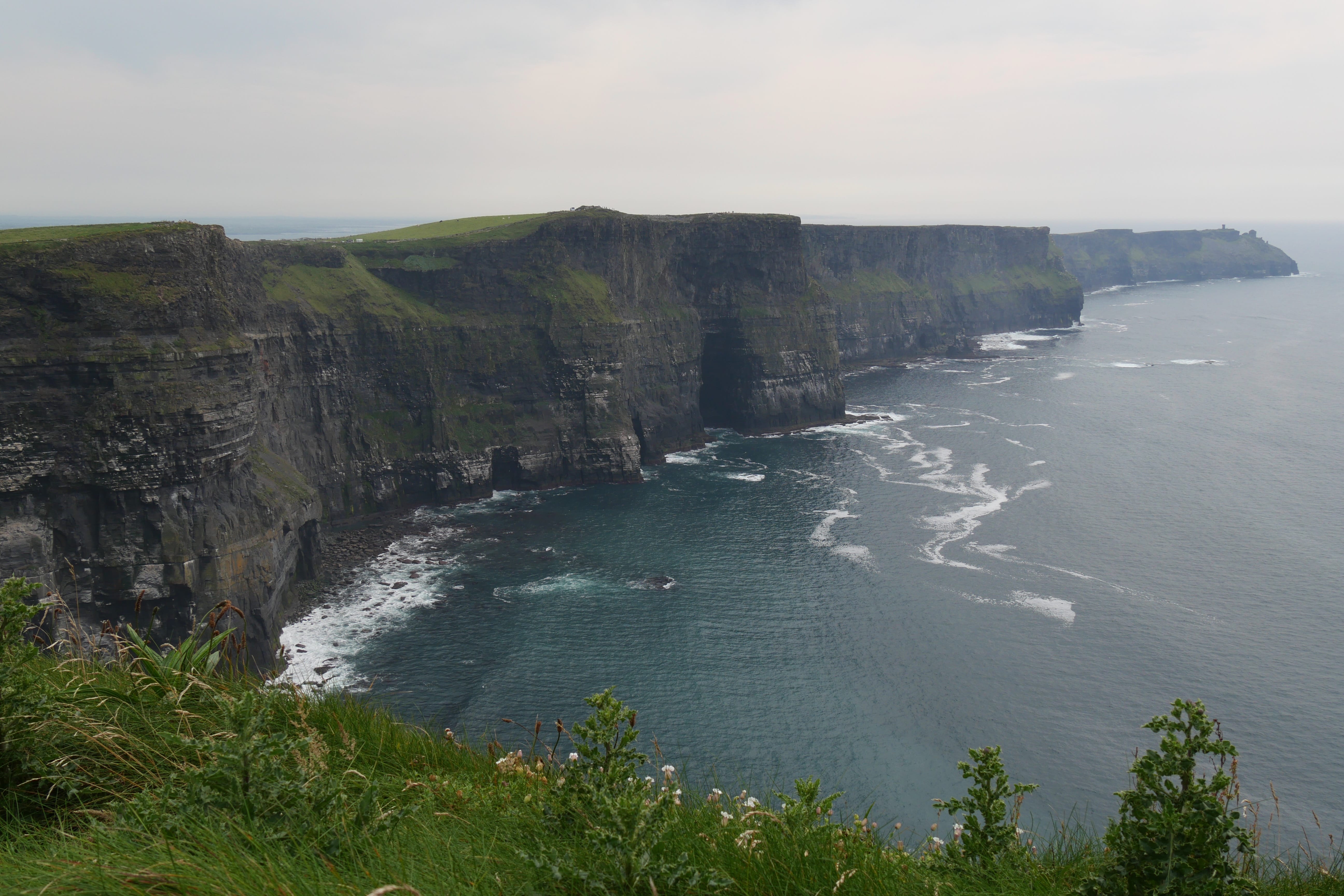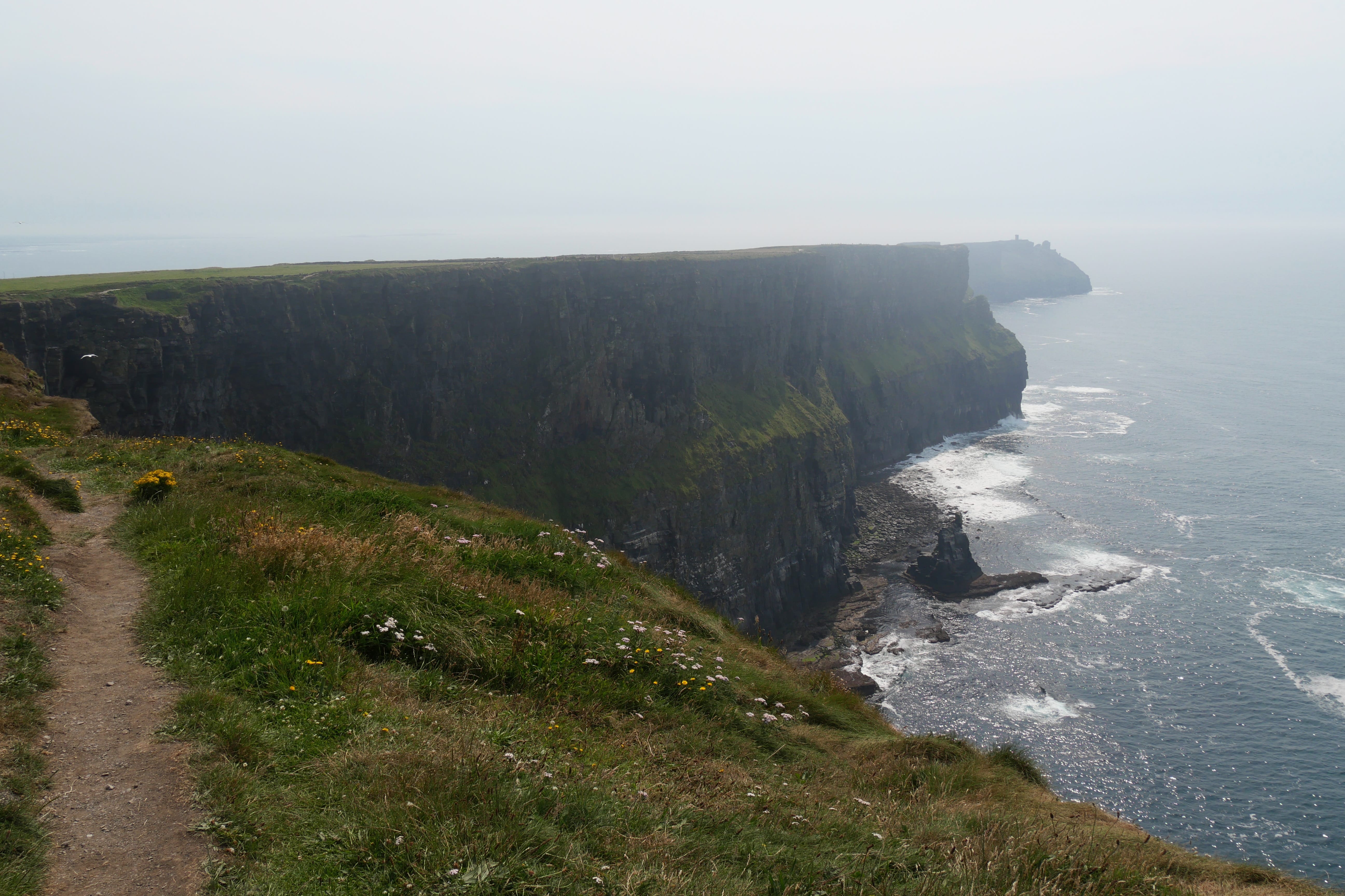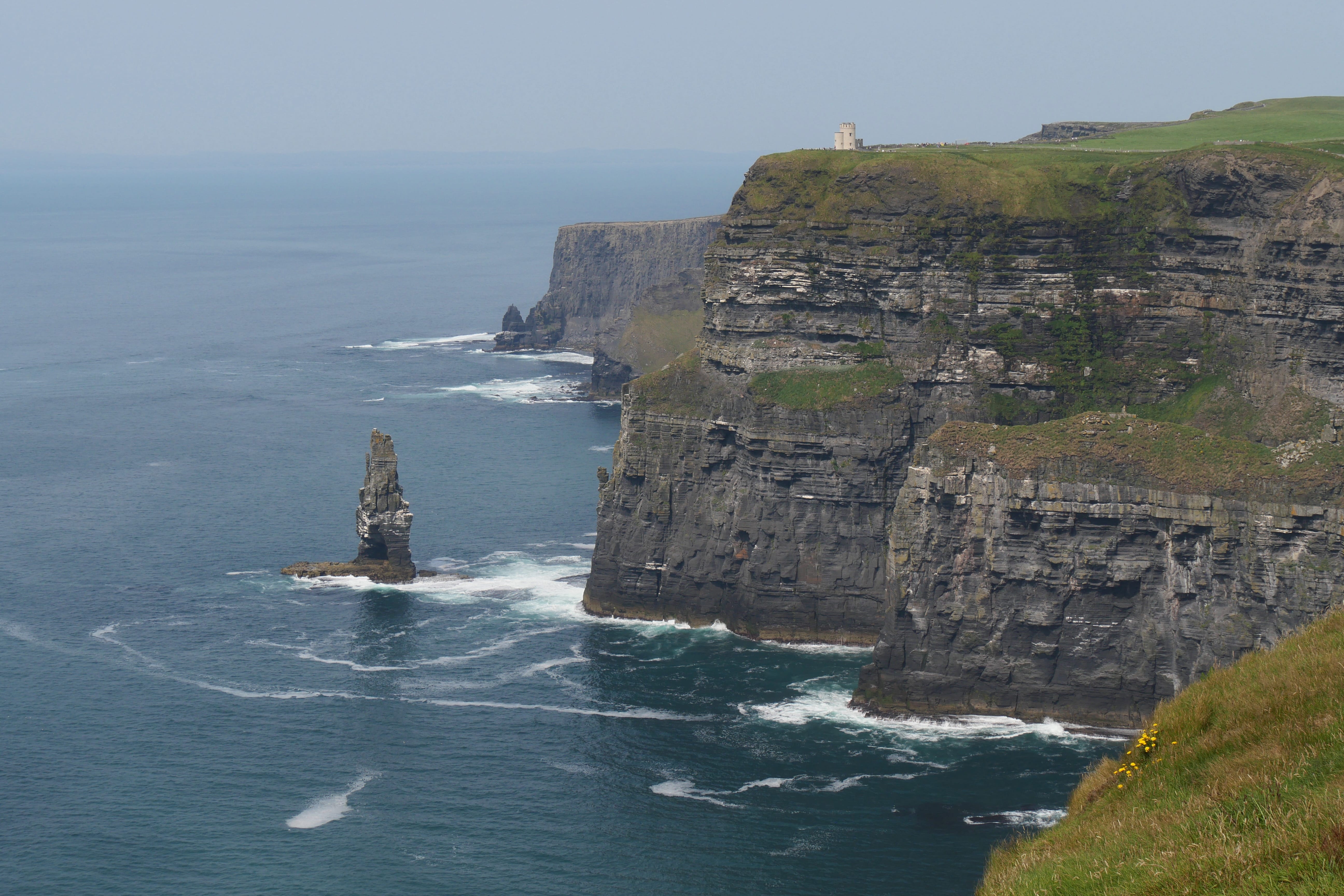 Pour les Falaises de Moher, nous nous devons de préciser quelques petites choses… Nous avions pu voir des tarifs pour le parking avant d’y arriver, mais avons quand même réussi à être surpris, encore une fois, de l’augmentation des prix, années après années… A priori, en 2018, se garer sur le parking face au visitor center coûtait 6€/personne dans le véhicule, nous en avons payé le double… Alors que pour être totalement clair, l’accès aux falaises, monument national, est entièrement gratuit. Nous avons, après coup, vérifié s’il existait d’autres options, comme ce fut le cas à d’autres moments du séjour, et nous vous confirmons la possibilité de trouver des parkings beaucoup moins chers, mais plus éloignés du visitor center. A priori, la distance de ces parkings plus abordables jusqu’au premier point de vue méritant le détour, est relativement équivalente à celle depuis le parking principal. A vous de voir, nous n’avions pas toutes ces informations au moment de notre visite, et avons donc considéré que c’était notre meilleure option pour profiter de ce point d’intérêt majeur de notre séjour. Nous aurons parcouru les sentiers longeant les falaises dans les deux directions depuis l’accueil des visiteurs, afin de rentabiliser au mieux et en voir un maximum. Si la hauteur des falaises est certes impressionnante, nous aurons surtout retenu qu’elles sont un endroit préservé pour de nombreux macareux, mais également d’autres oiseaux marins. Si nous étions malgré tout limités par nos objectifs, nous aurons réussi à en apercevoir quelques uns quand la plupart des gens ne soupçonnaient même pas la présence de ces centaines d’oiseaux en contrebas sur les rochers. Nous n’aurons pas fait la queue pour monter dans la tour O’Brien, le point culminant des falaises, estimant avoir déjà suffisamment profité ainsi de ces paysages.