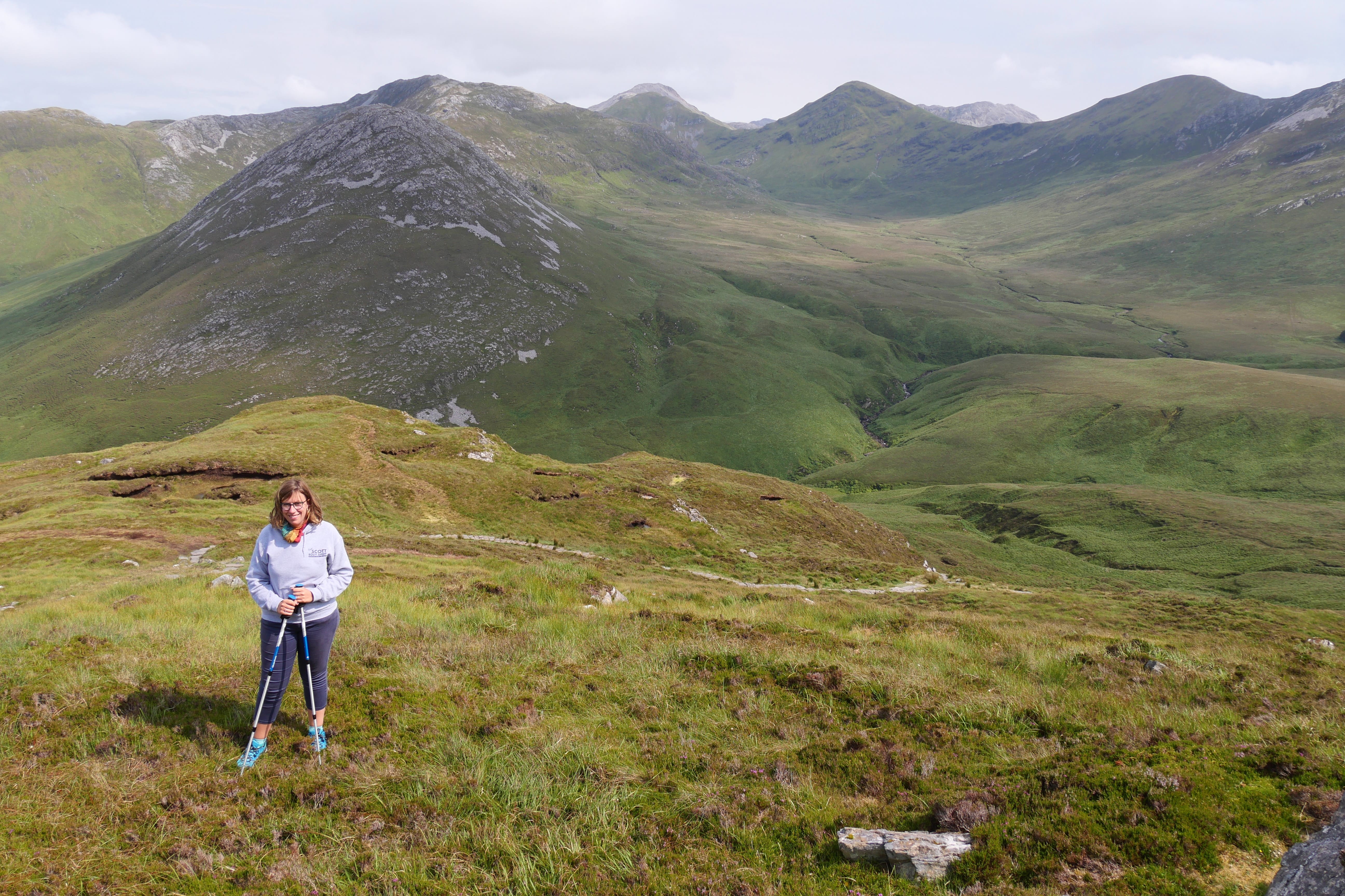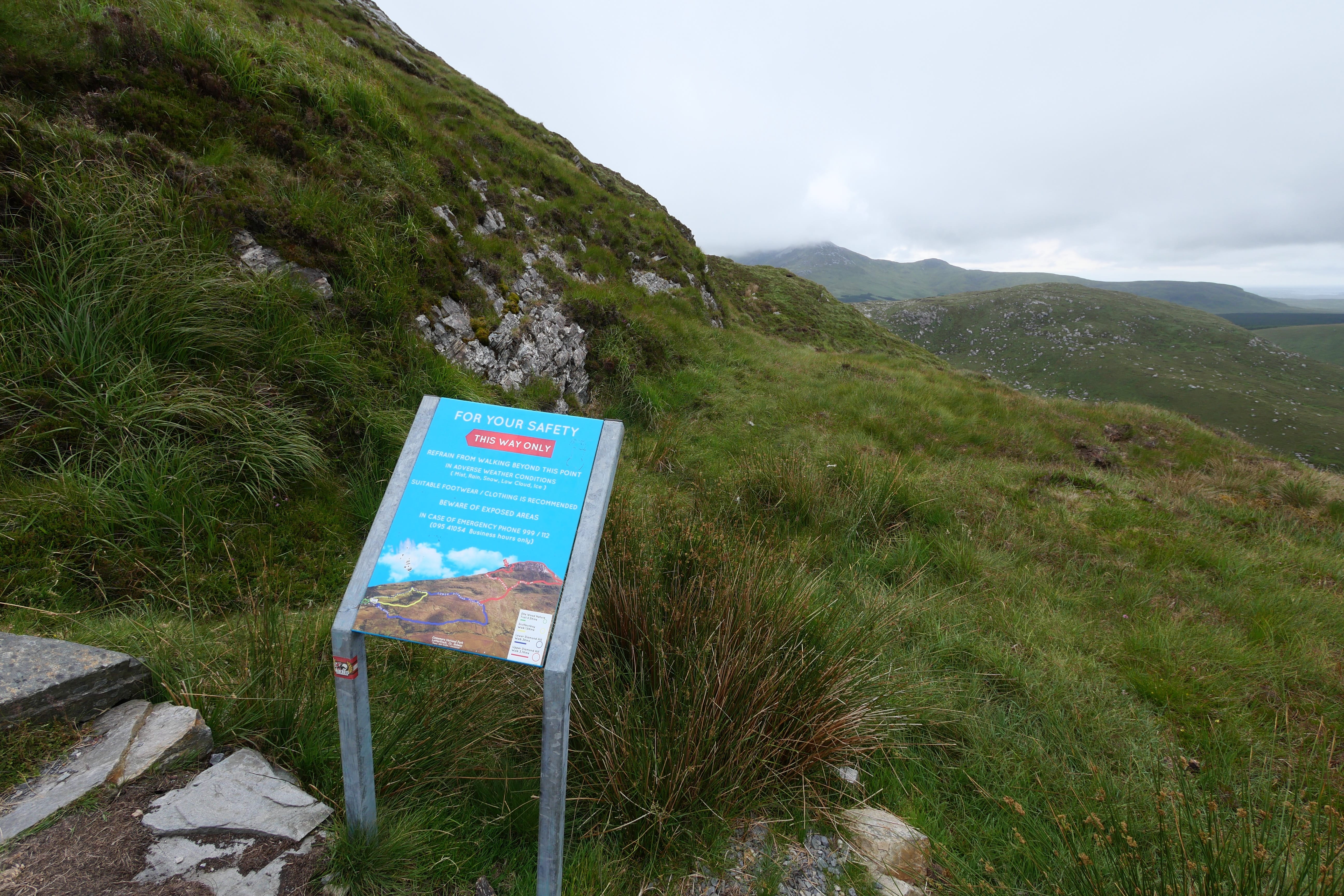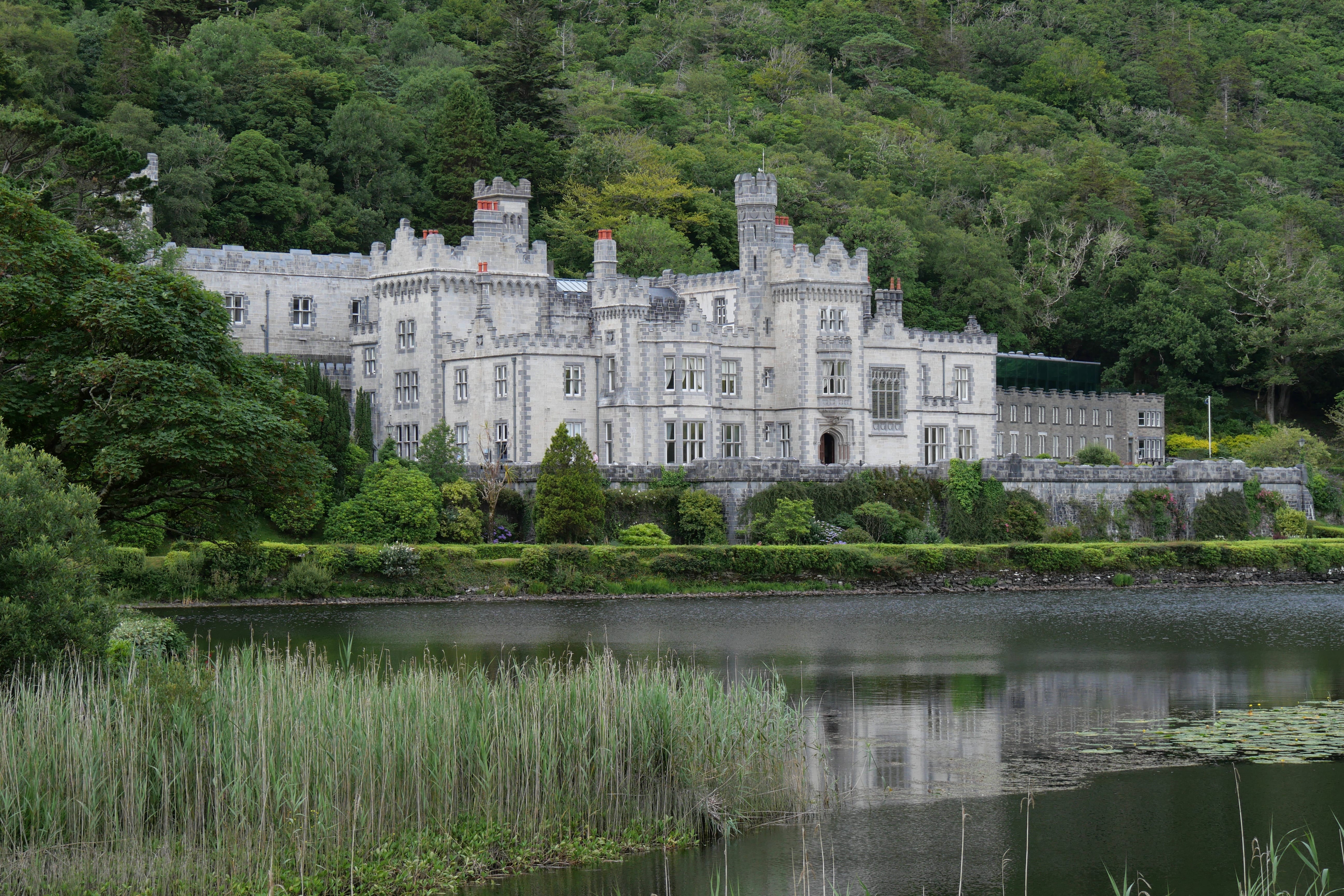 Dès notre arrivée dans le parc, nous aurons l’occasion de nous rapprocher d’un guide qui nous indiquera les quatre possibilités de randonnée s’offrant à nous, repérées par couleur. On retrouve ainsi un trail assez court et plat, complètement dissocié des trois autres et permettant d’explorer la forêt à proximité du Visitor Center (0.5km – 15min). Les trois autres partent tous dans la même direction, vers Diamond Hill mais sont de difficulté très différente. Le bleu et le jaune sont en partie communs, le jaune (1.5km – 40 min) étant le plus accessible des trois segments et permettant d’apercevoir la montagne à proximité. Le bleu reste accessible, mais demandera davantage de motivation et de condition physique, tout en restant sur des chemins plutôt praticables (3km – 1h). N’entamez pas le rouge, Upper Diamond Trail (3.7km en plus du bleu), si vous n’avez pas de bonnes chaussures de randonnée, une condition physique correcte, ou si les conditions météo ne sont pas bonnes. Nous l’avons fait avec un vent relativement faible en bas, et ça soufflait plutôt fort une fois les fortes pentes escarpées passées. Nous en avons profité pour avertir des touristes moins regardants sur la difficulté potentielle qui les attendait, histoire de leur éviter une belle déconvenue. Tout reste faisable, mais soyez un minimum préparés pour profiter un maximum de la superbe vue à 360° qui vous attend une fois en haut. Au bout du compte, nous n’étions pas partis pour le rouge, mais aurions vraiment regretté de ne pas l’avoir fait tant il permet d’en voir plus par rapport aux autres. Cette journée se terminera par un dernier crochet à la Kylemore Abbey, que nous apercevions d’ailleurs déjà d’en haut, mais qui mérite vraiment que l’on s’y arrête quelques instants, depuis l’autre côté du lac. Cela rappellera à tous ceux qui connaissent le manoir de la série Downton Abbey, qui, s’il reste quand même différent de ce bâtiment, y ressemble sous bien des aspects.