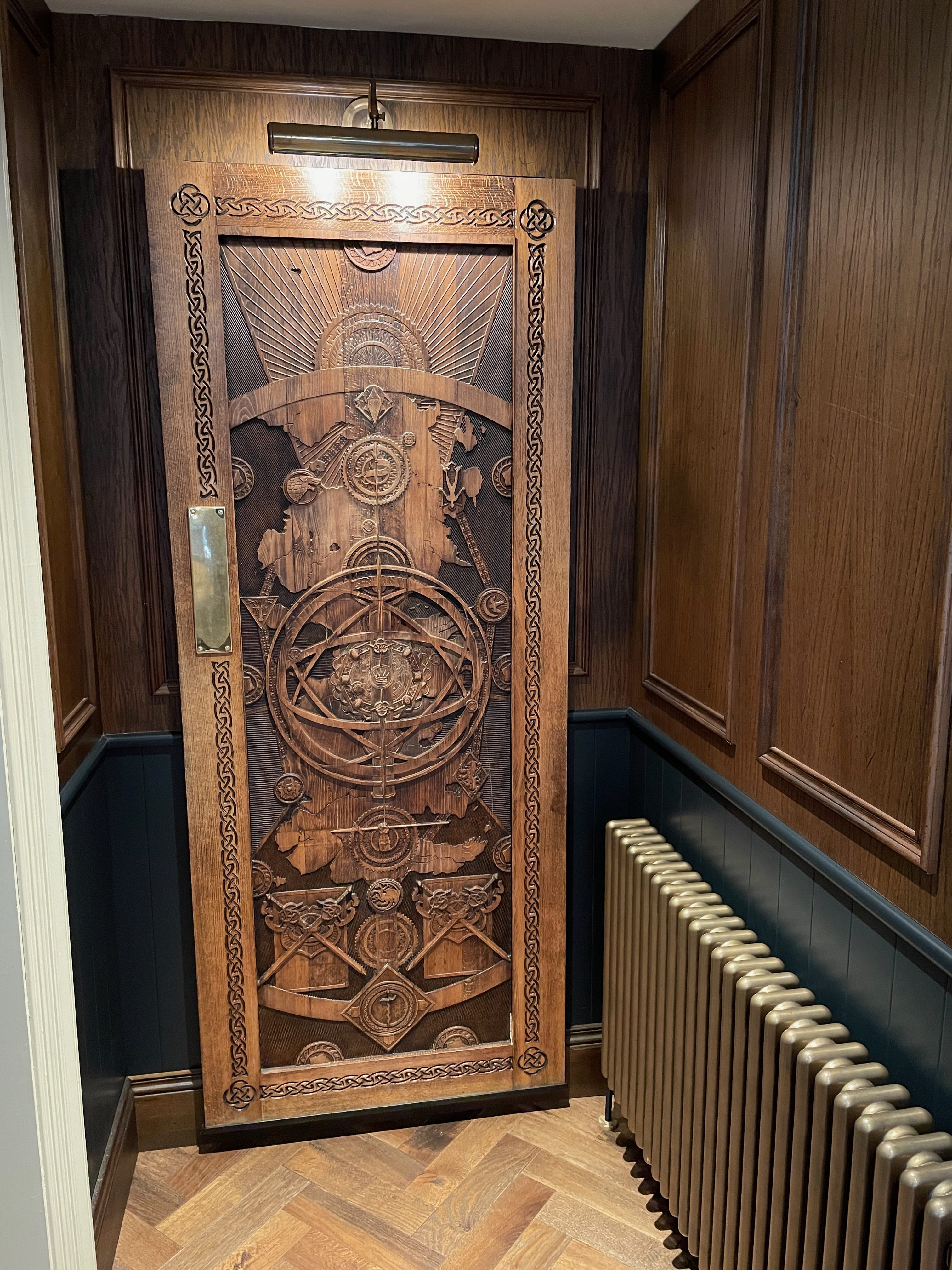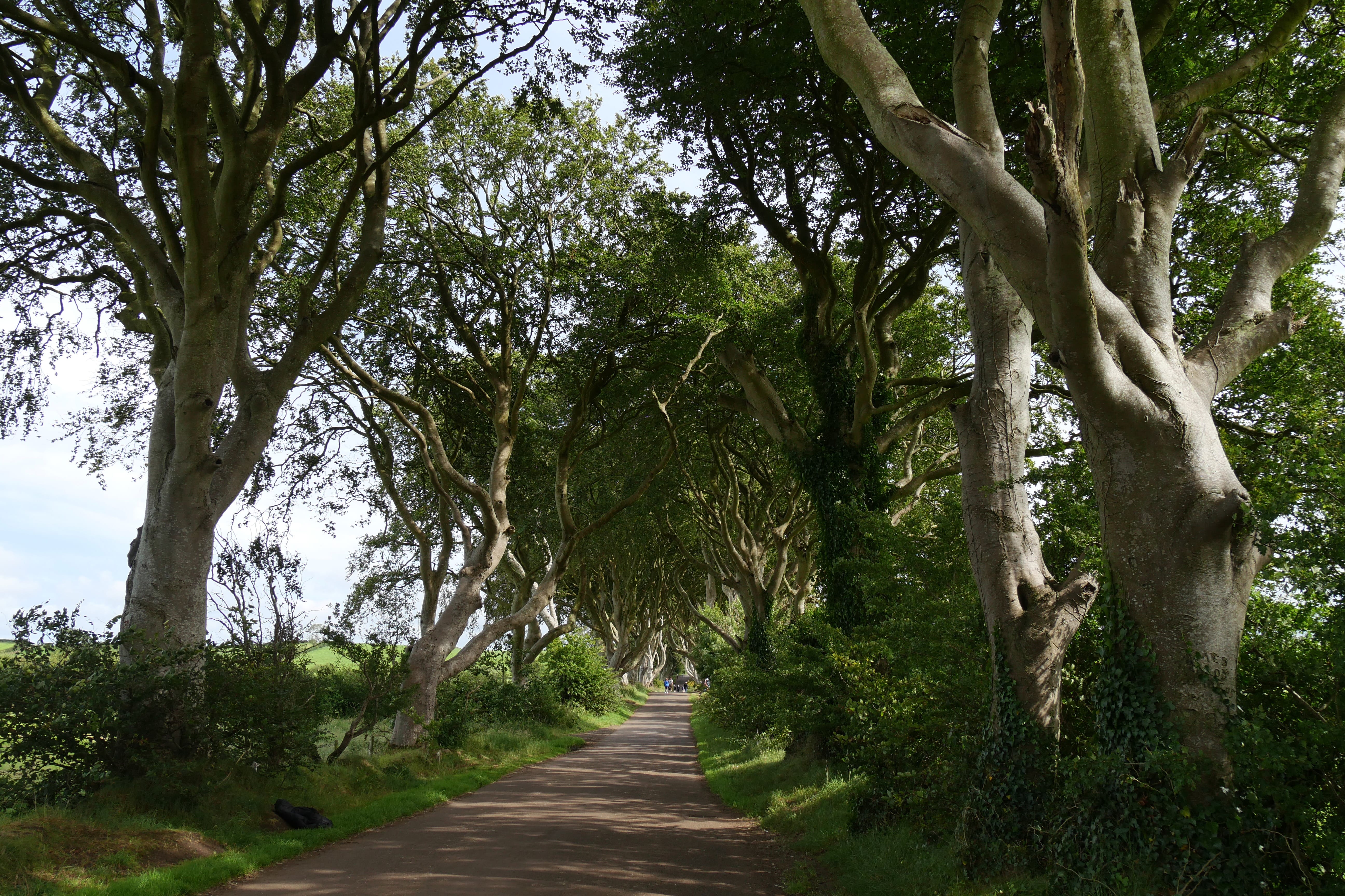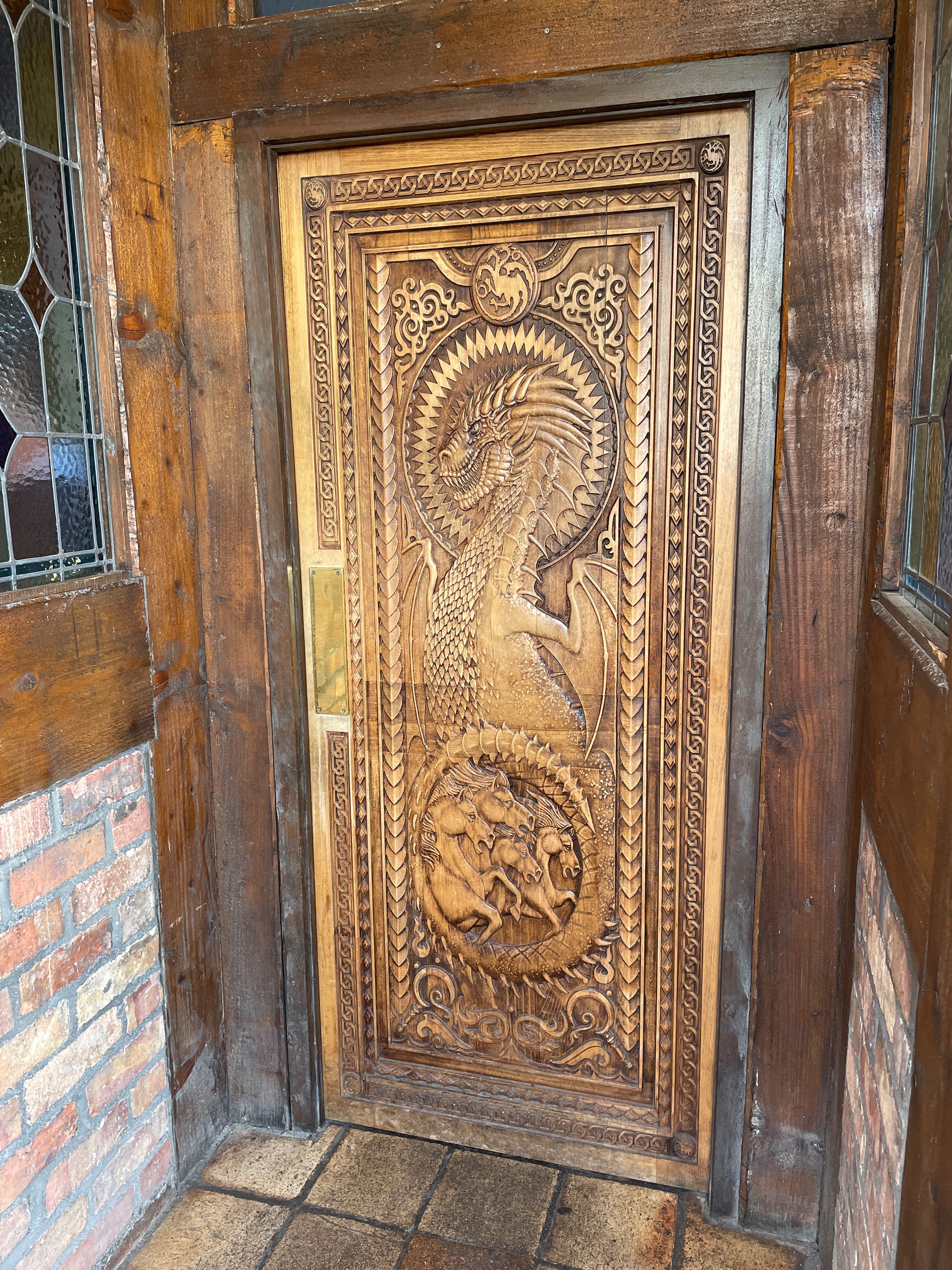 En repartant de la Chaussée des Géants, Il, souhaitait se rendre sur un des lieux de tournage de la série Game of Thrones : The Dark Hedges. Située entre les villes d’Armoy et Stranocum, cette allée de hêtres tortueux borde une route à l’atmosphère mystique. Il y a beaucoup moins de touristes que dans d’autres lieux mais il est toutefois difficile d’en faire un cliché qui aurait l’air désert. En plus de servir de « route royale » à la série, peu avant la saison 6, une tempête a déraciné quelques arbres. De cette triste destinée, est né un projet créatif. Deux de ces arbres ont été transformés en 10 portes de bois sculptées, racontant chacune l’histoire d’un des épisodes de la saison. Aujourd’hui, ces portes ont été offertes à différents pubs ou hôtels répartis sur tout le territoire d’Irlande du Nord et près de lieux de tournage. Nous n’en aurons « chassé » que 5 sur les 10, certaines s’éloignant trop de notre route et une, celle qui se trouve près des Dark Hedges, n’étant pas accessible au moment de notre visite. Pour ceux qui souhaitent en garder un souvenir en plus des photos que vous pouvez en faire, chaque lieu peut vous fournir un petit carnet pour faire tamponner chaque porte que vous aurez vue. 😉 La première que nous aurons croisée était juste au niveau du pont de cordes dont nous avons parlé précédemment à Ballymena.