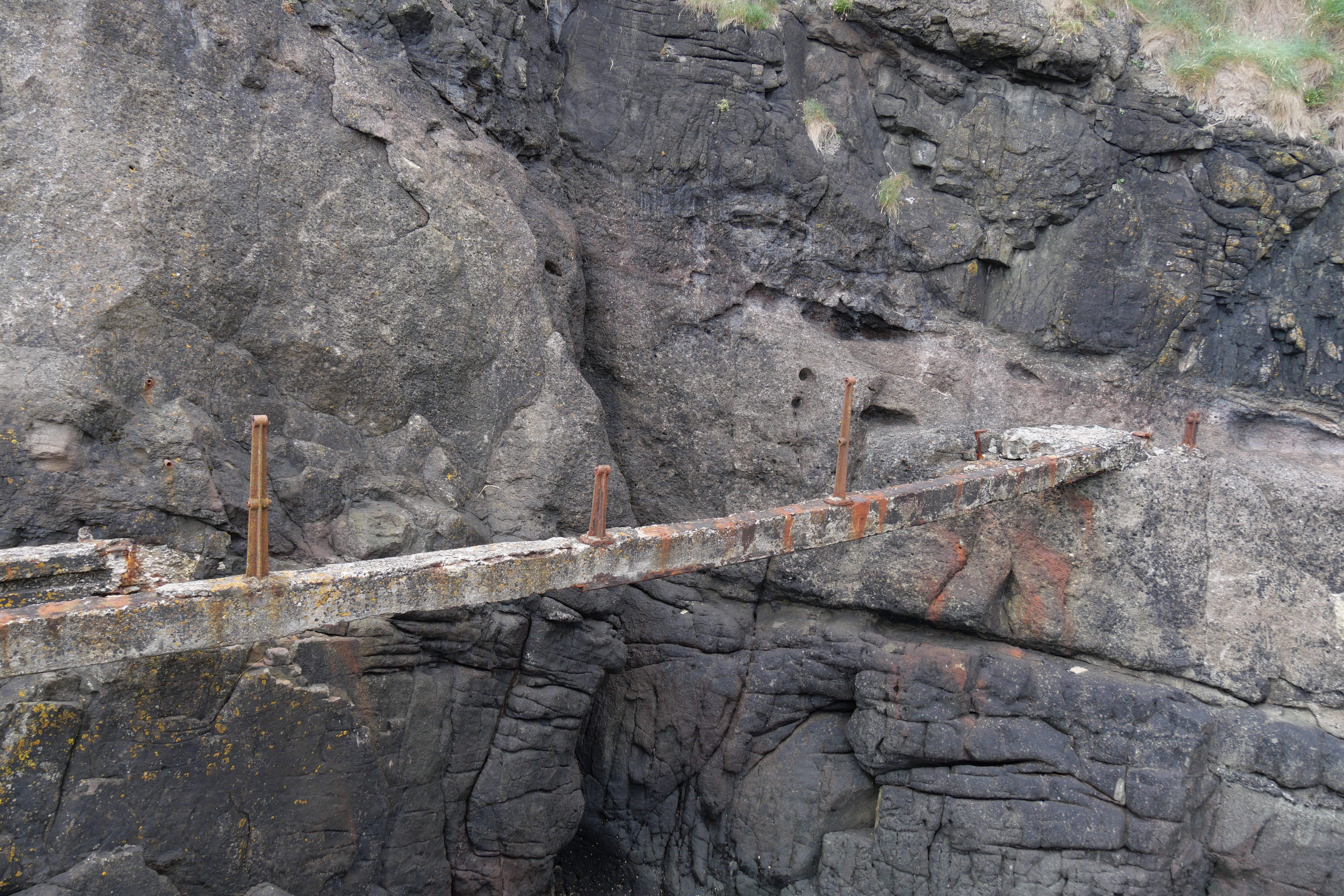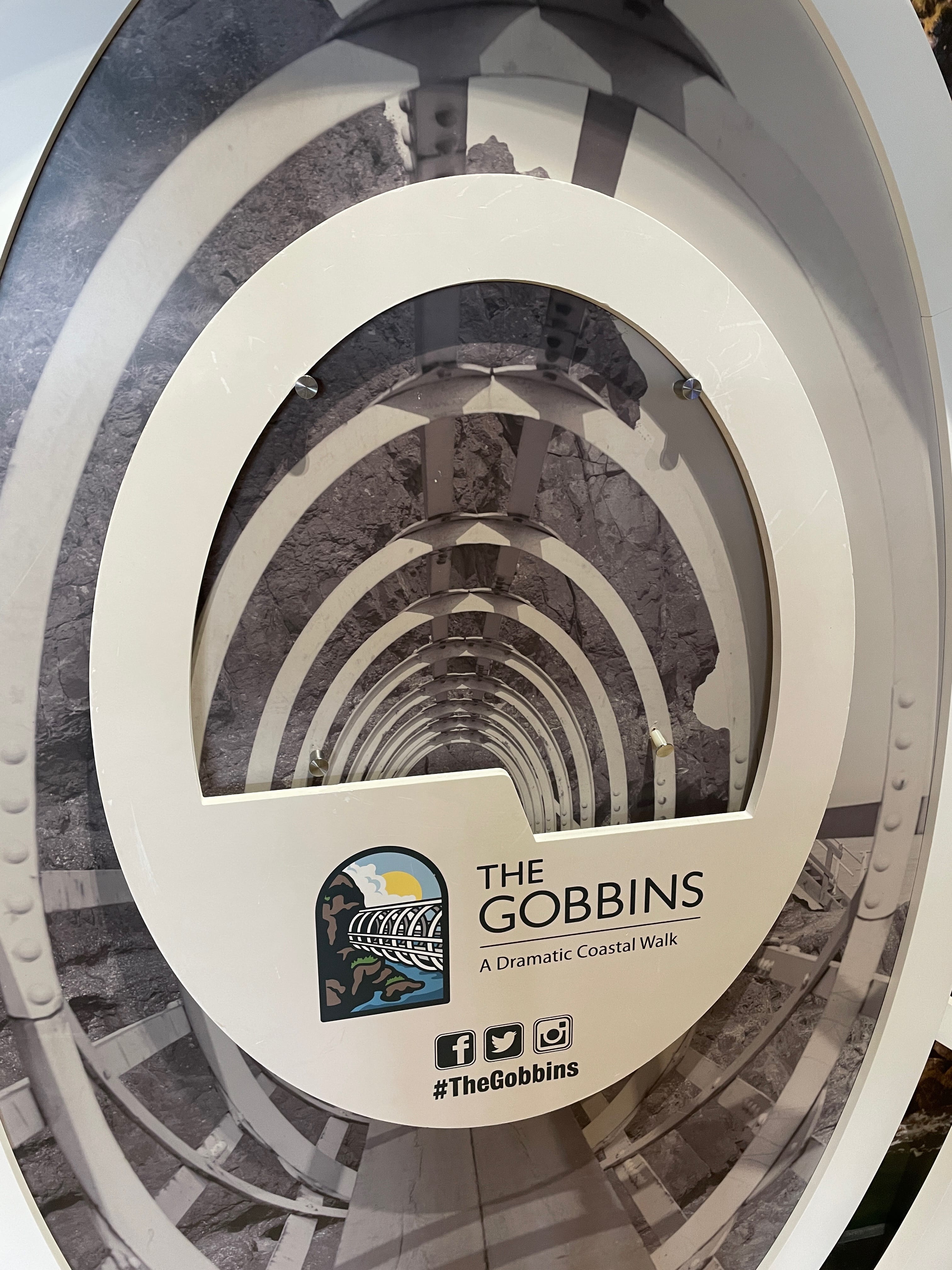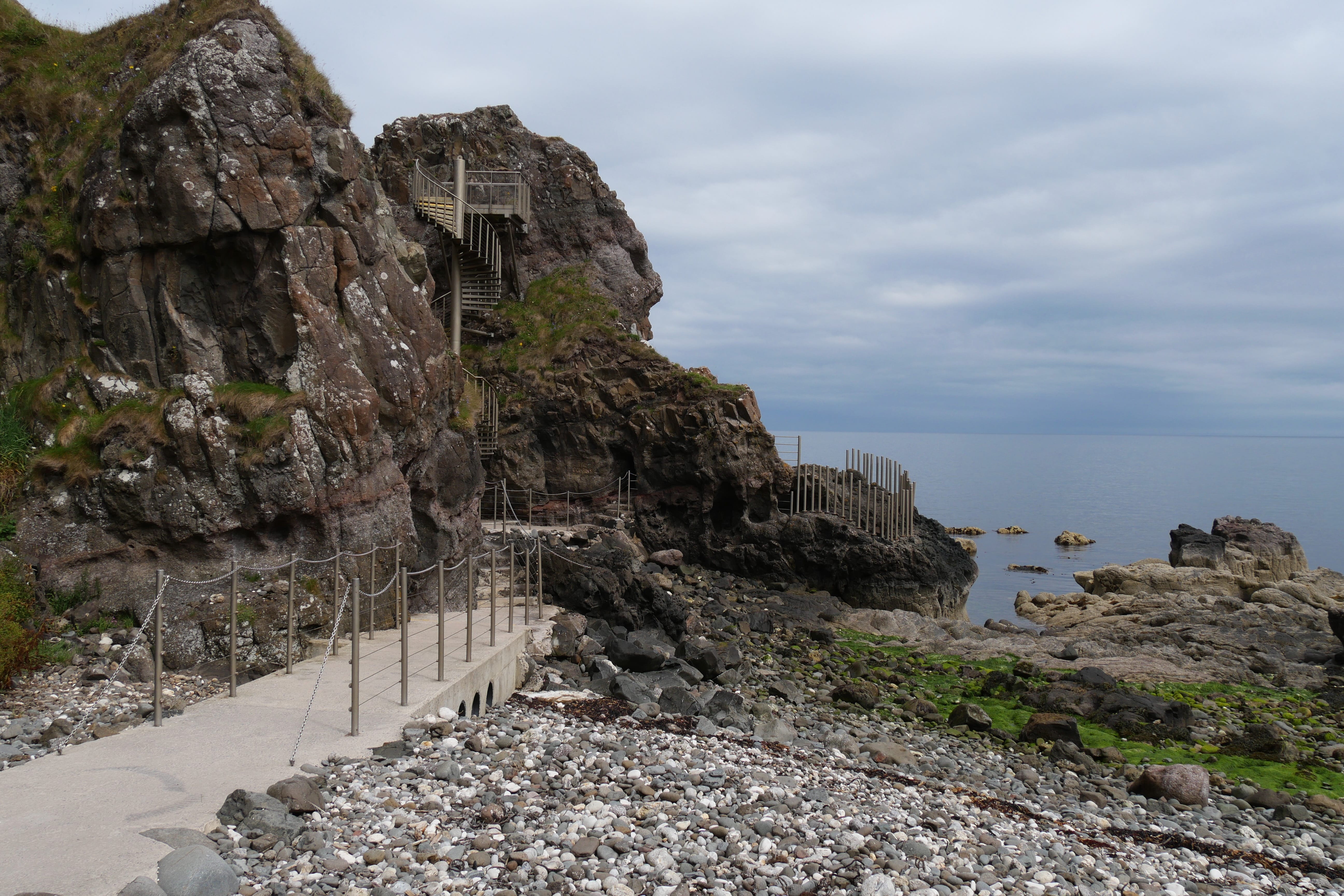 Cette réservation, c’était la visite de The Gobbins. C’est un sentier à flanc de falaise, réhabilité depuis 2015 et pour lequel une visite guidée est obligatoire. On ne peut pas y accéder sans passer par la société qui l’exploite pour une somme de £20 par adulte (les autres tarifs ici). Il est indispensable de réserver à l’avance, surtout lors des grosses périodes touristiques, et il est demandé d’avoir des chaussures de randonnées qui maintiennent la cheville. Ils ne transigent pas sur ce point et nous vous conseillons d’être équipés. Il est possible de louer des chaussures sur place pour £5 mais leur nombre est limité et si vous n’êtes pas prévoyants, vous risqueriez de ne pas pouvoir faire la visite. Une fois garés sur le parking et vous être présentés, vous aurez accès à une petite exposition expliquant l’histoire des lieux. Peu avant l’heure de départ, un briefing de sécurité sera effectué puis il sera temps d’emprunter la navette qui vous emmènera au point de départ. La marche en soi ne présente pas trop de difficultés si ce n’est la très inclinée longue descente du début qui deviendra fatalement l’intraitable montée au retour. Mais on vous laisse tout le temps de la gravir sans stress, le guide accompagnant tranquillement la dernière personne du groupe.