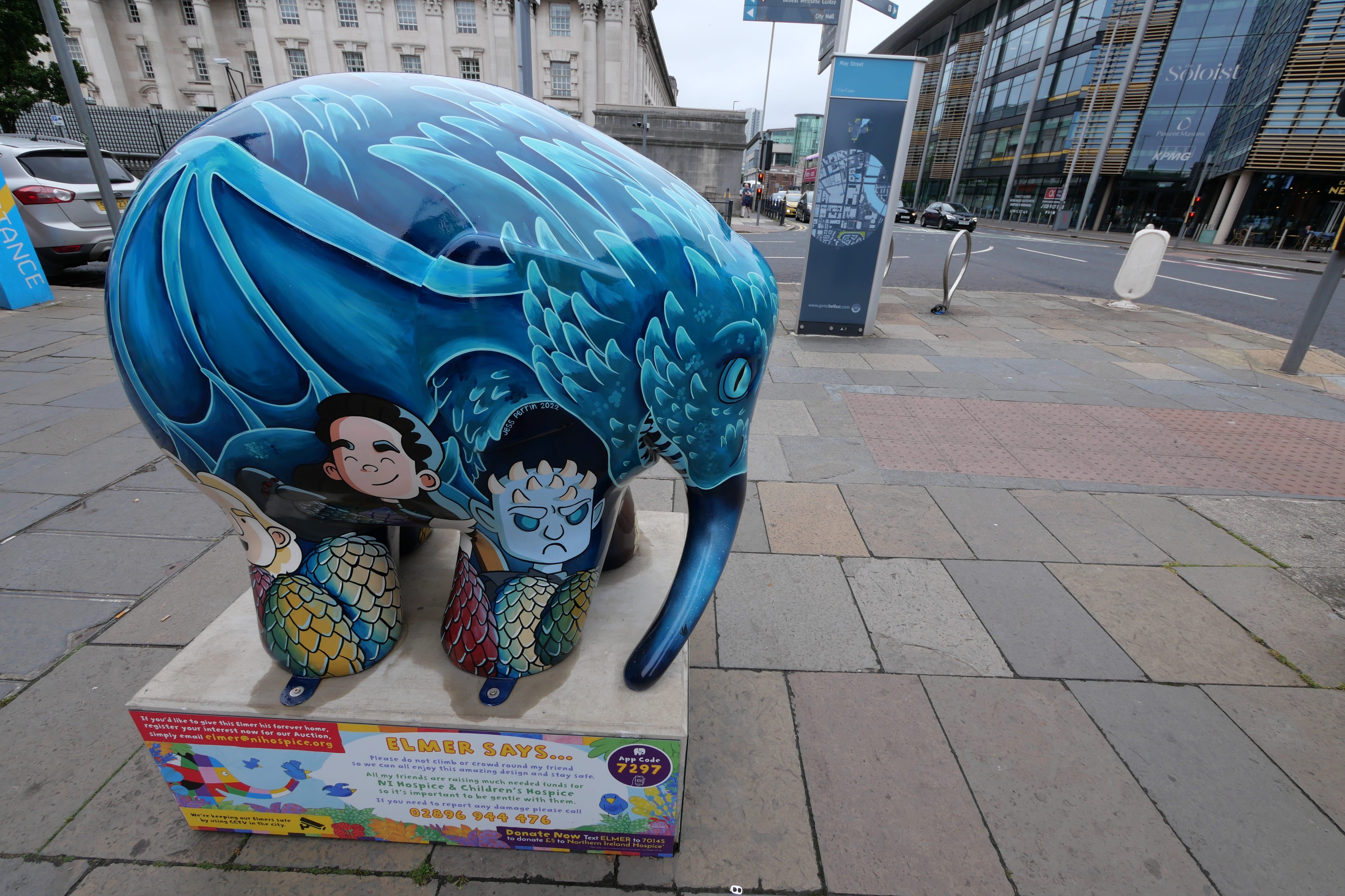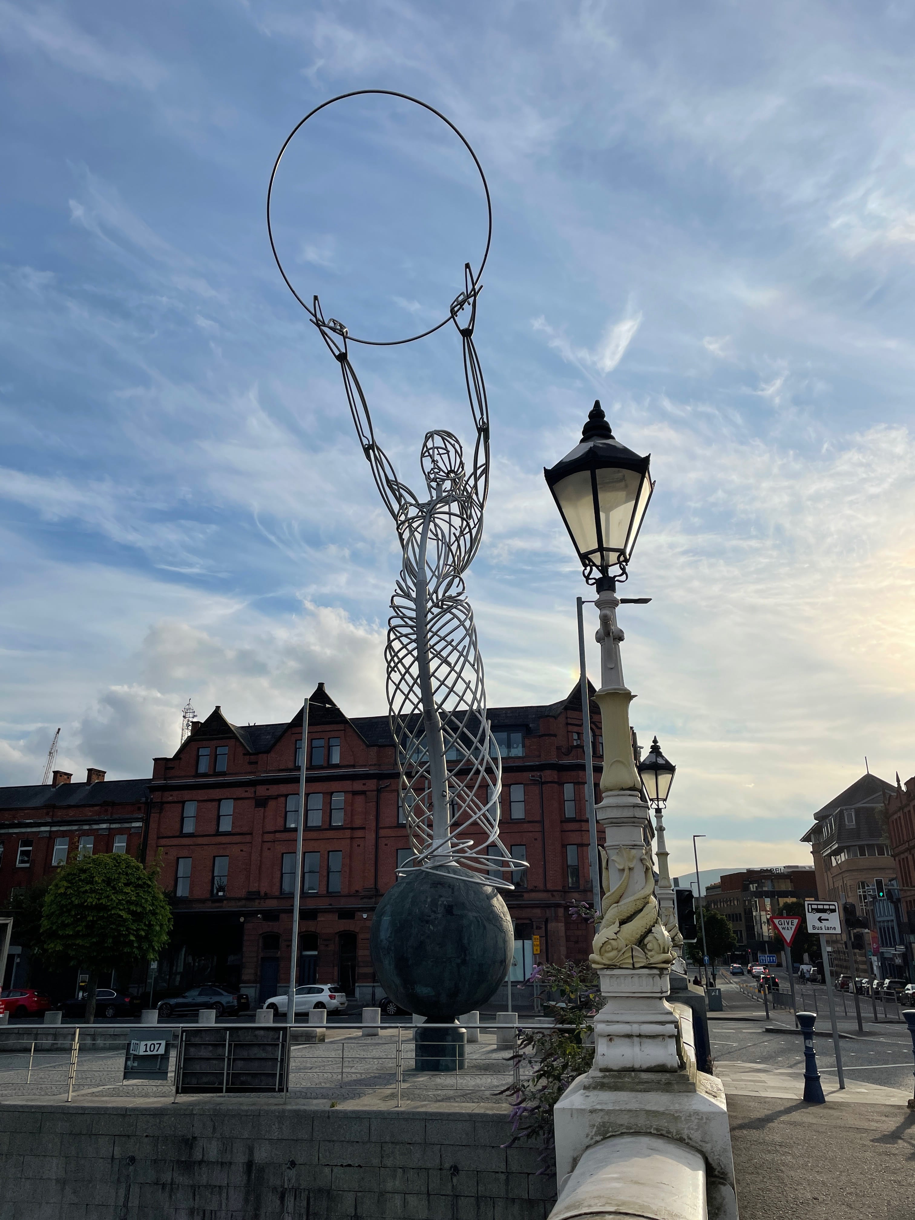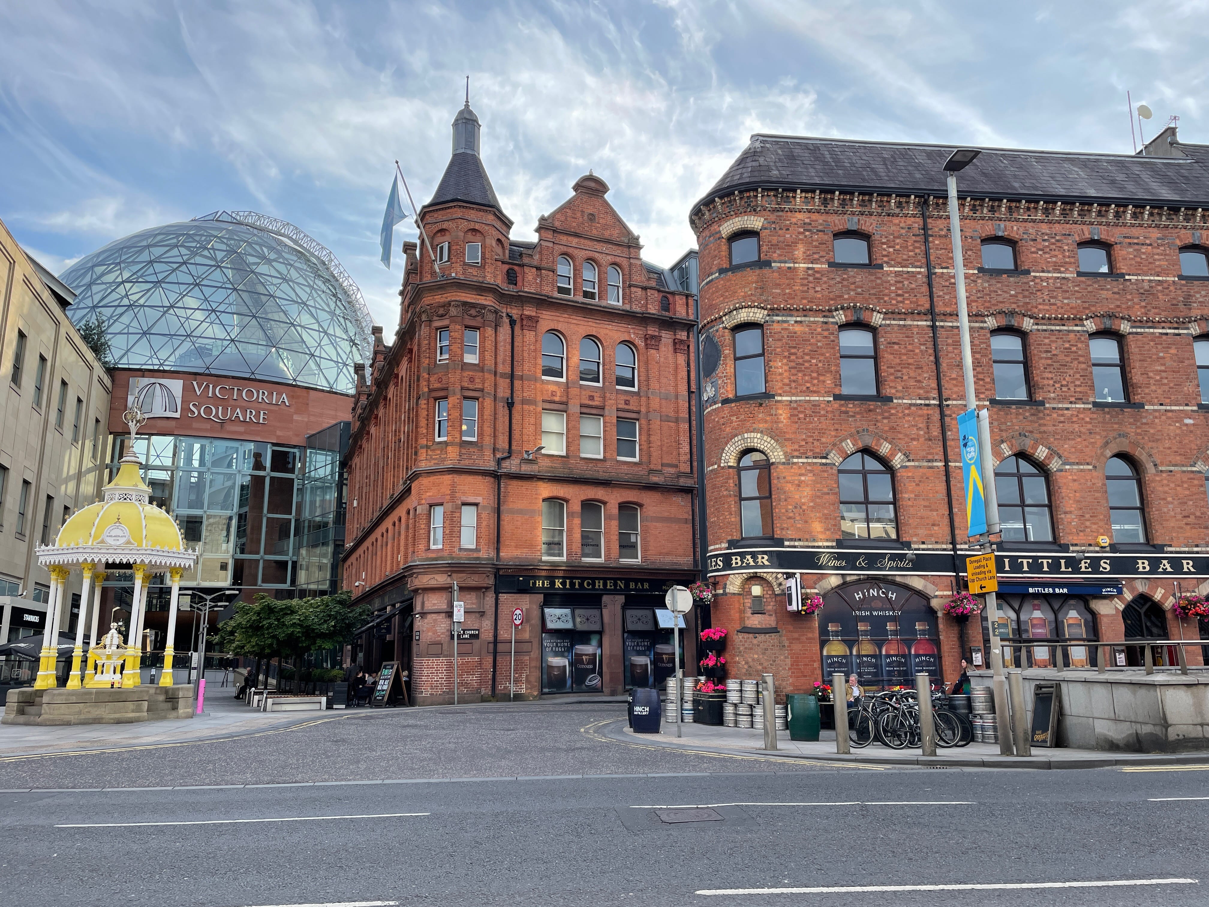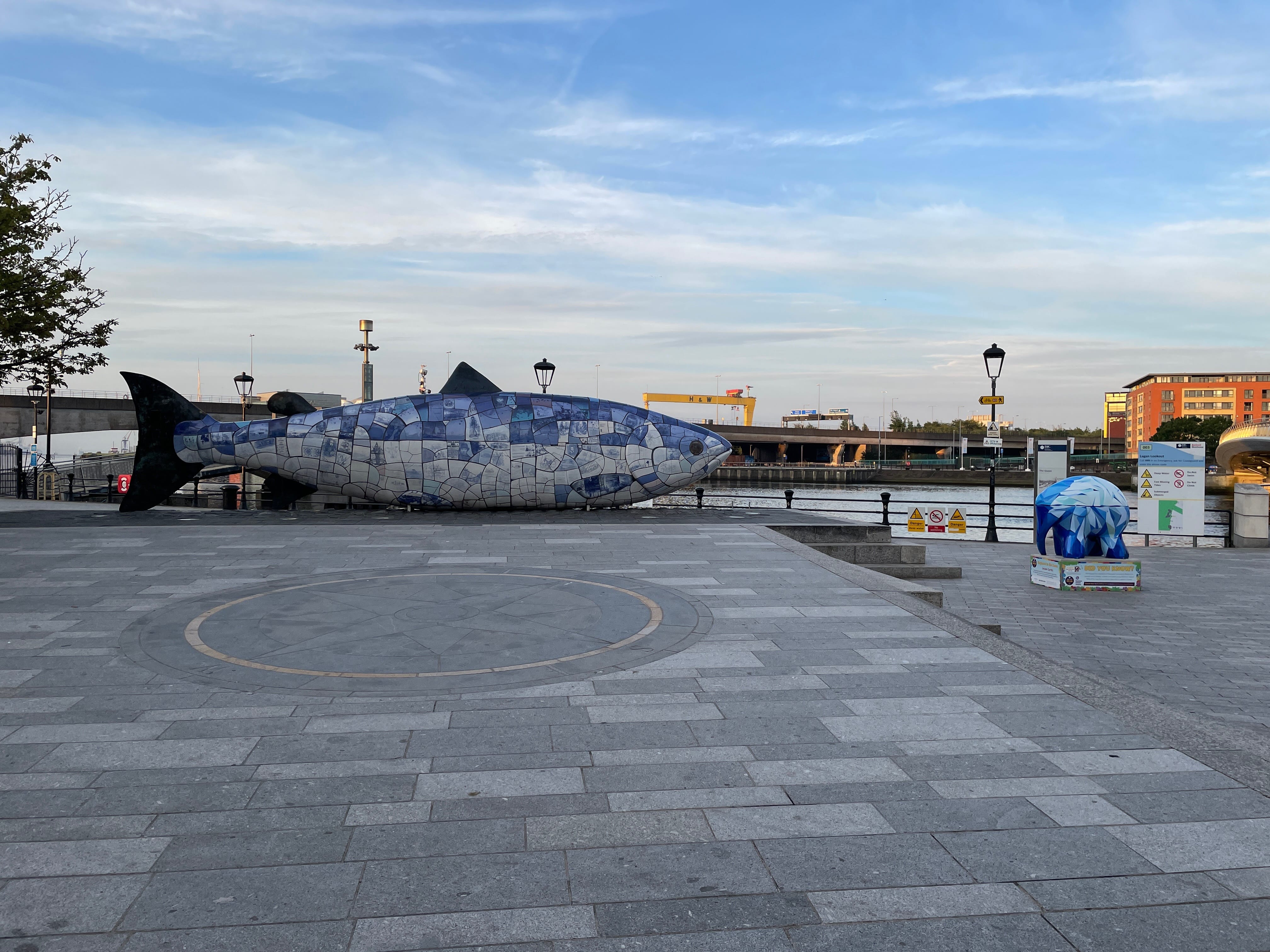 En y arrivant le premier soir, nous décidons d’aller déjà faire un tour au centre, la météo s’annonçant plus clémente que le lendemain. Nous aurons donc à ce moment-là un premier aperçu de la sculpture Beacon of Hope, symbole d’espoir, qui surplombe le fleuve Lagan qui traverse la ville. Un peu plus loin, nous arrivons à Victoria Square, un grand centre commercial dont le dernier étage est une plateforme qui offre une vue à 360°. Malheureusement, l’accès y est limité par des horaires assez peu étendus en soirée. Nous y retournerons donc le lendemain. En repartant vers notre logement, nous passerons encore devant The Big Fish, le Saumon de la Sagesse, qui est une oeuvre couverte de céramique qui célèbre le fleuve et qui abrite une capsule temporelle contenant différents documents en rapport avec Belfast.