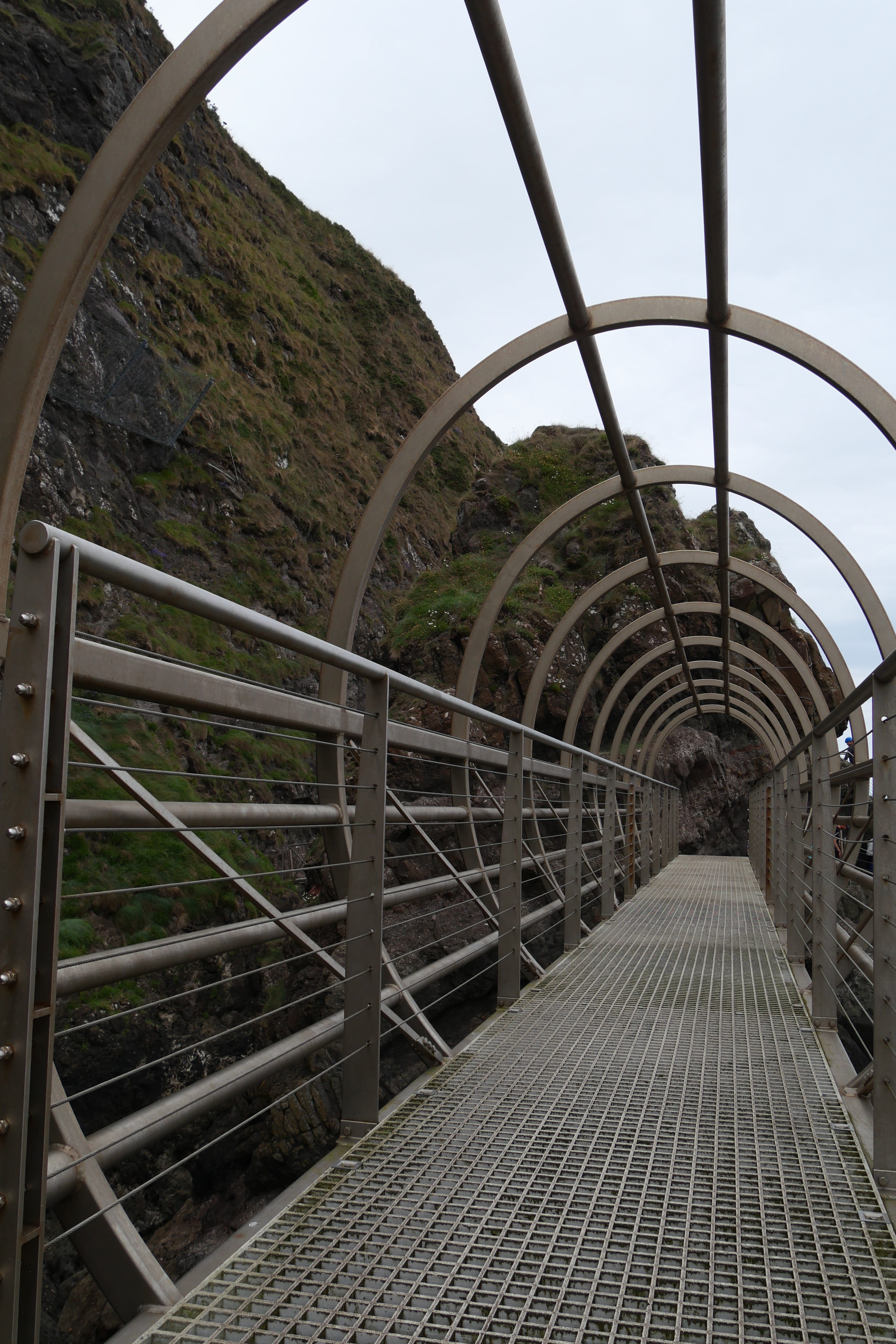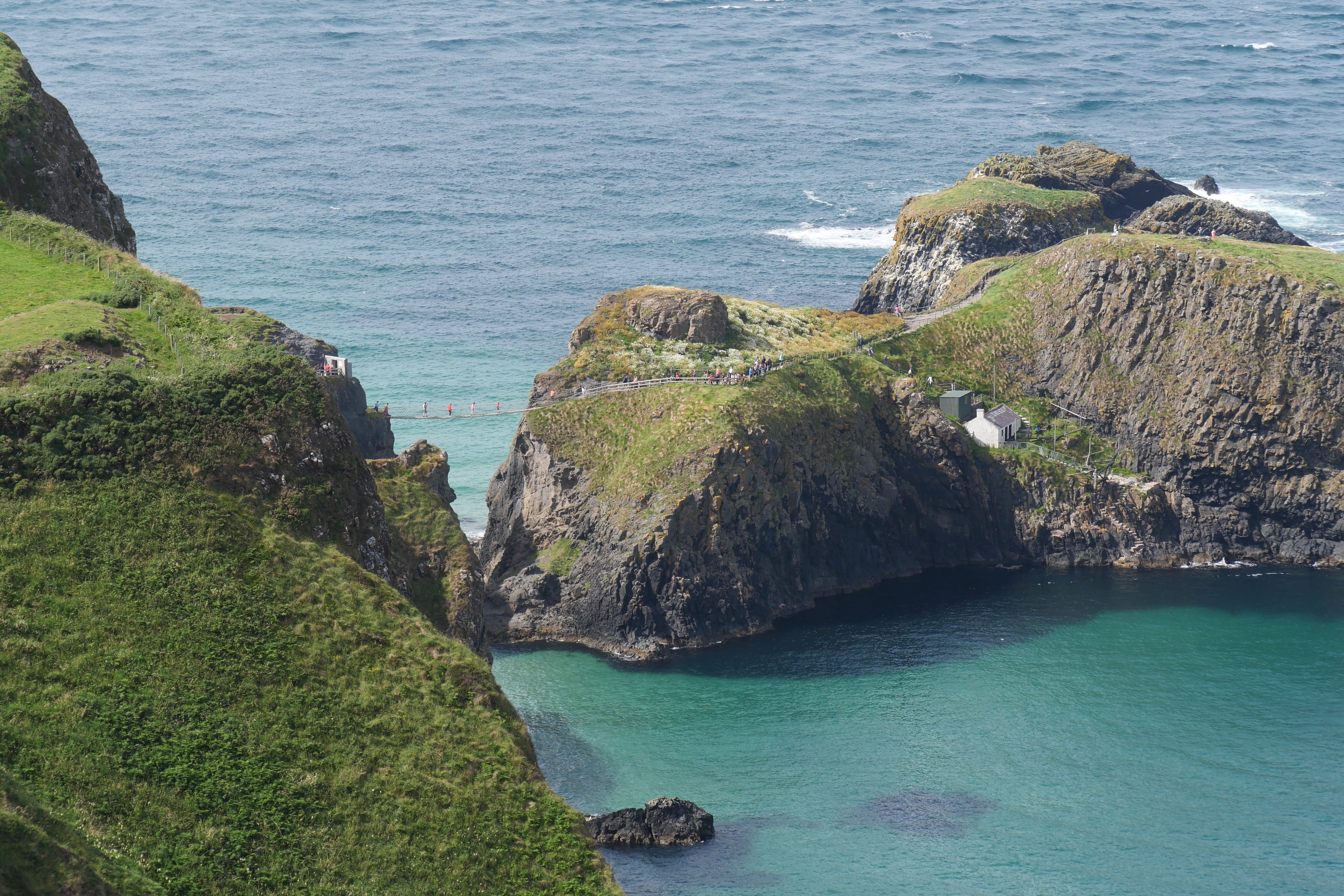 C’est après en avoir pris plein les yeux donc, et avoir rejoint le parking en terminant la boucle par le trail bleu, que nous reprenons la route. Nous avions repéré un autre arrêt un peu plus loin : Carrick-a-rede rope brige, un pont de bois et de cordes reliant le continent et une île. Le tarif nous semblant prohibitif (£13/personne) juste pour faire un aller-retour sur le pont, nous nous sommes seulement garés sur un parking un peu plus à l’Est pour l’observer de loin. Il n’était pas possible d’avoir beaucoup mieux gratuitement, et cela nous suffisait amplement pour le coup.