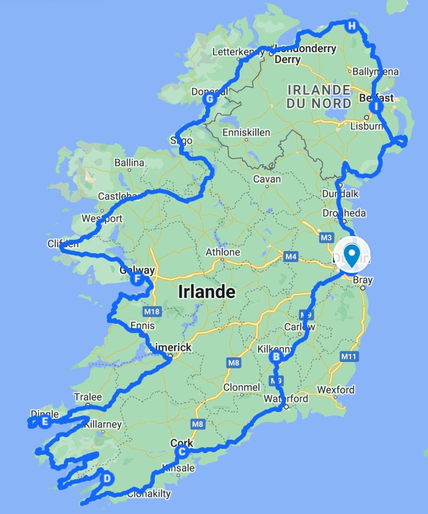 Voilà, un peu plus en détail, le découpage de notre voyage en Irlande, certes toujours aussi court et rythmé que d’habitude, mais pour autant varié et dépaysant :