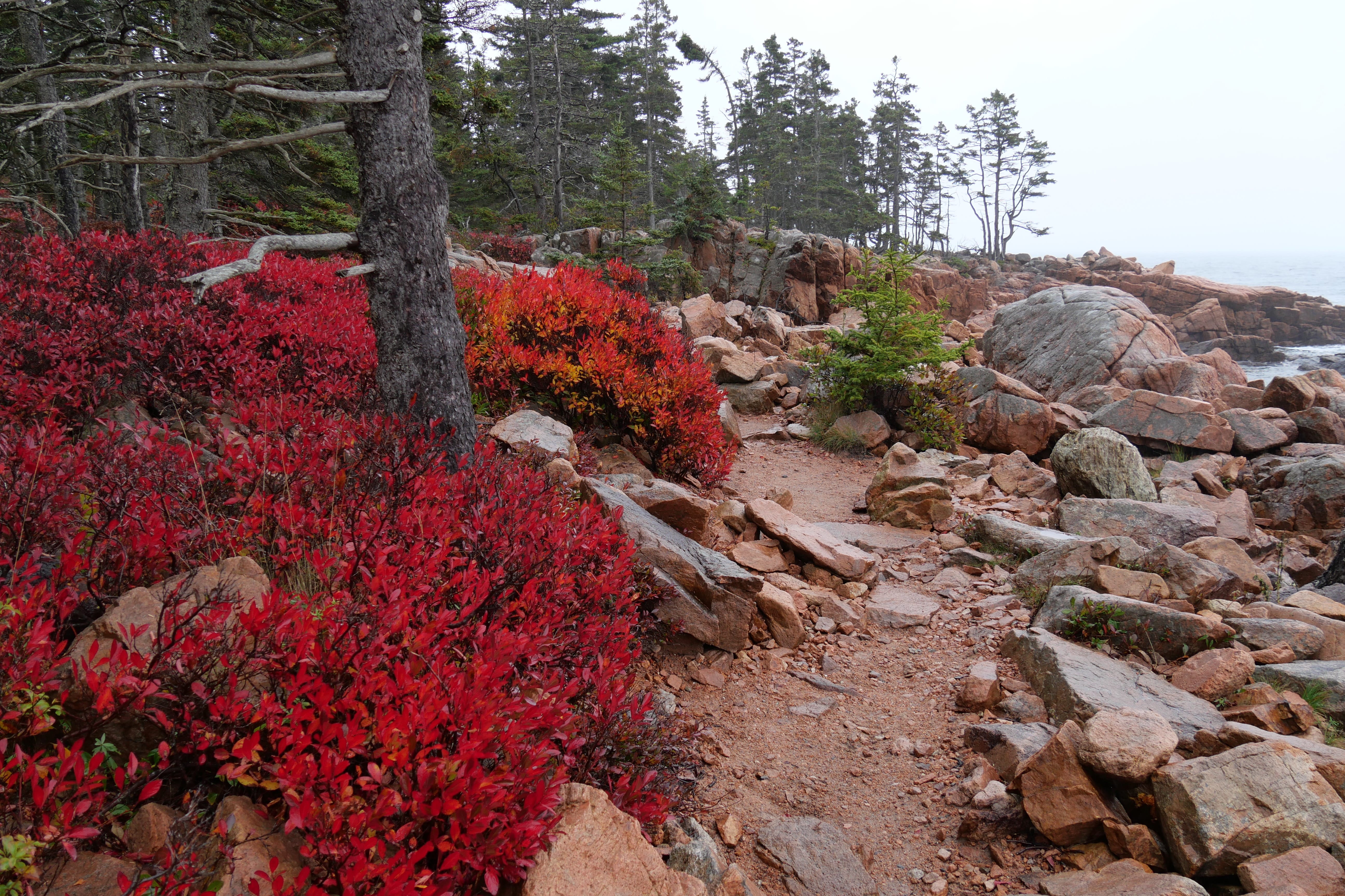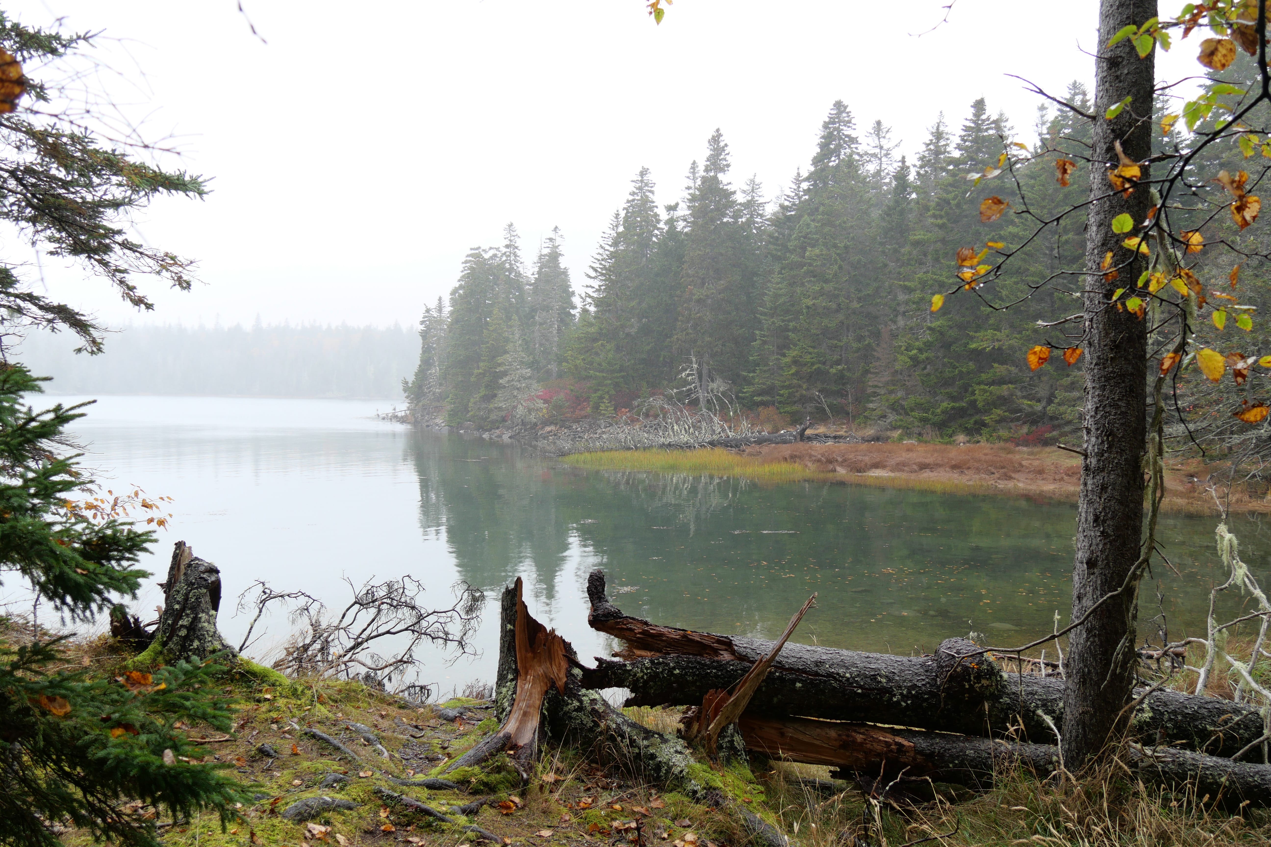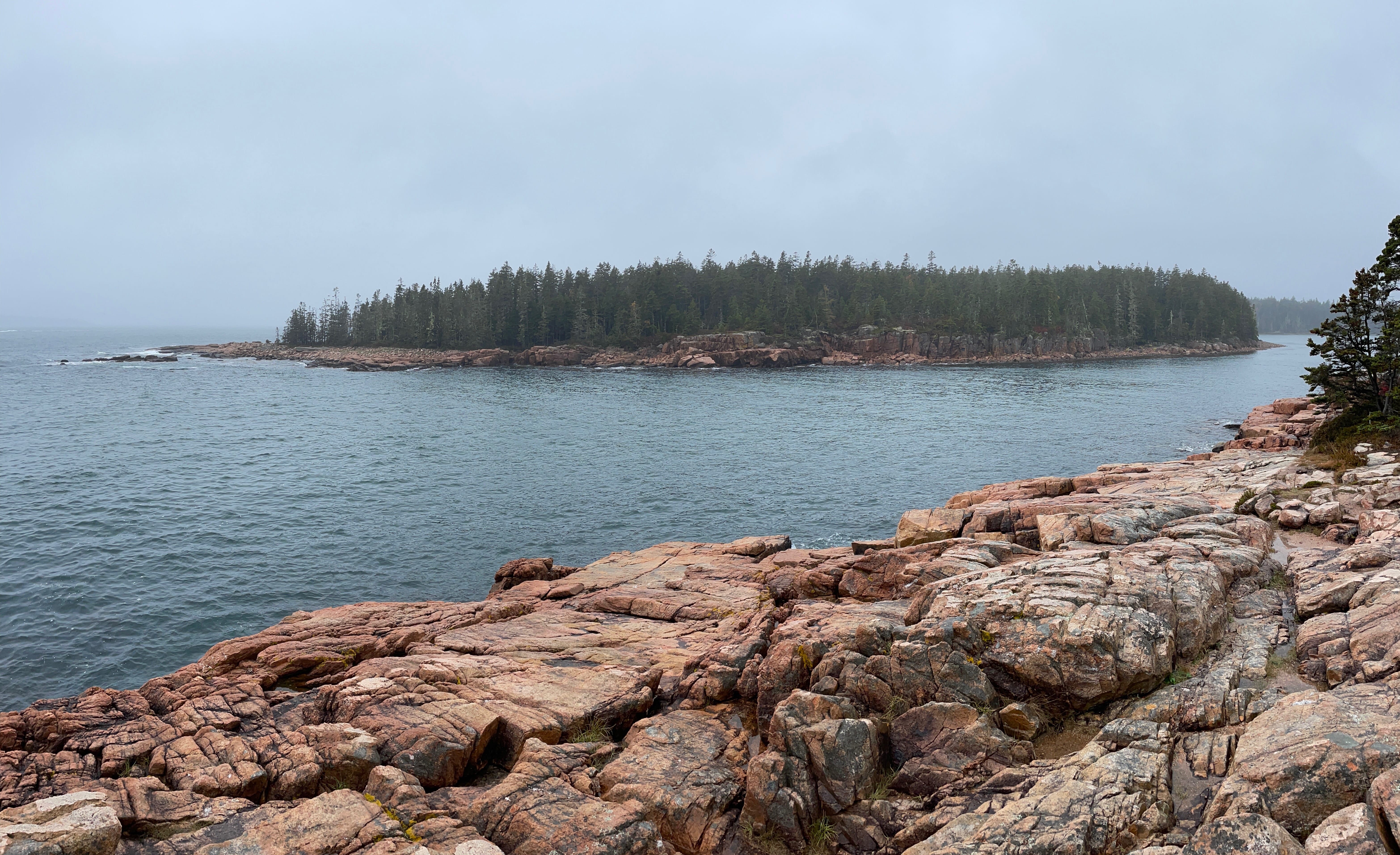 La ranger de l’accueil nous avait précisé que la zone au Sud d’Acadia n’était pas la plus jolie à faire en termes de randonnées/paysages, et qu’il est plus question de petites bourgades et de résidences secondaires que de départs de trails ou paysages particulièrement significatifs. On sort d’ailleurs du parc en y allant, même si l’on reste sur la presqu’île. Si l’on a hésité un peu, en sortant du Visitor Center, à maintenir cette boucle, nous l’avons quand même faite, et c’est tant mieux car cela aura été notre seule contact avec la faune locale, en l’occurrence des biches traversant le très sommaire chemin nous amenant tranquillement vers Seal Cove Picnic Area, sympathique, sans plus. Bass Harbor Head Light Station aura su maintenir l’ambiance humide de la journée en ne nous laissant qu’un court répit le temps de quelques clichés. C’est en faisant la petite randonnée de Ship Harbor Trail que nous passerons le meilleur moment de cette journée, quasiment seuls au monde sur ce petit sentier sinueux débouchant sur des plages de cailloux face à des étendues d’eau paisibles, ou se concluant au bord de l’Océan relativement animé ce jour là. La suite de la journée n’aura été que de partie remise en partie remise. Et encore aujourd’hui, on a un peu du mal à cacher notre frustration lorsque l’on pense à ce que l’on a manqué, faute de visibilité, et ça n’aura pas été faute d’essayer.
