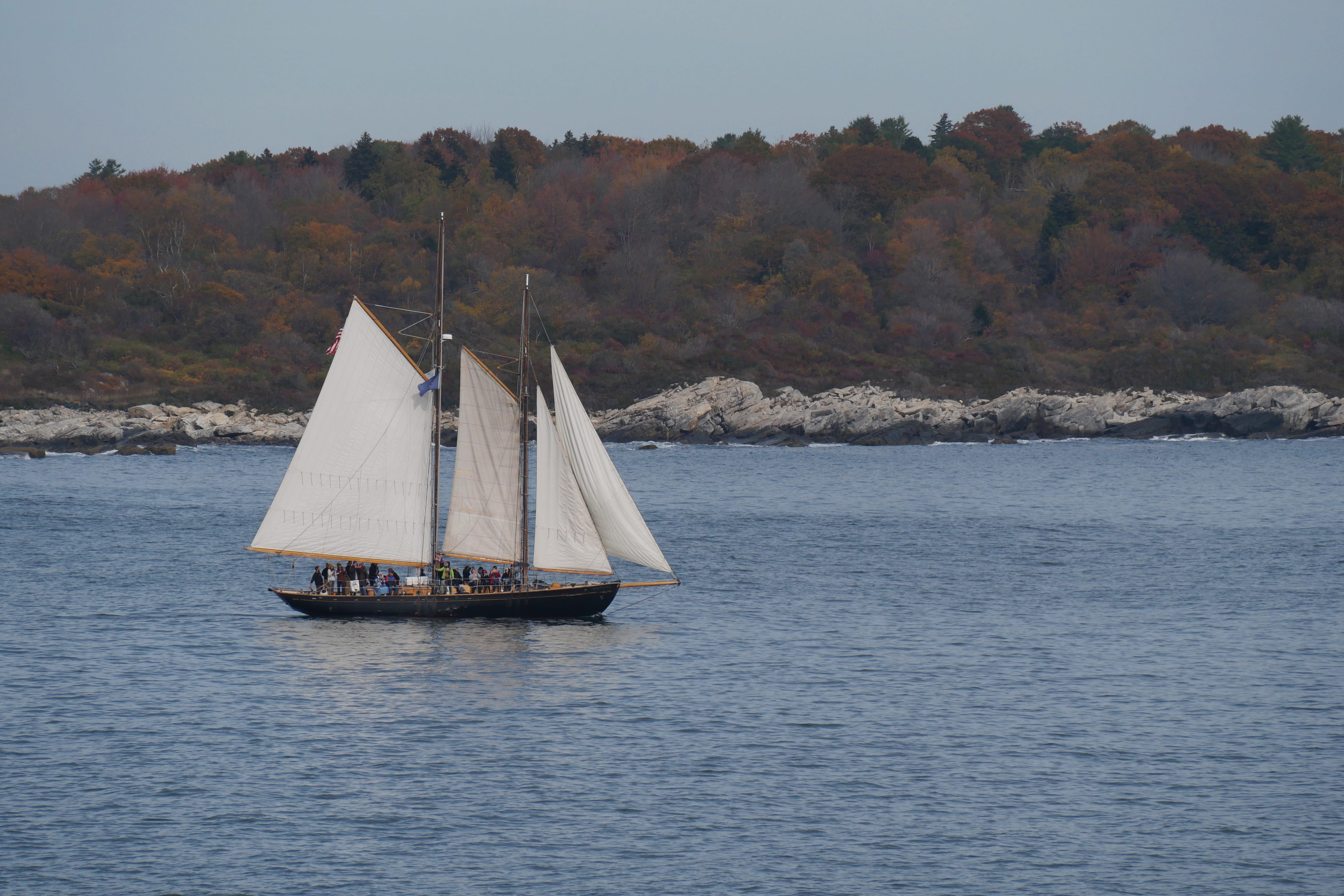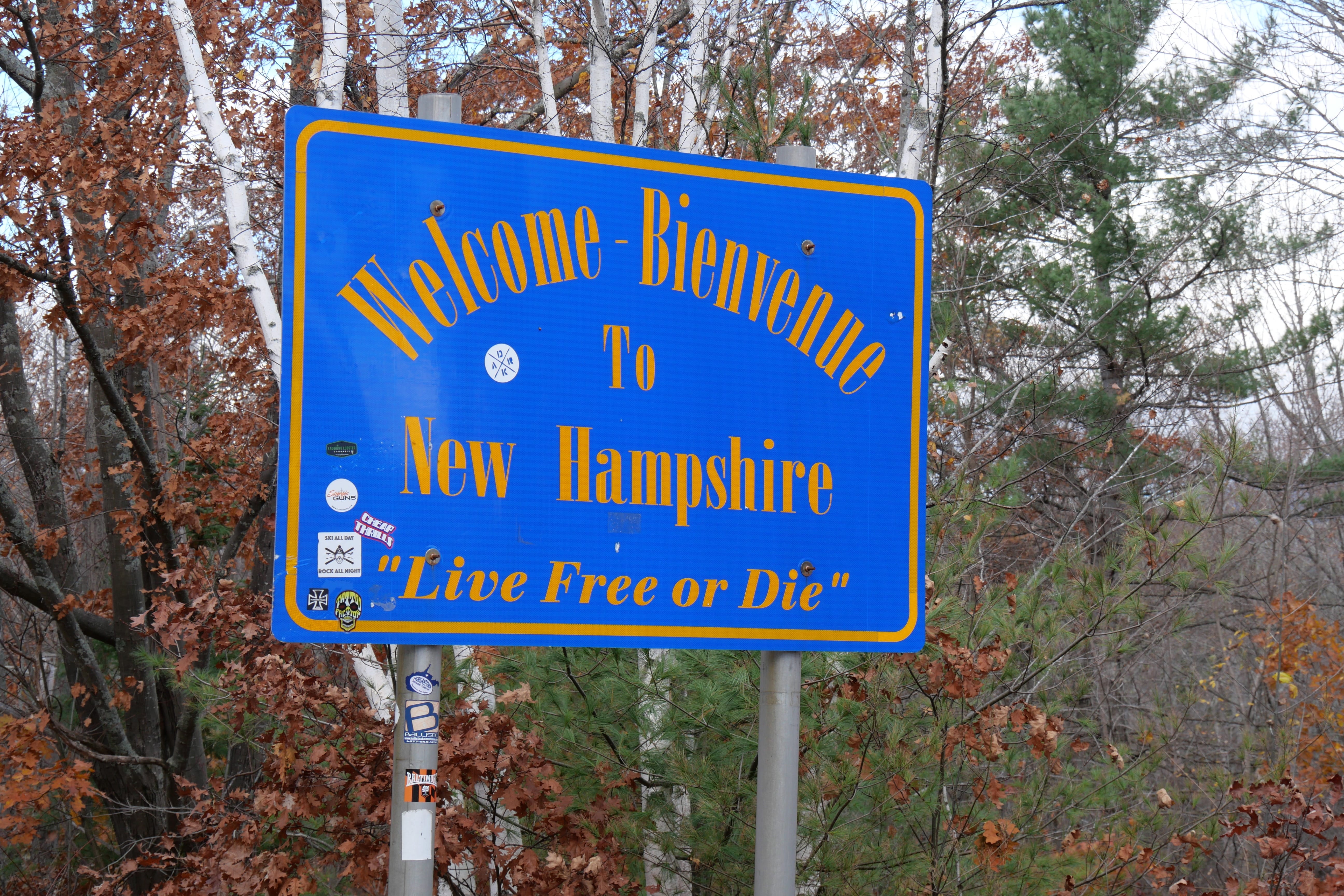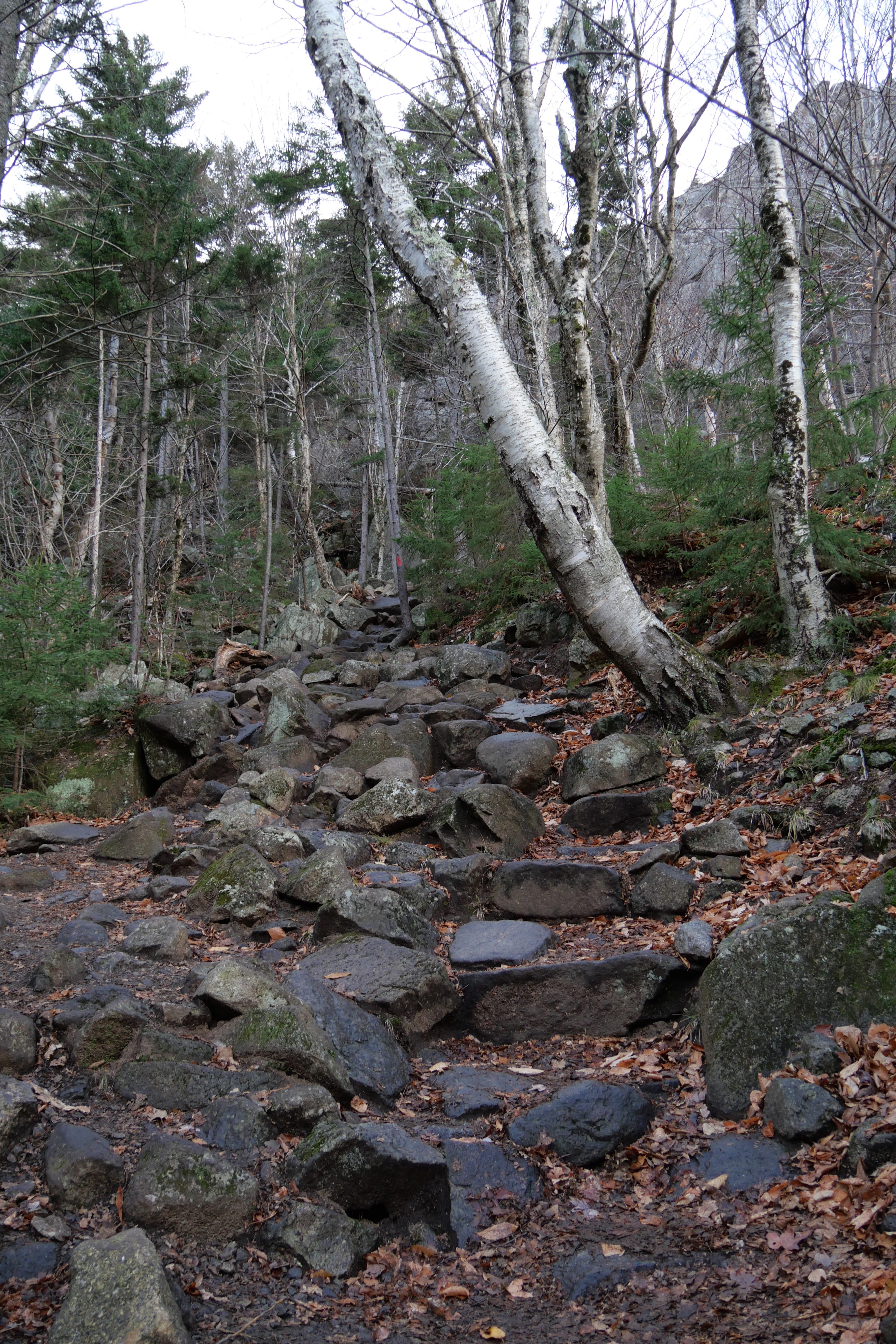 Enfin, dernier arrêt de la journée, avant notre Bnb à Meredith, NH, Artist’s Bluff Loop. Il s’agit d’une boucle de randonnée, permettant d’avoir une vue imprenable sur une vallée où normalement les couleurs automnales des arbres valent assurément l’effort nécessaire pour atteindre le point. Pour faire simple, nous avons décidé de maintenir la randonnée, afin de n’avoir aucun regret, mais nous la déconseillons à tous ceux dont le niveau sportif n’est pas suffisant pour la faire dans de bonnes conditions. En effet, depuis le parking, nous avons pris le départ en même temps qu’une famille avec un nourrisson, qui a décidé, dès les premiers mètres, de rebrousser chemin, heureusement. La montée, en suivant le balisage, se fait par des escaliers façonnés sommairement, pour un dénivelé plus que correct, entre un bon quart d’heure et une petite demi-heure, avant de se faufiler sur d’étroits sentiers sur les hauteurs jusqu’au point de vue, que nous n’étions même pas sûrs d’avoir atteint tellement le résultat nous semblait mitigé. La descente se transforme en vrai calvaire lorsqu’il faut presque sauter de pierre en pierre, calculant chaque pose de pied tant le dévers est important et la chute risquée. En cette période, nous n’avons croisé qu’une poignée de personnes, et ne recommandons ainsi pas cet arrêt sans avoir bien connaissance de ce dans quoi vous vous engagez. Nous avions lu que la randonnée était abordable avant de la faire, et nous ne pouvons qu’au mieux émettre de bonnes réserves là-dessus. Cela reste un souvenir, mais nous étions tout de même contents de retrouver la voiture au retour !