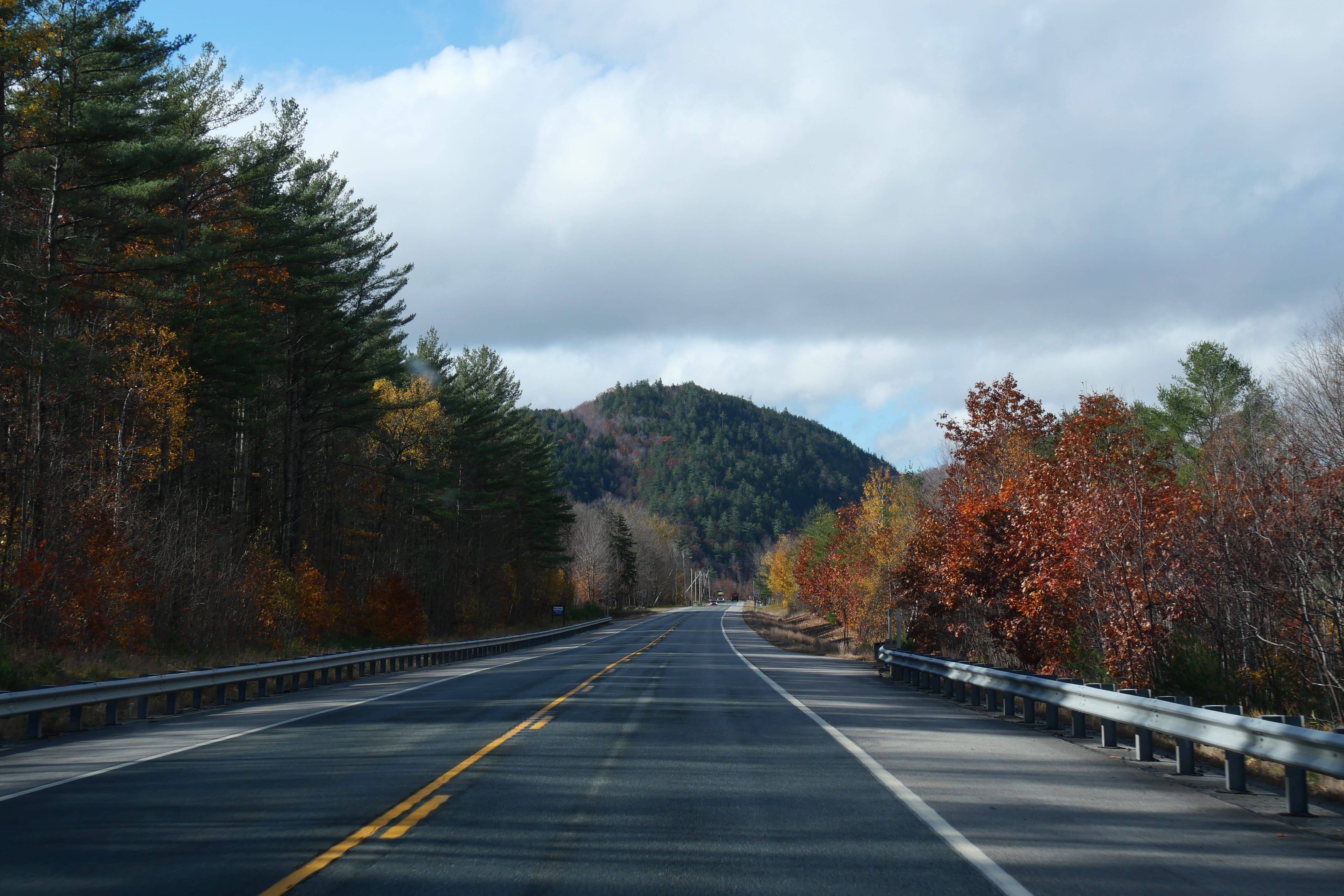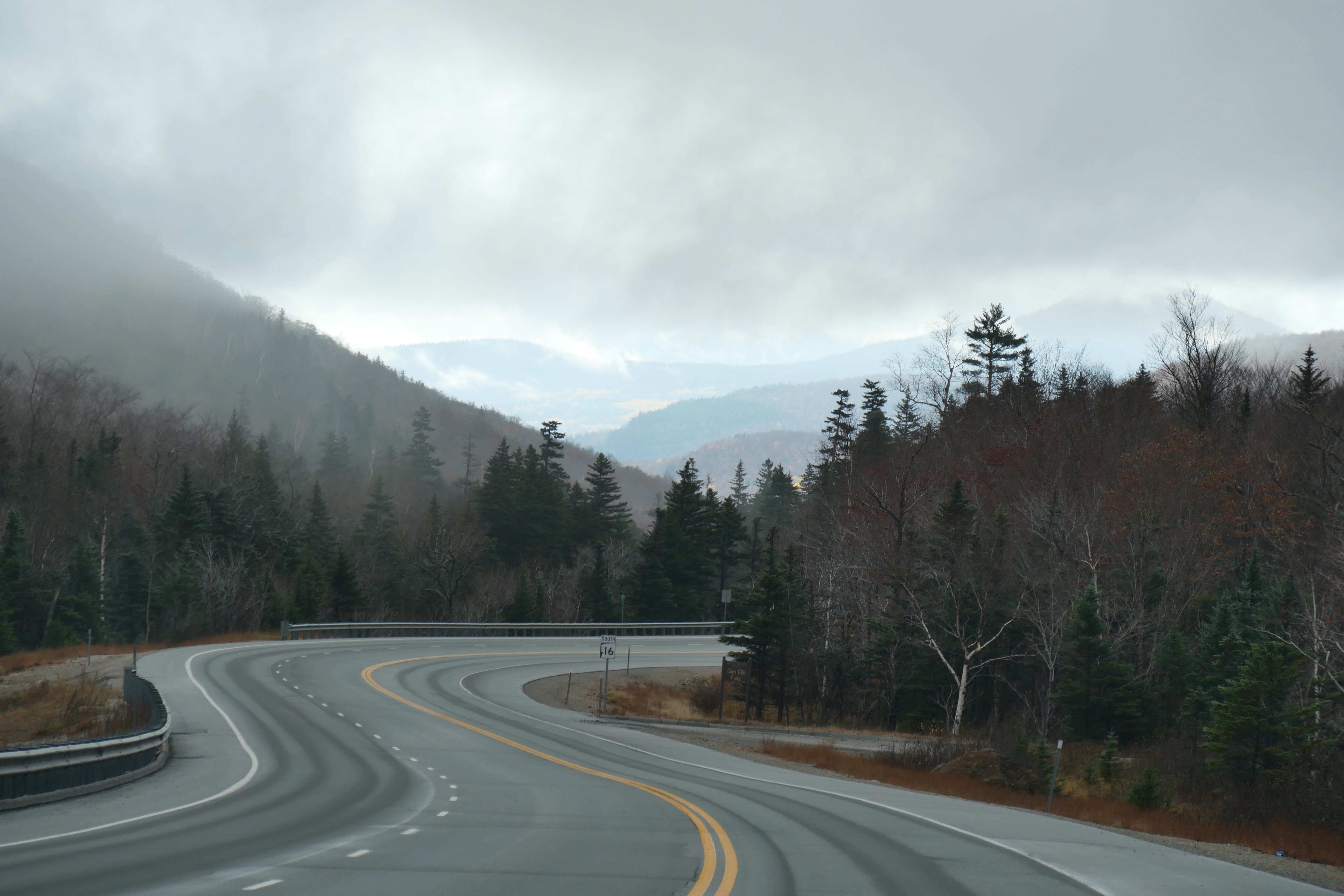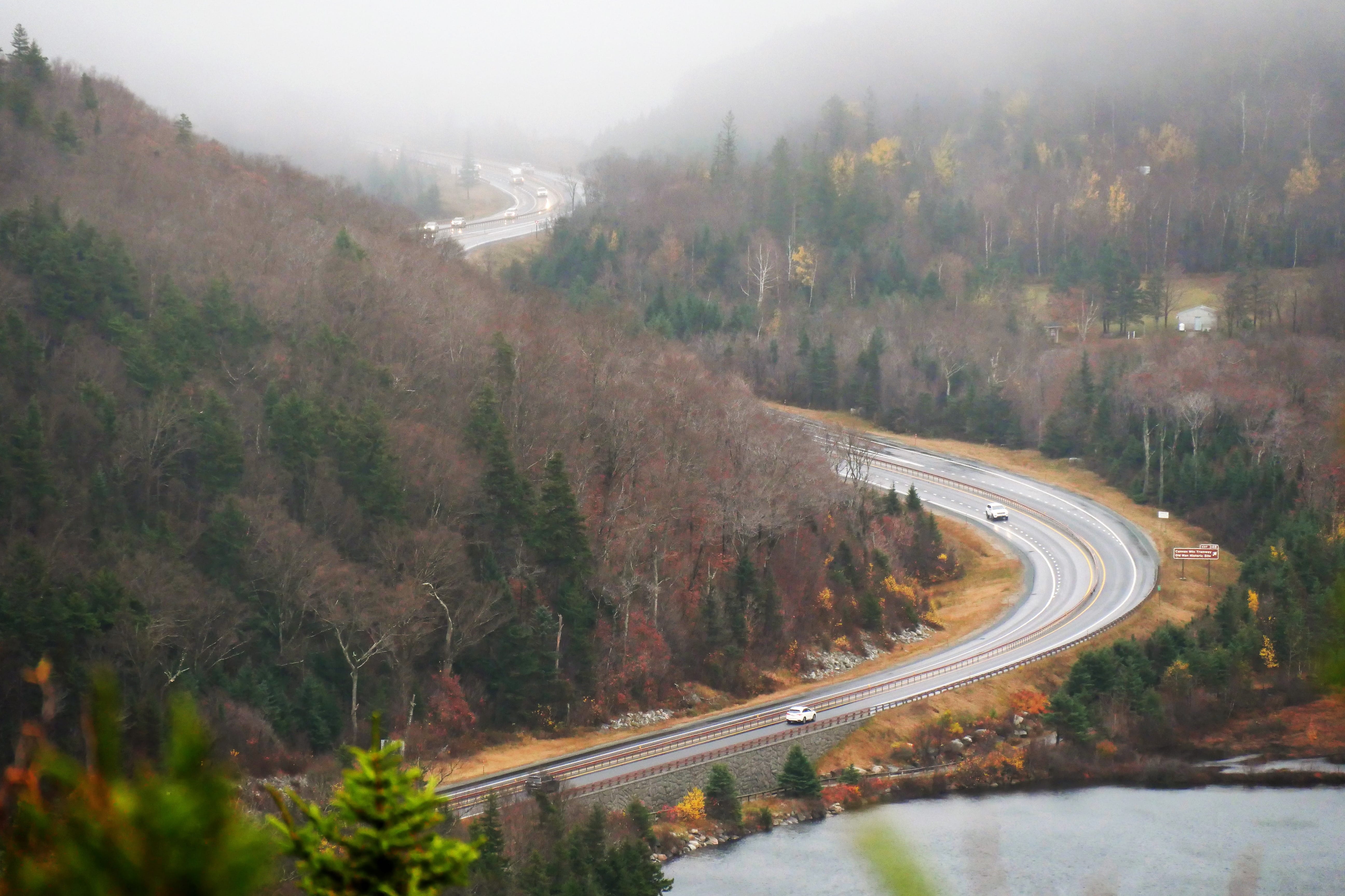 Rentrés prématurément à la chambre la veille, nous en avons profité pour revoir une partie du voyage, et c’est donc directement vers les White Mountains que nous avons pris la route. Plus que jamais, cela aura été un vrai plaisir de parcourir ces routes en pleine nature, en cette fin d’automne, enchaînant lacs miroirs et petites bourgades reculées avec vallées et montagnes imposantes. C’est d’ailleurs l’une d’entre elles, le Mont Washington (1917m), que nous admirerons d’en bas, la route vers le sommet étant fermée pour l’hiver. A noter que nous avons tout de même eu la chance qu’il se dévoile le temps de quelques kilomètres, avant que le brouillard ne finisse par envelopper à nouveau toutes les pointes alentours.