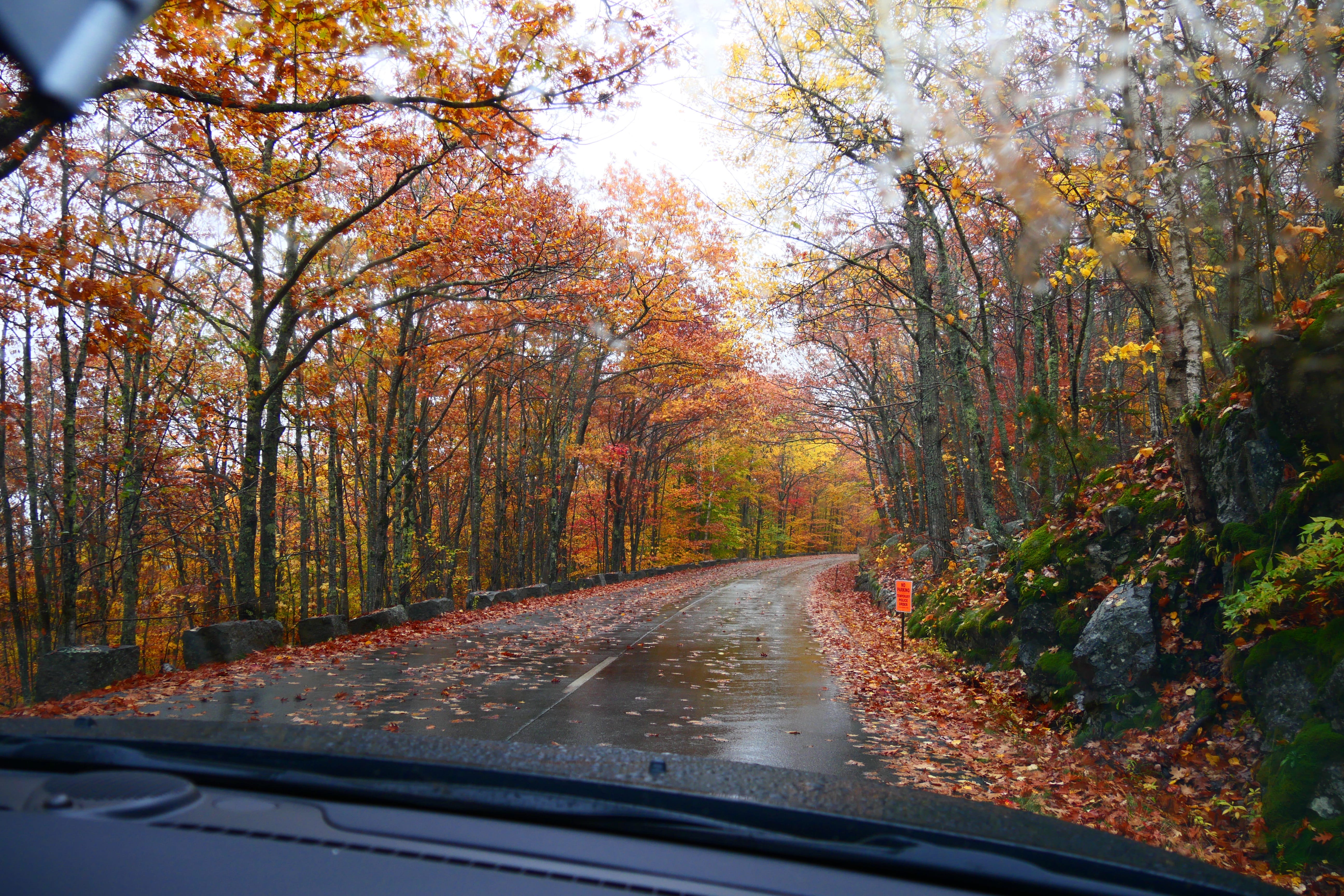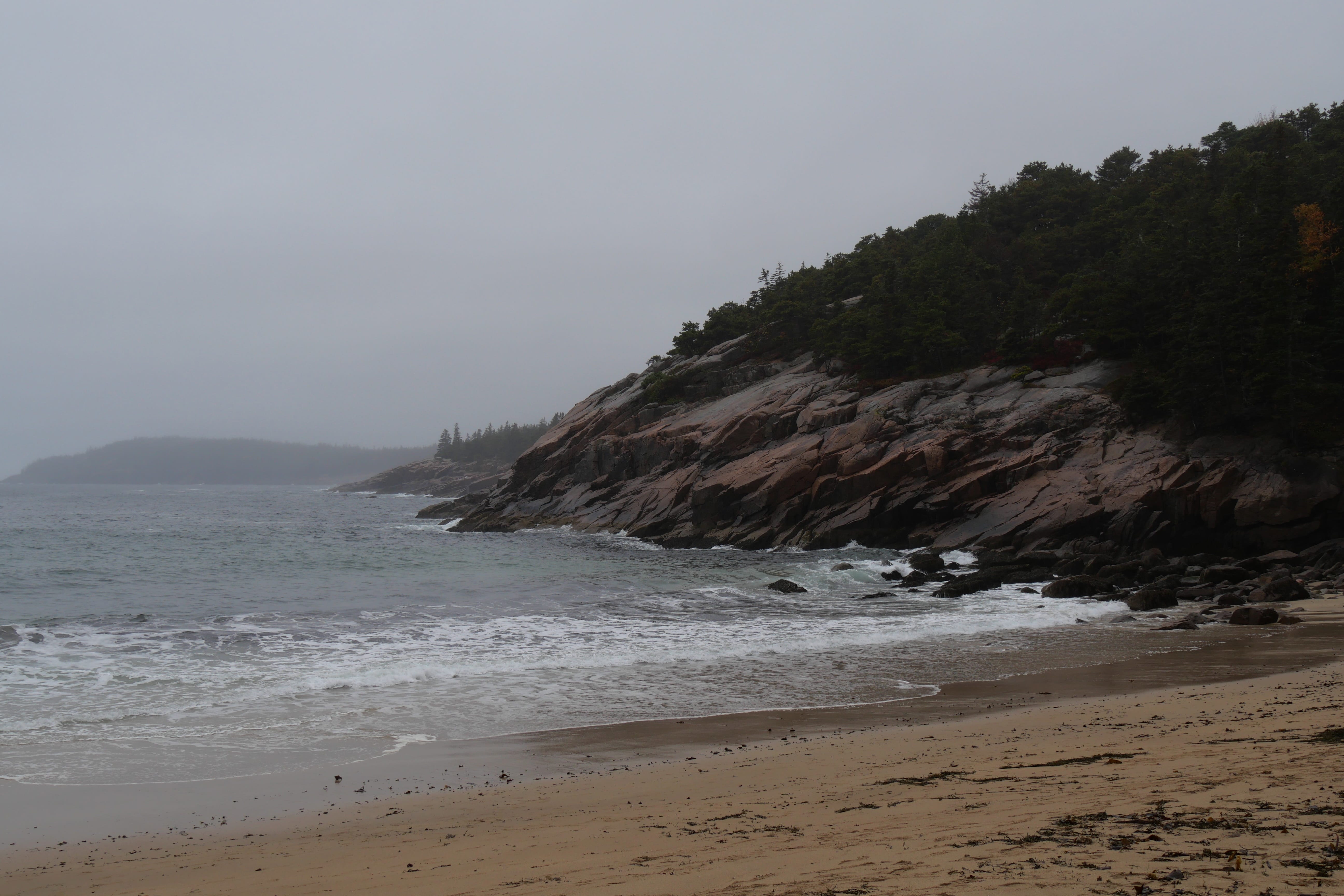 Ainsi, nous n’aurons finalement pas fait le tour de Jordan Pond, dont nous n’avons gardé qu’un rapide aperçu, en descendant du parking jusqu’au bord du lac. Bubble Rock aura été l’occasion d’un court arrêt sur la route, tout comme Beaver Dam Pond. A Sand Beach Overlook, nous avons quand même suivi le mouvement en allant jusqu’à la plage, qui, il faut le reconnaître avait un certain charme dans ce contexte. Nous avions initialement passé sur la montée vers le Mont Cadillac, espérant que le brouillard finisse par se lever, mais au retour de notre boucle sur le littoral, au deuxième passage devant l’entrée de la route sinueuse jusqu’au sommet, il n’était donc plus question de reculer. Elle, dormait à ce moment-là, et plus Il, enchaînait les virages, plus Il savait déjà que nous ne verrions rien au sommet. C’était en quelque sorte la conclusion parfaite de cette journée, et le point de départ de cette idée de revoir une partie de ce RoadTrip, afin de retrouver une météo nous permettant de ne plus passer à côté de sublimes paysages. Pour dire à quel point nous ne voyions rien à cet instant, nous ne sommes même pas sortis de la voiture, alors qu’il commençait à pleuvoir fortement et n’avons aucun cliché du sommet.