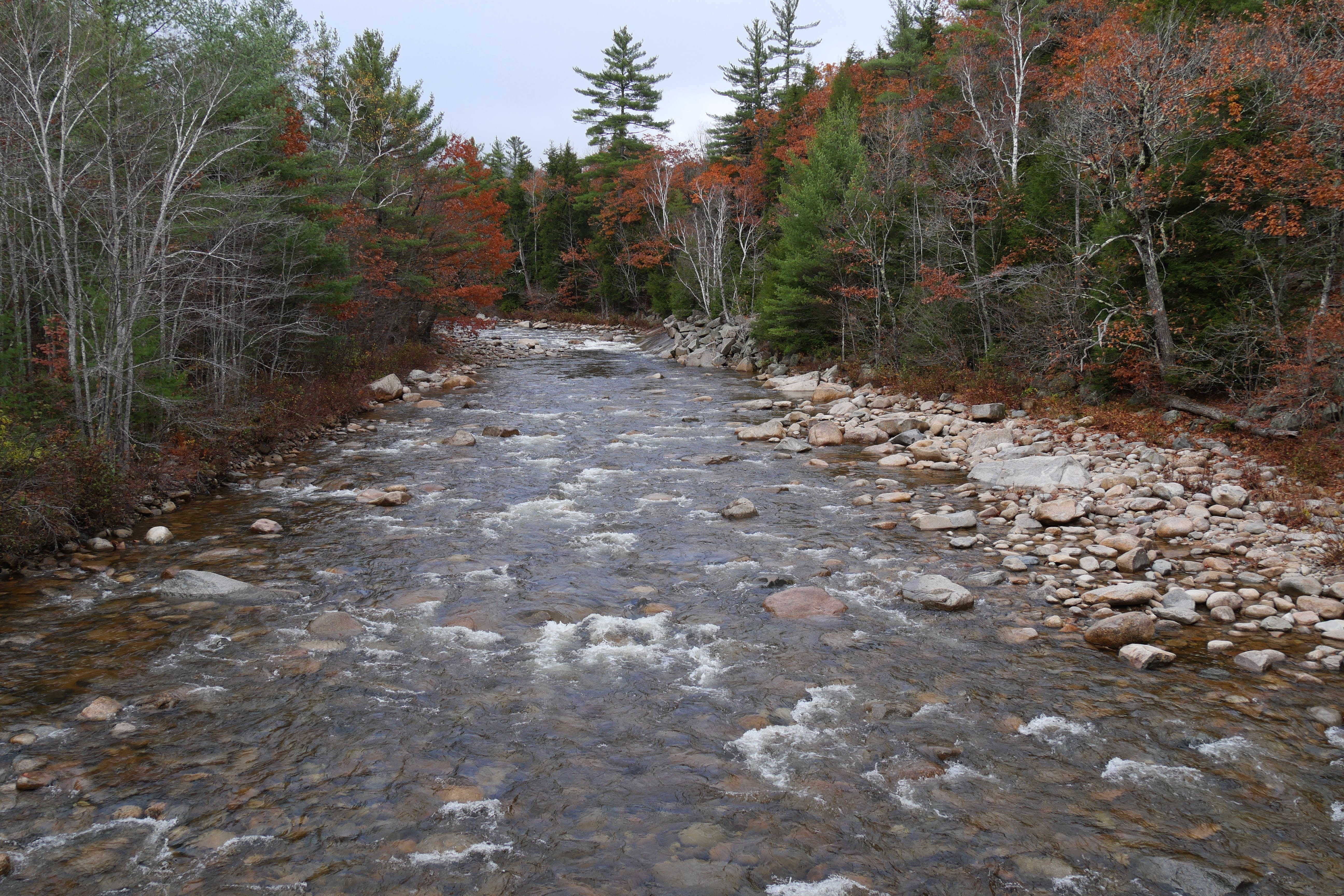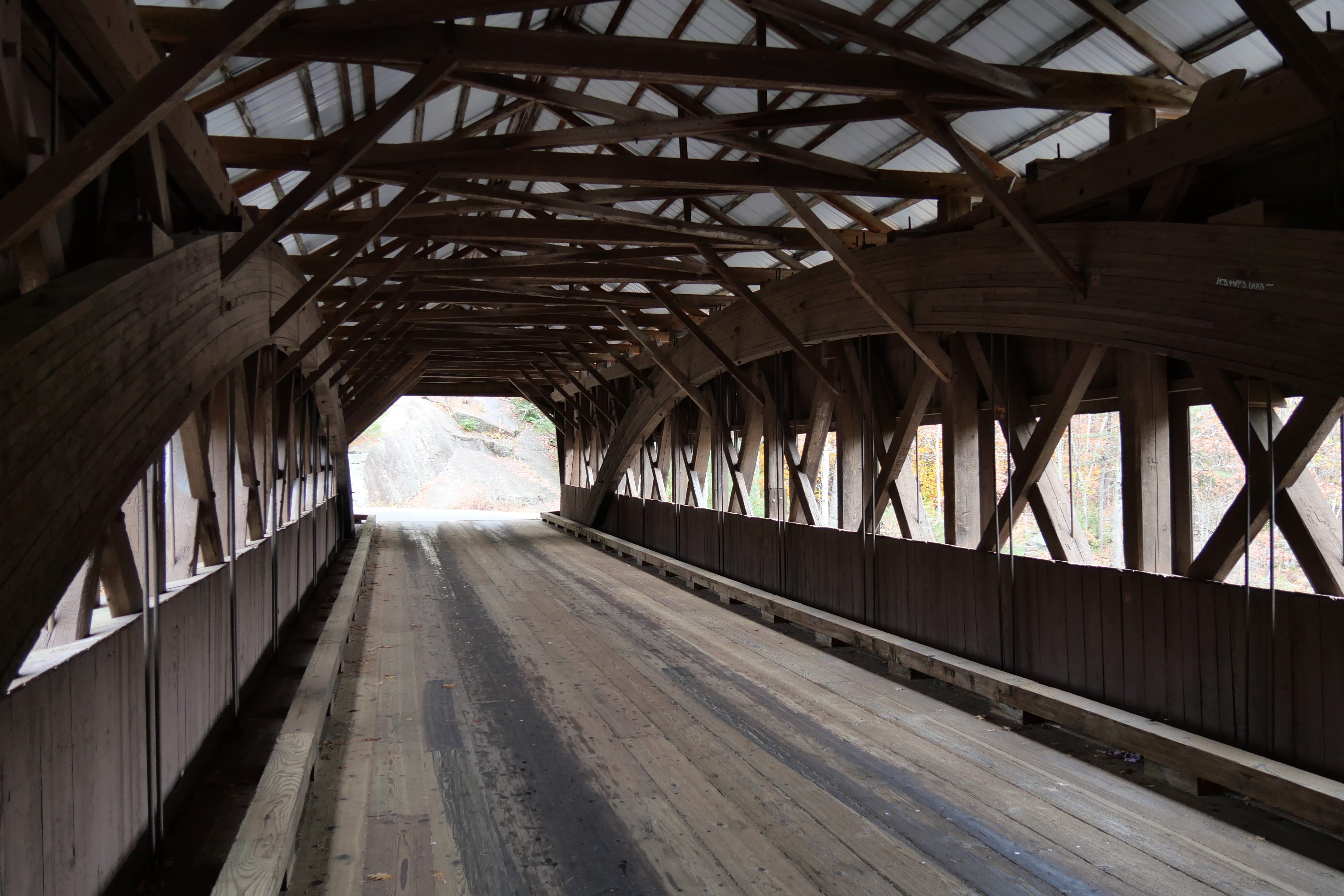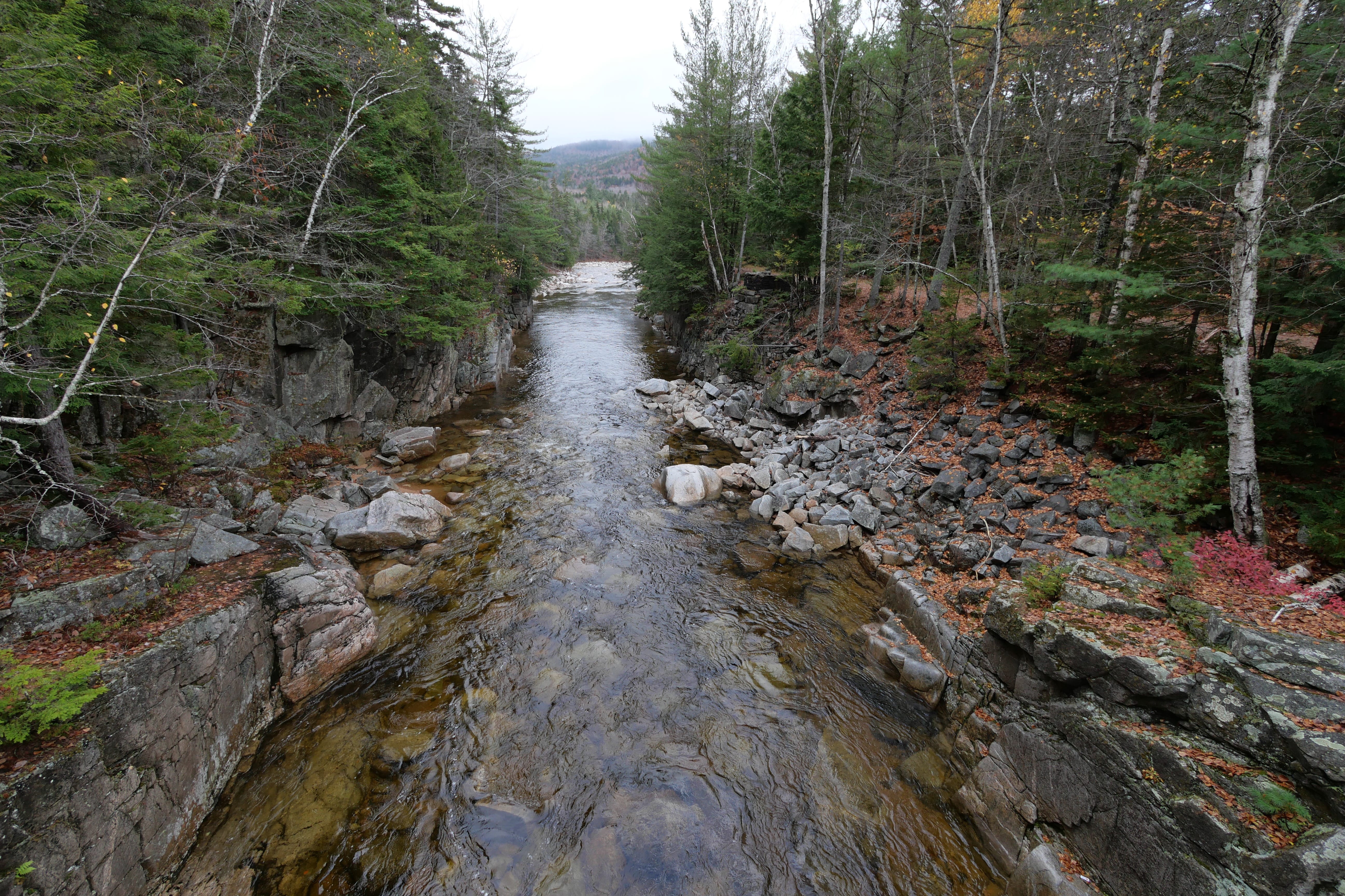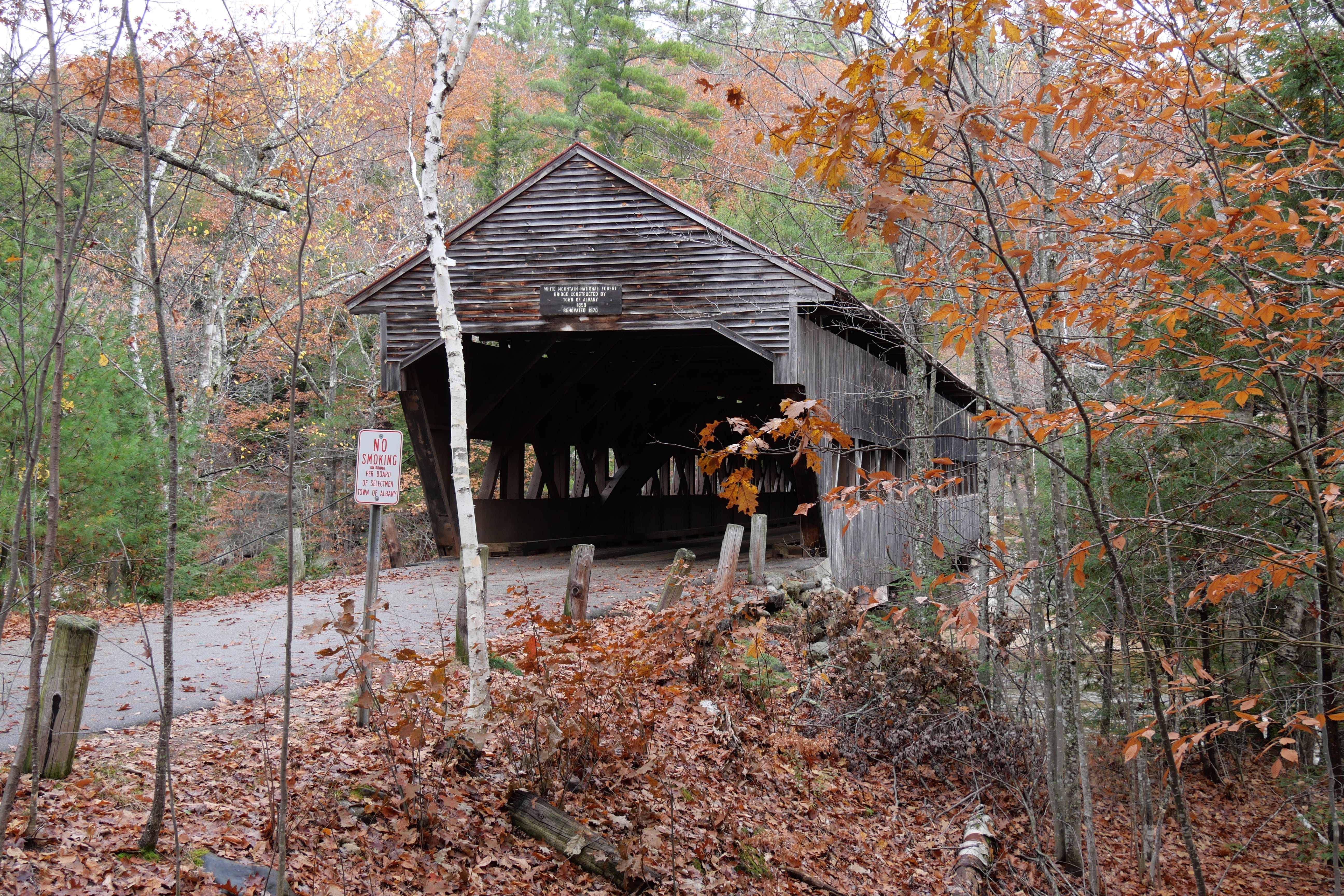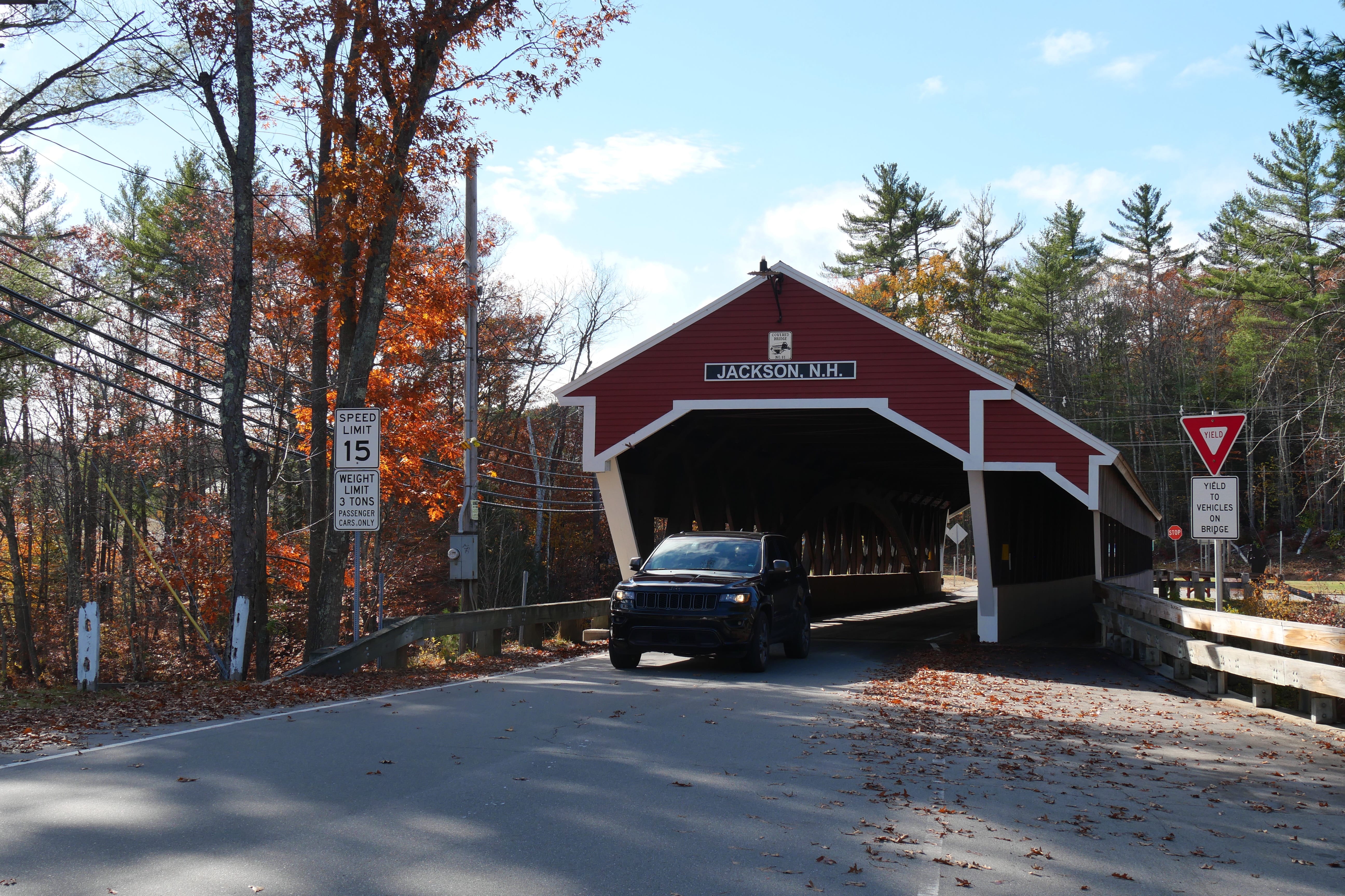 L’arrivée par le Nord à Jackson nous a donné l’opportunité de faire un passage sous l’une des particularités de cette partie des Etats-Unis, les ponts couverts. Pour la petite anecdote, Il, a multiplié les passages sous le pont pendant qu’Elle, essayait d’avoir un cliché, à la fois sans personne d’autre, et à la fois bien exposé. De Conway, au Sud de Jackson, nous avions également lu qu’il y avait une belle opportunité de photo avec les arbres d’un motel en habit d’automne au premier plan, et le Mont Washington en fond. Nous n’avons pas pu faire ce cliché, le ciel étant trop capricieux. Une fois passés Conway, nous avons pris la Kancamagus Hwy, que l’on ne peut que vous recommander si vous traversez ce coin des Etats-Unis. Elle permet non seulement d’en prendre plein les yeux depuis la route, mais pour peu que vous jouiez le jeu des arrêts éparpillés le long, elle offre également quelques bonnes surprises, variées. C’est là que nous traverserons un autre pont couvert, Albany Covered Bridge, à pied cette fois. Un arrêt aux Lower Falls nous permettra de faire un petit aller-retour pour la digestion. Même idée à Rocky Gorge Scenic Area, autre point d’intérêt permettant d’approcher de la Swift River. De ces deux derniers points partent d’ailleurs des itinéraires de randonnées plus longs, pour ceux que ça pourrait intéresser, sur des sentiers ayant l’air plutôt bien aménagés et préservés.