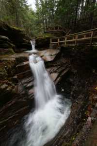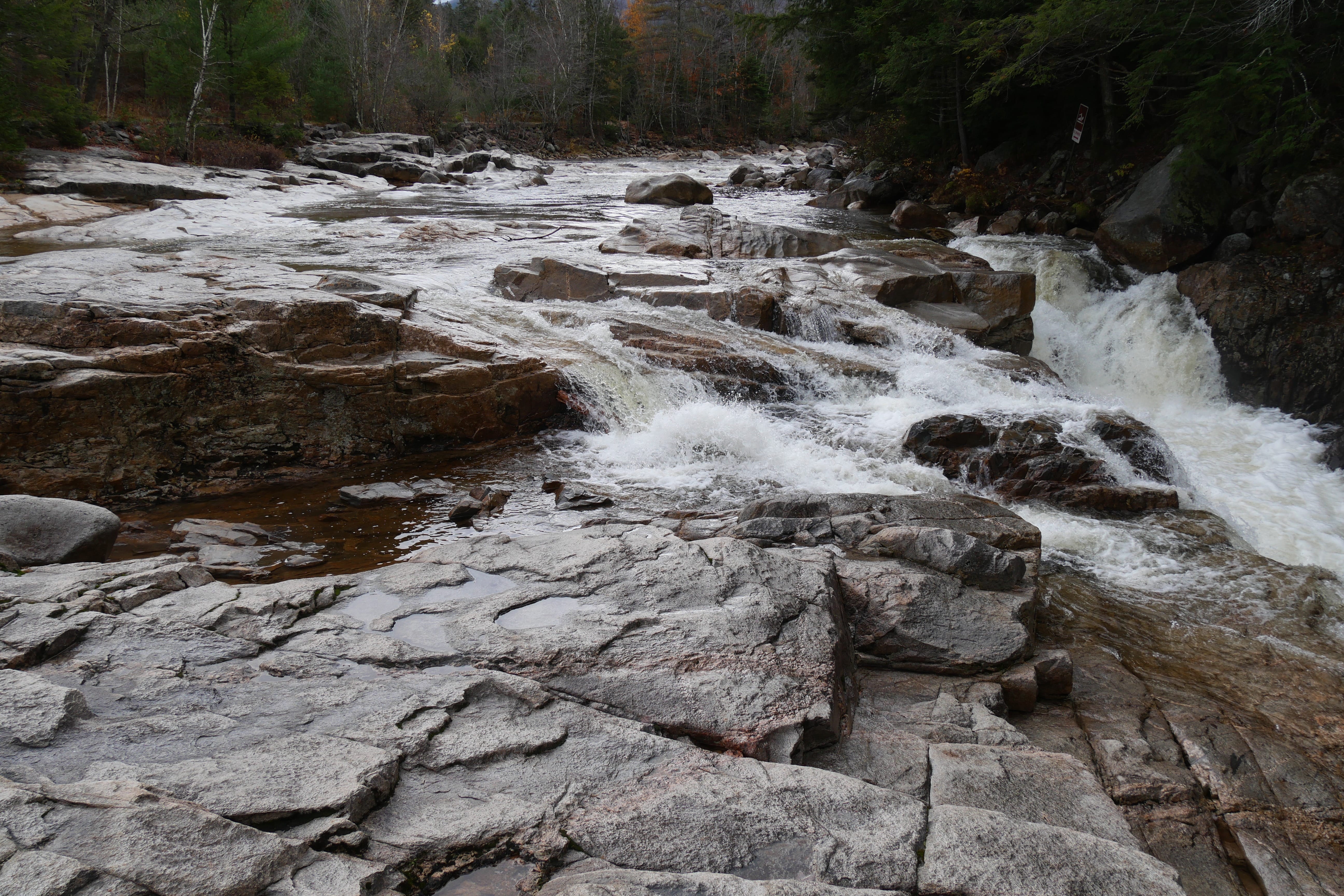 La vue sur les Sabbaday Falls se mérite déjà un peu plus, et nous étions contents de ne pas avoir pique-niquer juste avant, le dénivelé à l’aller étant, sans être un gros défi physique, un bon moyen de se dégourdir les mollets après les heures de voiture. Une fois passé ce point, la route s’élève ensuite jusqu’au passage du col, avec des belles vues sur des montagnes et vallées jusqu’à l’horizon. On mentionnera notamment les arrêts de Pemigewasset Overlook et Hancock Overlook, permettant d’apercevoir un pan ou l’autre de ces montagnes.