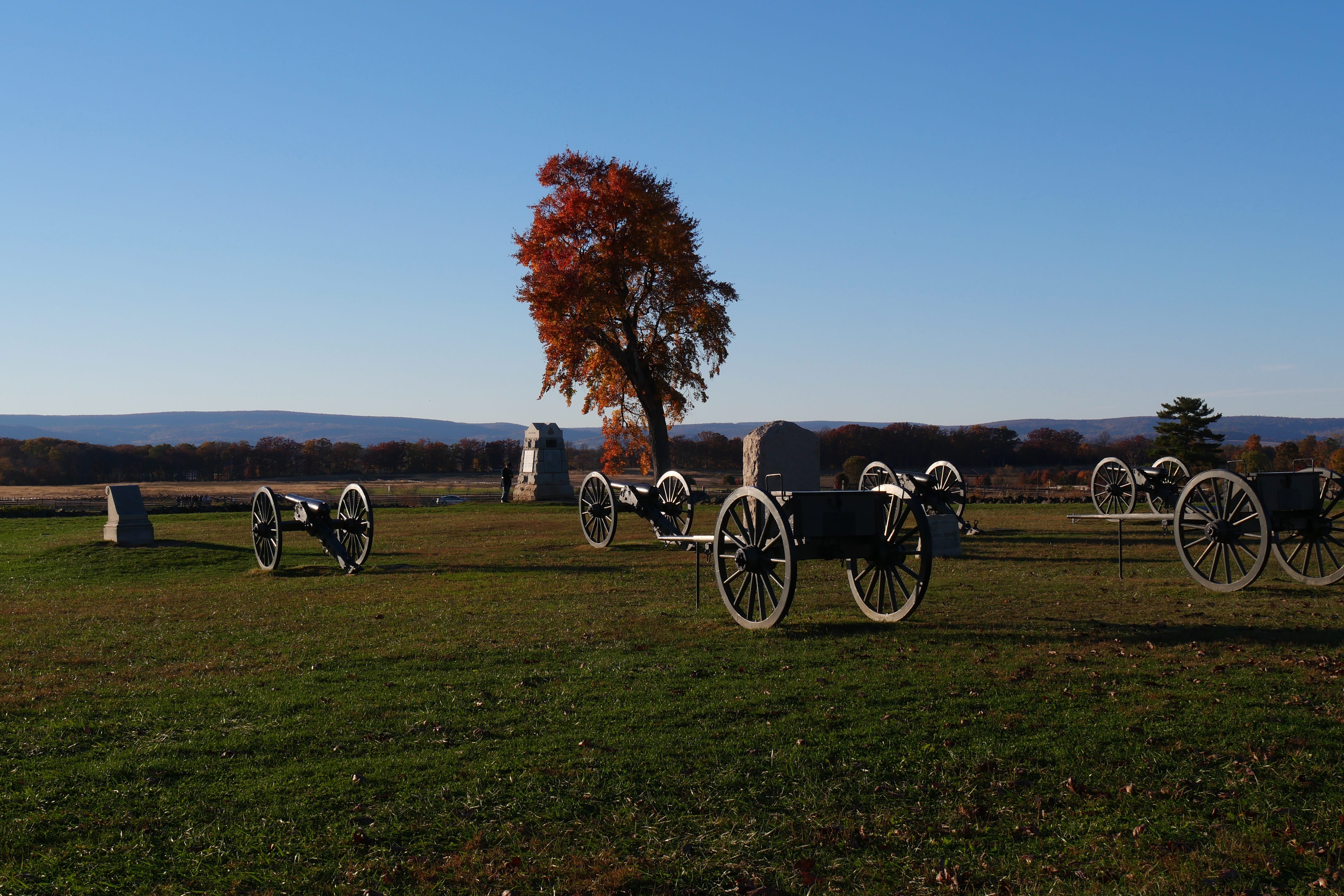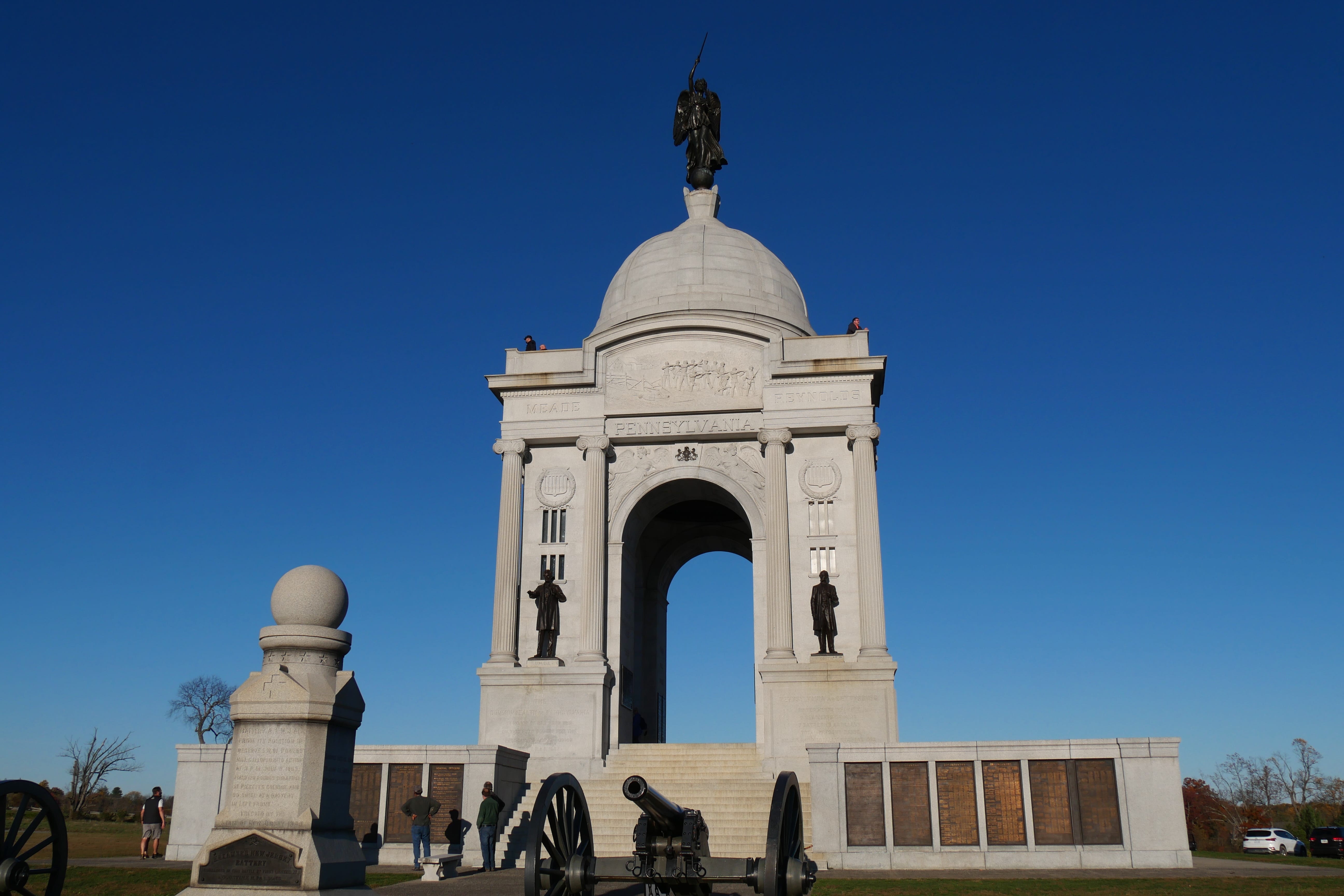 Dernier arrêt sur la route, le Gettysburg National Military Park, un autre lieu de l’Histoire de Etats-Unis, où a lieu en 1863 la bataille éponyme, pendant la guerre de Sécession. Si en tant qu’Européens nous en savons trop peu sur cette guerre et ses enjeux, nous en apprendrons un peu plus pendant notre passage à Philadelphie et comprendront que les Etats-Unis que l’on connaît aujourd’hui y sont fortement liés. Il s’agit dans tous les cas de la plus importante bataille en termes de pertes humaines, et de l’un des tournants de la guerre de Sécession. Il est possible de traverser les allées au milieu de champs de bataille en voiture, de s’arrêter et de monter au sommet du State of Pennsylvania Monument pour prendre conscience de l’ampleur de cette bataille avant d’aller se recueillir au cimetière militaire, où l’on retrouve un marqueur de l’endroit où Abraham Lincoln avait prononcé le discours de Gettysburg, dans lequel il évoque le « gouvernement du peuple, par le peuple, pour le peuple », reprise maintes fois dans l’Histoire ensuite.