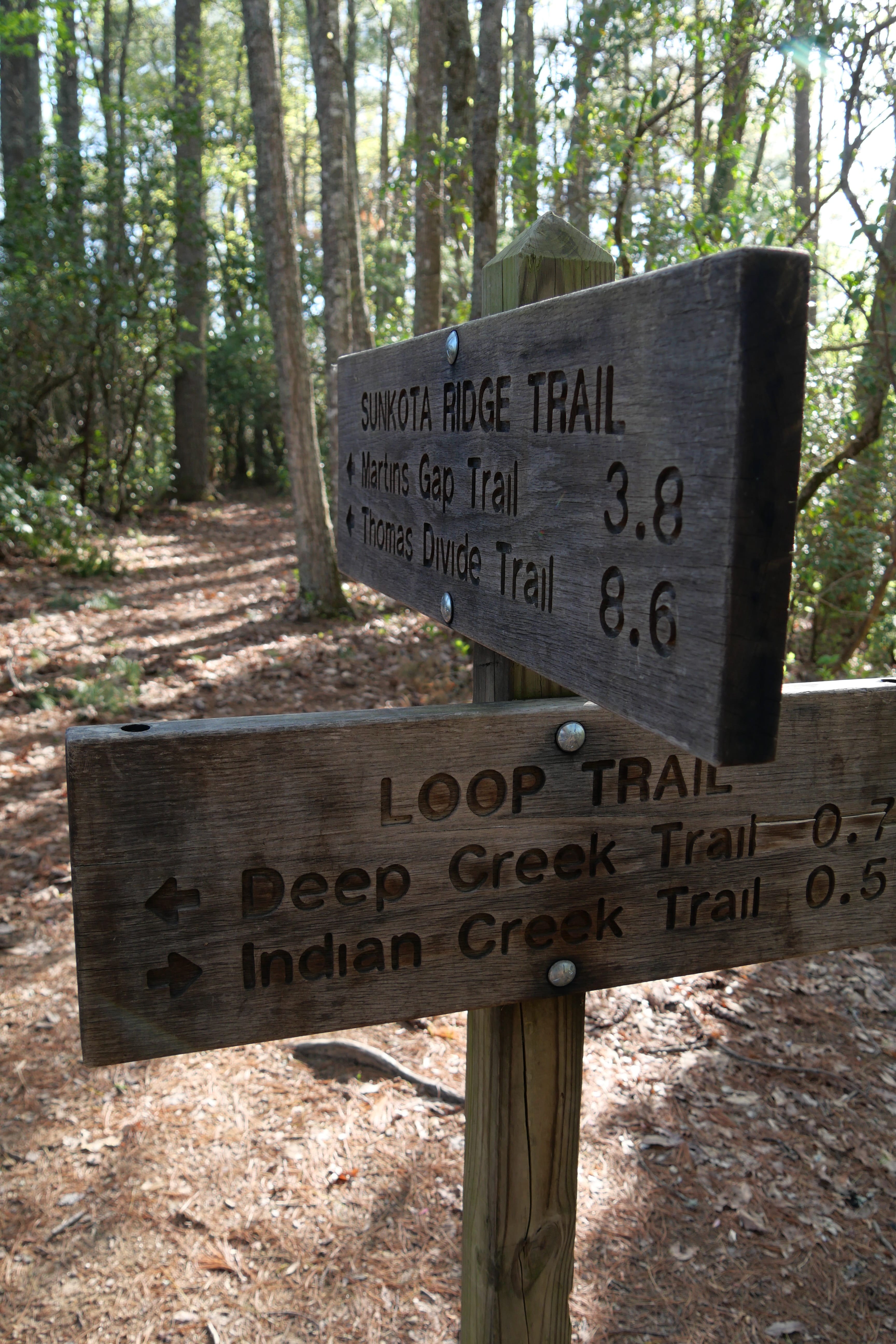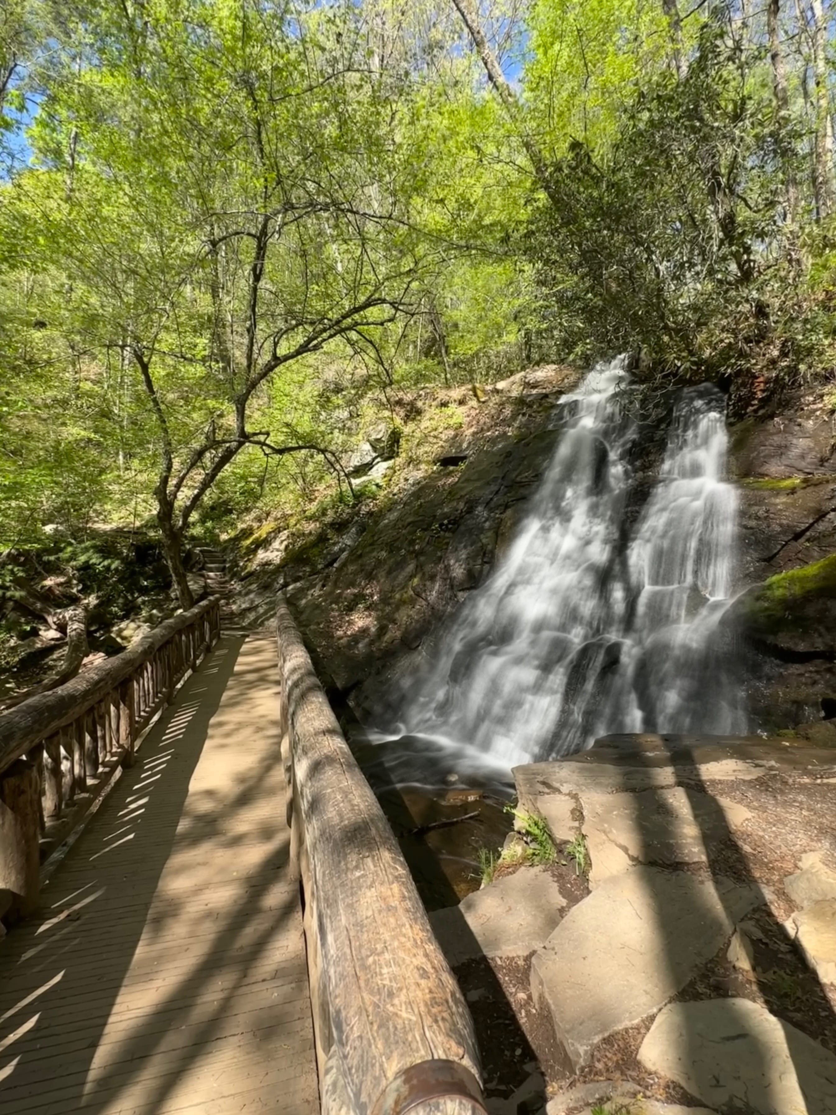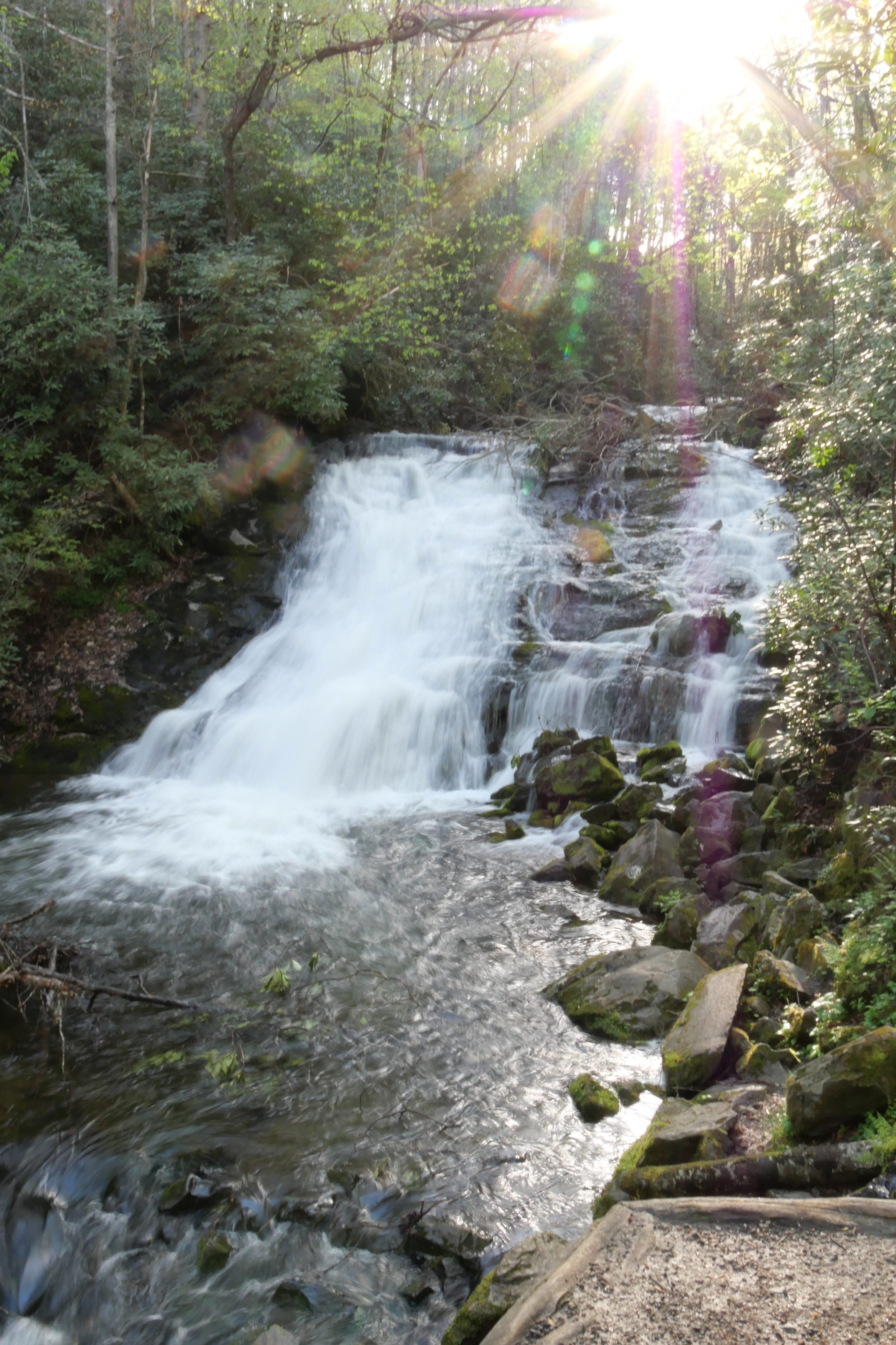 Direction ensuite Bryson City et Deep Creek Trailhead pour mixer deux boucles de randonnées que nous avions repérées en amont. On se souviendra quand même de la relative galère pour trouver un ticket de parking à la journée (obligatoire depuis 2023…). Malgré les panneaux indiquant qu’il fallait se rapprocher du Visitor Center du GSM NP, à une heure de route de là, nous avons persévéré et finalement trouvé des distributeurs automatiques à côté de l’air de pique-nique non loin (Deep Creek Campground). L’entrée du parc étant totalement gratuite, on s’acquittera de ces $5 sans se sentir extorqués. C’est donc après cette première petite hésitation que nous avons enfin pris le départ du trail indiqué (dont la durée estimée à 2h sur RoadTrippin en comptera au final plutôt 3 avec pauses photo et en forme physique moyenne comme la nôtre). Si la première partie du trail est relativement simple et longe la rivière Deep Creek, c’est après avoir quitté celle-ci que la randonnée devient plus physique, avec un bel enchaînement de sentiers plus étroits en montée/descente. Le plus frustrant sur ce parcours est que malgré certains passages pouvant offrir une belle vue panoramique, la forte végétation empêche constamment de pouvoir prendre la pleine mesure du paysage environnant. De belles cascades, avec en point d’orgue celle de Juney Whank, nous auront empêché de repartir avec des regrets, peu avant la mi-journée, en direction cette fois-ci du parc en lui-même.