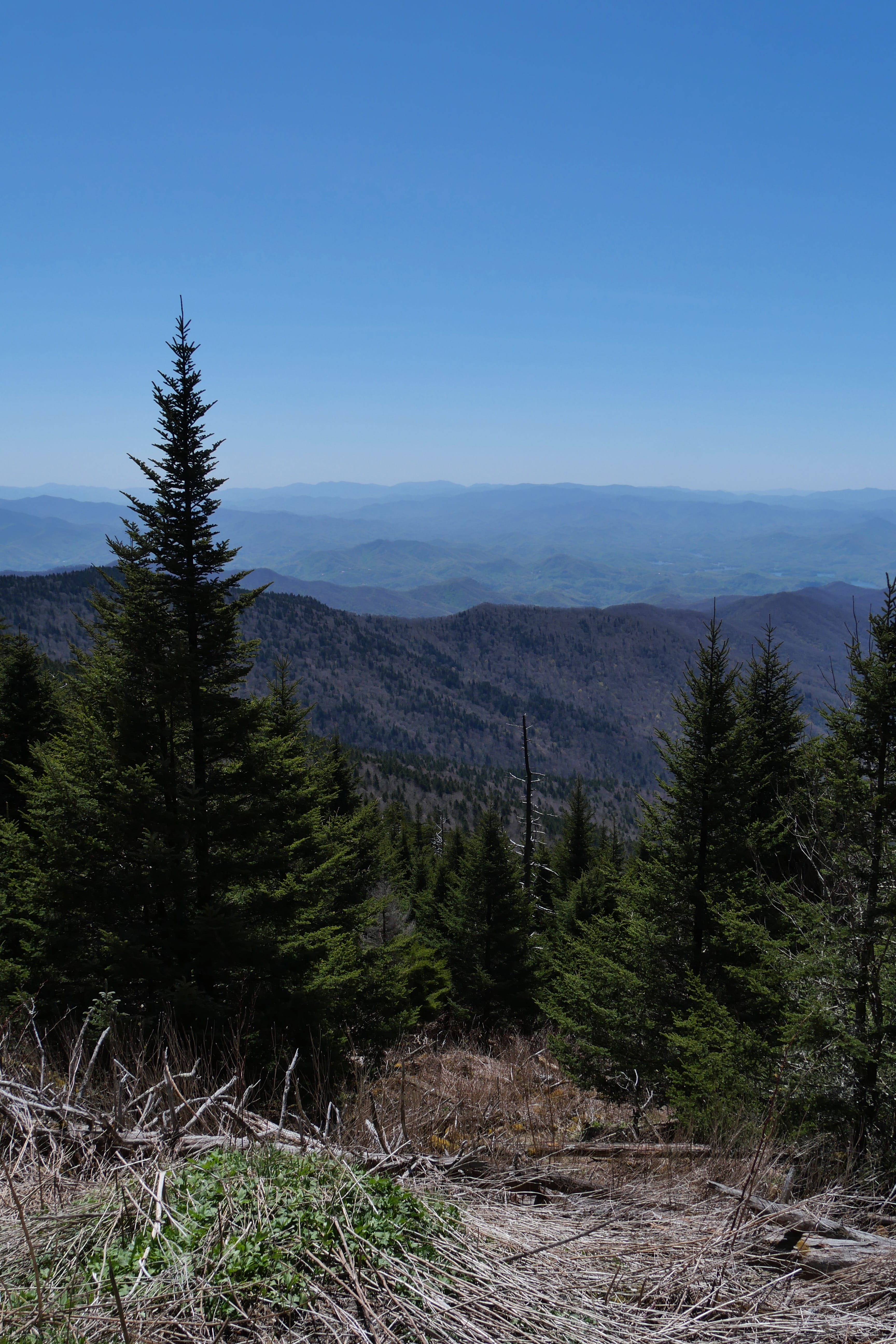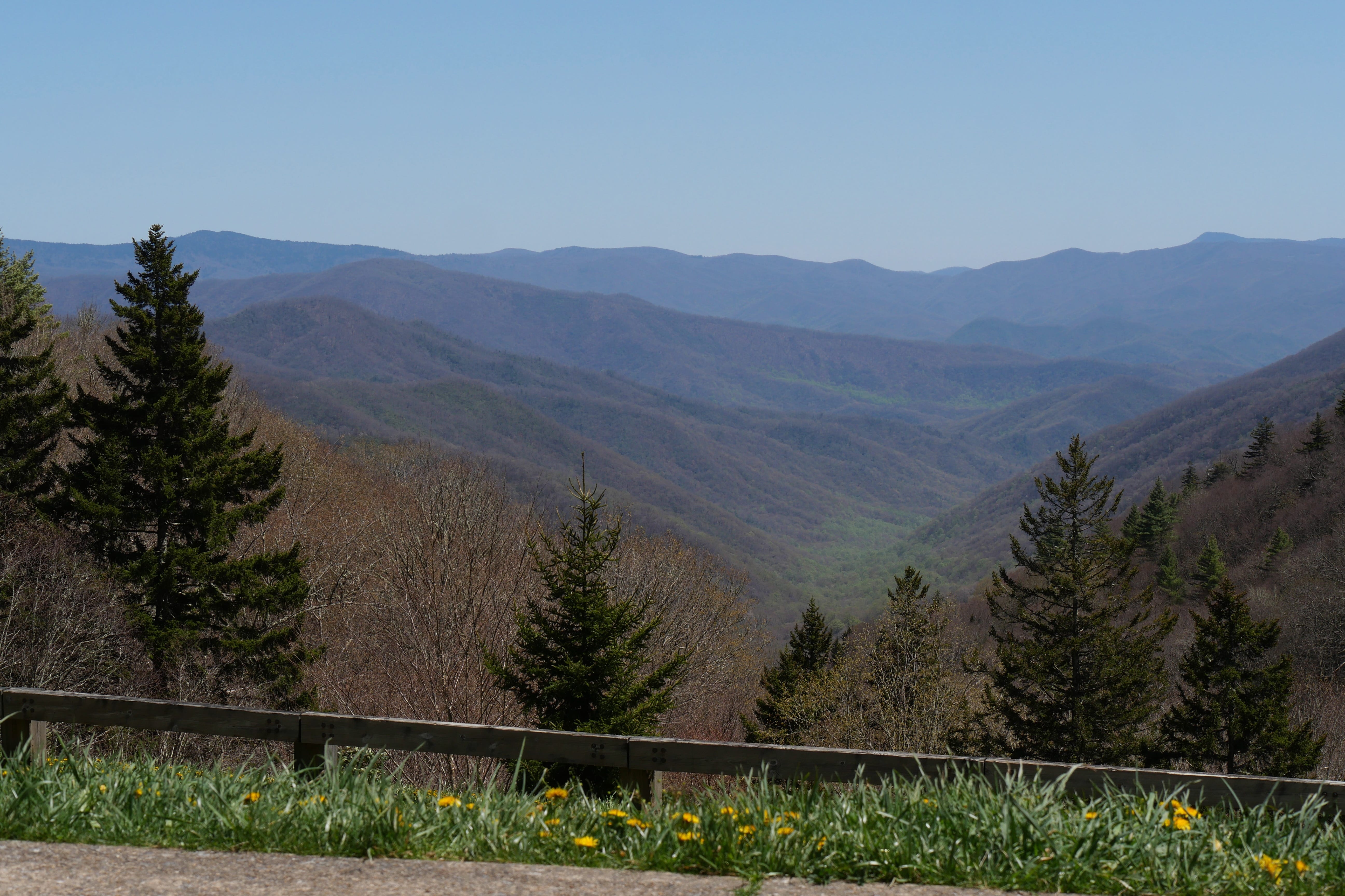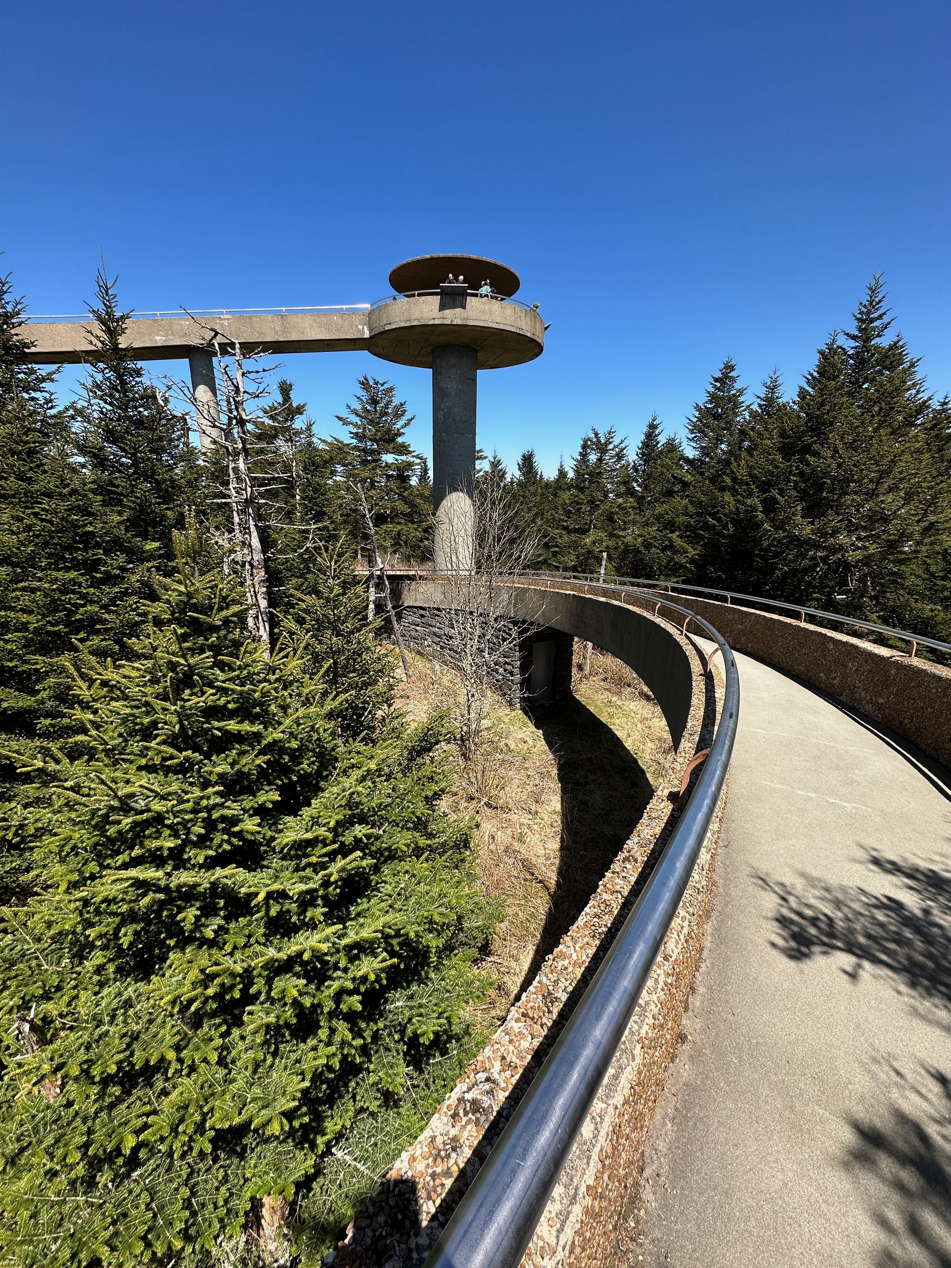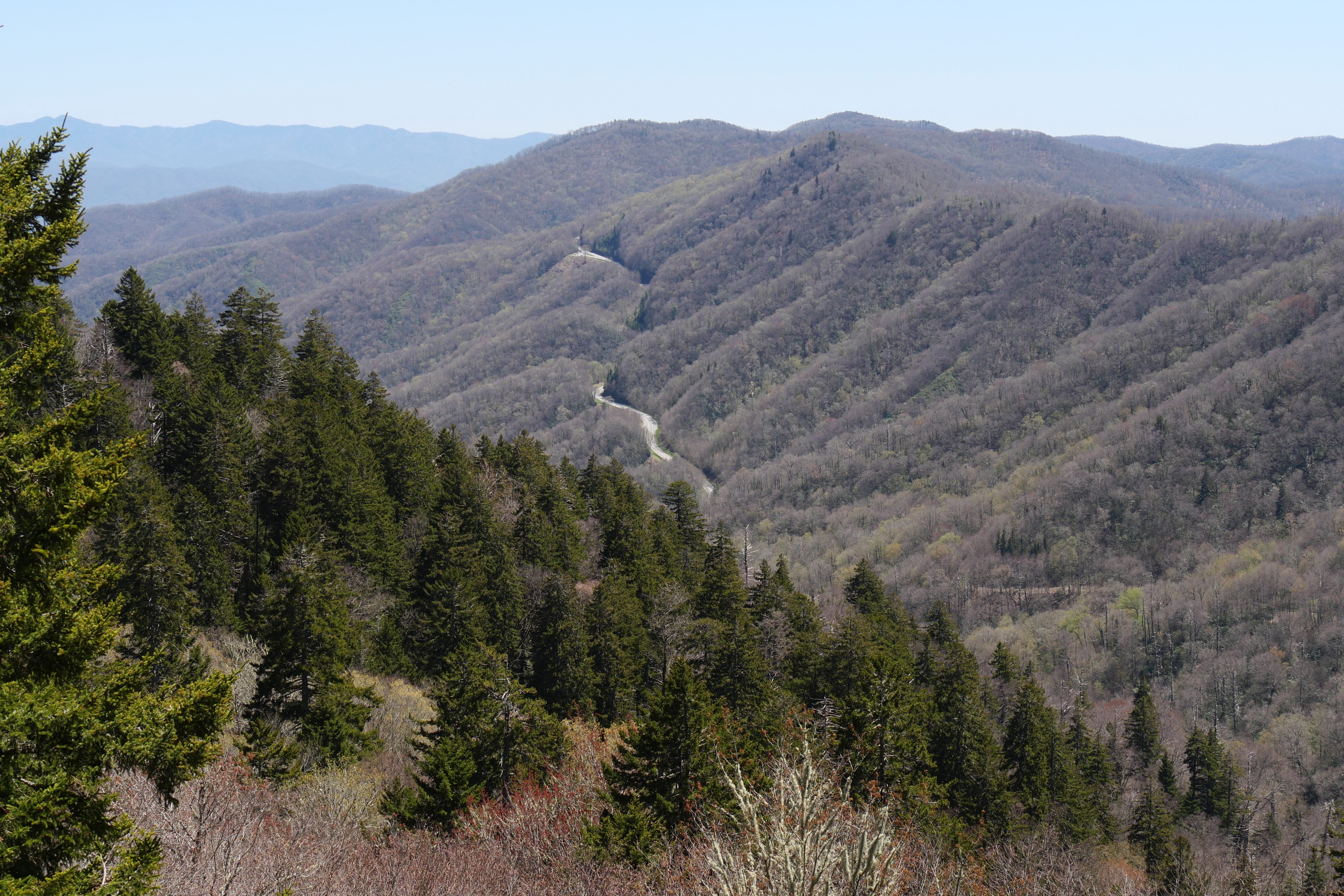 C’est par l’US 441, la Newfound Gap Road, que nous rejoignons le parc, avec l’arrêt quasi obligatoire au Visitor Center pour y prendre quelques informations utiles et actualisées, mais également voir s’ils y vendent le Monopoly National Parks, que nous avions hésité à prendre à Acadia, avant de nous raviser, et le regretter ensuite. Ils l’avaient ! Et c’est donc avec ces regrets en moins et quelques infos en plus, que nous reprenons la route, sans trop nous attarder, ni au petit village préservé à côté du Visitor Center, ni à Mingus Mill, qui avait bonne réputation mais pour lequel nous n’avions pas de temps à accorder. Nous étions surtout là pour les beaux panoramas, et nous allions être servis. Dès les premiers kilomètres, on se retrouve rapidement à grimper, pour atteindre le point culminant du Clingmans Dome, à 2025m d’altitude. On notera tout de même qu’en cette saison, s’il faisait à peu près bon en bas, dans la vallée, c’était carrément glacial au sommet, avec un vent nous transperçant littéralement. Malgré la montée très sportive en raison du dénivelé important (même si le chemin est asphalté du parking jusqu’au sommet de la tour d’observation), nous n’aurons jamais réussi à nous réchauffer, enchaînant rapidement quelques clichés avant de redescendre pour retrouver un abri. La vue y était toutefois superbe, tant en haut de la tour que pendant la montée à pied, que dans les enchaînements de lacets en voiture. La météo complètement dégagée nous offrait une magnifique vue à plusieurs kilomètres à la ronde, et si l’on peut vous donner un conseil, ce serait peut-être de caler cette visite à l’automne si possible, afin de profiter en plus d’une magnifique canopée multicolore.