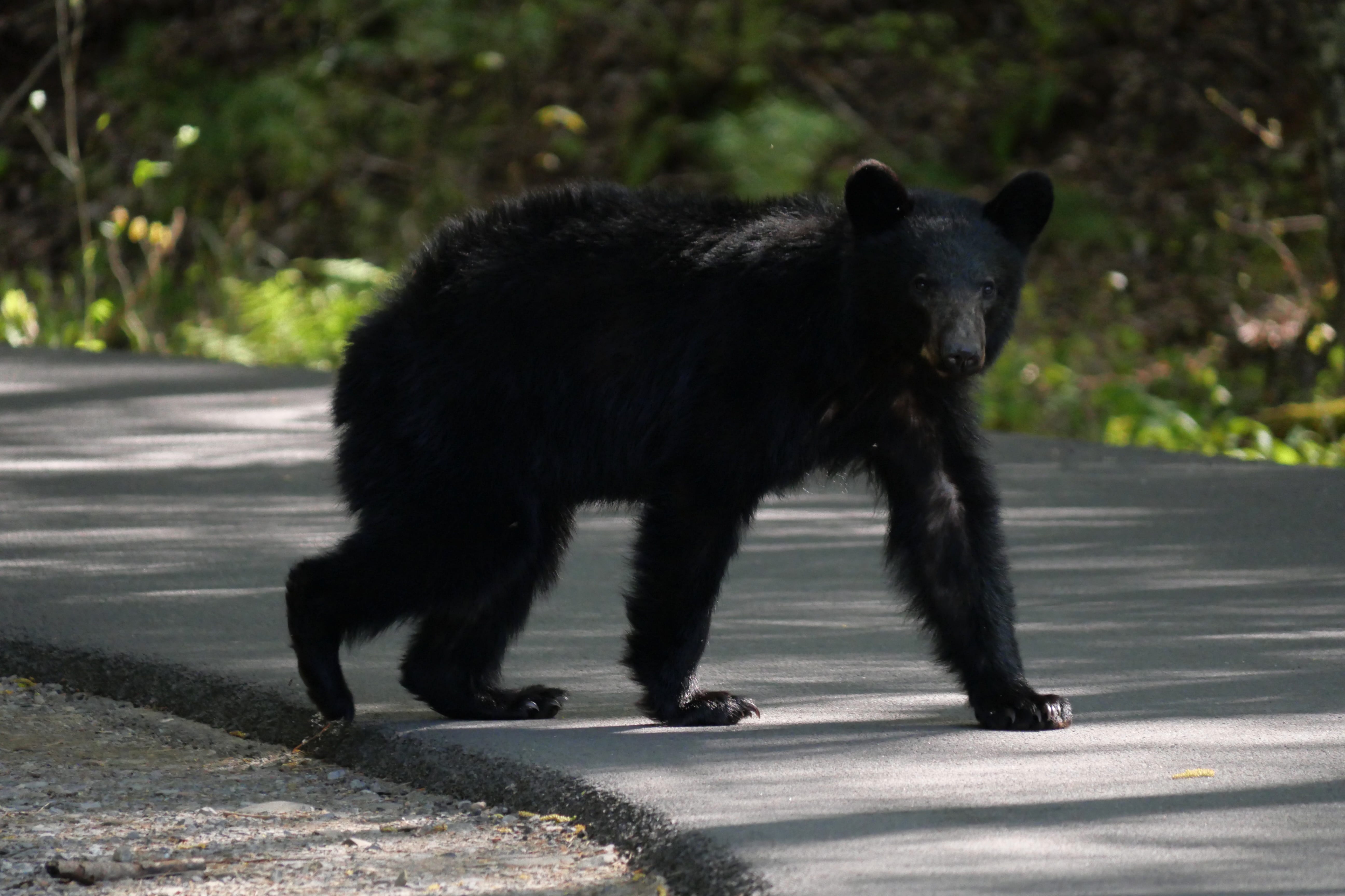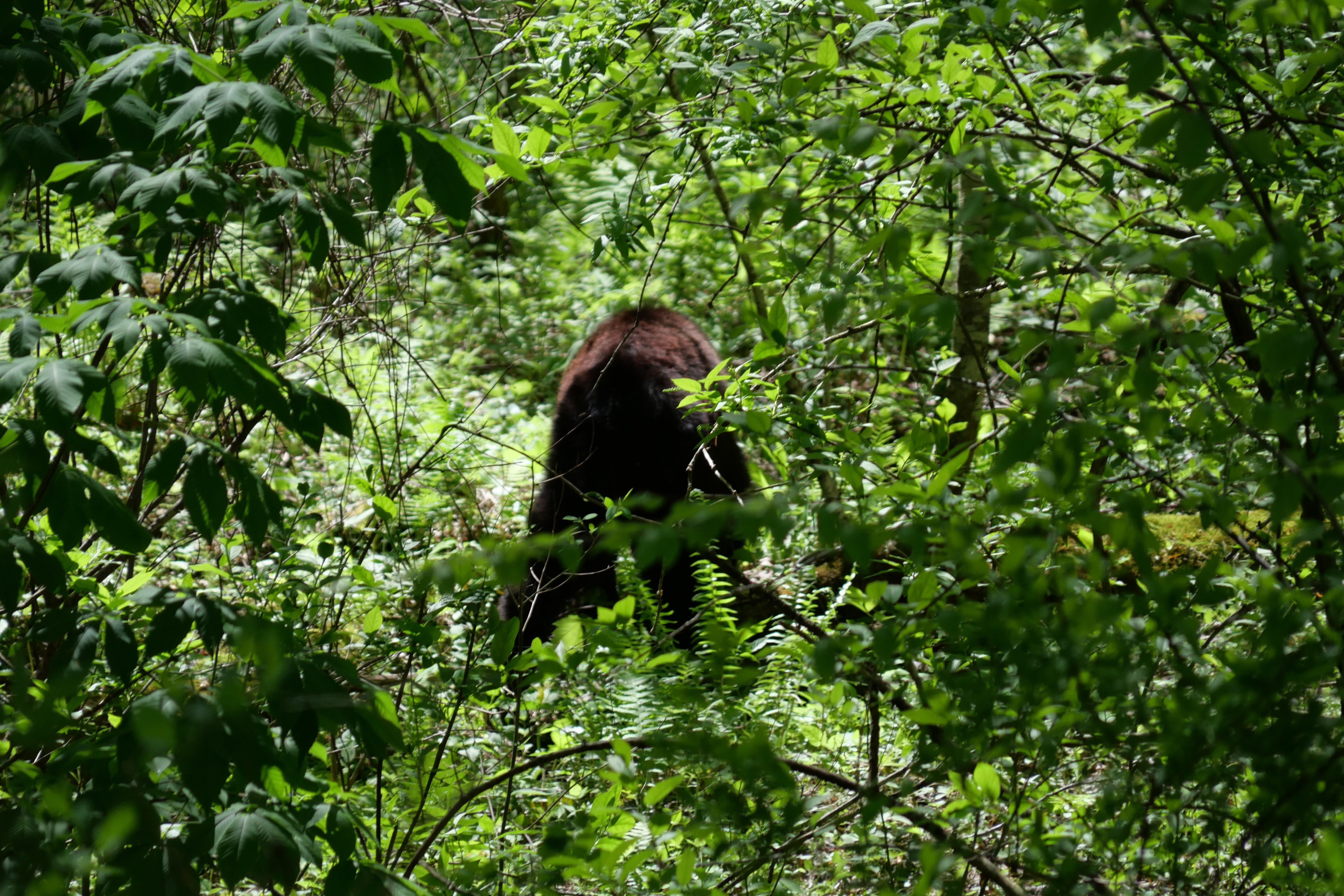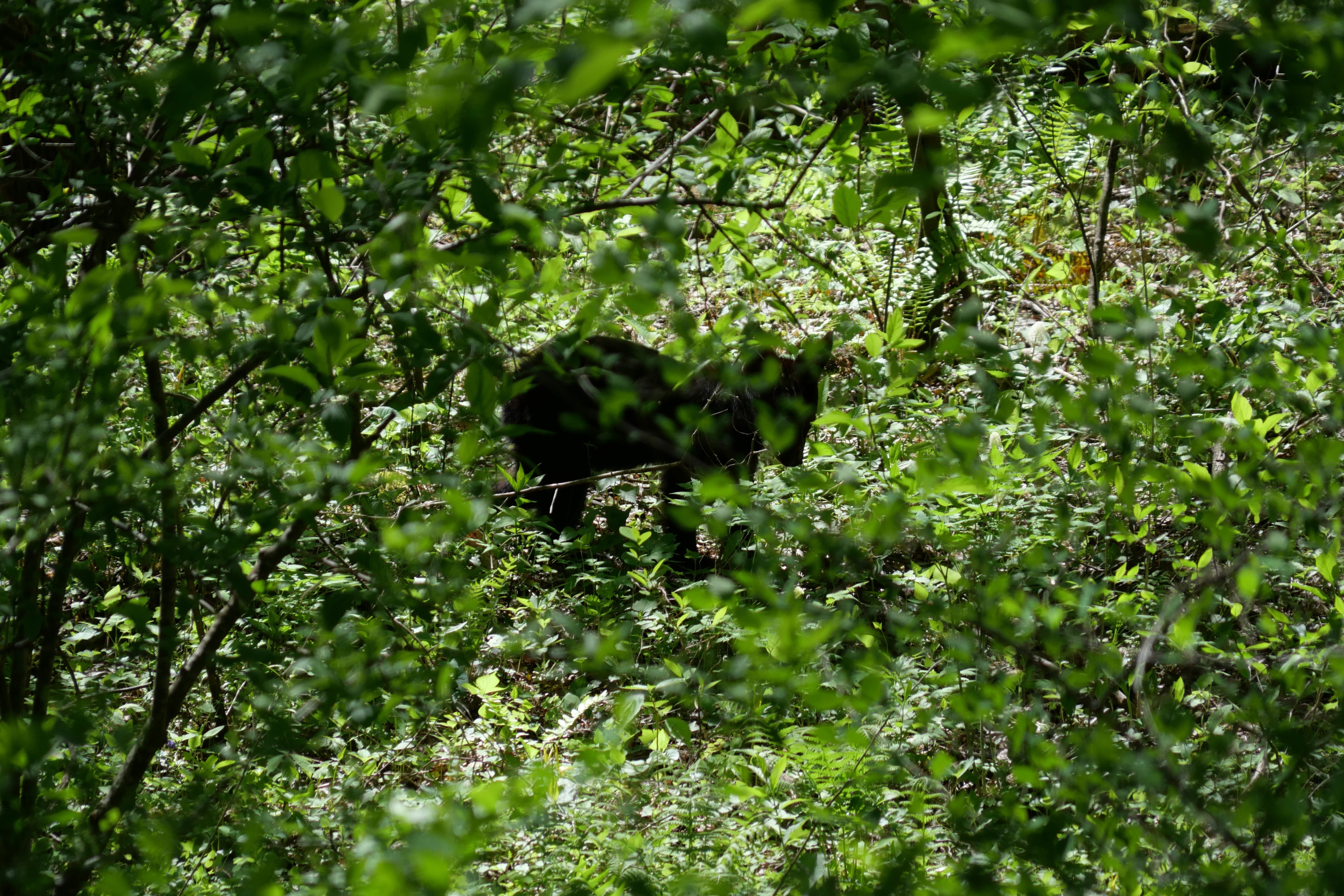 Passé ce point, on trouve le paysage un peu plus beau, plus complexe, moins lisse. Les sommets sont plus rocheux, moins uniformes, et fatalement un peu moins dans l’idée que nous avions peut-être des Great Smoky Mountains. Mais c’est après une anecdotique Loop Road, que nous pensions être une route à sens unique nous permettant de faire un circuit plus intimiste, n’étant finalement qu’un virage en « colimaçon » que les bonnes surprises sont arrivées. D’abord avec Chimney Tops Overlook, avec comme on en a parlé, un paysage plus escarpé au sommet et une forêt plus lisse en contrebas, puis notre route vers la Cades Cove Loop Road. Celle-ci a d’abord été ponctuée d’un arrêt surprise, un petit bouchon s’étant créé, des gens étant descendus de voiture, montrant la forêt en contrebas. C’est alors que nous avons aperçus nos deux premiers ours noirs sauvages ! Probablement une maman et son petit d’après les gabarits que nous ne pouvions que suivre du regard au travers du feuillage dense. S’en est suivie une interminable route à 30mph (45km/h) que nous n’atteignons la majorité du temps pas, coincés derrière des camping-cars, jusqu’à la Cades Cove Loop Road, une véritable Loop Road cette fois-ci, à sens unique, offrant des plaines plus dégagées en fond de vallée. C’est ici que nous aurons la dernière énorme surprise de la journée, avec un jeune ours noir, à quelques mètres seulement de la route, errant en quête de nourriture. Tout en restant prudents, nous l’avons observé de loin pendant une bonne dizaine de minutes, essayant autant que possible de ne pas le perturber pour profiter un maximum de l’expérience. Magnifique conclusion de cette énorme journée, tant en temps qu’en kilomètres, à pied et en voiture. Mais qui nous laissera de très bons souvenirs.