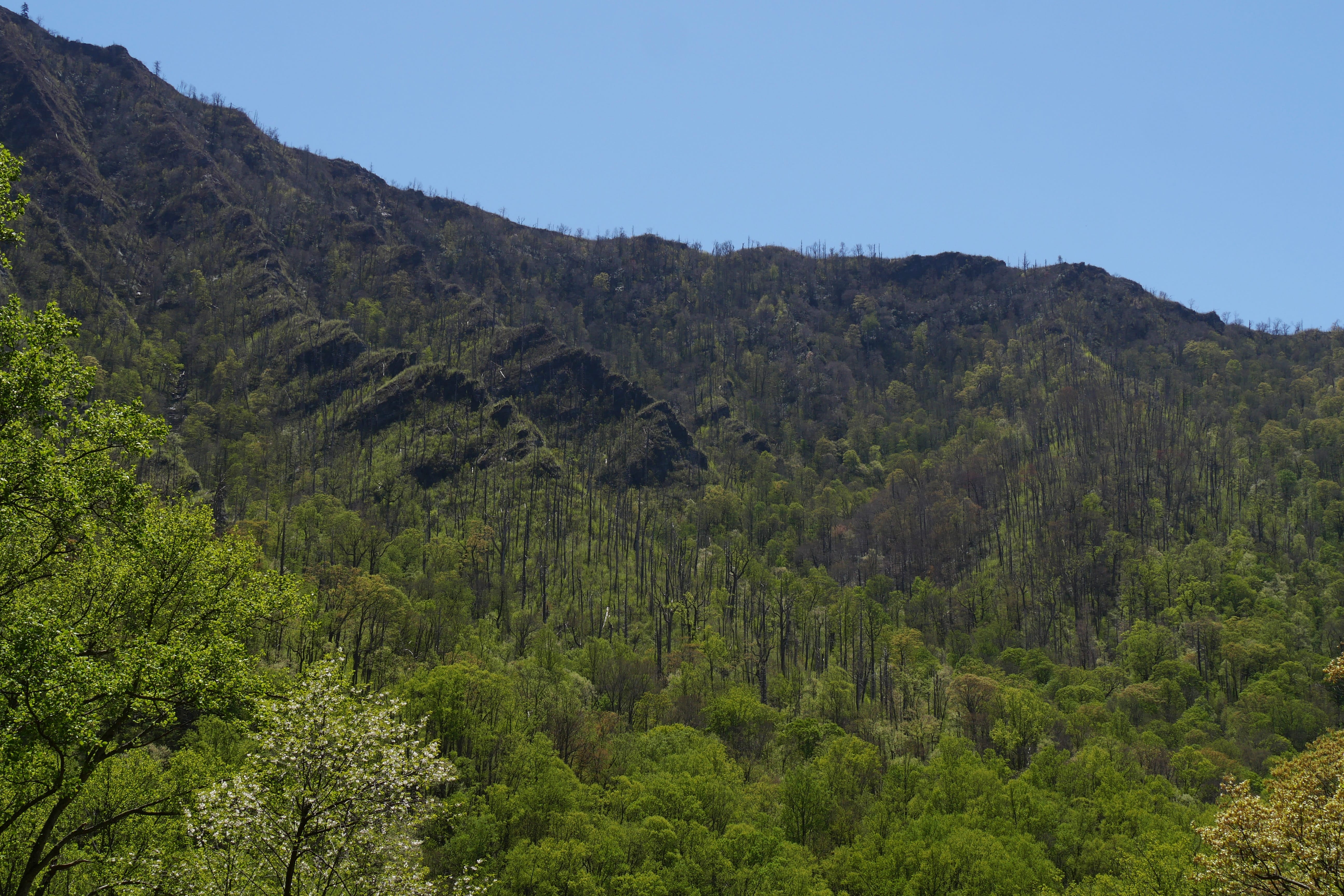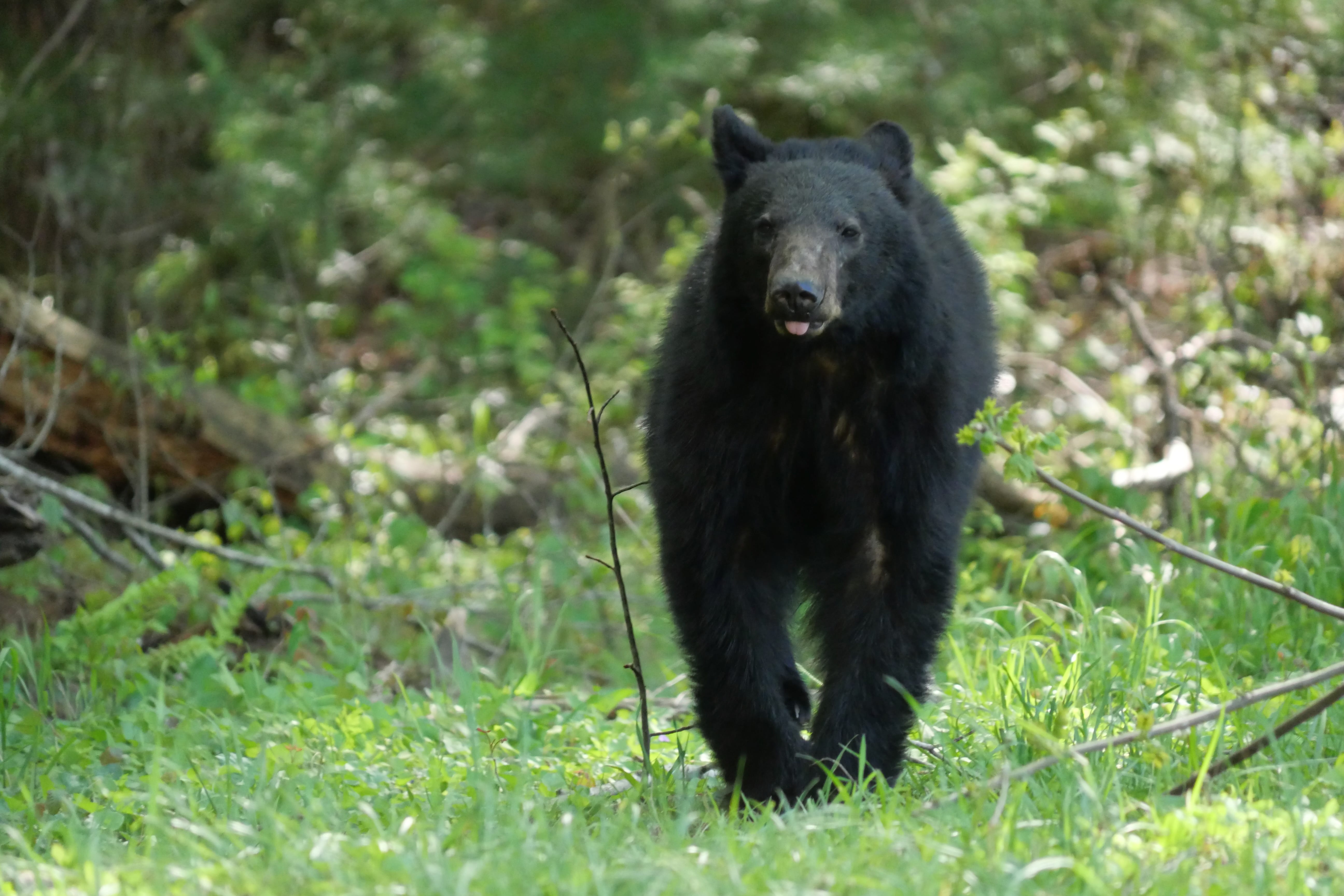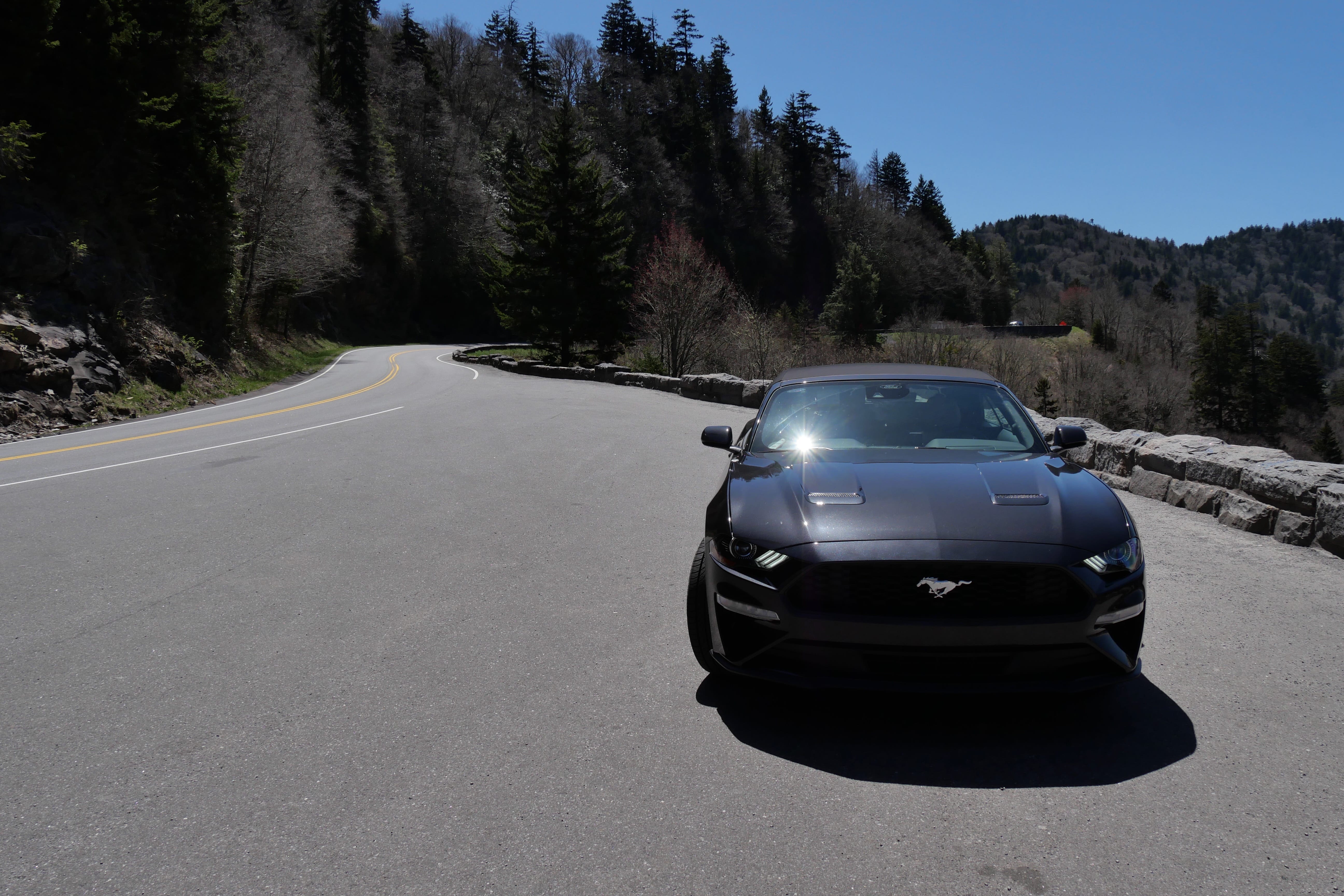 Passé ce point, on trouve le paysage un peu plus beau, plus complexe, moins lisse. Les sommets sont plus rocheux, moins uniformes, et fatalement un peu moins dans l’idée que nous avions peut-être des Great Smoky Mountains. Mais c’est après une anecdotique Loop Road, que nous pensions être une route à sens unique nous permettant de faire un circuit plus intimiste, n’étant finalement qu’un virage en « colimaçon » que les bonnes surprises sont arrivées. D’abord avec Chimney Tops Overlook, avec comme on en a parlé, un paysage plus escarpé au sommet et une forêt plus lisse en contrebas, puis notre route vers la Cades Cove Loop Road. Celle-ci a d’abord été ponctuée d’un arrêt surprise, un petit bouchon s’étant créé, des gens étant descendus de voiture, montrant la forêt en contrebas. C’est alors que nous avons aperçus nos deux premiers ours noirs sauvages ! Probablement une maman et son petit d’après les gabarits que nous ne pouvions que suivre du regard au travers du feuillage dense. S’en est suivie une interminable route à 30mph (45km/h) que nous n’atteignons la majorité du temps pas, coincés derrière des camping-cars, jusqu’à la Cades Cove Loop Road, une véritable Loop Road cette fois-ci, à sens unique, offrant des plaines plus dégagées en fond de vallée. C’est ici que nous aurons la dernière énorme surprise de la journée, avec un jeune ours noir, à quelques mètres seulement de la route, errant en quête de nourriture. Tout en restant prudents, nous l’avons observé de loin pendant une bonne dizaine de minutes, essayant autant que possible de ne pas le perturber pour profiter un maximum de l’expérience. Magnifique conclusion de cette énorme journée, tant en temps qu’en kilomètres, à pied et en voiture. Mais qui nous laissera de très bons souvenirs.