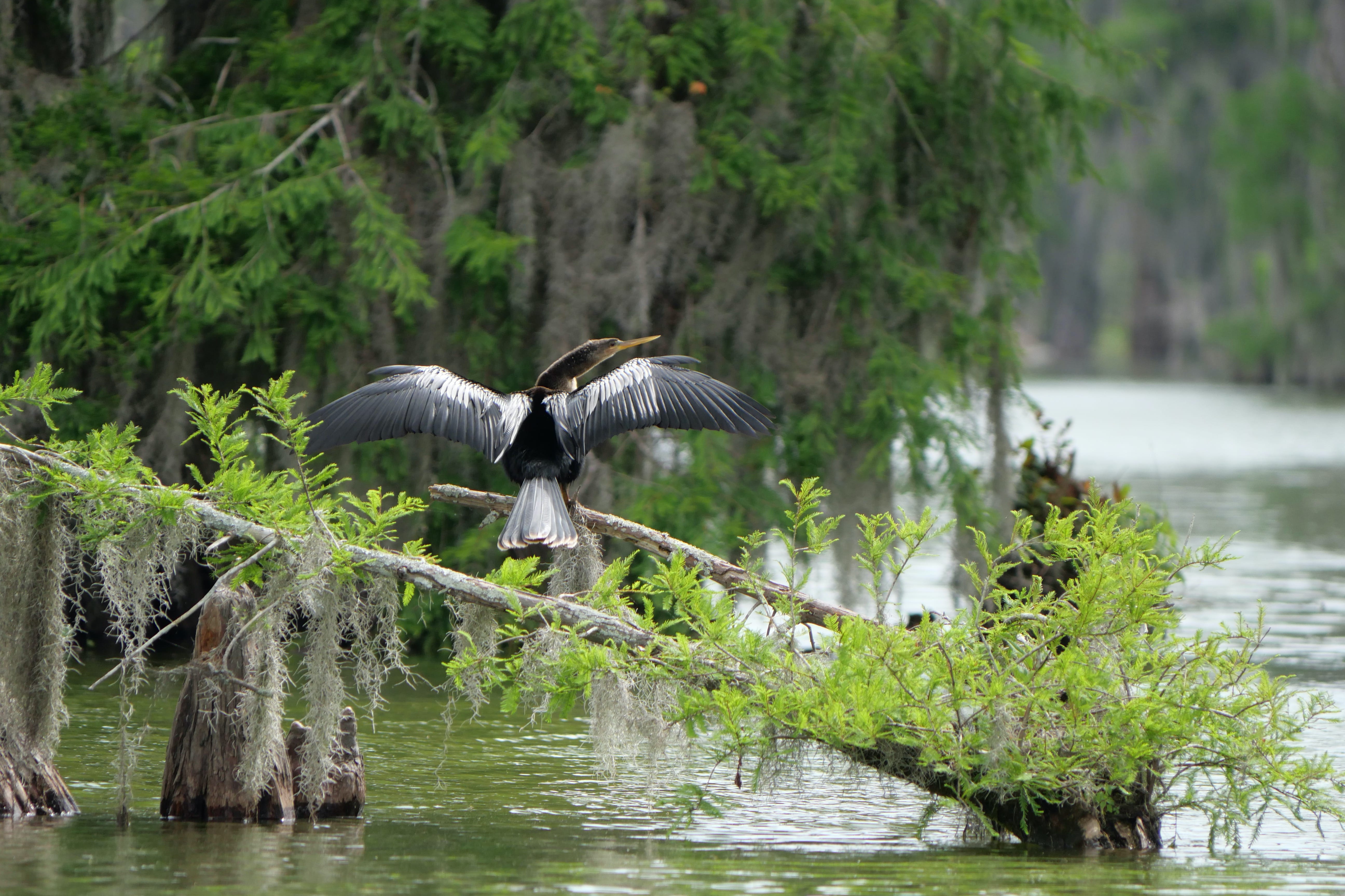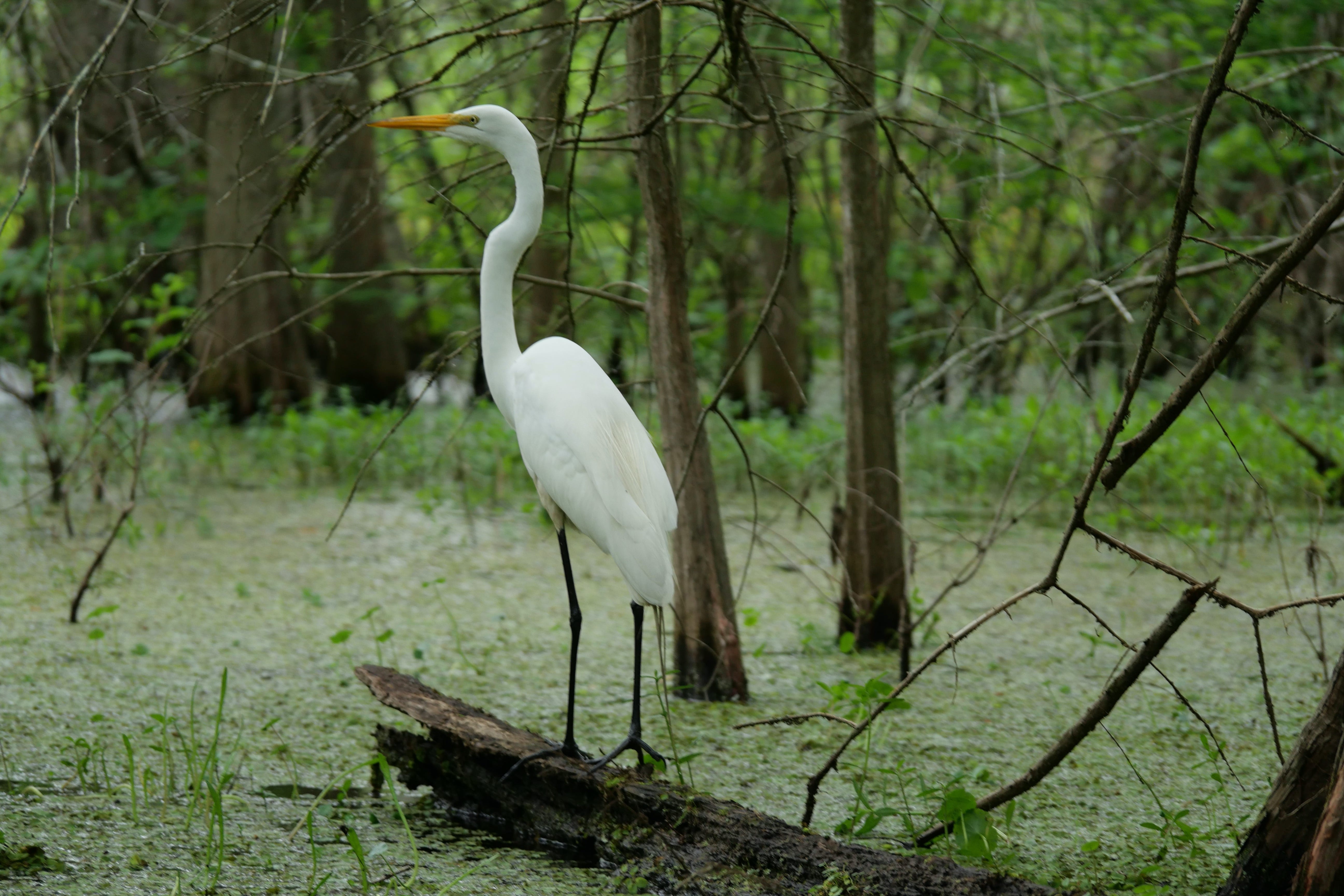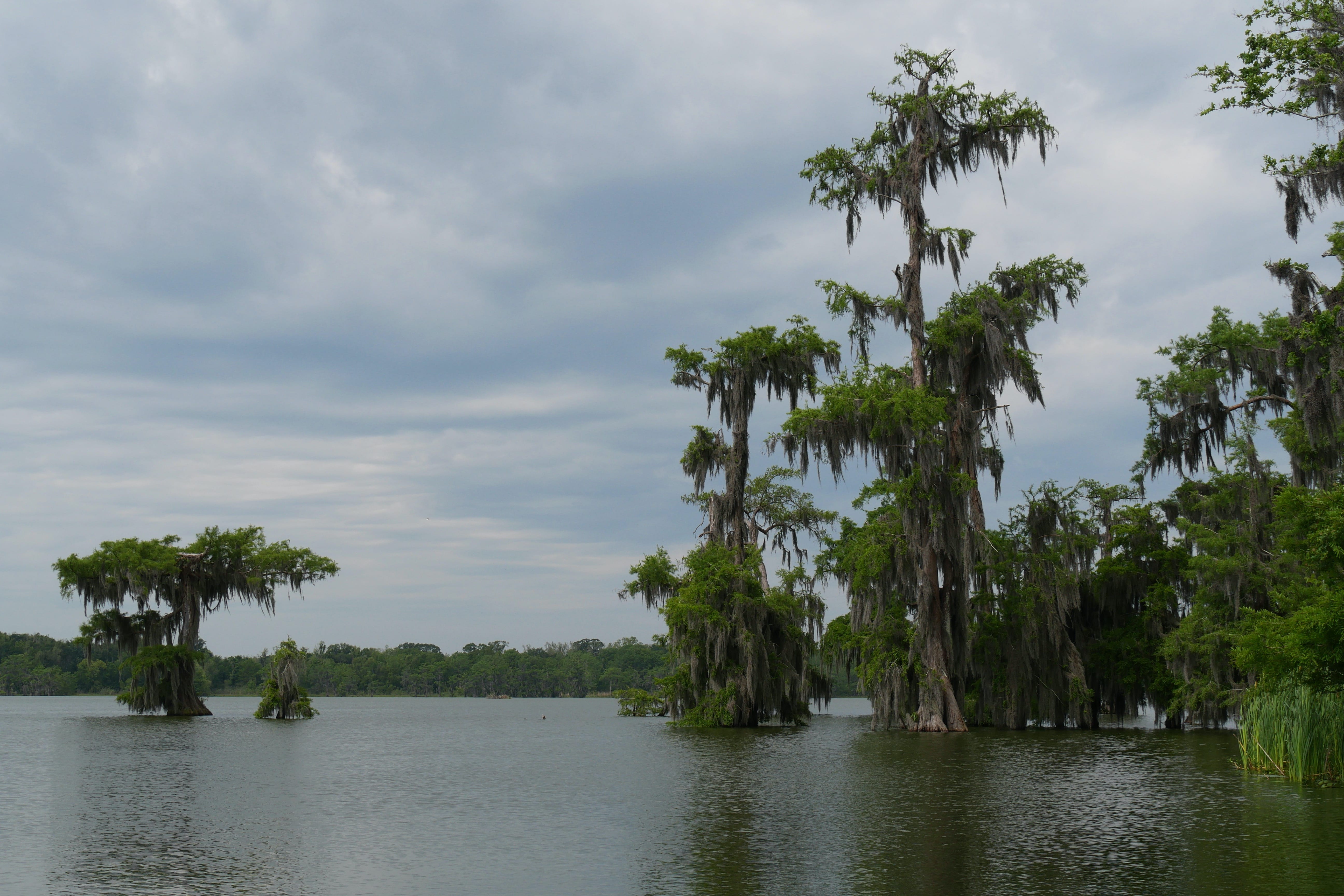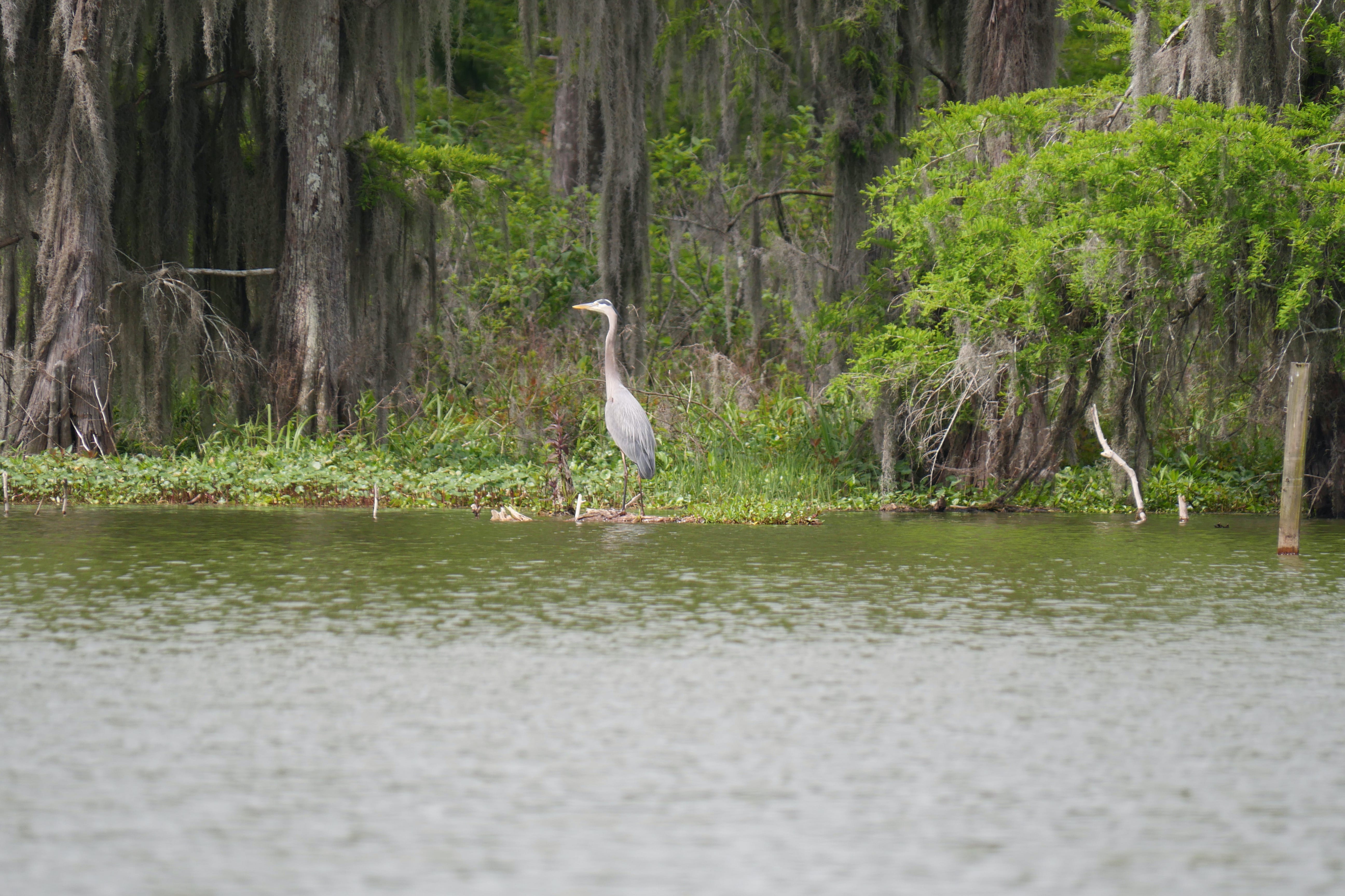 Le Swamp Tour ! Wow, que dire… Plein de choses. Tout d’abord, la rencontre avec Wendy Thibodeaux, assise au bord du lac, casquette jaune sur la tête, comme annoncé dans le mail, histoire de ne pas se tromper pour la reconnaître. Nous ne savions pas trop à quoi nous attendre en arrivant, et au final, il doit y avoir autant de Swamp Tour que de guides et d’endroits où les faire. Un peu à l’instar des tours en Airboats comme nous avions pu en faire en Floride l’année dernière. Certains doivent être plus orientés sensations fortes et pointes de vitesse, tandis que d’autres observation de la faune et de la flore et explications. Notre guide, assez récente dans le milieu à priori, après une reconversion professionnelle, nous aura mis directement à l’aise, n’hésitant pas à nous guider, parfois même assez familièrement, afin que tout cela se passe au mieux. Nous avons glissé dans l’eau tout doucement depuis la berge où le bateau était posé, et à seulement 5 sur la petite embarcation, nous avons d’abord traversé une zone assez ouverte, où seuls les cyprès et quelques oiseaux nous tenaient compagnie. Wendy nous a expliqué la chasse dans ce milieu et montré comment les chasseurs rejoignaient les affûts et autres baraques fabriquées plus ou moins sommairement. Nous avons ensuite traversé le lac à vive allure (enfin aussi vite que notre petite barque à fond plat le permettait), avant d’avoir l’un des premiers moments forts de la balade.