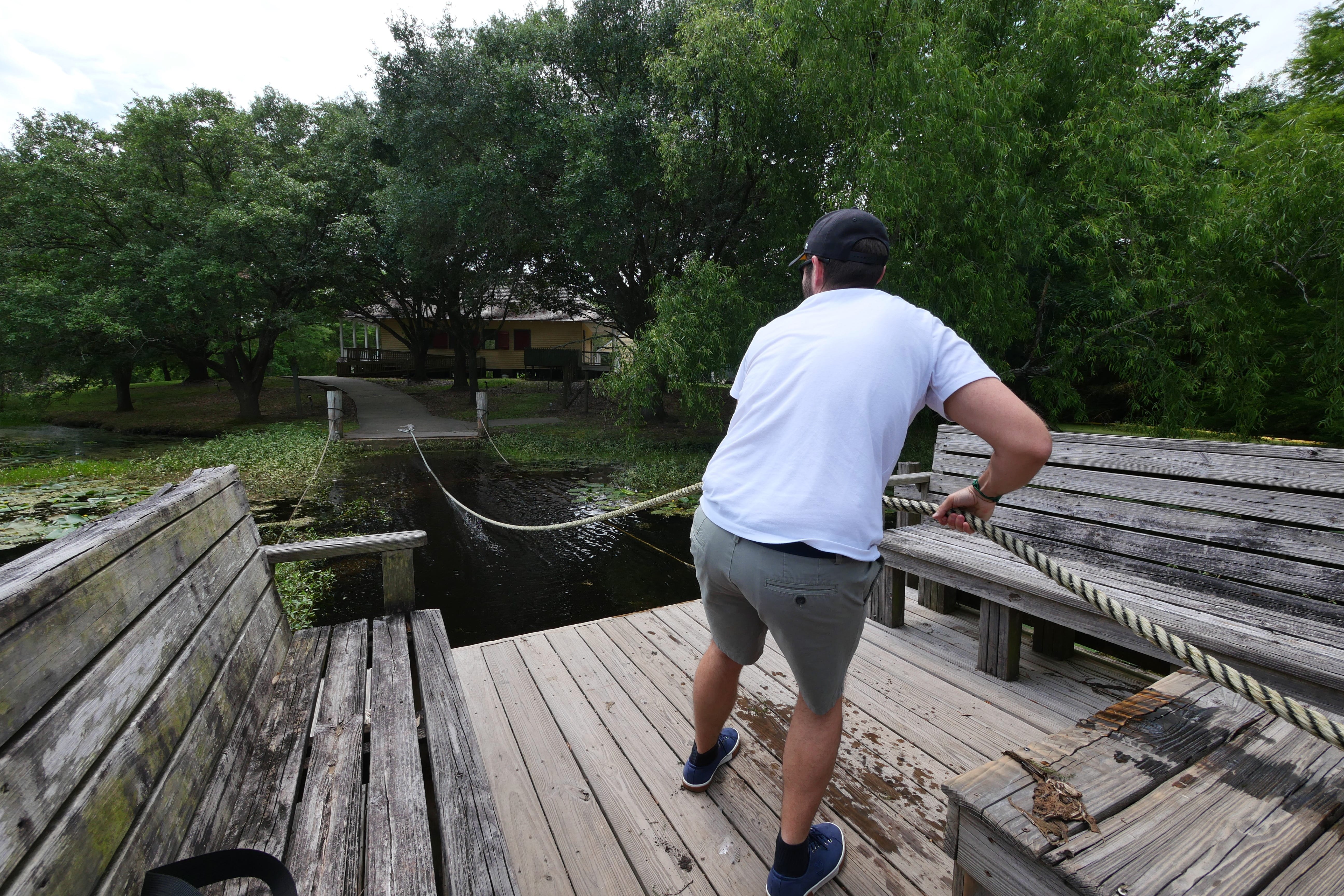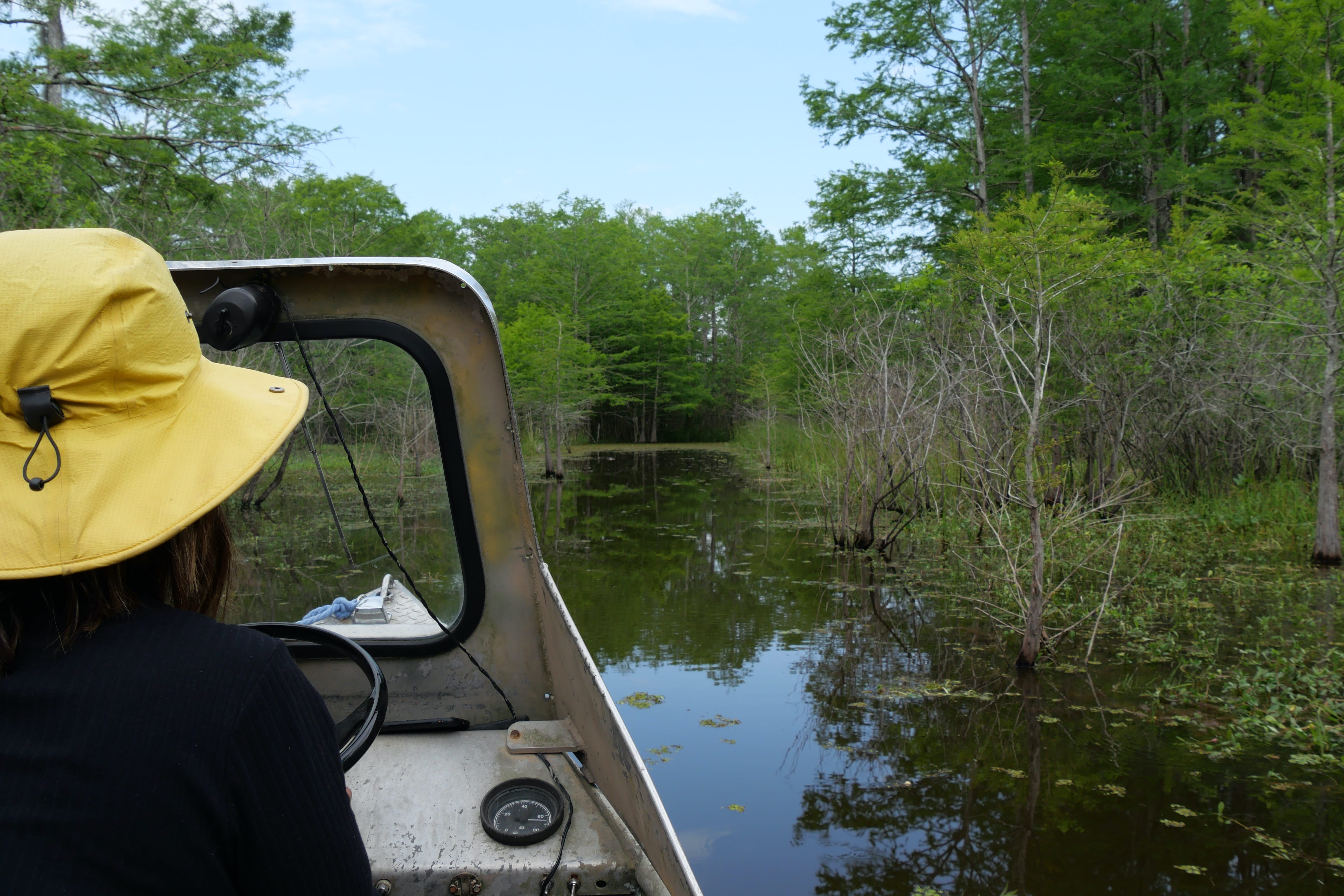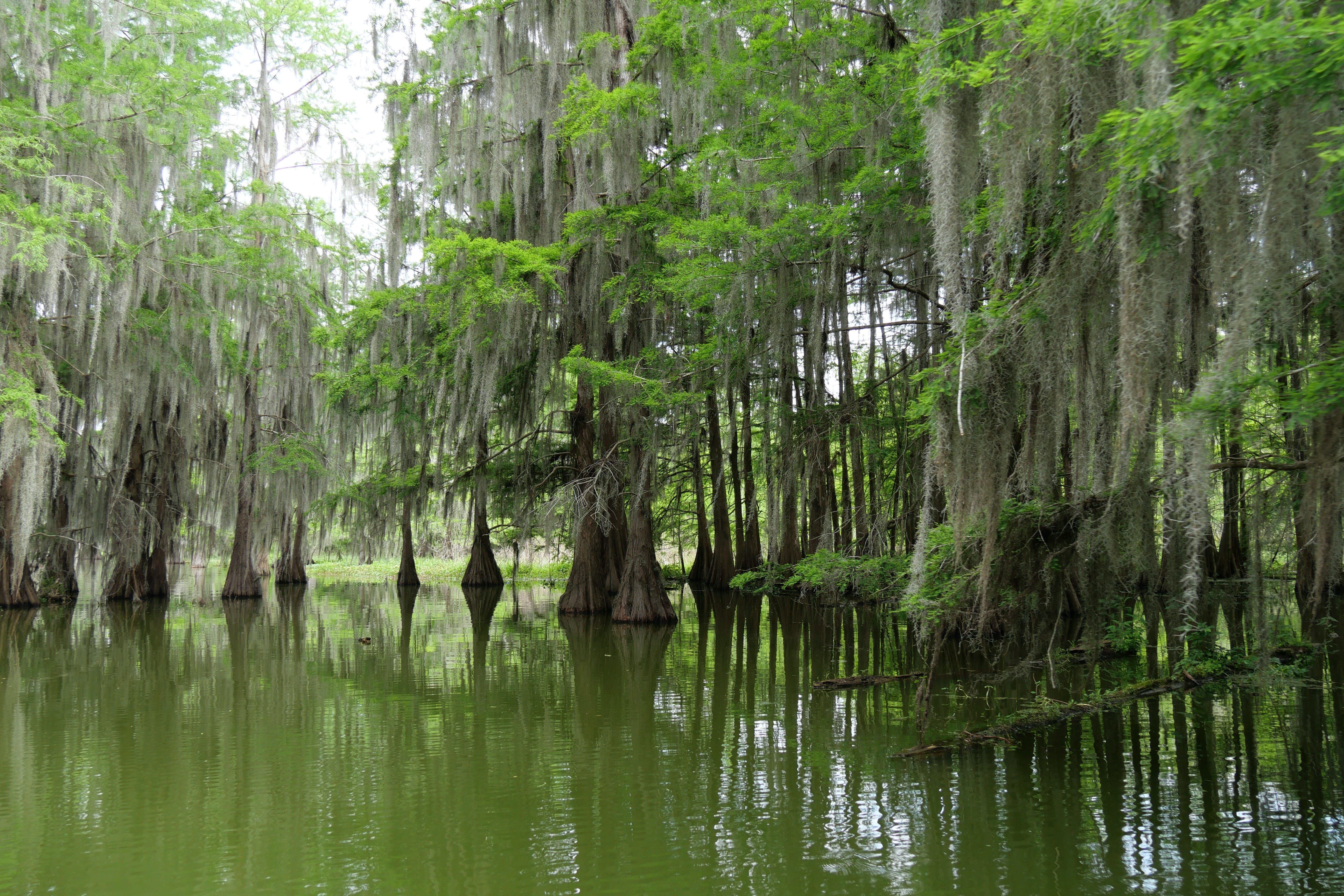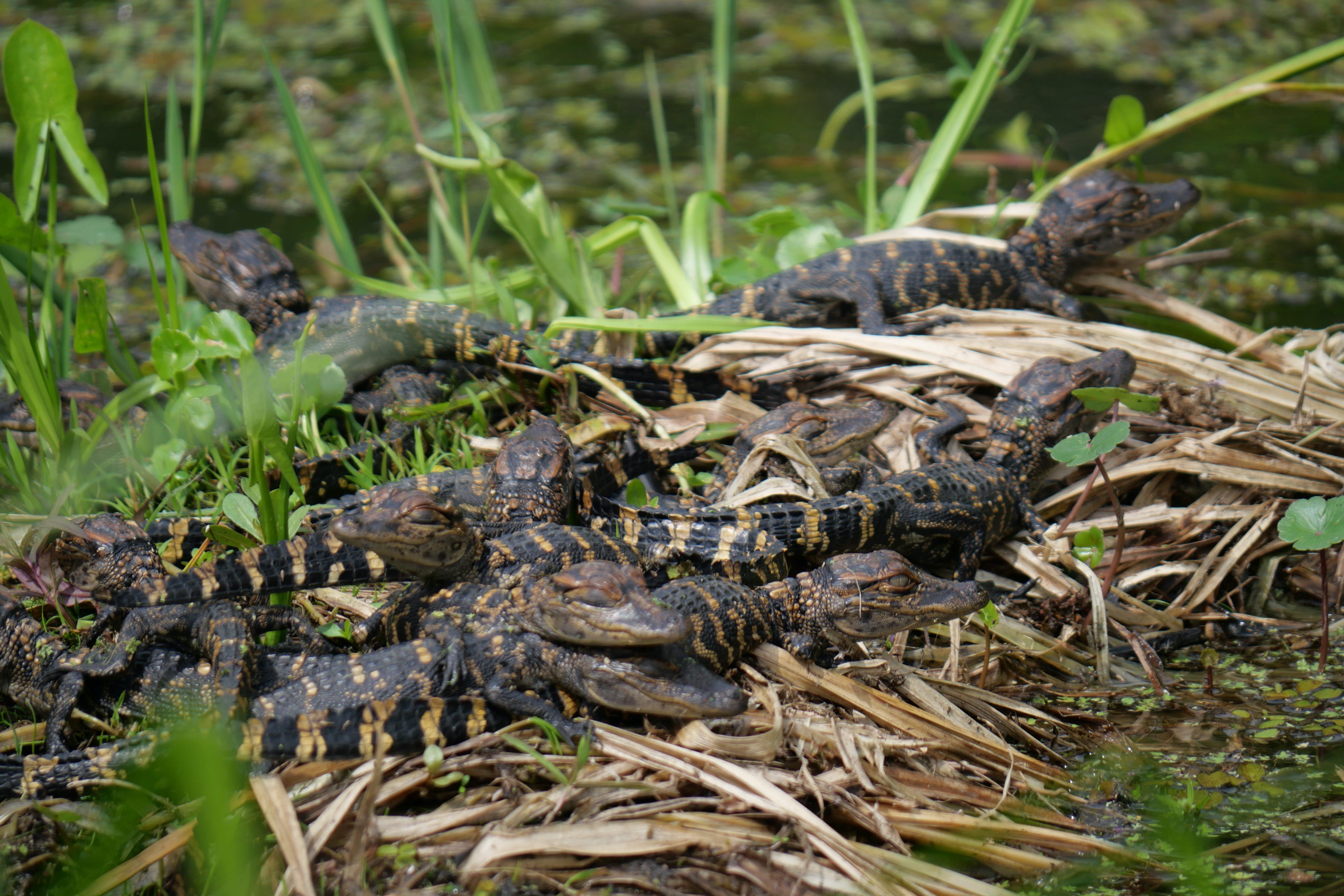 Le Swamp Tour ! Wow, que dire… Plein de choses. Tout d’abord, la rencontre avec Wendy Thibodeaux, assise au bord du lac, casquette jaune sur la tête, comme annoncé dans le mail, histoire de ne pas se tromper pour la reconnaître. Nous ne savions pas trop à quoi nous attendre en arrivant, et au final, il doit y avoir autant de Swamp Tour que de guides et d’endroits où les faire. Un peu à l’instar des tours en Airboats comme nous avions pu en faire en Floride l’année dernière. Certains doivent être plus orientés sensations fortes et pointes de vitesse, tandis que d’autres observation de la faune et de la flore et explications. Notre guide, assez récente dans le milieu à priori, après une reconversion professionnelle, nous aura mis directement à l’aise, n’hésitant pas à nous guider, parfois même assez familièrement, afin que tout cela se passe au mieux. Nous avons glissé dans l’eau tout doucement depuis la berge où le bateau était posé, et à seulement 5 sur la petite embarcation, nous avons d’abord traversé une zone assez ouverte, où seuls les cyprès et quelques oiseaux nous tenaient compagnie. Wendy nous a expliqué la chasse dans ce milieu et montré comment les chasseurs rejoignaient les affûts et autres baraques fabriquées plus ou moins sommairement. Nous avons ensuite traversé le lac à vive allure (enfin aussi vite que notre petite barque à fond plat le permettait), avant d’avoir l’un des premiers moments forts de la balade.