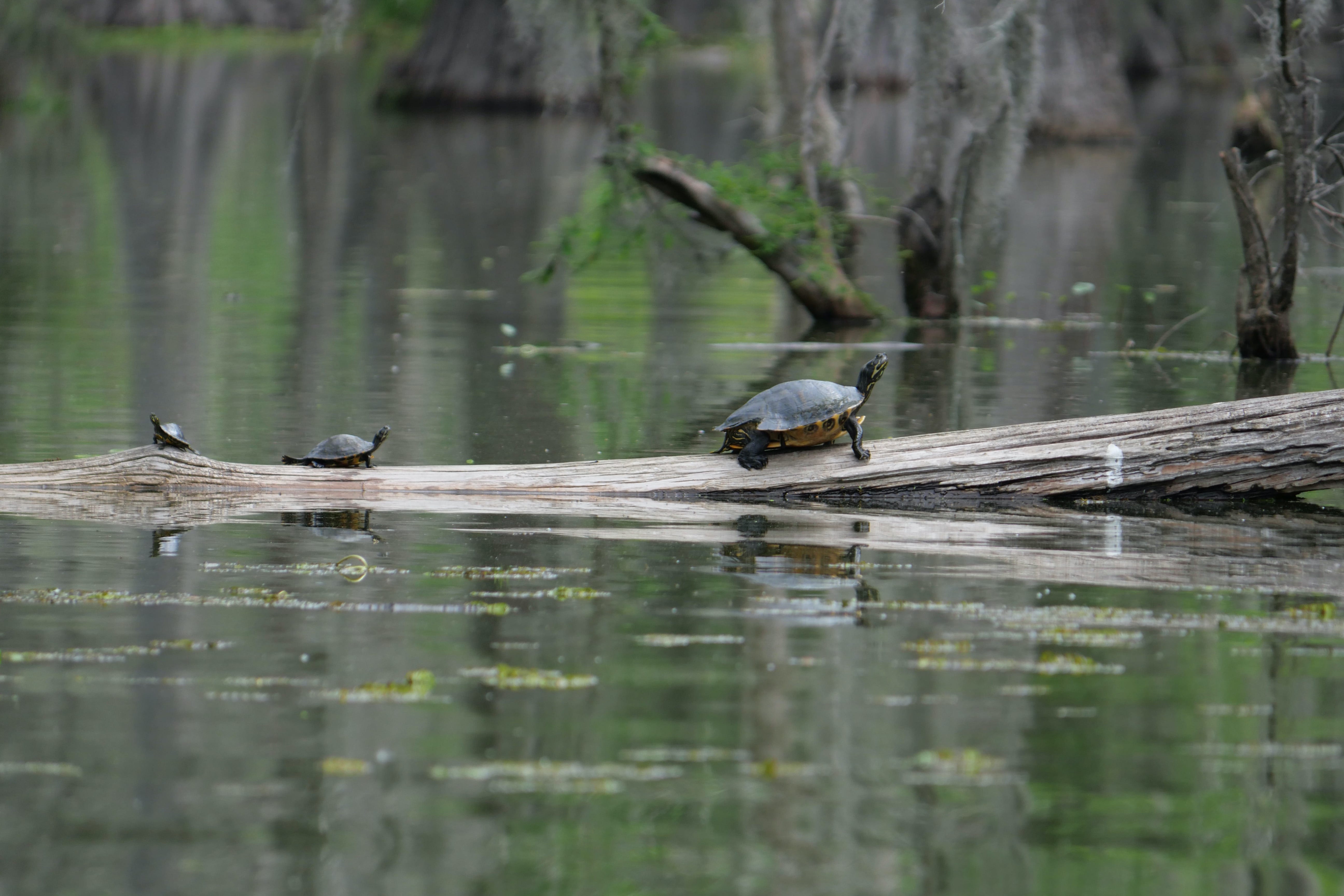 Wendy a coupé le moteur, laissé la barque dériver jusqu’à des herbes en surfaces, parmi lesquelles un nid rempli d’alligators, et à seulement quelques mètres, l’impressionnante mère surveillant la scène. On a ensuite poursuivi par des passages plus étroits entre les cyprès, recouverts de la mousse espagnole donnant une sensation mélancolique au paysage, avec le tout dérivant au gré du vent, flottant doucement dans l’air. Plusieurs rencontres avec des alligators et des tortues plus loin, nous avons même eu le droit à un moment de totale spontanéité où un oiseau est passé avec un animal dans ses griffes. Wendy s’est retournée brusquement, nous interpellant et nous montrant qu’elle aussi, parfois, restait surprise par ce que cet endroit avait à offrir. Au bout d’une heure trente de balade, en douceur et à l’affût du moindre signe donné par la nature, avec quelques passages au-dessus de troncs juste sous la surface, nous avons réellement eu la sensation d’être privilégiés d’avoir pu faire cette visite dans ces conditions.