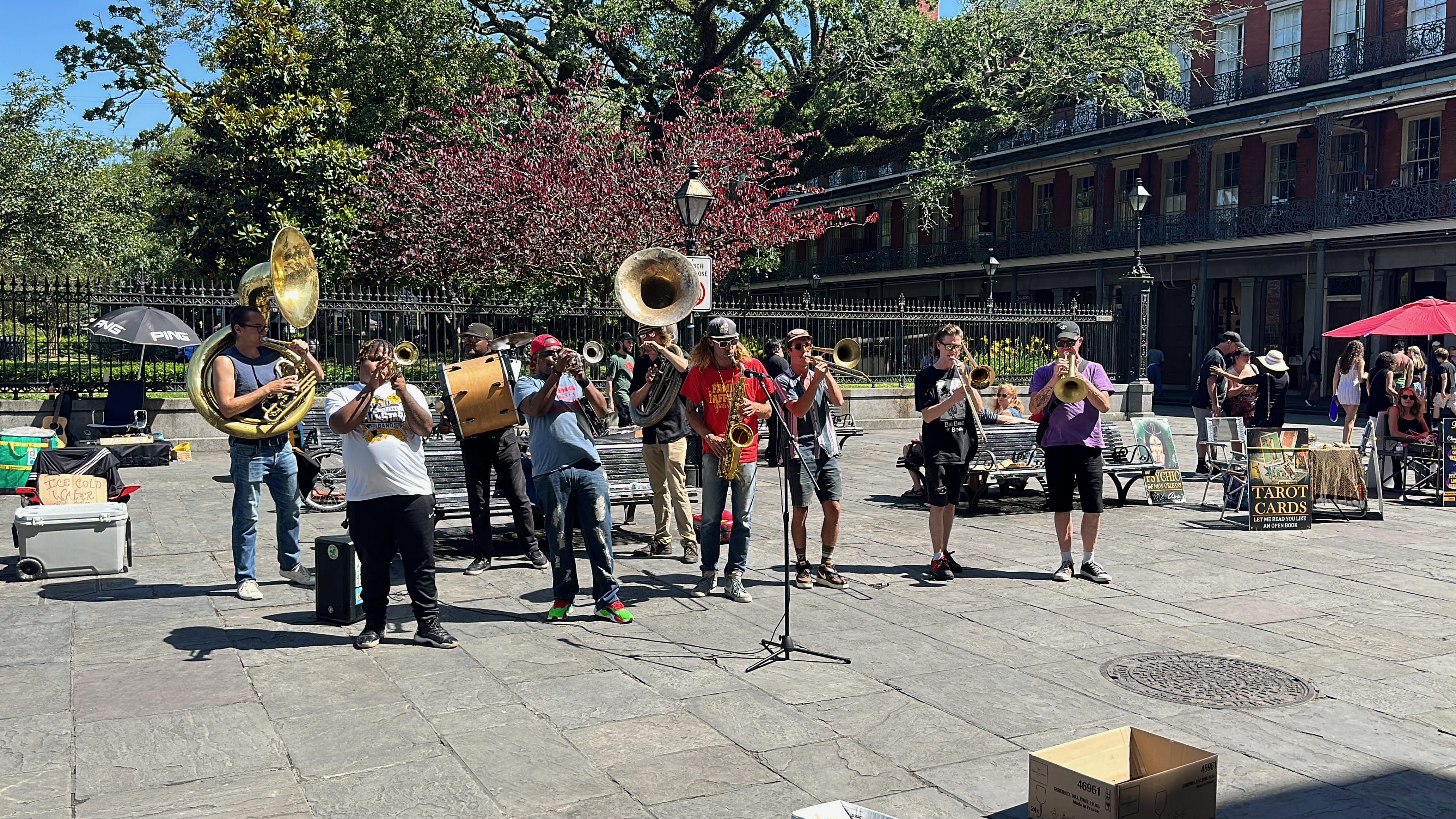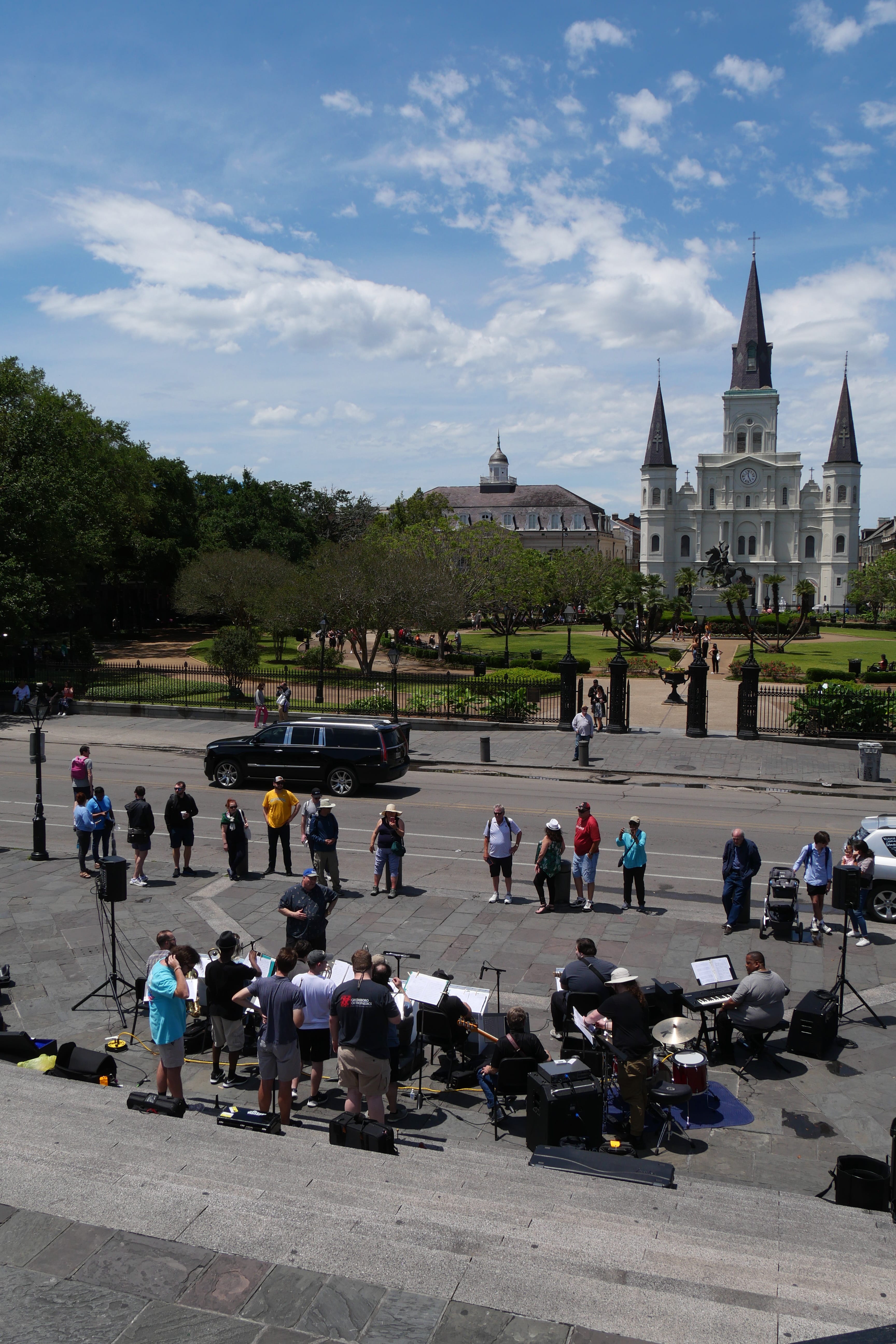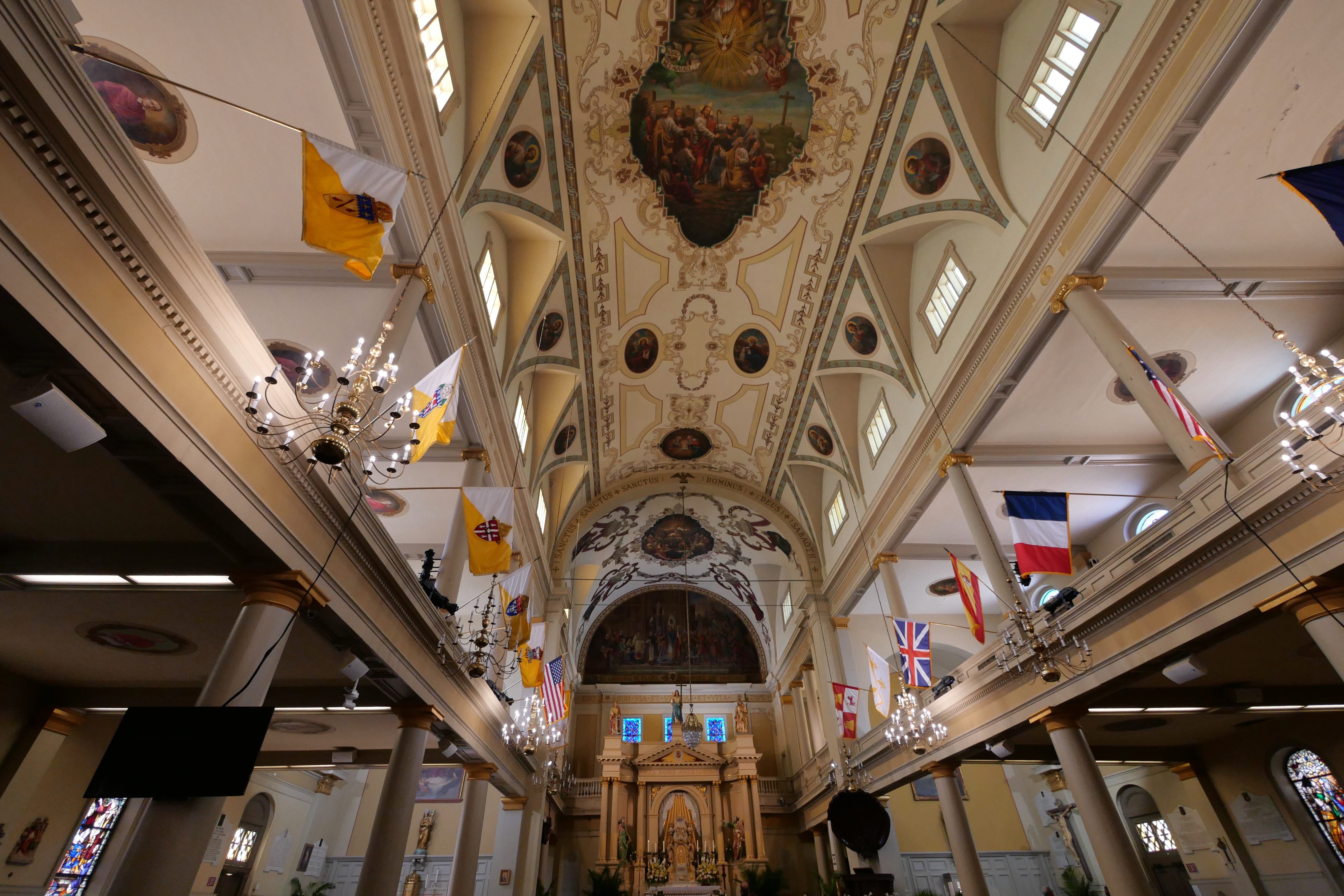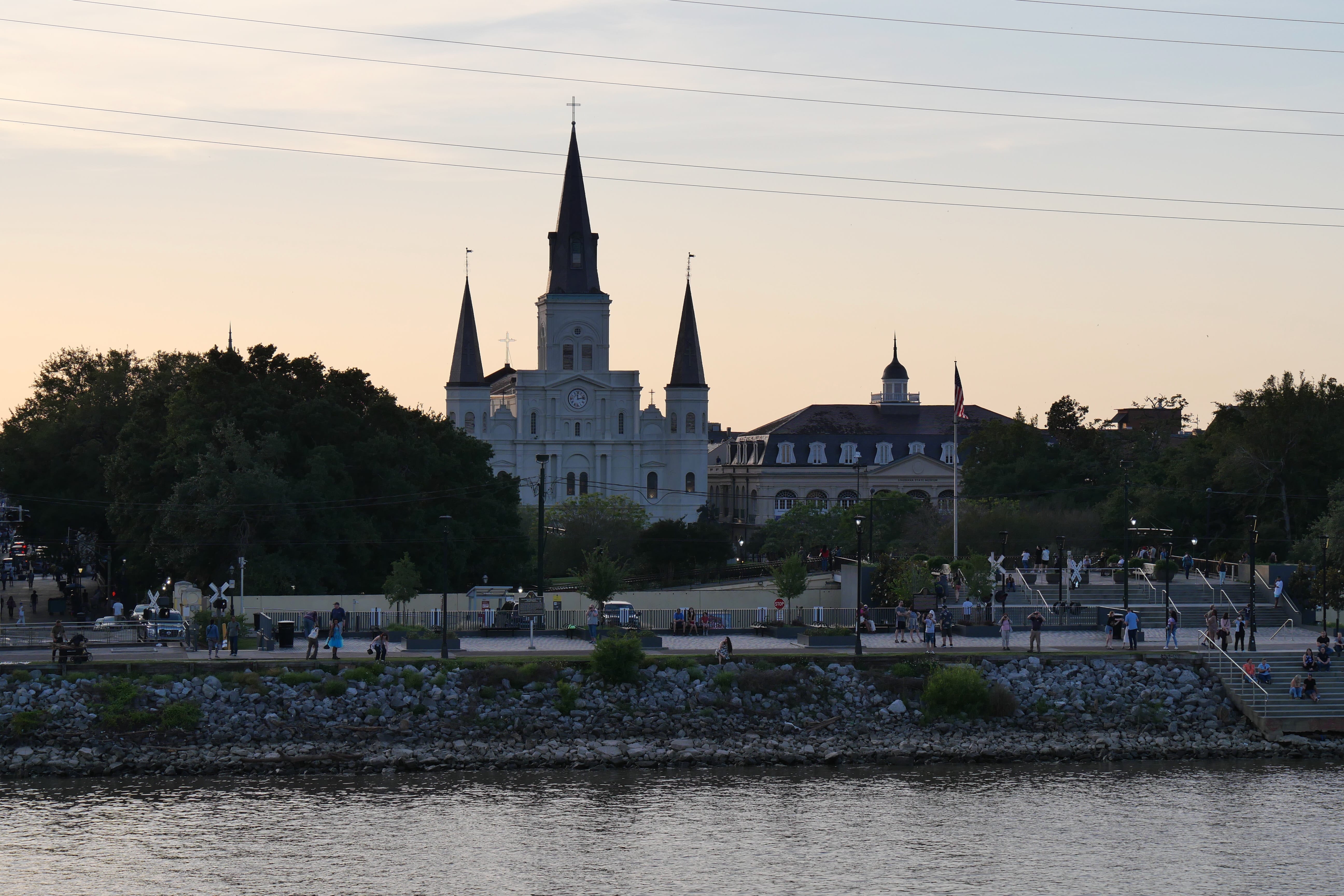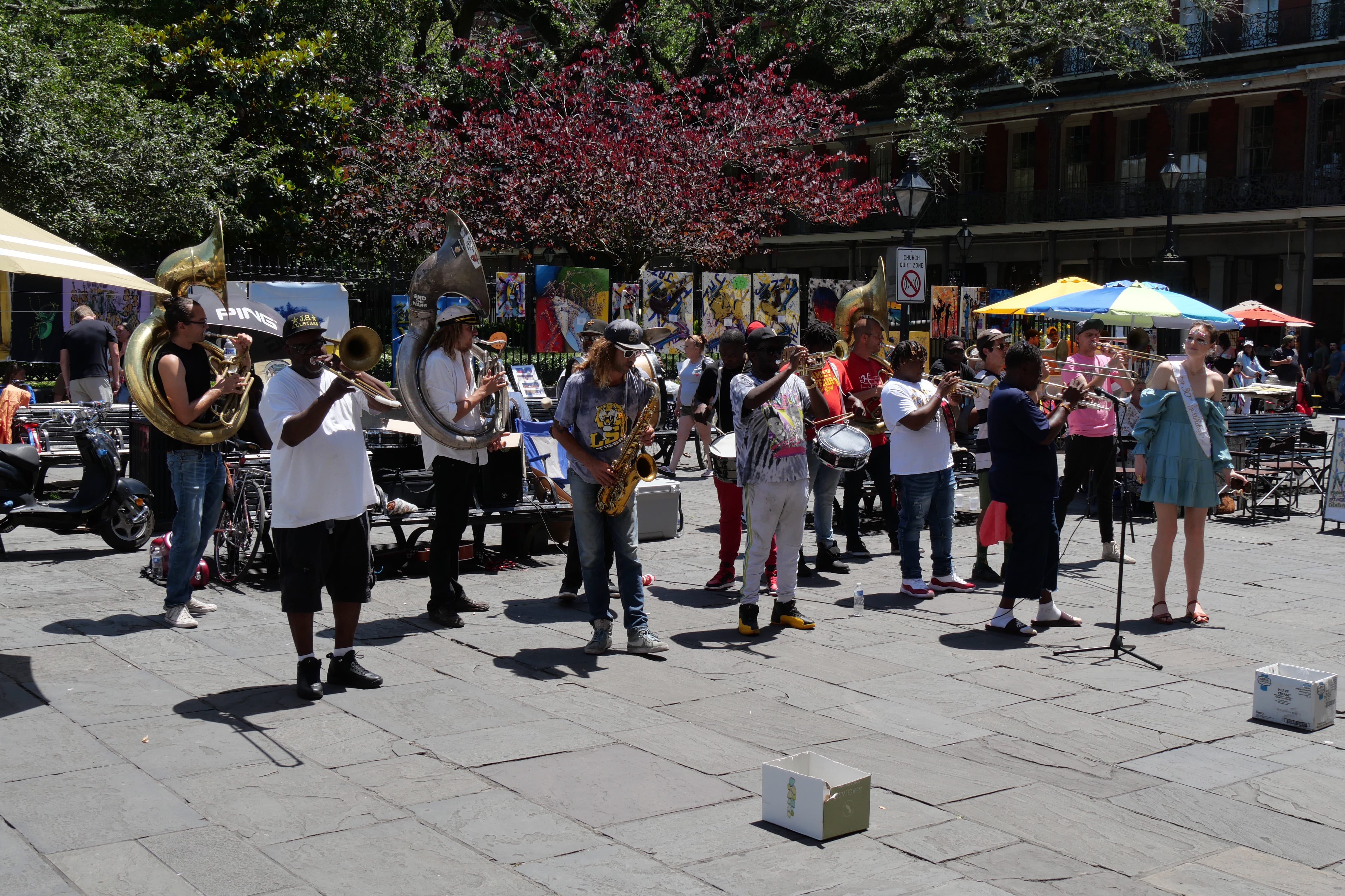Nous emprunterons ensuite les rues adjacentes pour rejoindre le parking au bord du fleuve et récupérer notre pique-nique pour déjeuner face au Mississippi (que l’on peut ici voir sans problème !), ravis que la météo se soit bien améliorée depuis notre arrivée en ville. Derrière nous, face à Jackson Square et à la Cathédrale St-Louis, un groupe de musiciens s’est installé. Ils ont tous leur place, leur instrument et jouent plusieurs morceaux. On se laisse entraîner et il est difficile de repartir. On aurait pu rester là à les écouter un bon moment, mais on repartira finalement à la fin de leur set pour nous rendre à Jackson Square juste en face. D’autres groupes sont en train de jouer face à une bonne douzaine ou quinzaine de stands de voyance ! Ne préférant pas se risquer à obtenir de mauvaises nouvelles, nous passerons notre tour. On visitera l’intérieur de la très jolie Cathédrale puis en sortant, nous serons happés par un autre groupe de musiciens qui s’est installé juste en face. Ils jouent bien, très bien même et c’est presque hypnotique de les regarder jouer. On s’assiéra donc pour en profiter aussi longtemps que possible, se laissant emporter par la Nouvelle-Orléans telle qu’on l’imaginait.