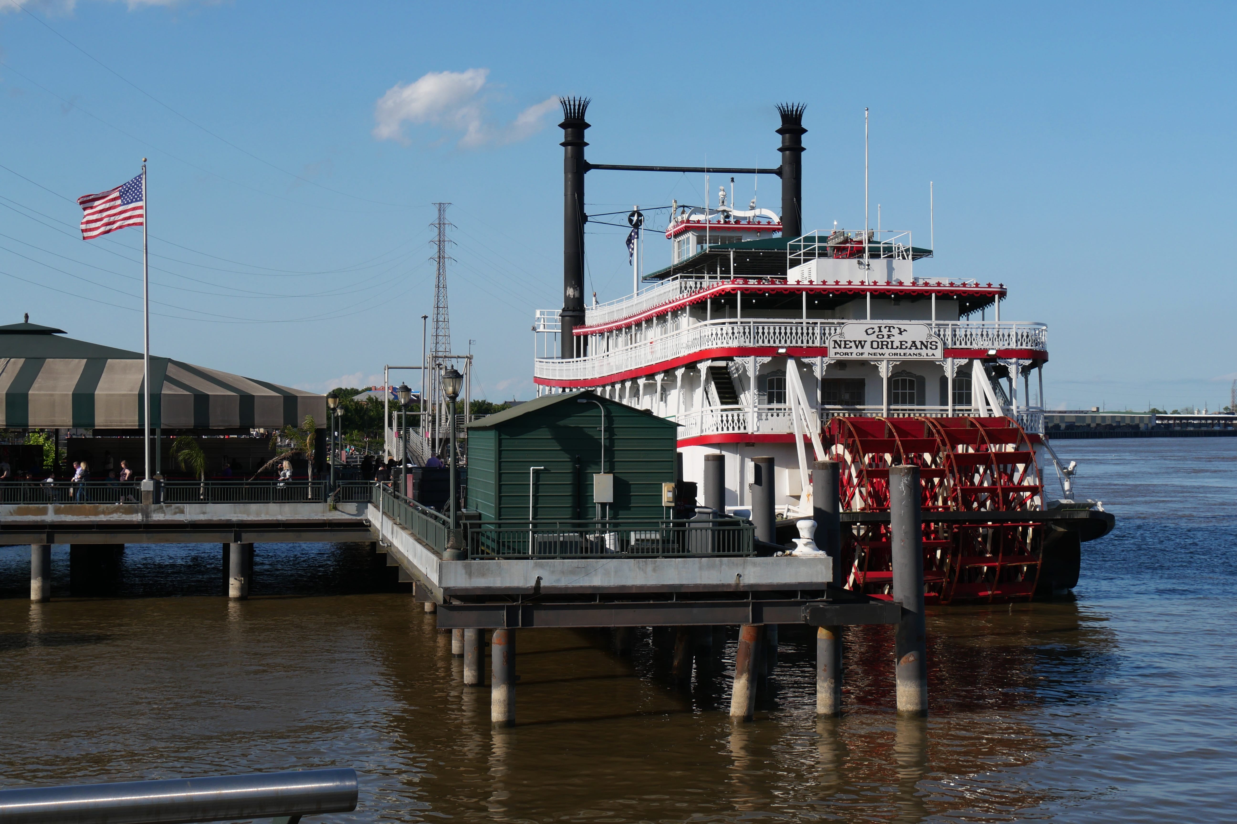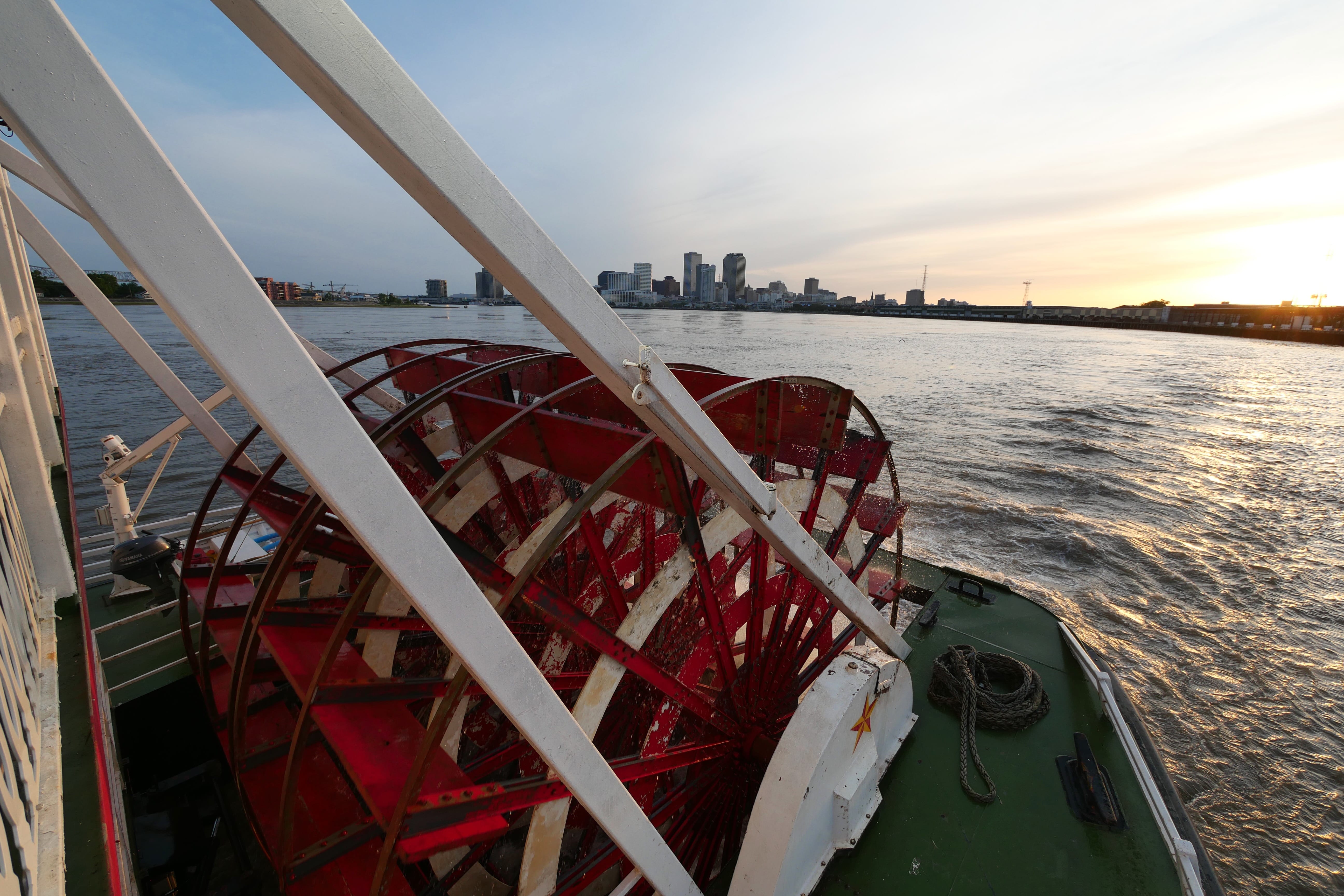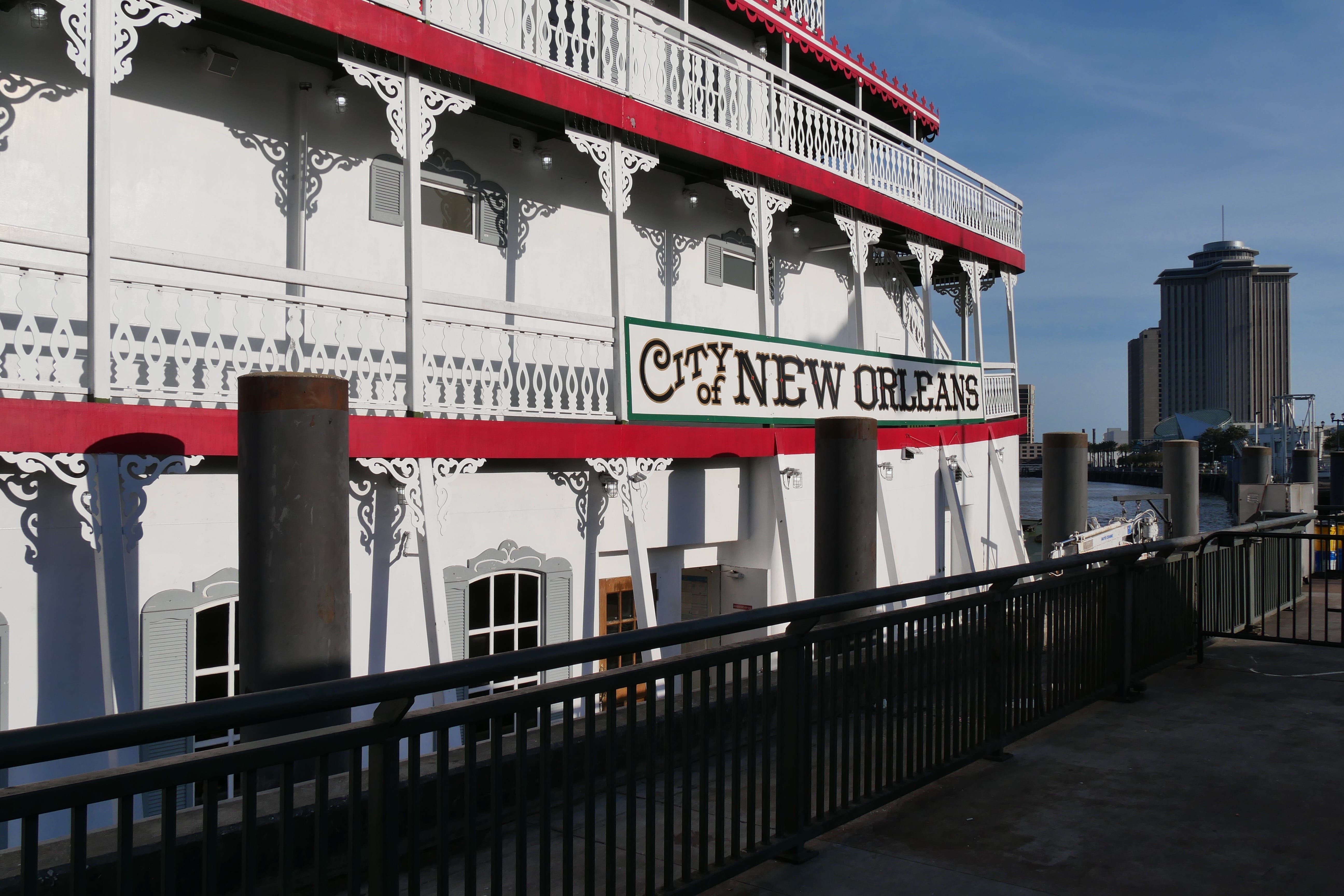Une fois leur set terminé, nous repartons nous balader un peu au hasard au gré des rues et en profitons pour faire quelques achats souvenirs en attendant l’heure de notre activité pour la soirée. Pour profiter au maximum de notre expérience à NOLA, nous avions réservé une soirée sur le Steamboat Natchez, authentique bateau à vapeur avec une roue à aube qui fut mis à l’eau en 1975. L’annonce de son heure de départ se fait par un joueur de carillons avec des airs si aigus qu’à un moment ça en devenait presque insupportable. Nous avons eu peur d’avoir cette musique là tout au long de la soirée mais heureusement, c’est finalement un groupe de jazz qui a pris le relais une fois à bord. Nous avions choisi la formule avec repas et avons donc attendu l’heure à laquelle nous devions nous rendre au buffet pour goûter aux spécialités créoles. Ayant un peu peur de l’aspect self du repas, nous avons finalement apprécié la répartition des services et le déroulement à bord.
