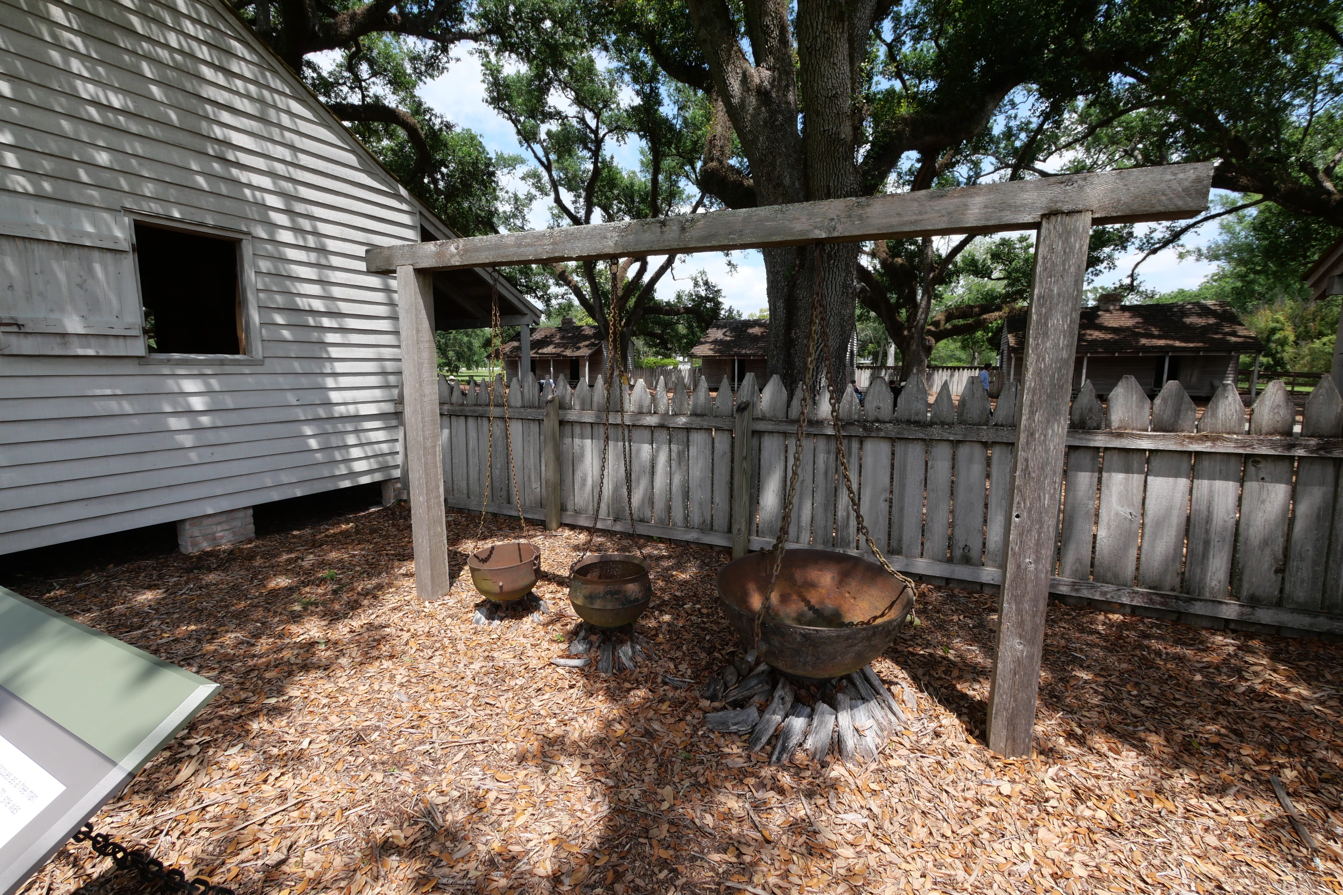 Nous arrivons ensuite aux quartiers des esclaves qui présentent quelques cabanes d’origine et des reproductions. Les conditions de vie y sont médiocres. Les esclaves s’entassent par dizaines dans une seule pièce au confort plus qu’élémentaire. Sur le chemin sont également exposées d’énormes marmites (appelées bouilloires à sucre) de tailles et formes différentes (en fonction des stades de préparation). Notre guide en profitera pour faire un point sur l’élaboration du sucre de canne, après la récolte, et qui nécessitait plusieurs cuissons avant d’obtenir de la mélasse ou du sucre en cône.