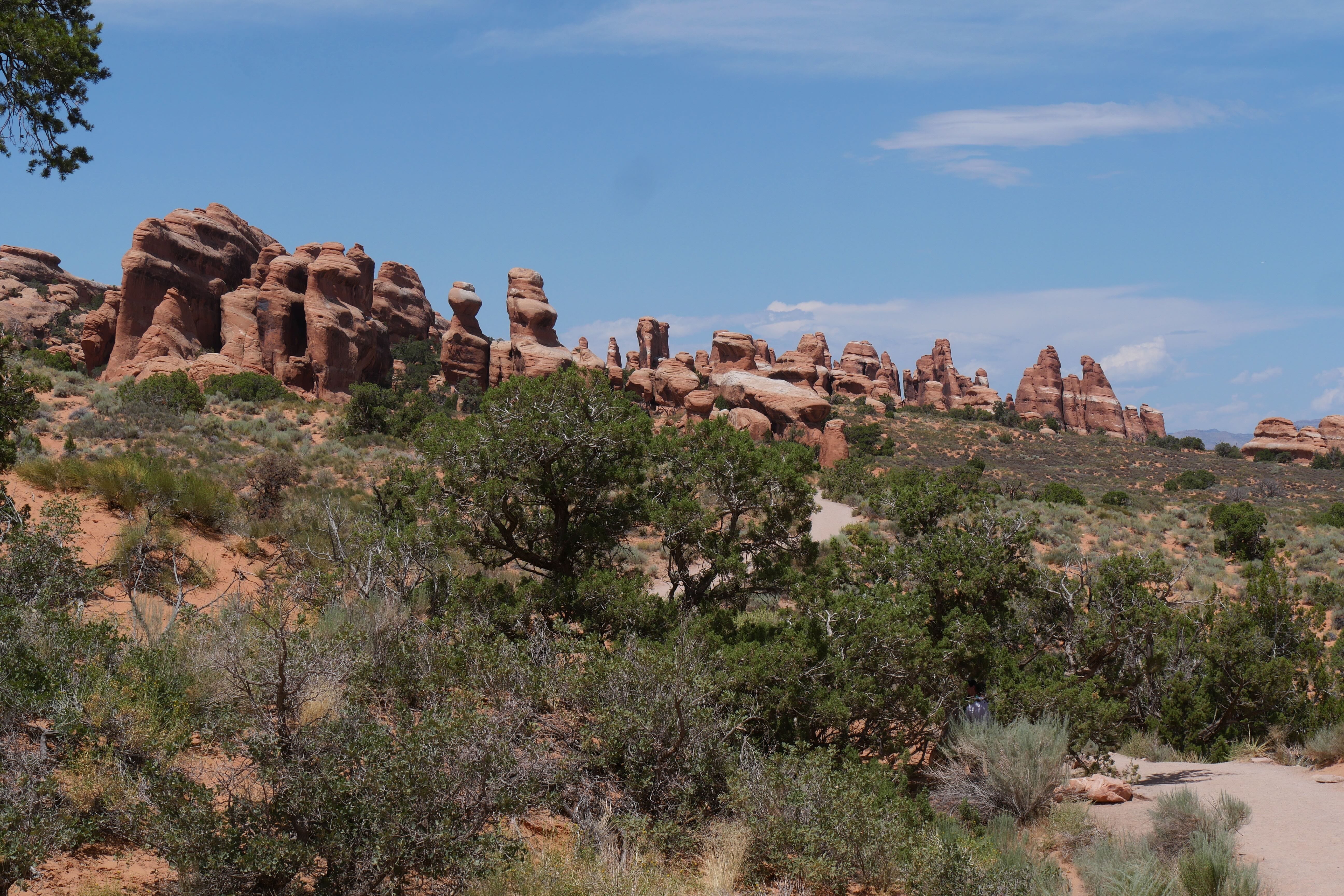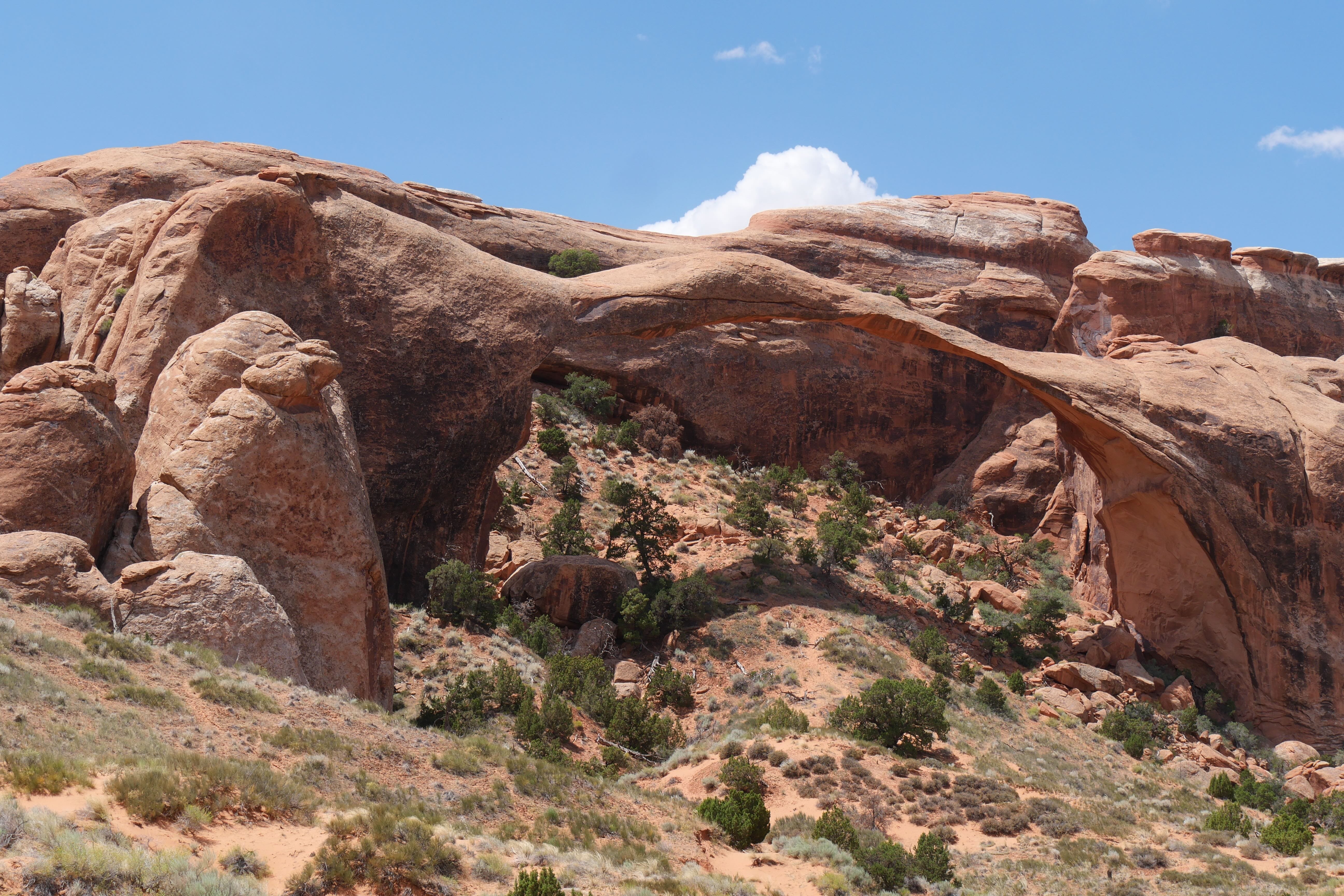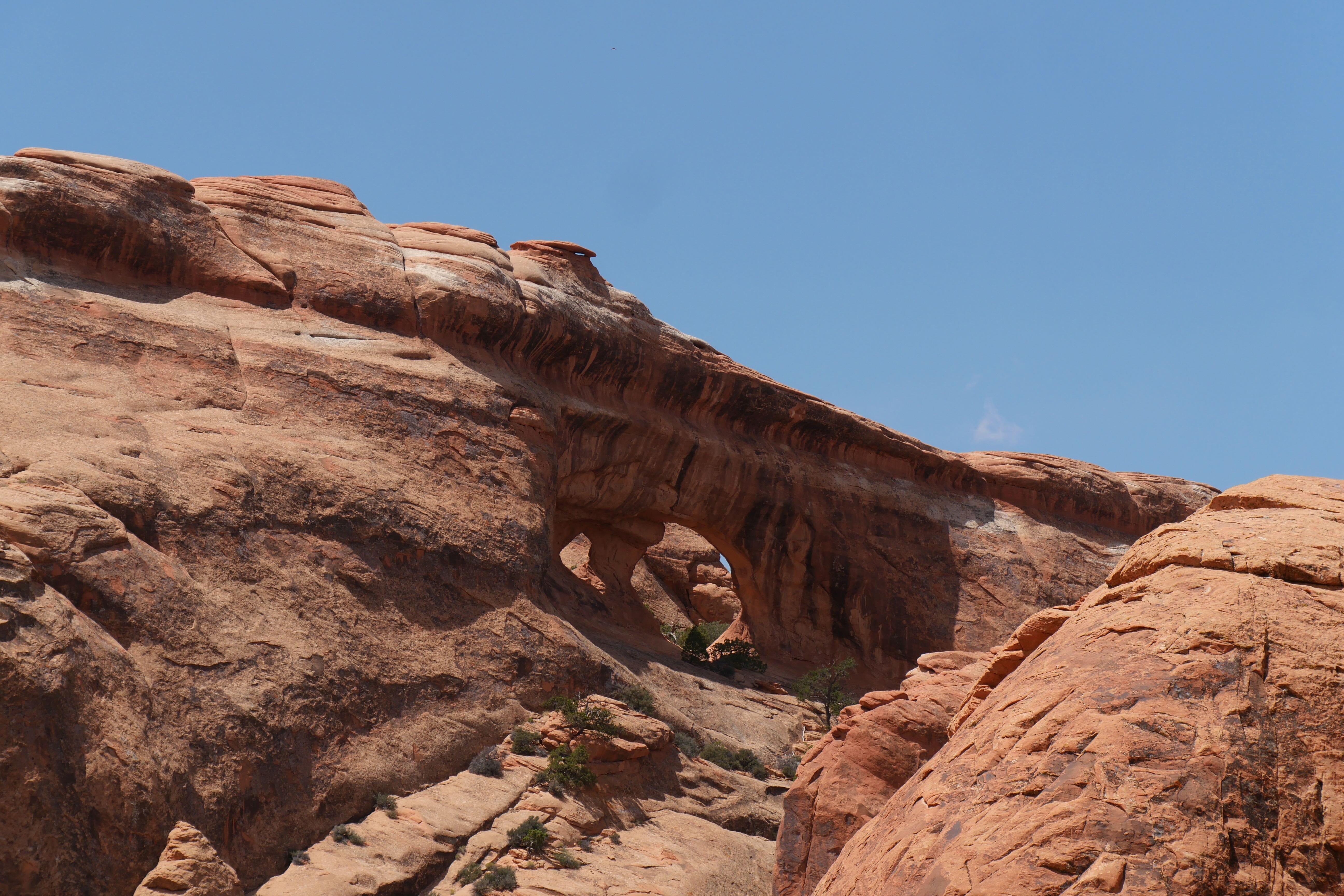 Nous nous rapprochions du milieu de la journée, et la température ne cessait de grimper, nous obligeant à rationaliser nos découvertes et nos déplacements. Encore plus que d’habitude, nos départs de randonnées s’accompagnaient systématiquement d’un sac avec beaucoup d’eau, d’un brumisateur, de chapeaux et de crème solaire. L’occasion de vous rappeler de toujours partir préparé, ne sachant jamais ce sur quoi vous pourriez tomber, surtout dans des conditions particulières comme celles que nous avions au sein du parc en cet été. C’est un peu avant d’arriver à Devil’s Garden Trail que nous avons déjeuné, à l’ombre d’un abri de pique-nique, pour ensuite rejoindre Landscape Arch, pas trop éloignée du parking en temps normal, mais suffisamment loin pour nous éprouver plus que nous l’espérions en raison du soleil à son zénith. Le spectacle offert par cette arche, très fine aujourd’hui, et peut-être écroulée dans les années ou décennies qui viennent, a contrebalancé la fatigue. Le trail devenant ensuite plus technique, le sable remplaçant le gravier, nous avons rebroussé chemin pour découvrir d’autres arches, depuis la voiture cette fois.