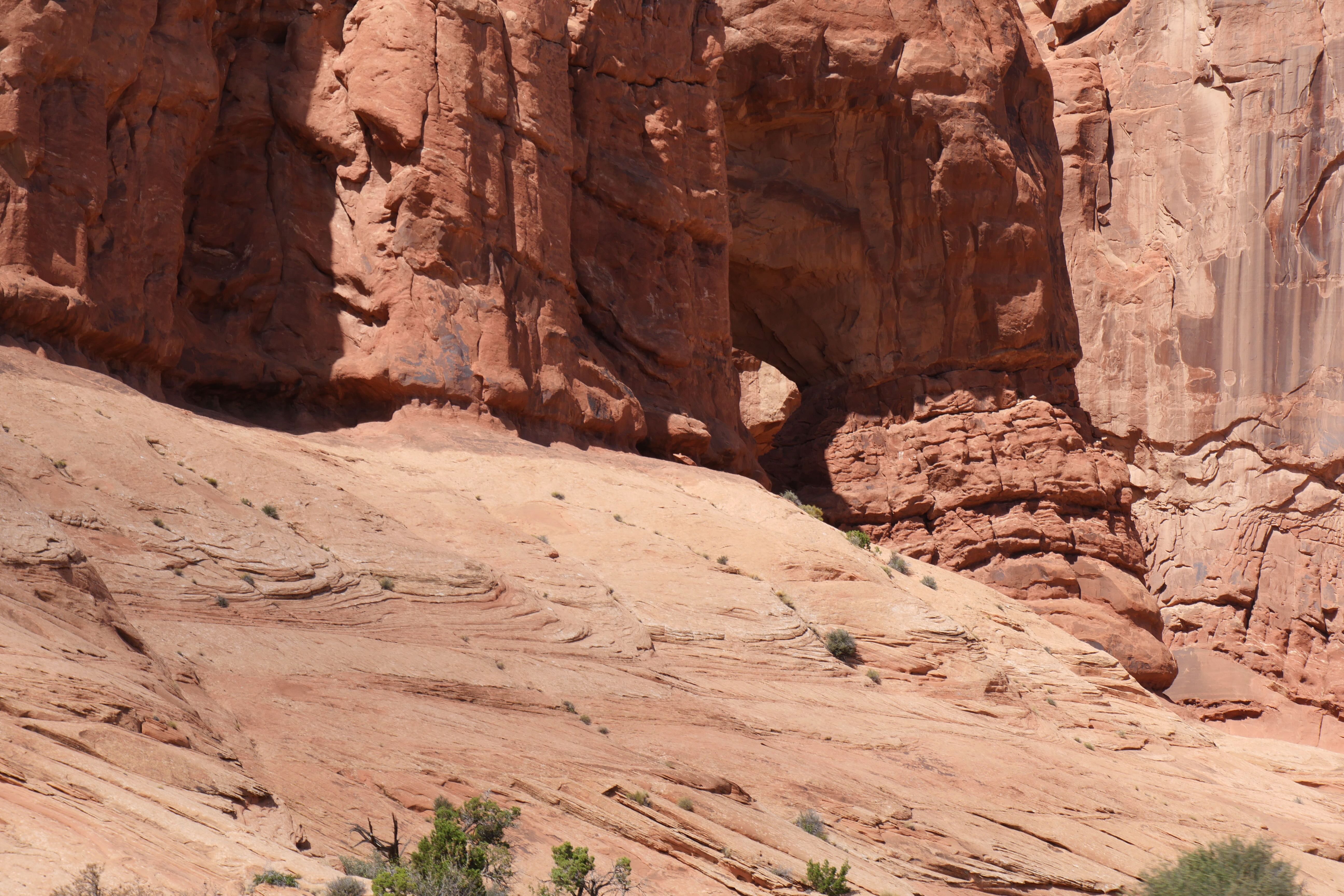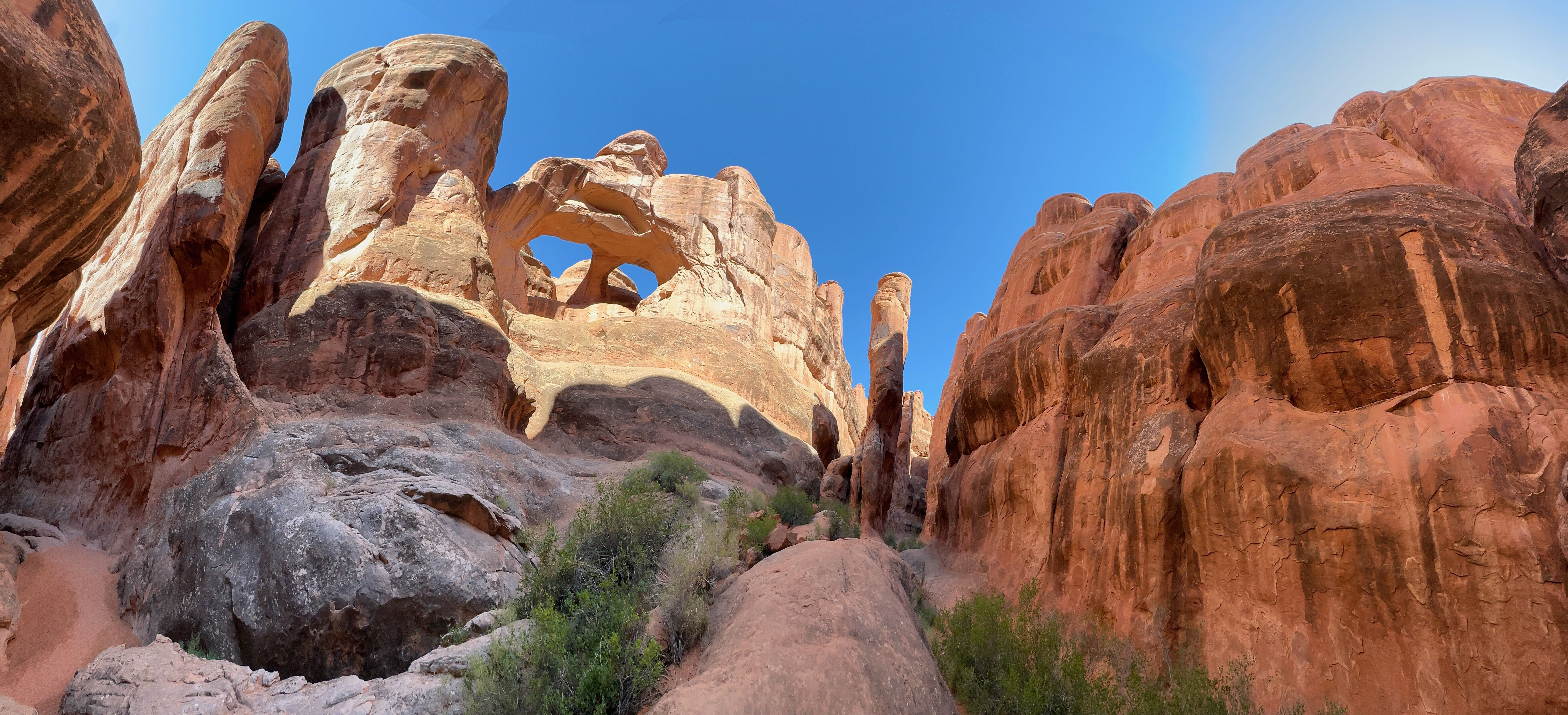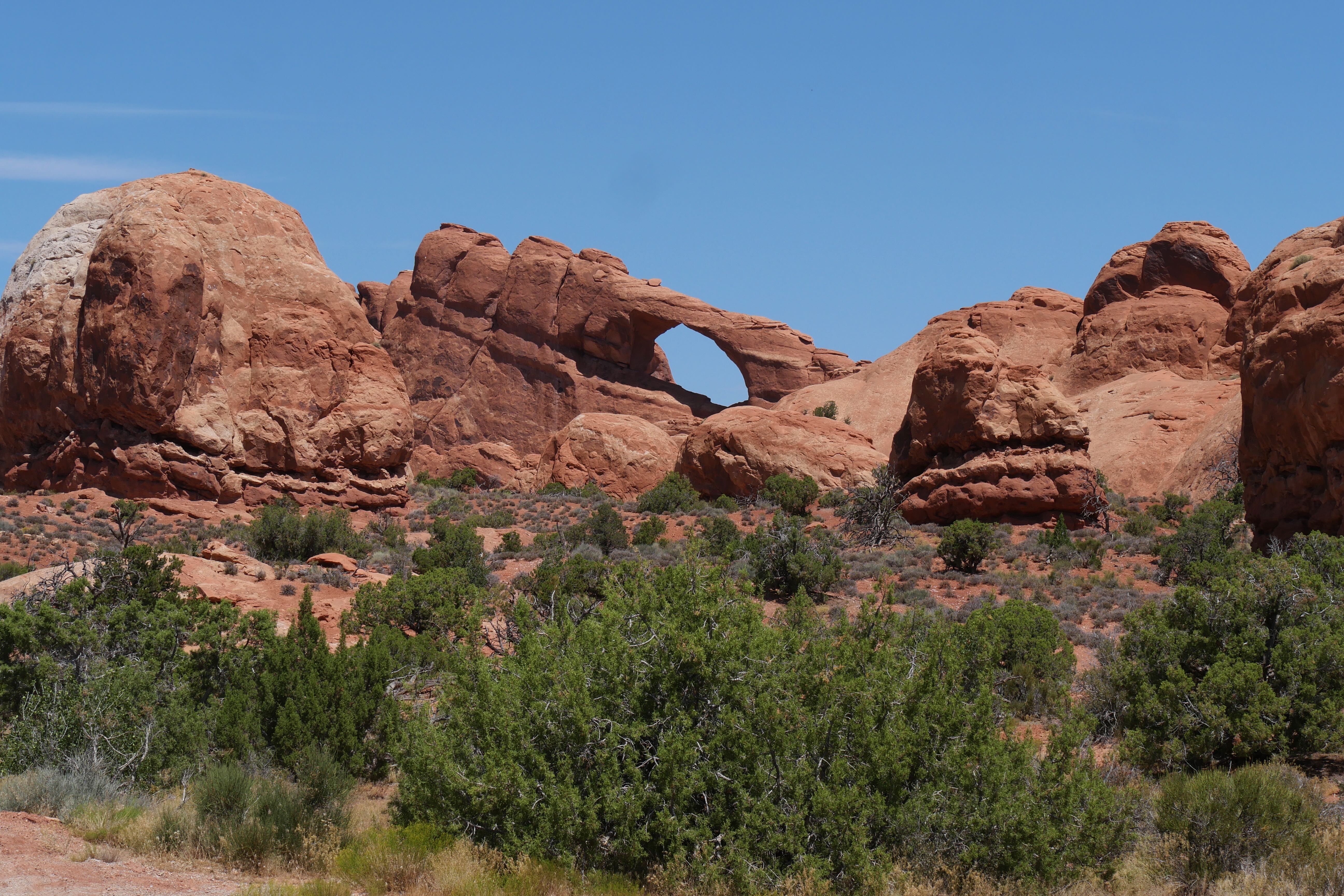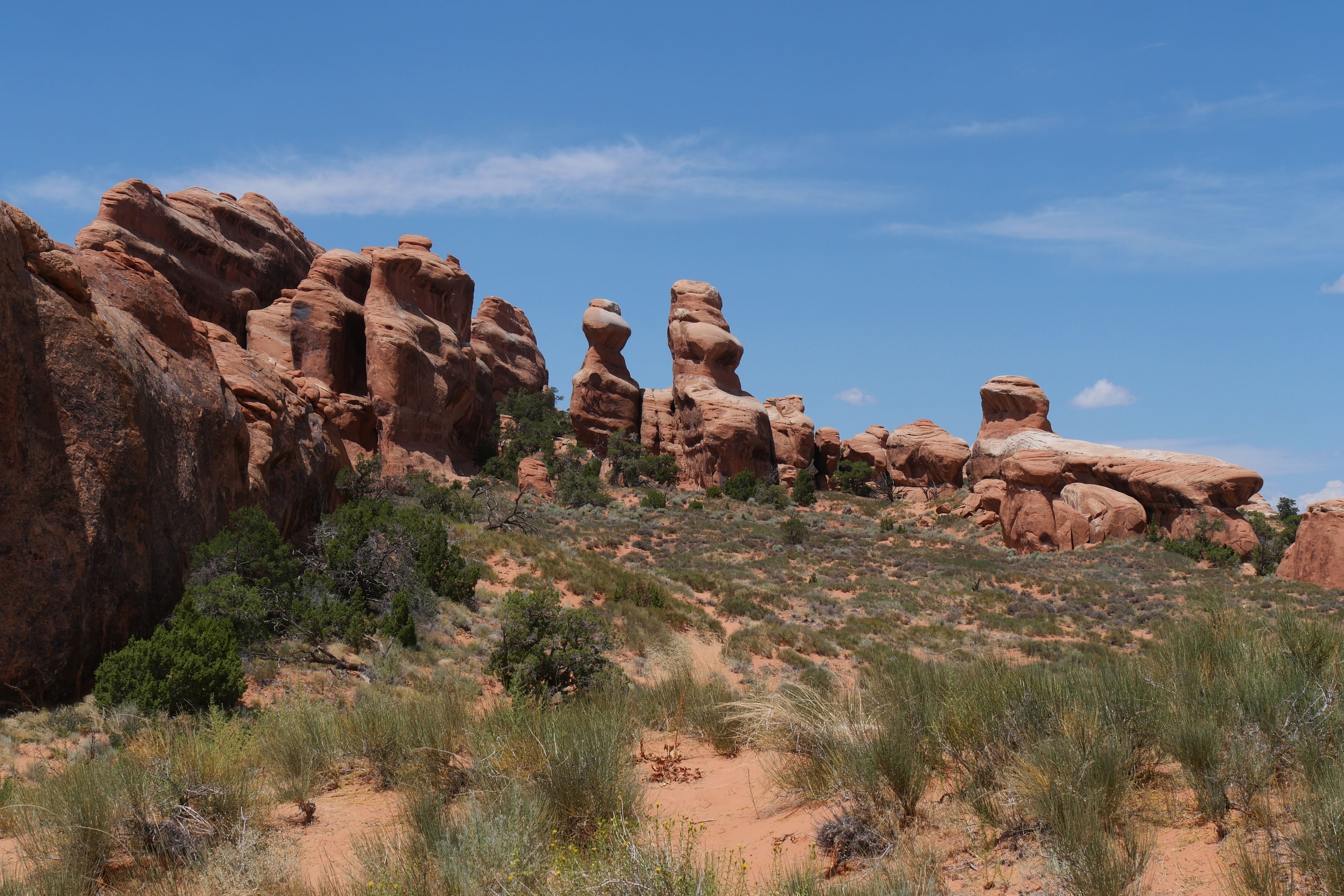 Nous nous rapprochions du milieu de la journée, et la température ne cessait de grimper, nous obligeant à rationaliser nos découvertes et nos déplacements. Encore plus que d’habitude, nos départs de randonnées s’accompagnaient systématiquement d’un sac avec beaucoup d’eau, d’un brumisateur, de chapeaux et de crème solaire. L’occasion de vous rappeler de toujours partir préparé, ne sachant jamais ce sur quoi vous pourriez tomber, surtout dans des conditions particulières comme celles que nous avions au sein du parc en cet été. C’est un peu avant d’arriver à Devil’s Garden Trail que nous avons déjeuné, à l’ombre d’un abri de pique-nique, pour ensuite rejoindre Landscape Arch, pas trop éloignée du parking en temps normal, mais suffisamment loin pour nous éprouver plus que nous l’espérions en raison du soleil à son zénith. Le spectacle offert par cette arche, très fine aujourd’hui, et peut-être écroulée dans les années ou décennies qui viennent, a contrebalancé la fatigue. Le trail devenant ensuite plus technique, le sable remplaçant le gravier, nous avons rebroussé chemin pour découvrir d’autres arches, depuis la voiture cette fois.