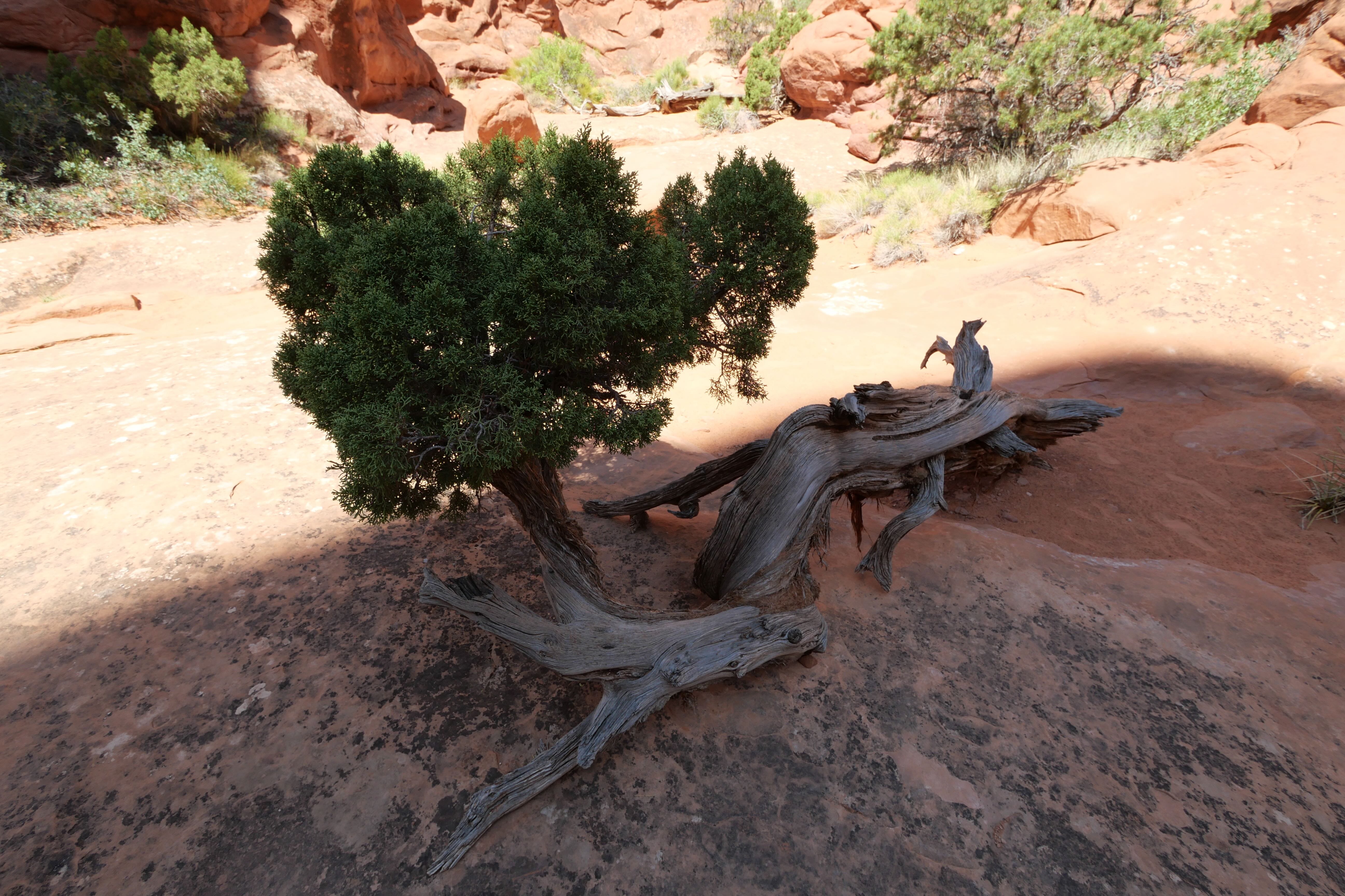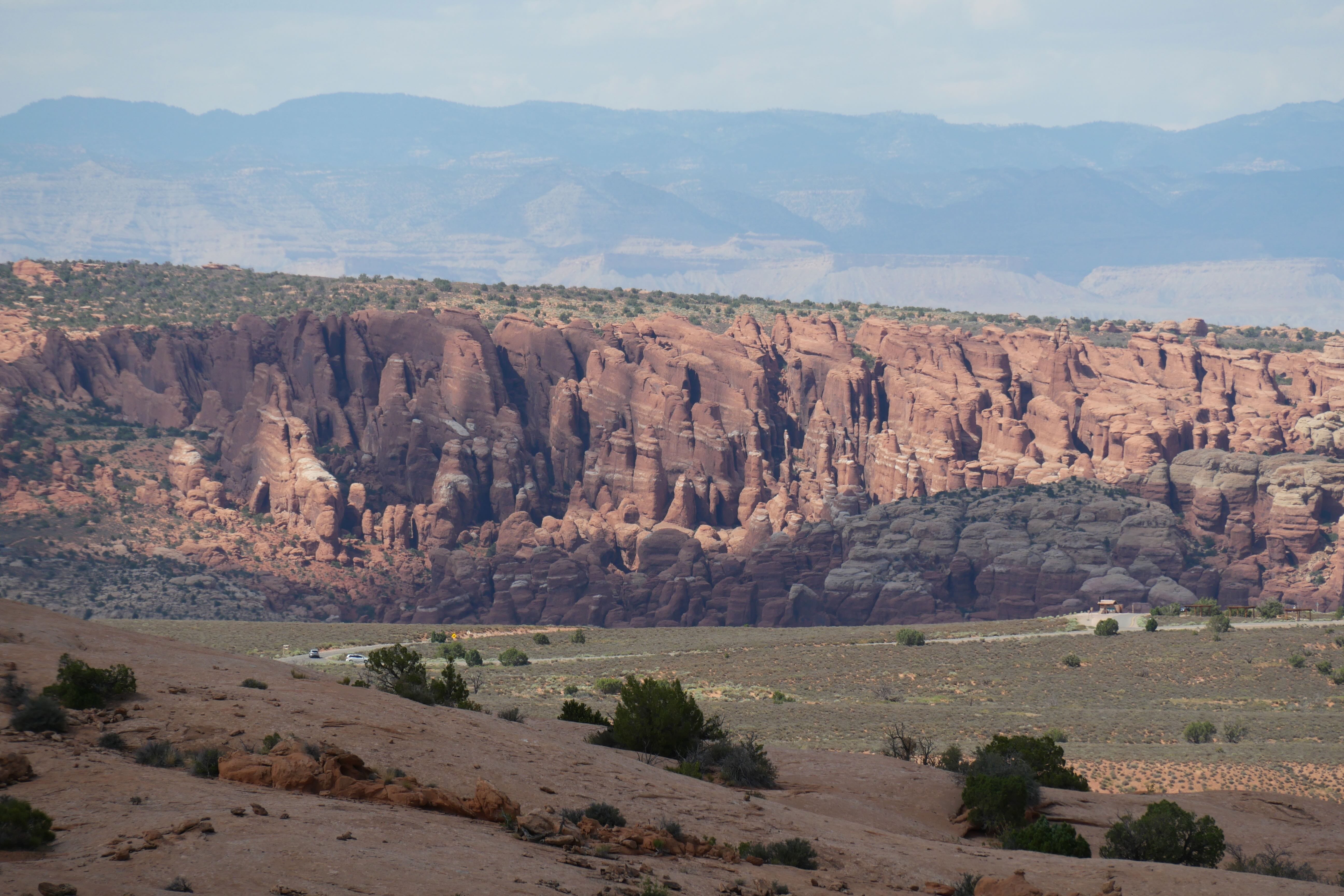 L’arche la plus connue de Arches NP est sans aucun doute Delicate Arch, pour laquelle il y a trois options pour la découvrir. La première consiste à se garer à un premier parking (Delicate Arch Trailhead), lorsqu’on prend la direction de l’arche en voiture, qui permet de se rendre jusque sous l’arche à pied (environ 5km, 150m de dénivelé positif). Clairement, c’est la meilleure façon de découvrir l’arche, mais aussi la plus exigeante physiquement, et ce jour-là, nous concernant, ce n’était plus envisageable. Le soleil tapait très fort, et la fatigue accumulée nous ont orienté vers les deux autres options, facilement combinables, plus accessibles. Pour cela, il fallait poursuivre sur la route jusqu’au parking marquant également la fin de celle-ci. D’ici, il y avait deux endroits pour apercevoir l’arche, d’assez loin par contre, Lower et Upper Delicate Arch Viewpoints. Le premier est directement accessible depuis le parking, mais n’est objectivement pas terrible. Le second par contre, se mérite davantage mais pas autant qu’en faisant tout le trail présenté plus haut, et offre une vue plus sympa sur l’arche, avec la possibilité, au prix d’un peu de patience, d’avoir l’arche sans personne sur votre photo, à condition d’avoir un objectif capable de zoomer suffisamment.