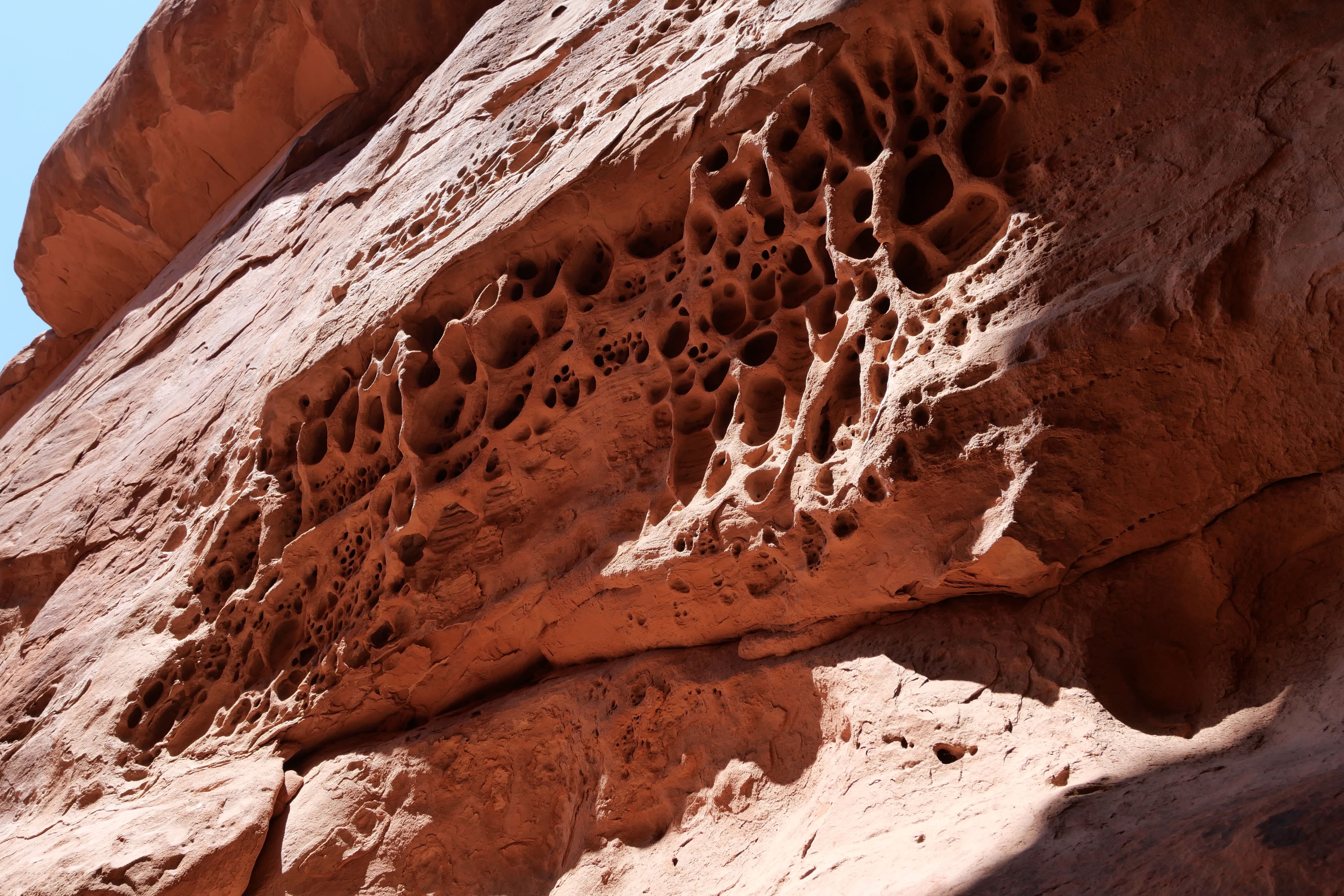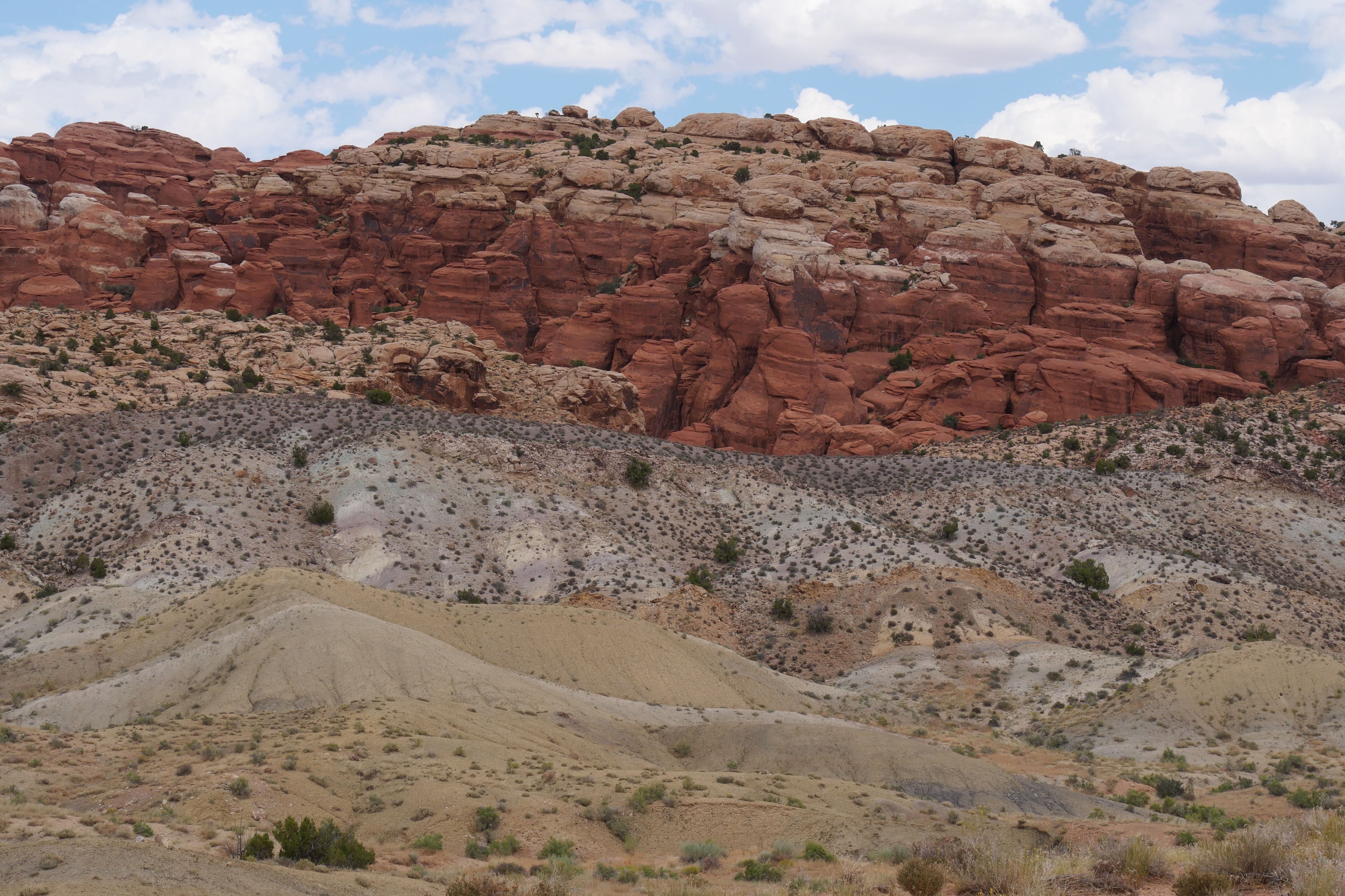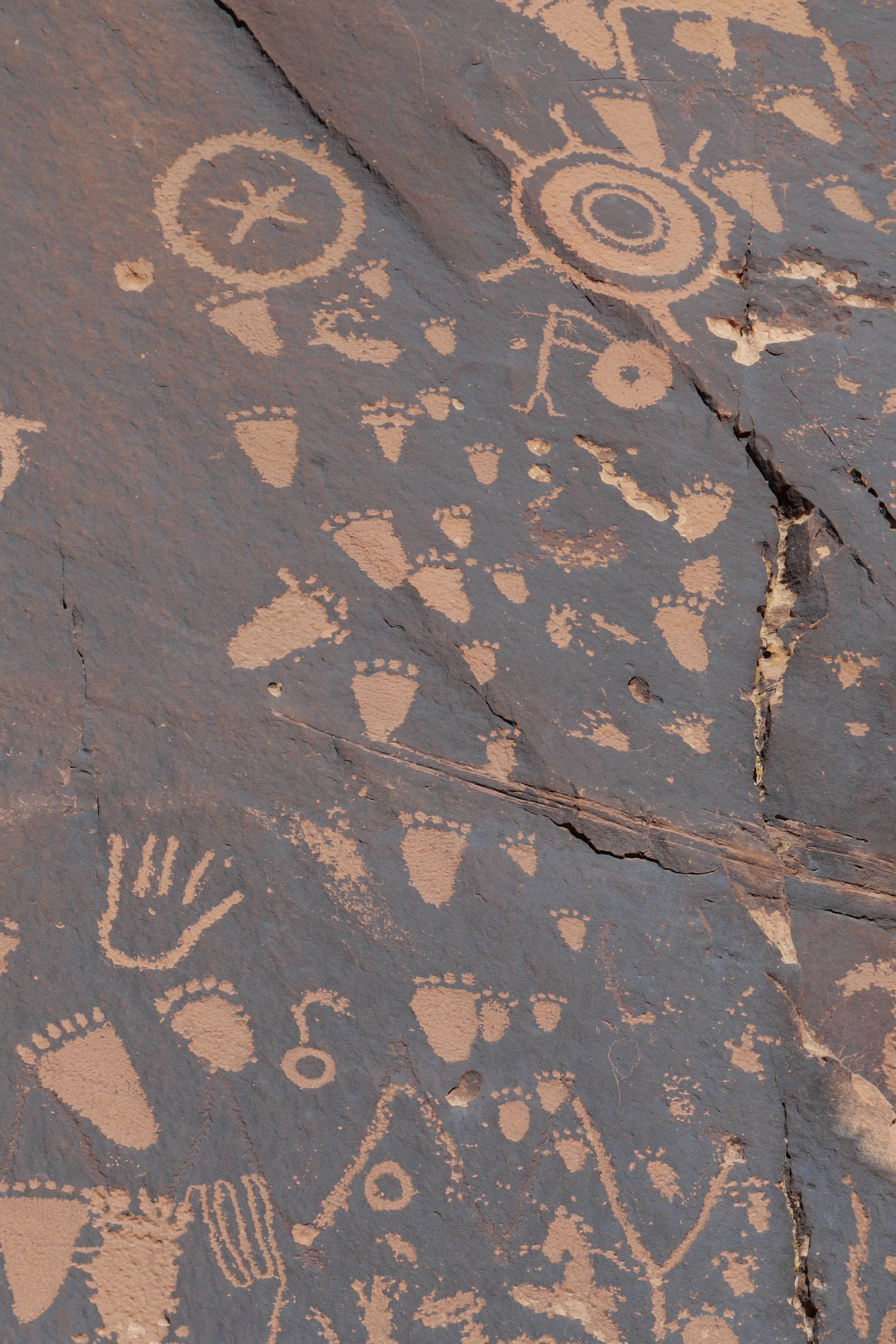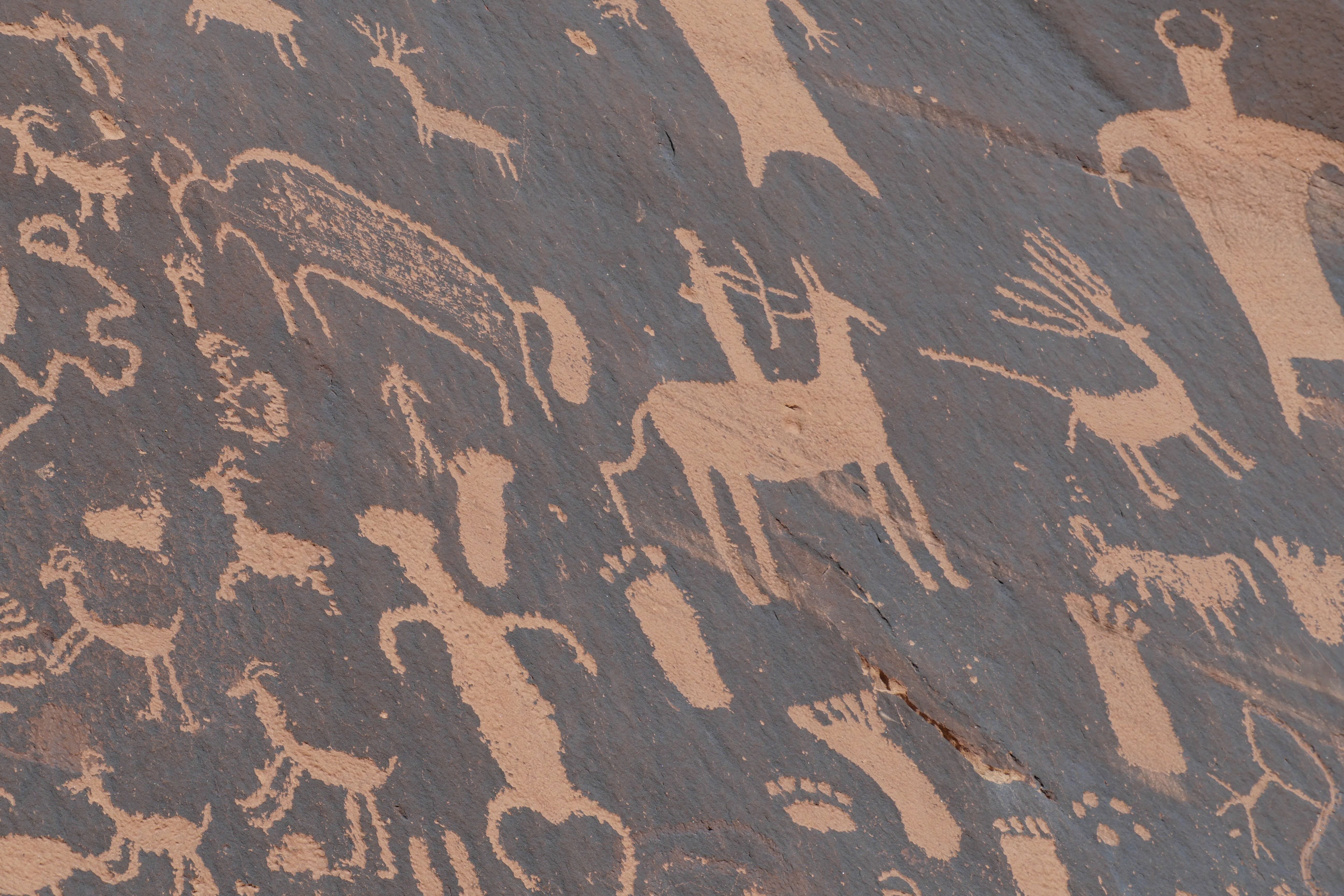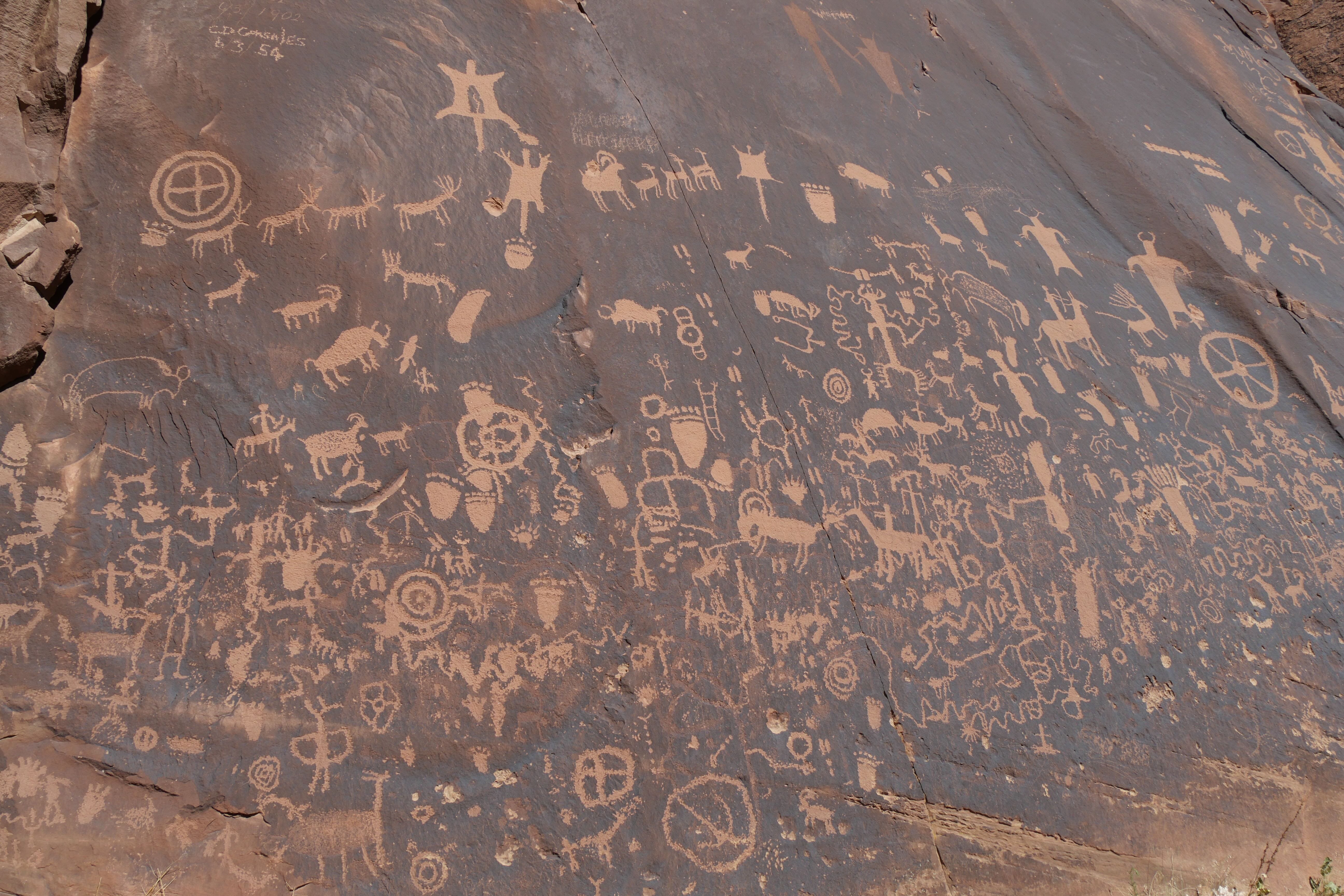Si on n’en a pas vraiment parlé dans notre article réservé aux faits de route de ce RoadTrip, celle entre Island in the Sky et le Needles District ne démérite pas, loin de là. Les falaises ne quittent jamais le bord de la route sur toute la première partie, pour ensuite laisser place à de jolies arches, à droite et à gauche, dont certaines proposent même des parkings pour s’y arrêter et aller les voir de plus près. De plus grandes étendues remplacent ensuite ces falaises, et une fois qu’on a pris la route vers l’Ouest en direction de la partie Sud de Canyonlands, nous étions littéralement seuls au monde. A une trentaine de minutes avant le poste de garde, un arrêt permet de découvrir Newspaper Rock, une pierre sur laquelle sont gravées de très nombreux symboles. Ces inscriptions remontent pour les plus anciennes à 2000 ans et ont été faites par les tribus indiennes ayant vécu dans ces zones. N’hésitez pas à prendre quelques minutes pour découvrir ces scènes pour certaines assez cocasses d’ailleurs.