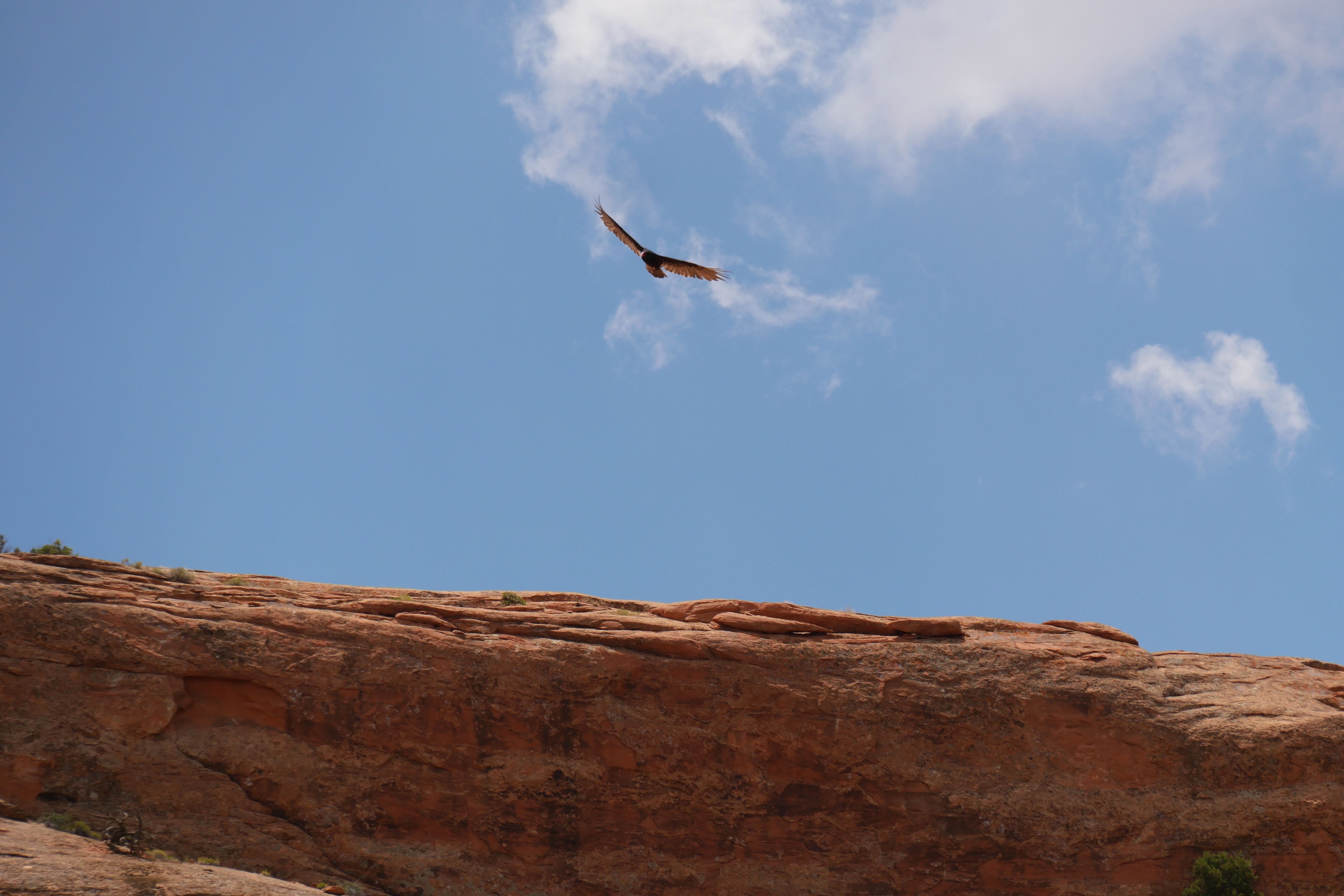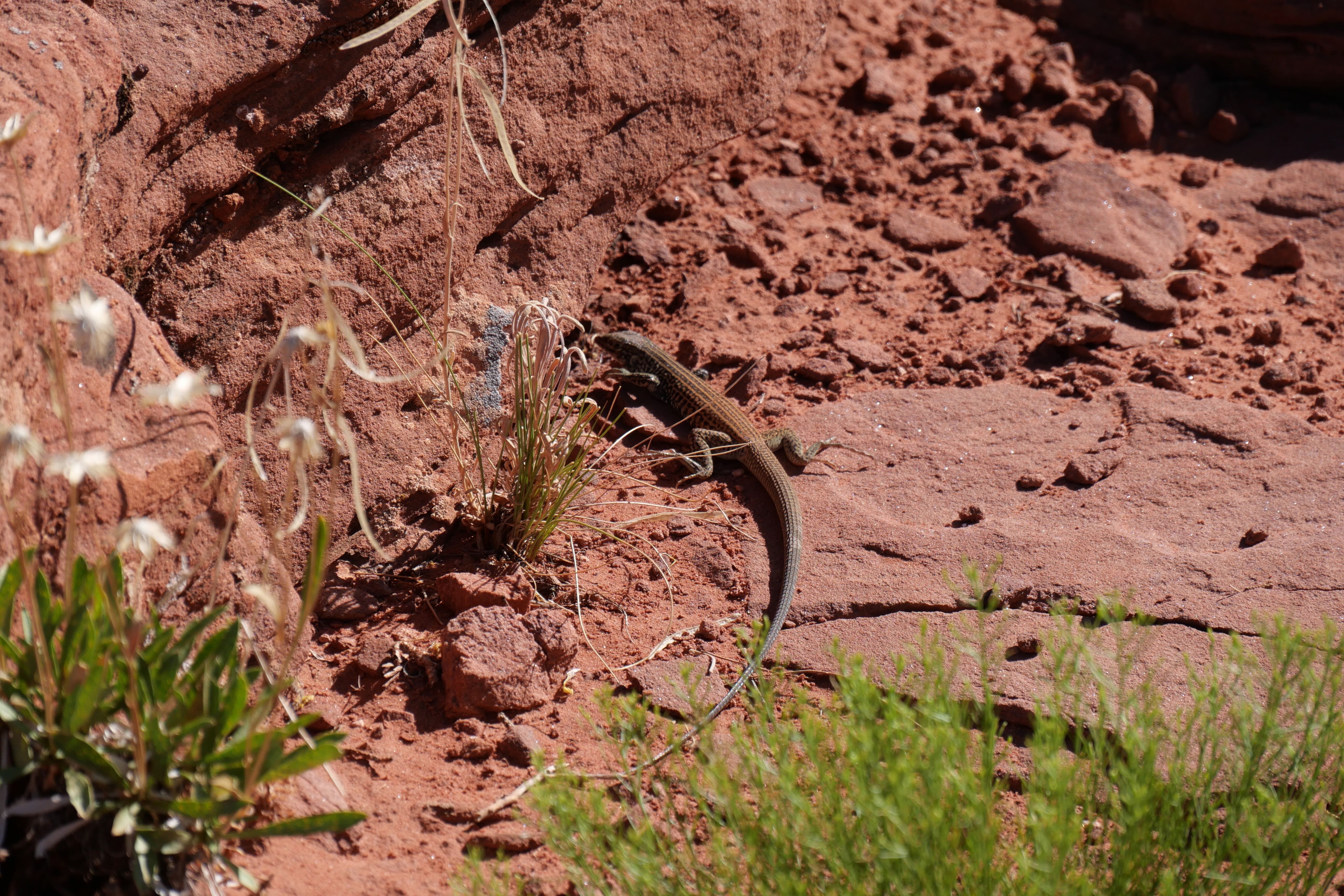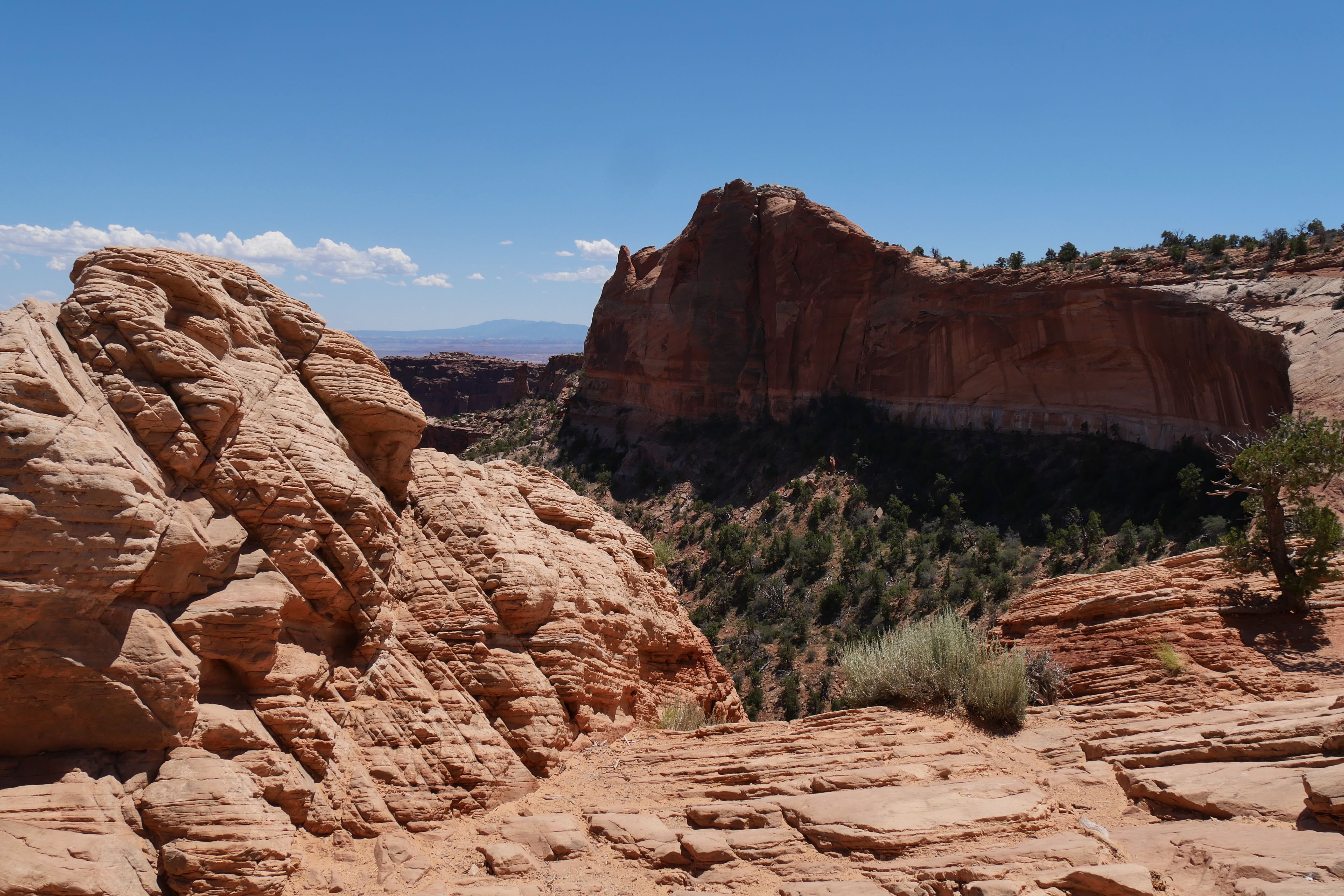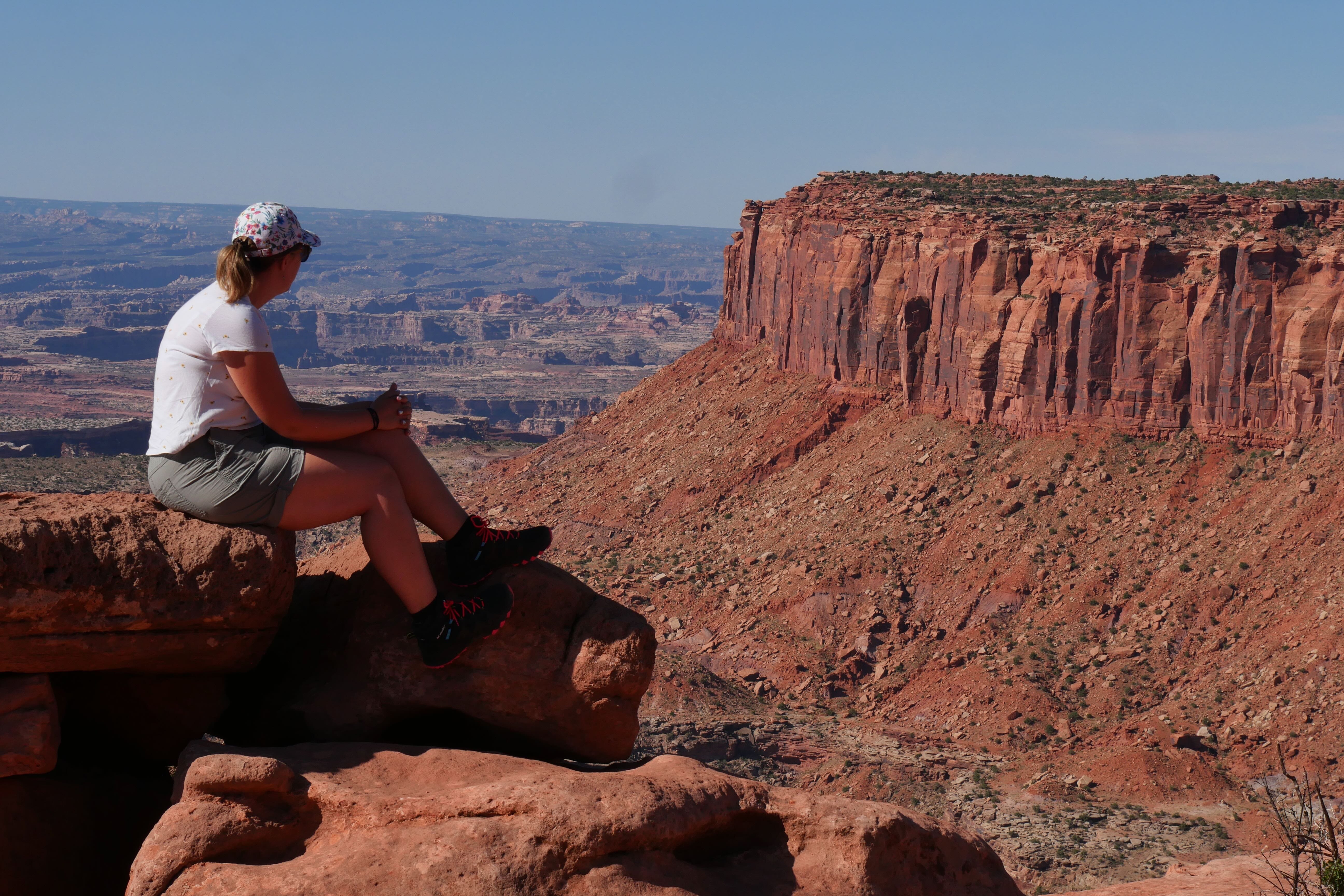 Second arrêt, plus discutable, Murphy Point Overlook Trail. Il faisait déjà très chaud quand on y est arrivé, et nous n’étions que la troisième voiture sur le parking d’accès au trail, ce qui n’était pas forcément pour nous déplaire, ni nous rassurer d’ailleurs. La particularité de Murphy PO Trail, c’est que le sentier, s’il est assez direct jusqu’au point d’arrivée, est aussi assez vallonné, empêchant d’apercevoir l’objectif final avant d’y être. Si l’orientation dans les premiers kilomètres est assez facile, et qu’il est bien indiqué le trail qui descend dans le canyon et celui qui permet d’avoir la vue panoramique, la suite se complique et on en finit par ne plus en voir le bout. Finalement, après trois moments où nous pensions enfin avoir atteint le bout du trail, nous avons décidé de nous orienter jusqu’à un point offrant une vue plongeante sur le canyon, ne sachant pas trop s’il s’agissait de la fin officielle ou non de Murphy PO Trail. Sans regrets, et après avoir fait une courte pause, seuls au monde, nous avons petit à petit rebroussé chemin jusqu’au parking, où nous étions alors les derniers. Profitant des installations du parc, nous avons mangé tranquillement, profitant de l’ombre et du vent bienvenus pour redescendre en température avant de reprendre la route.