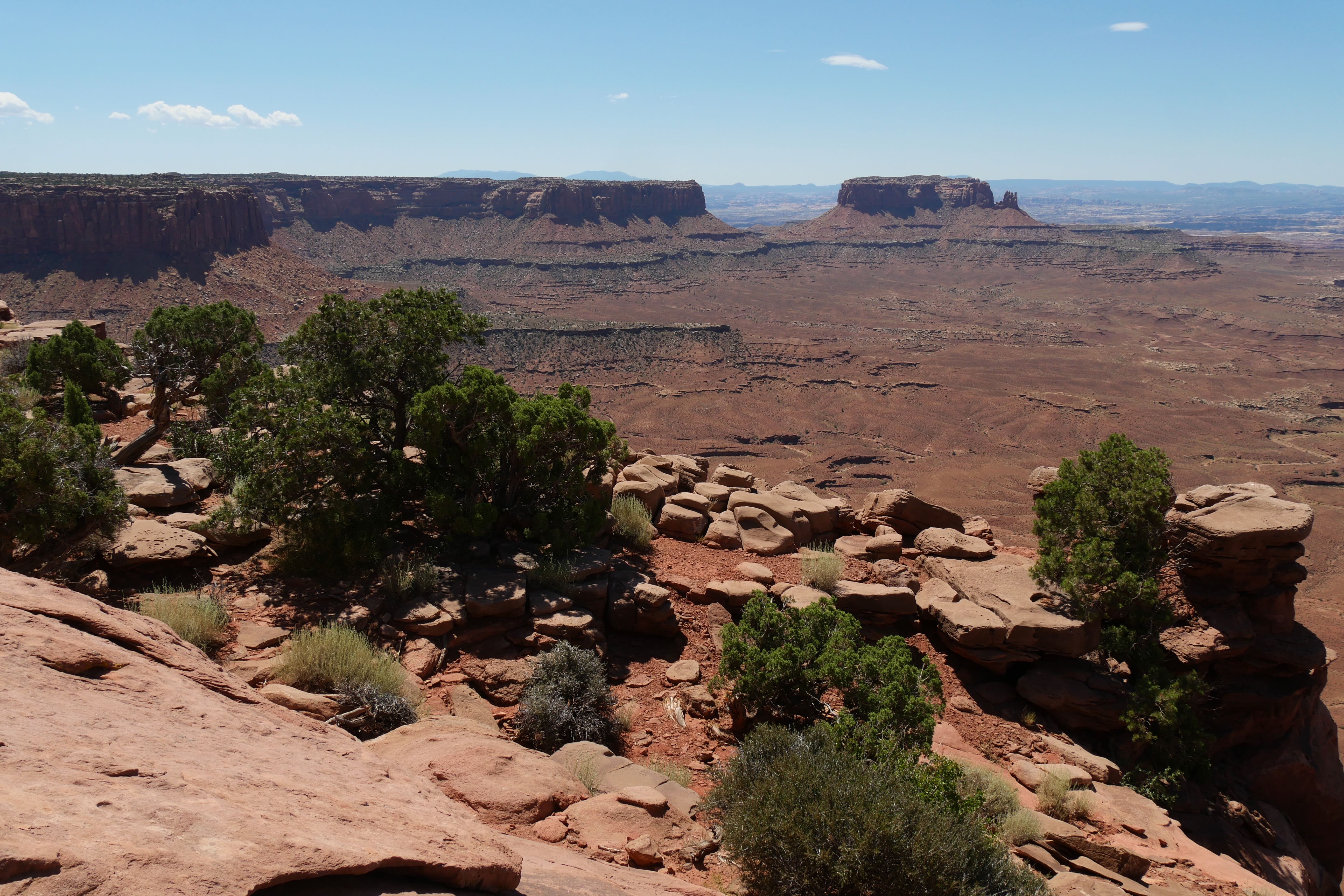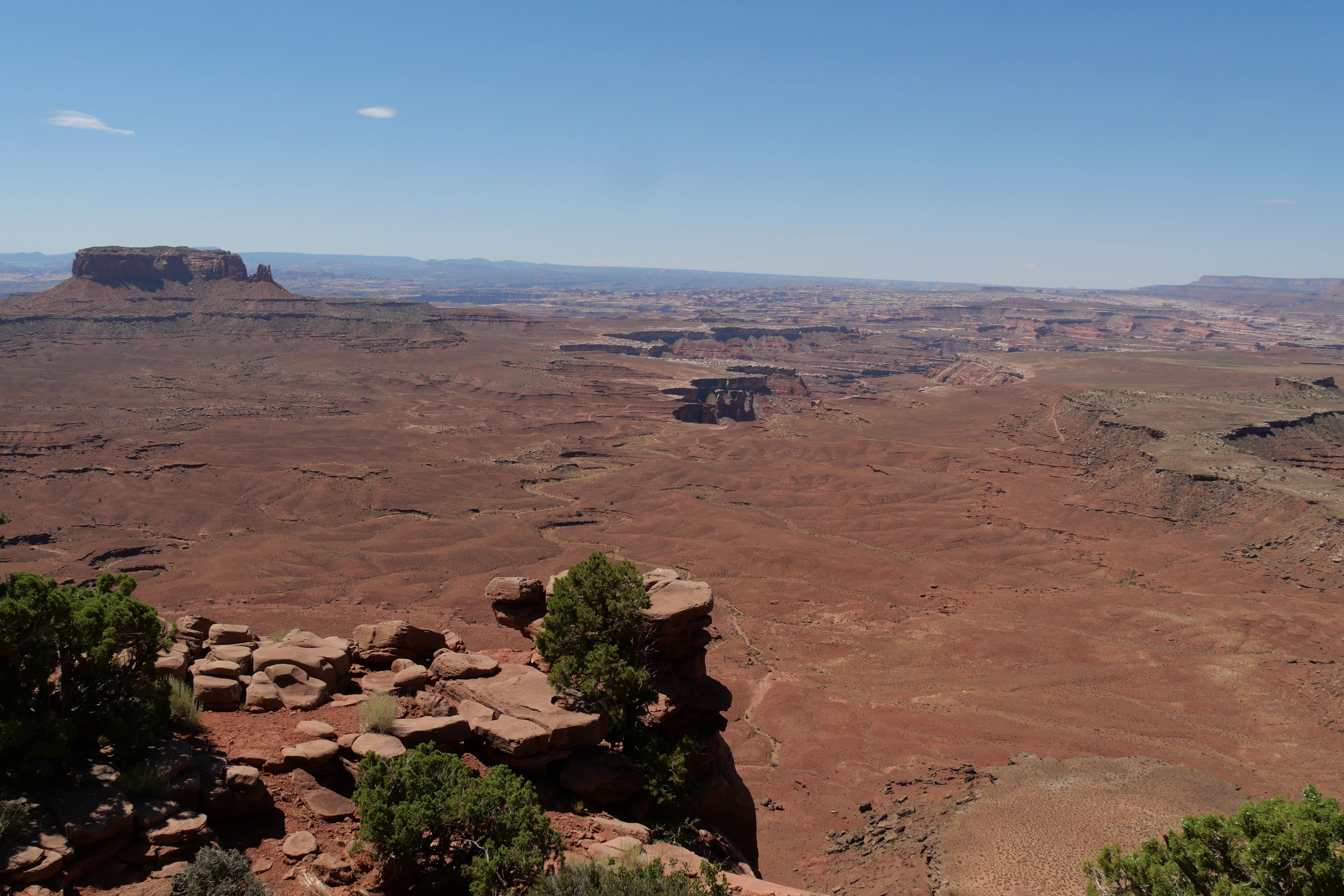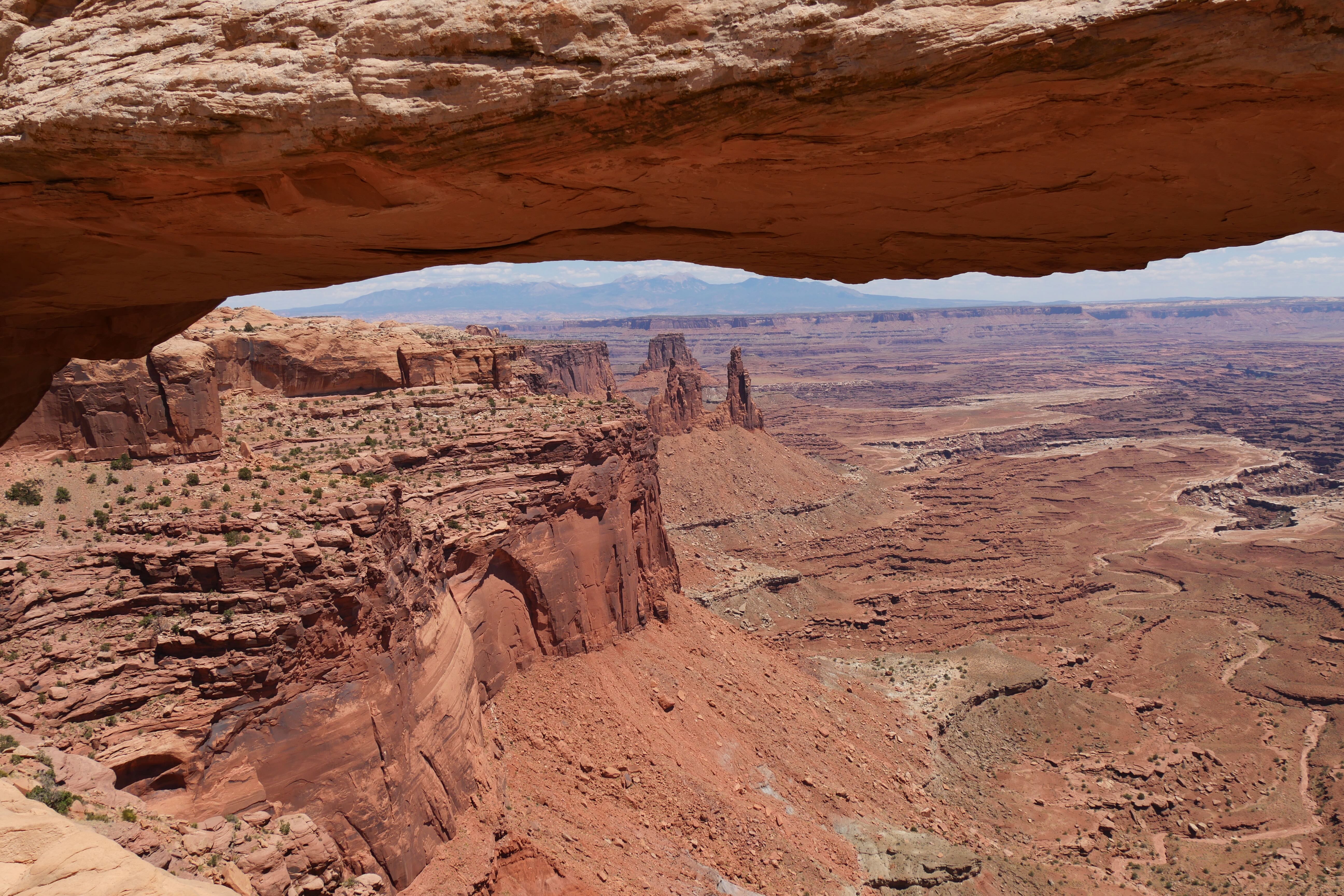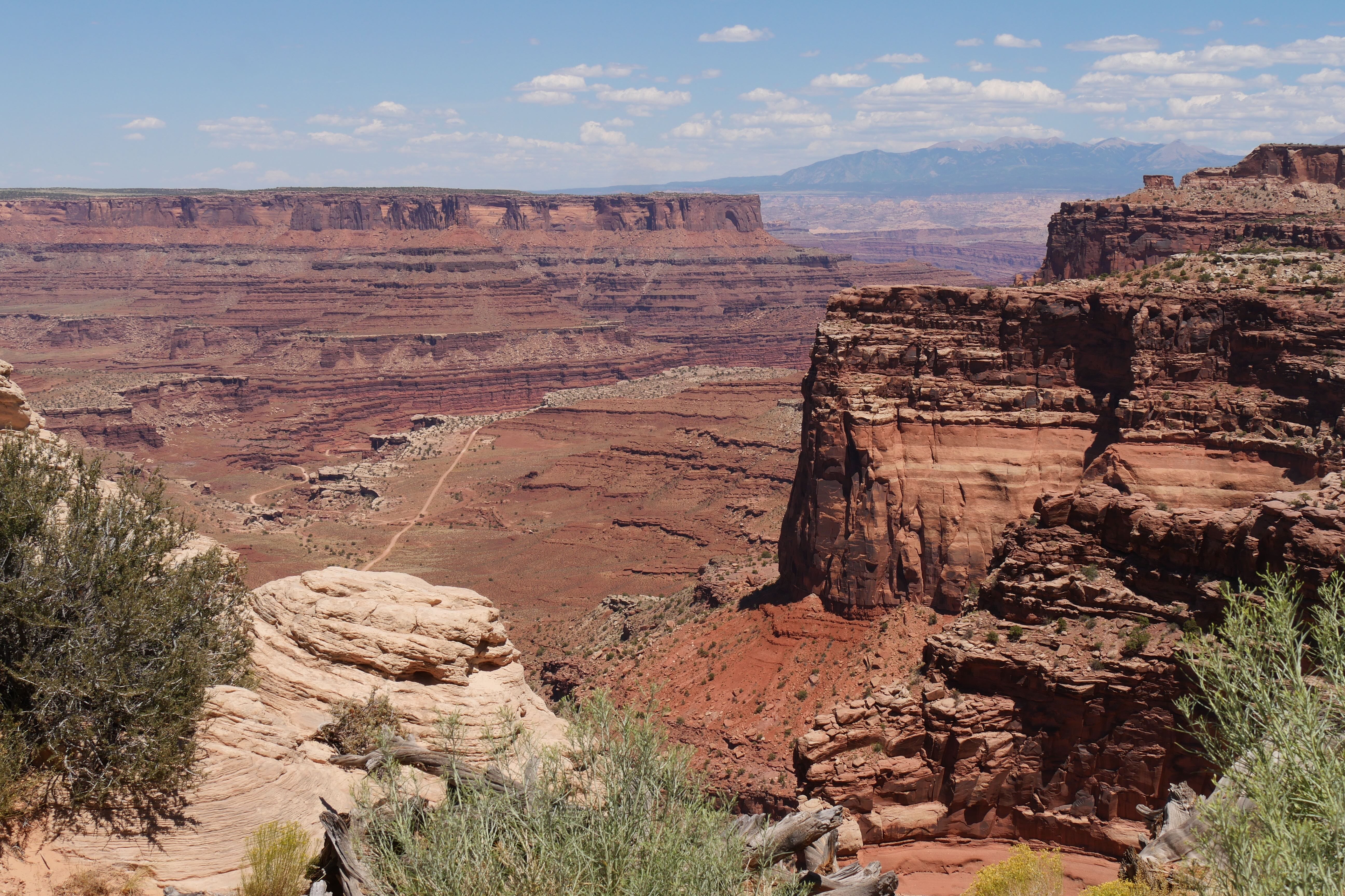 Green River Overlook offre comme son nom l’indique une vue imprenable sur la Green River, arpentant le canyon à cet endroit. Simple d’accès, il n’est pas nécessaire de marcher énormément pour arriver jusqu’au point d’observation et prendre le temps d’y faire quelques clichés. Si cet arrêt n’est pas des plus mémorables, le suivant restera tout de même parmi nos bons souvenirs de ce RoadTrip. Il s’agit de Mesa Arch, car oui, si Canyonlands fait la part belle aux canyons, il offre également l’une des plus belles arches du coin, avec non seulement des dimensions impressionnantes mais également un panorama en arrière-plan à couper le souffle. Le petit trail pour y aller reste abordable, même si un peu escarpé par endroits, et il est possible de faire un aller-retour ou une petite boucle du parking à l’arche. Peu de temps avant de nous arrêter au Visitor Center pour l’achat d’un souvenir, nous aurons fait un courte pause le temps d’un cliché à Shafer Canyon Overlook, offrant une ultime vue plongeante sur le canyon.