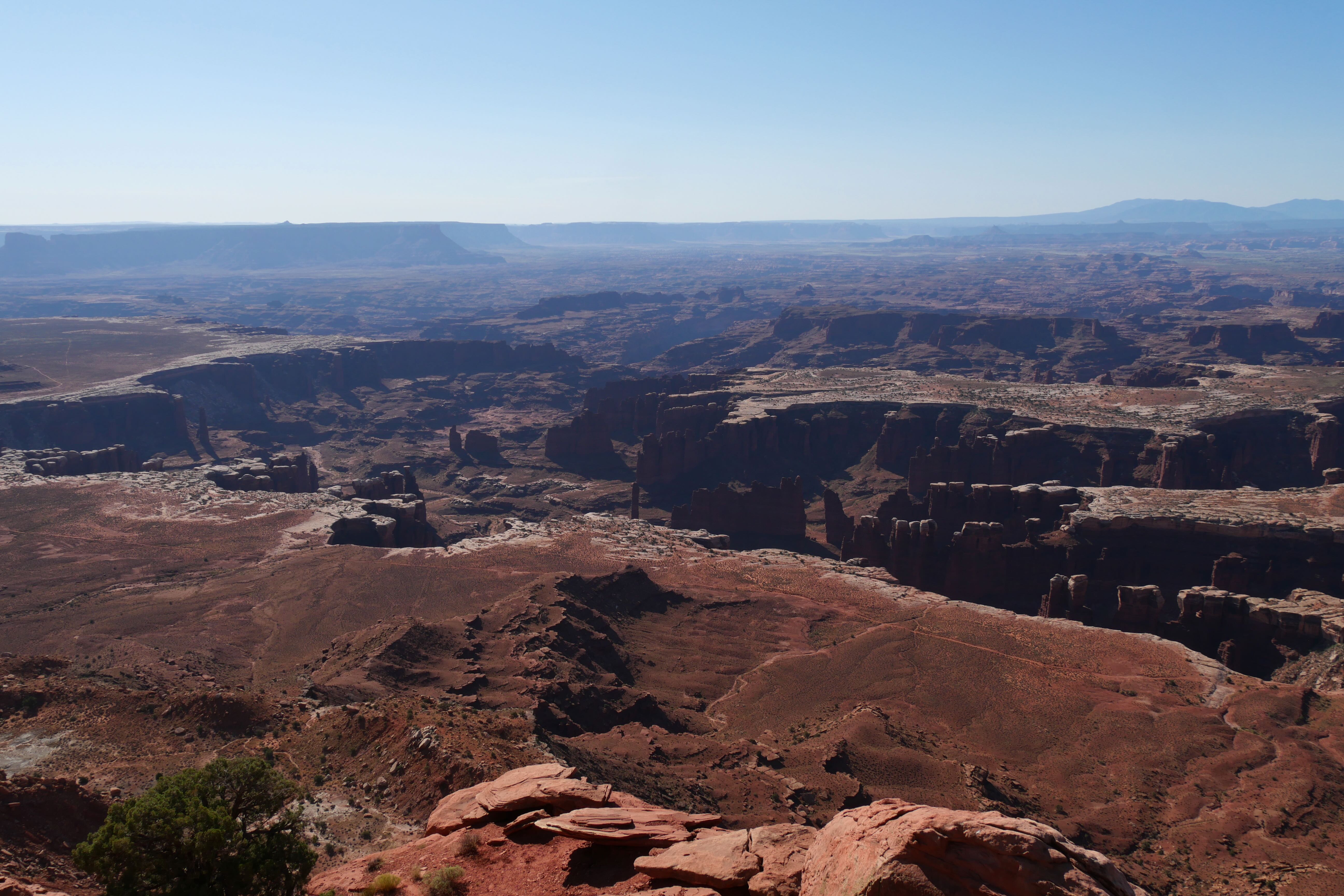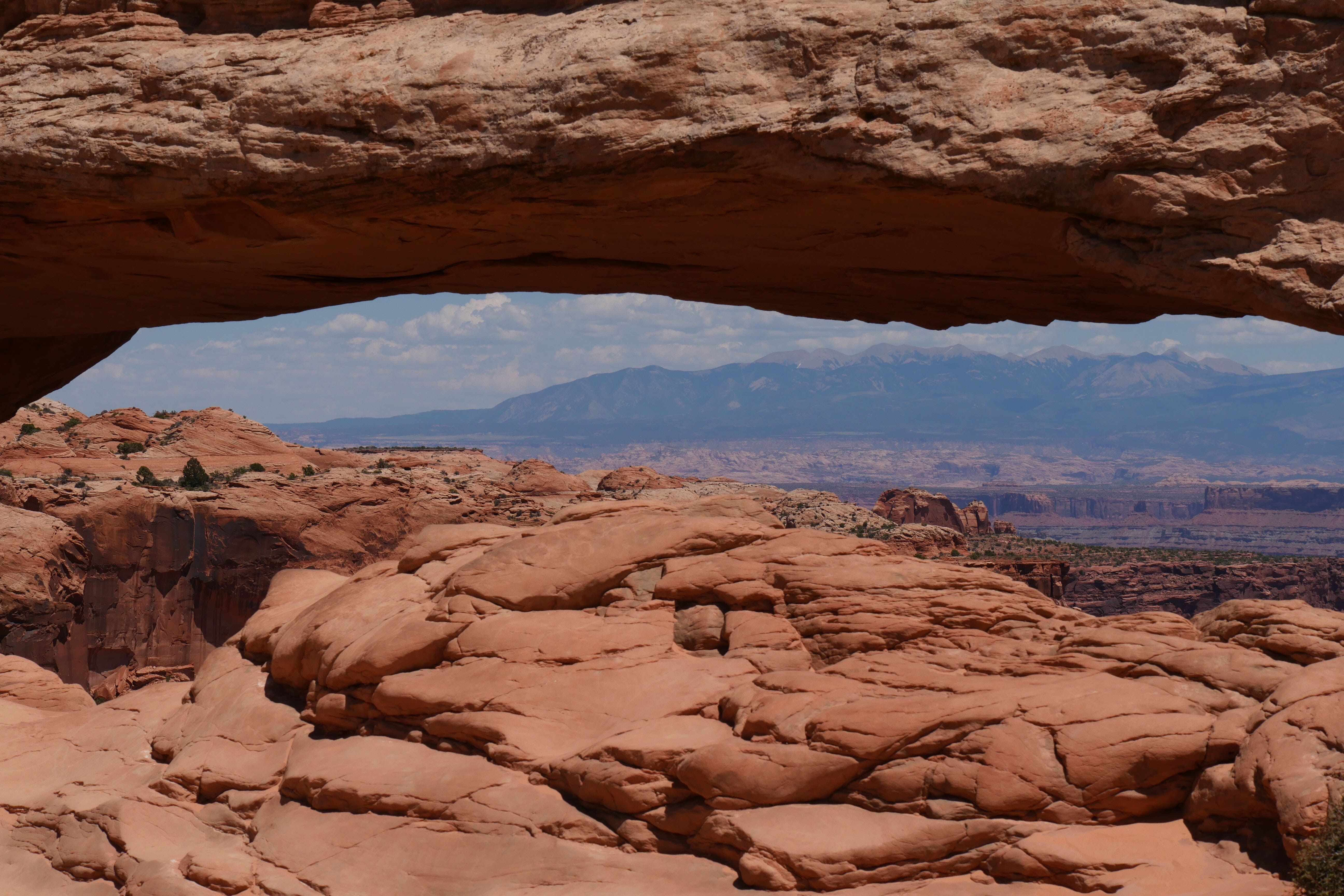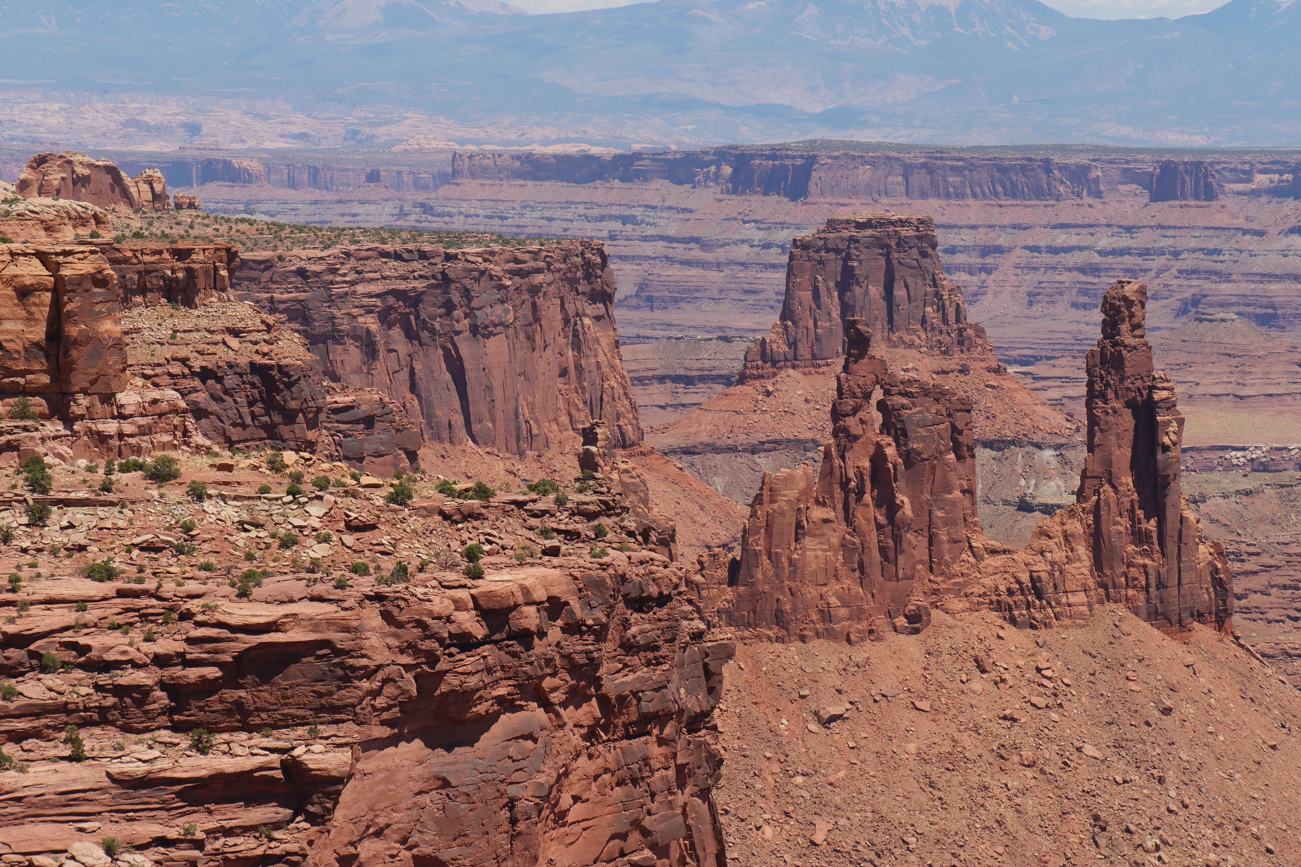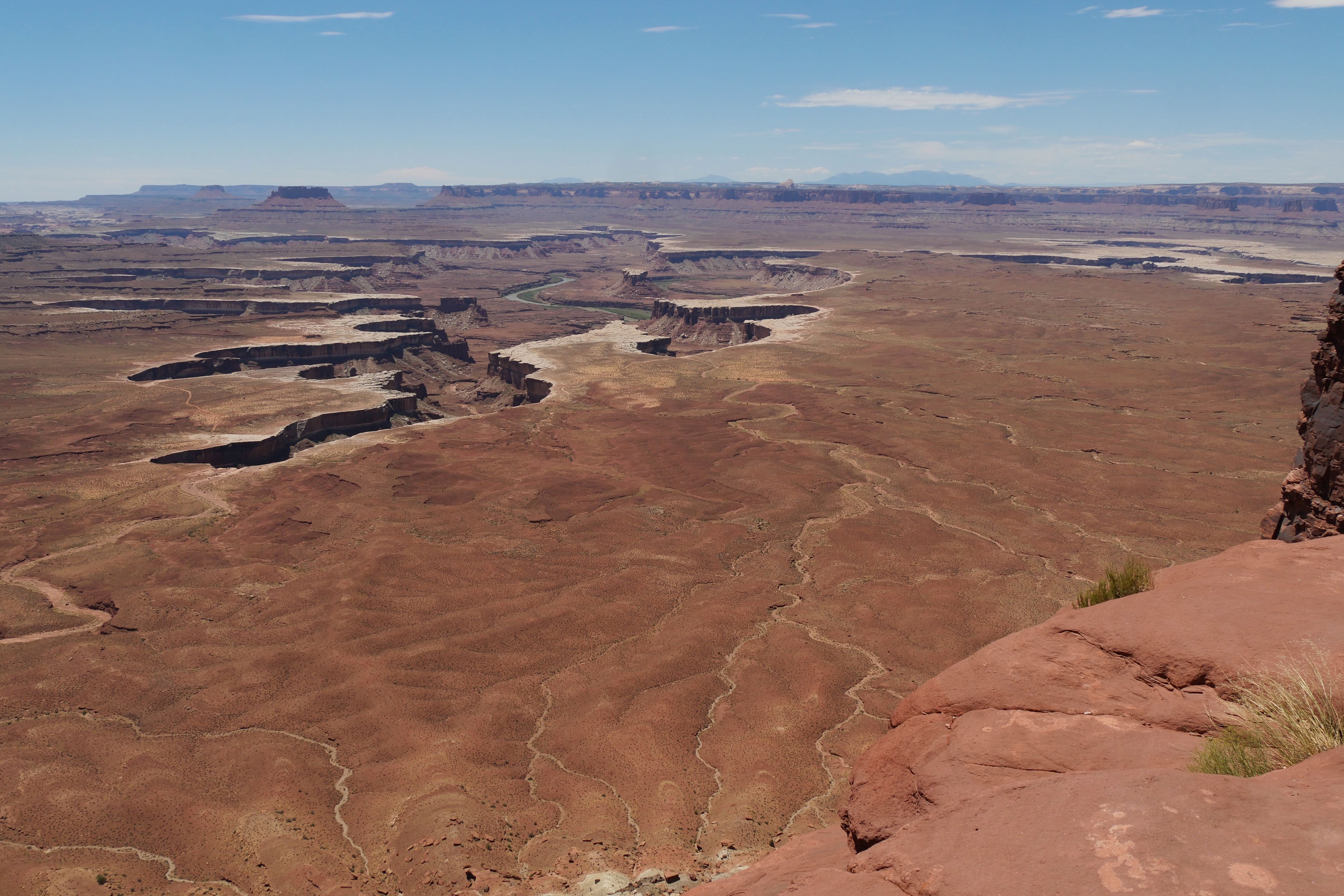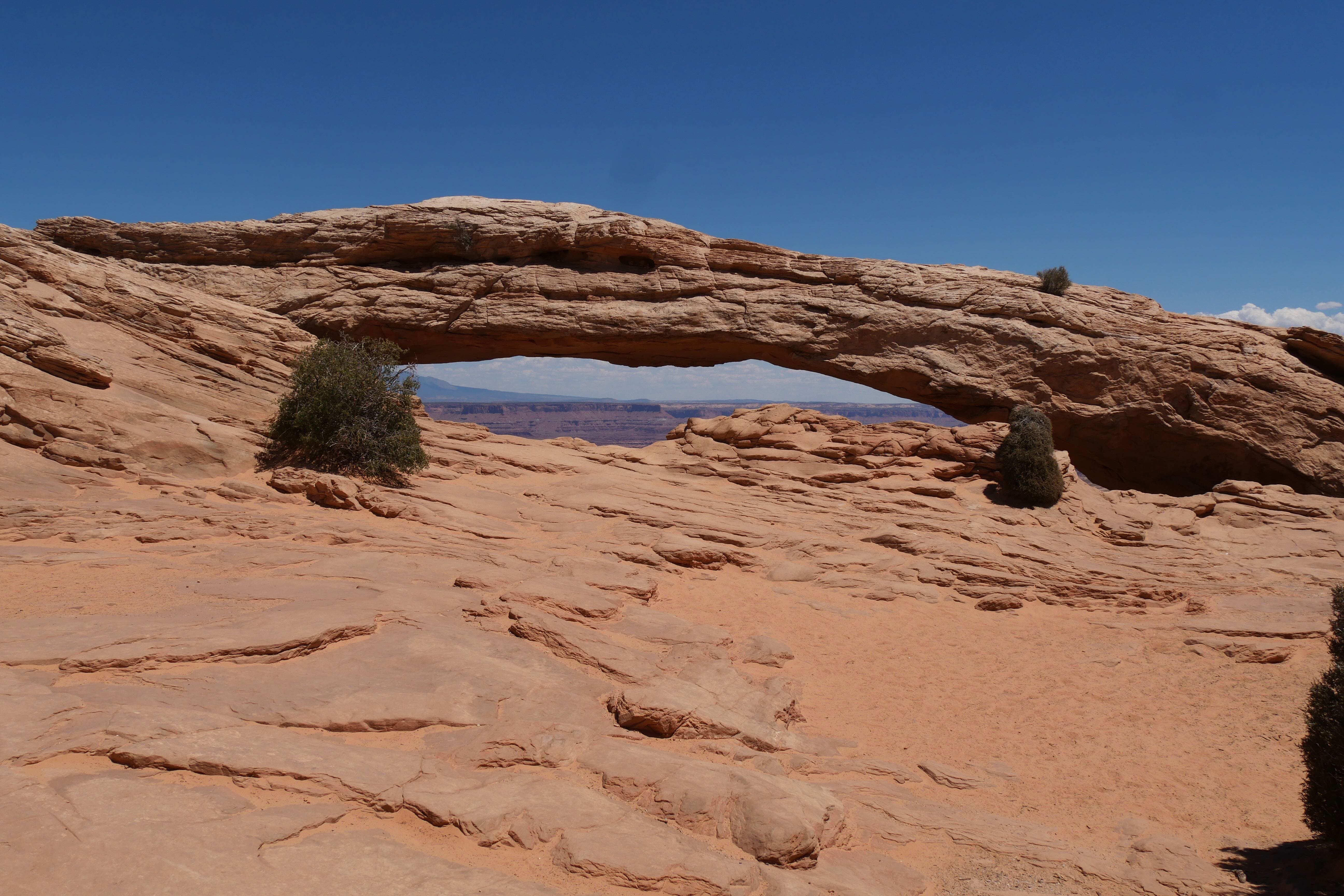 Green River Overlook offre comme son nom l’indique une vue imprenable sur la Green River, arpentant le canyon à cet endroit. Simple d’accès, il n’est pas nécessaire de marcher énormément pour arriver jusqu’au point d’observation et prendre le temps d’y faire quelques clichés. Si cet arrêt n’est pas des plus mémorables, le suivant restera tout de même parmi nos bons souvenirs de ce RoadTrip. Il s’agit de Mesa Arch, car oui, si Canyonlands fait la part belle aux canyons, il offre également l’une des plus belles arches du coin, avec non seulement des dimensions impressionnantes mais également un panorama en arrière-plan à couper le souffle. Le petit trail pour y aller reste abordable, même si un peu escarpé par endroits, et il est possible de faire un aller-retour ou une petite boucle du parking à l’arche. Peu de temps avant de nous arrêter au Visitor Center pour l’achat d’un souvenir, nous aurons fait un courte pause le temps d’un cliché à Shafer Canyon Overlook, offrant une ultime vue plongeante sur le canyon.