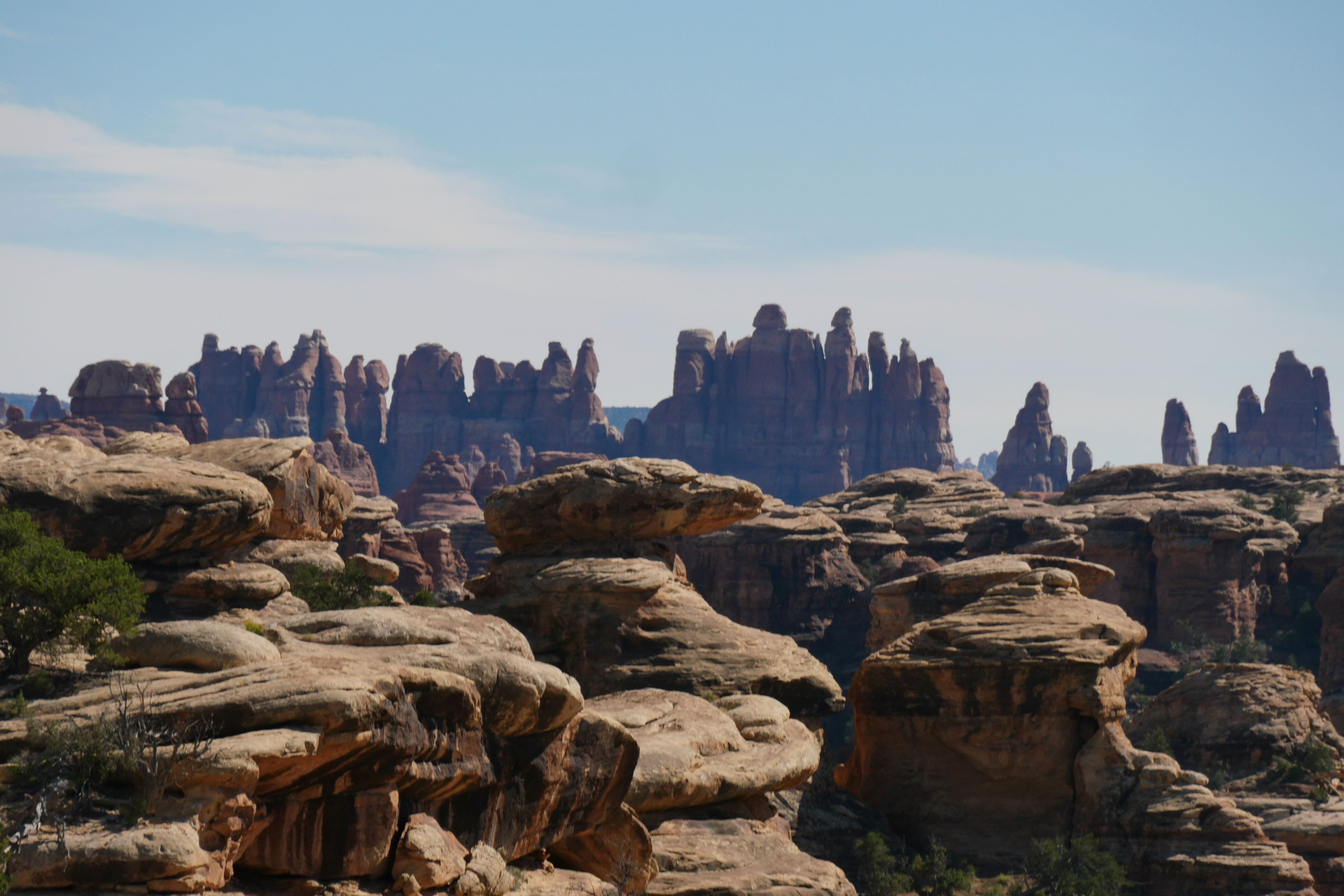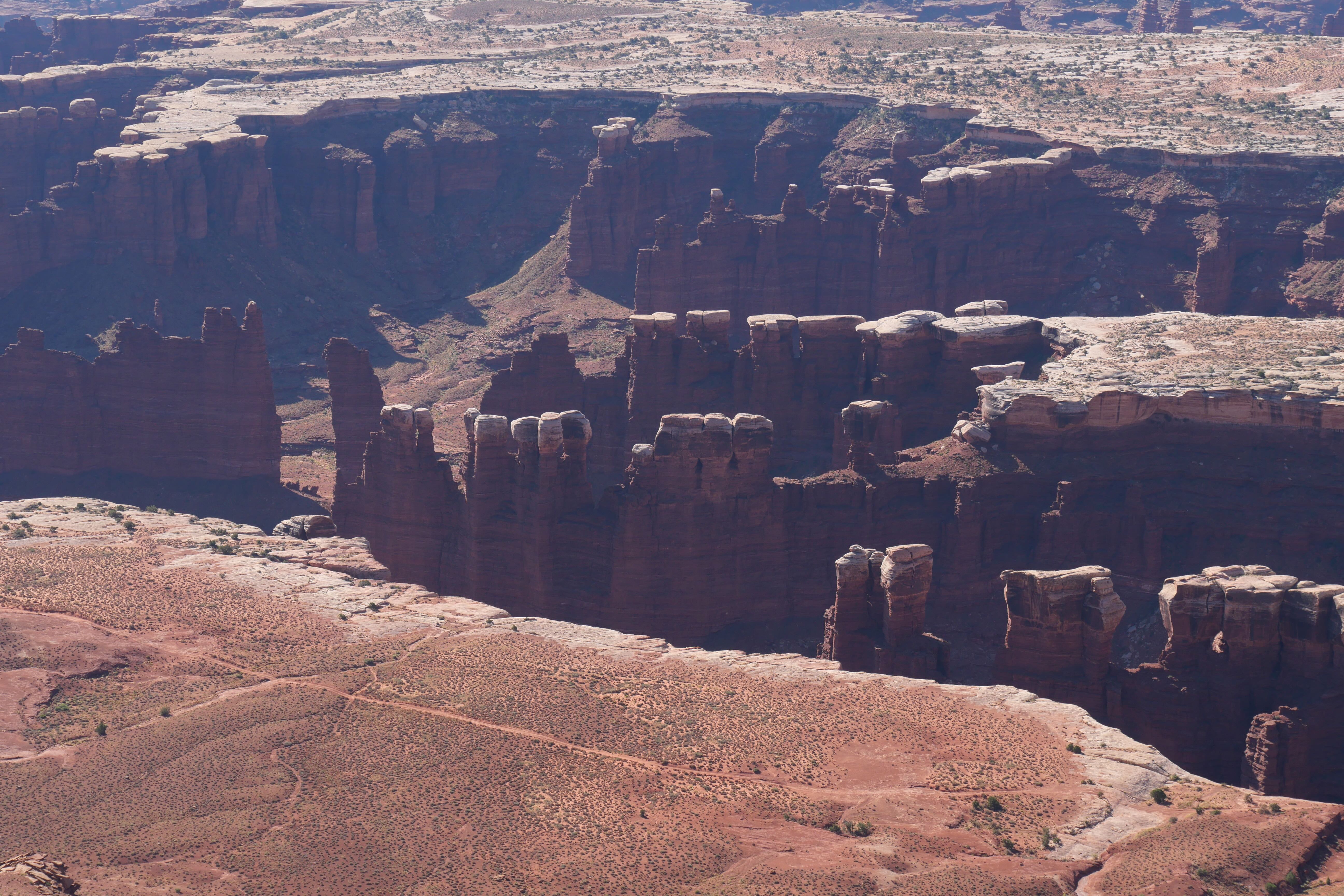 Ce parc a la particularité de se diviser en deux parties, dont les entrées sont distinctes et éloignées de plusieurs dizaines de miles. La plus connue et visitée reste la partie Nord, nommée Island in the Sky, où les principaux paysages sont des canyons, accessibles soit via des trails, soit même via des routes/pistes sillonnant le parc sur des dizaines de kilomètres également. Nous avons pas mal hésité à tenter l’expérience sur ne serait-ce que quelques miles, notre pick-up nous rassurant pas mal sur nos capacités en tout terrain abordable, mais le manque de temps nous a poussé à ne faire que quelques randonnées, pas toujours simples à cause de la chaleur. L’autre partie du parc s’appelle le Needles District, les Needles (aiguilles en français) étant en fait des formations rocheuses très fines, souvent répétées les unes à côté des autres. Elle se situe bien plus au Sud, est moins fréquentée car plus loin des axes principaux, mais regorge de trails dignes d’être parcourus par ceux qui s’en donnent les moyens et prennent leur journée sur place. Nous ne ferons qu’y passer pour nous en faire un avis que nous vous partagerons ci-dessous.