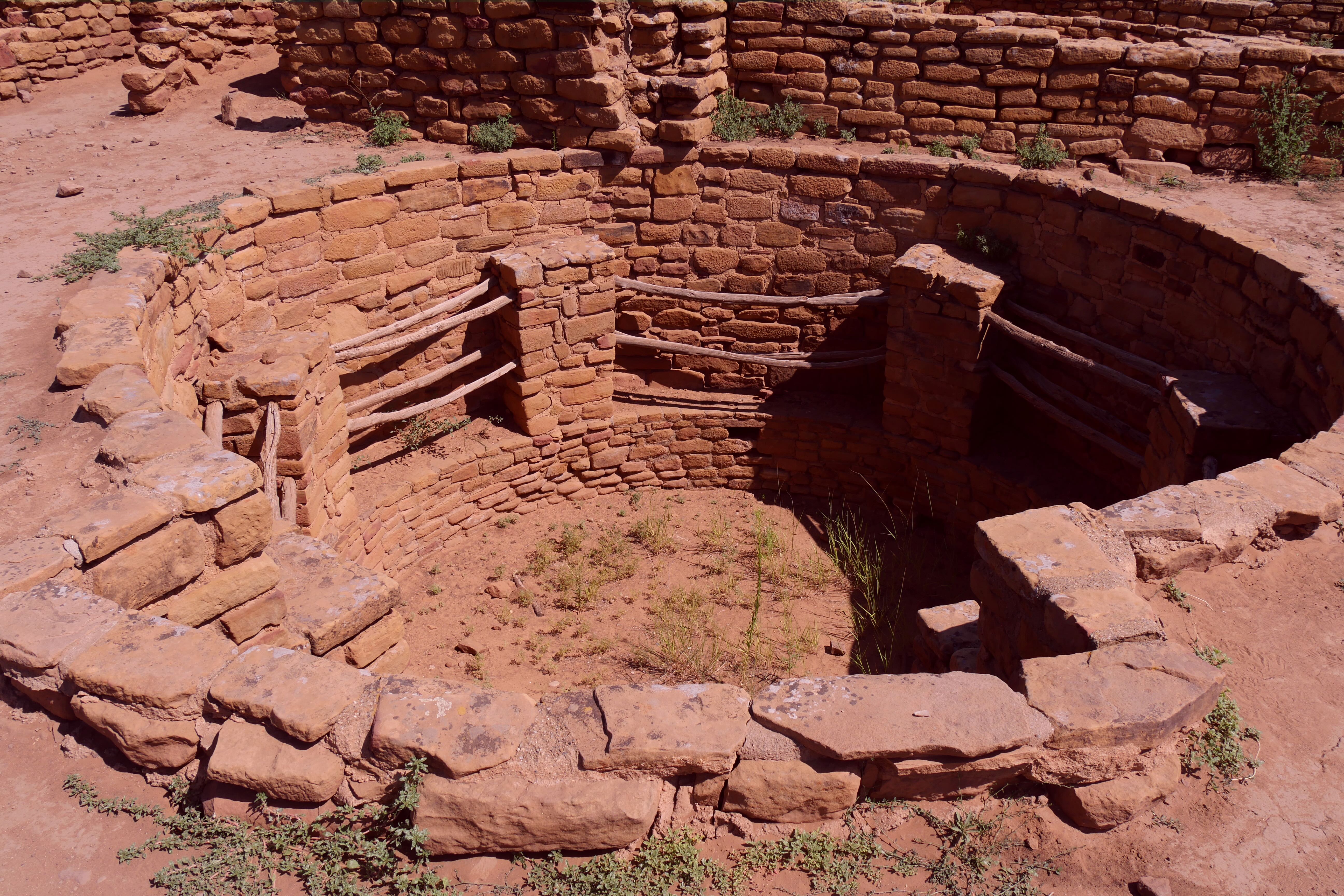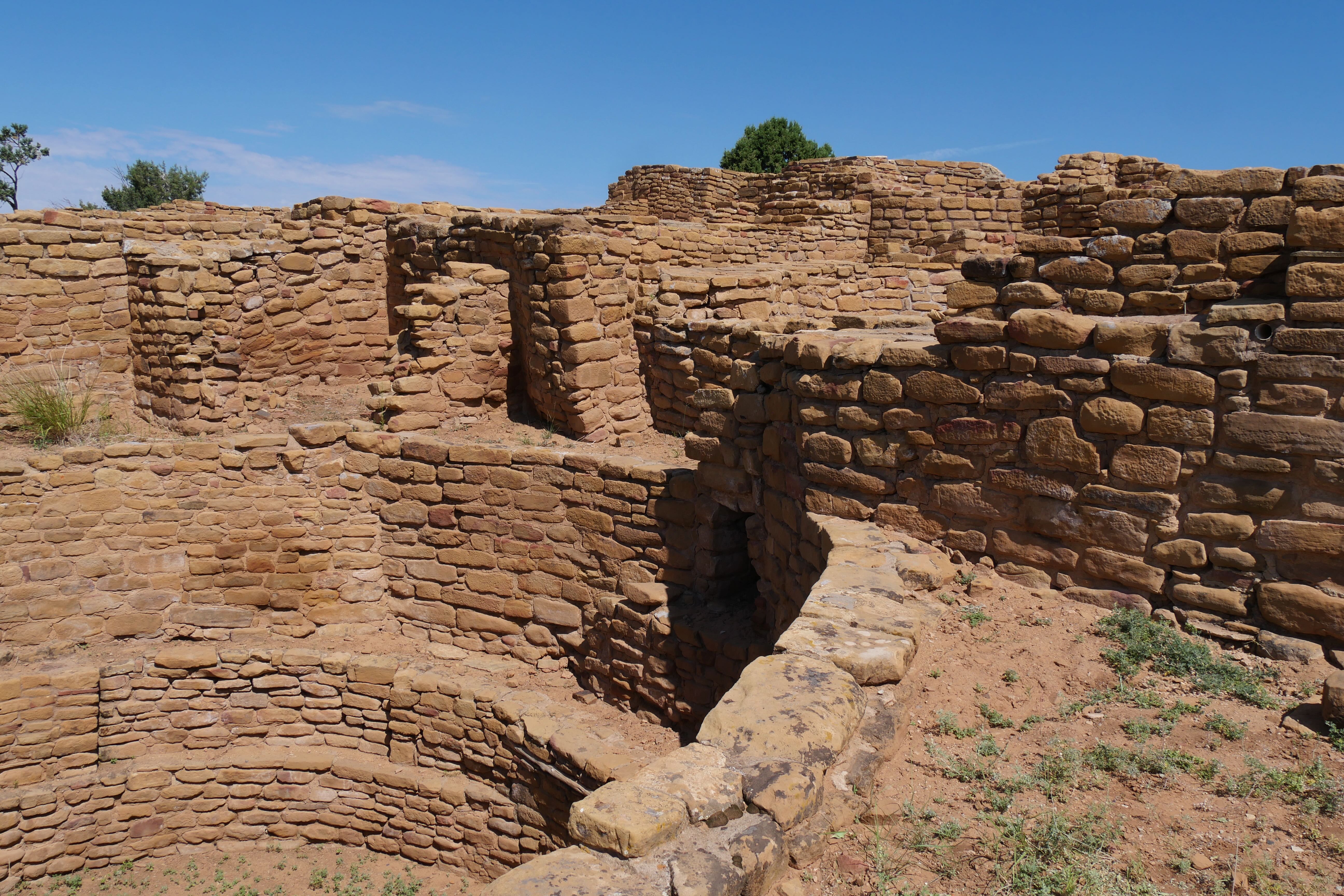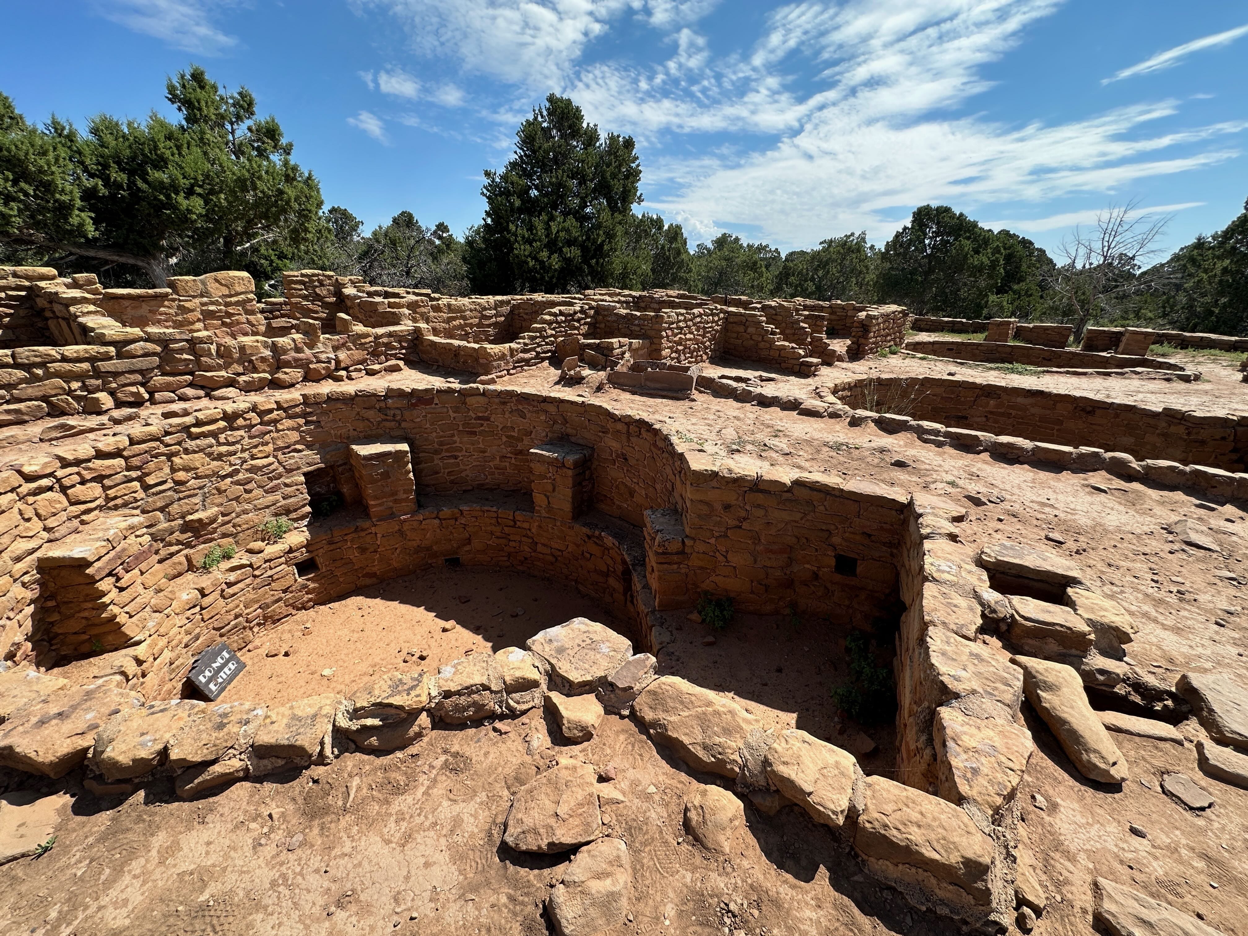 Pour visiter ce parc, c’est par le Nord qu’on y accède et il s’agit d’ailleurs de l’unique entrée. La route offre de nombreux arrêts pour des points de vue sur la vallée en contrebas. Nous nous arrêterons à Mancos Valley Overlook, puis à Park Point Overlook sur la Mesa Top Ruins Road. Un peu plus au sud, la route se sépare et propose deux itinéraires. Un plus à l’Ouest, Wetherill Mesa, accessible uniquement en été et permettant de visiter le site de Long House, sur réservation et accompagné d’un ranger. Ne pouvant pas nous permettre de nous rendre dans les deux parties du parc (n’étant pas reliées), nous choisirons de prendre l’itinéraire plus à l’Est, celui de Chapin Mesa. Peu après l’embranchement de ces deux routes, se trouve Far View sites. C’est là que nous ferons notre première vraie visite dans le parc. Les places de parking sont très limitées et il n’y a que peu d’ombre. Il faudra peut-être parfois patienter pour pouvoir stationner et ensuite profiter d’une balade d’une trentaine de minutes au milieu de différents sites archéologiques. Bien qu’aujourd’hui ce ne soit plus un des sites majeurs de Mesa Verde, il le fut pendant une période de plus de 400 ans. Les Anasazi y vivaient dans une cinquantaine de maisons de pierres construites autour de kivas : des petites pièces rondes et enterrées qui servaient entre autres pour des rituels religieux, des réunions ou encore pour du stockage.