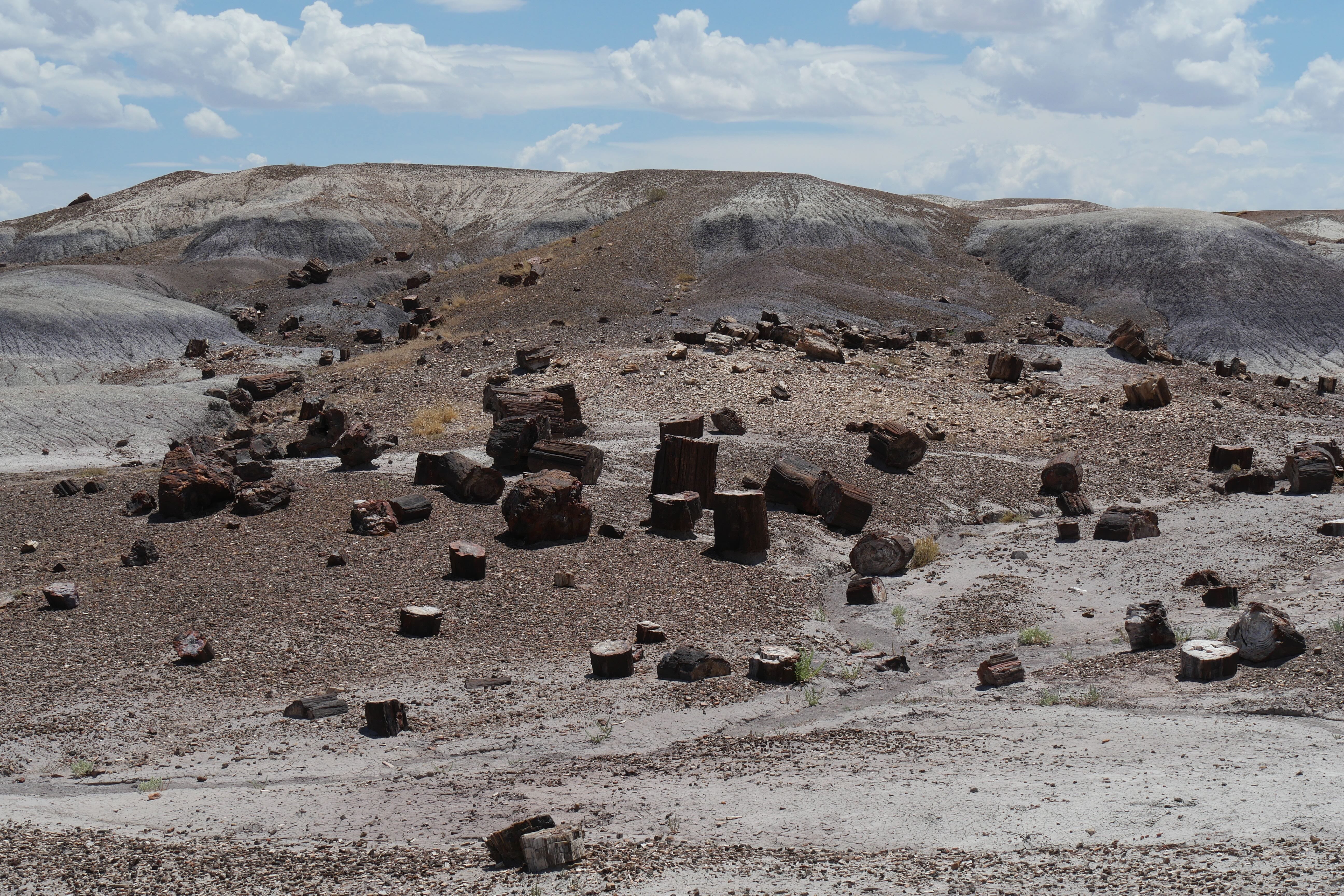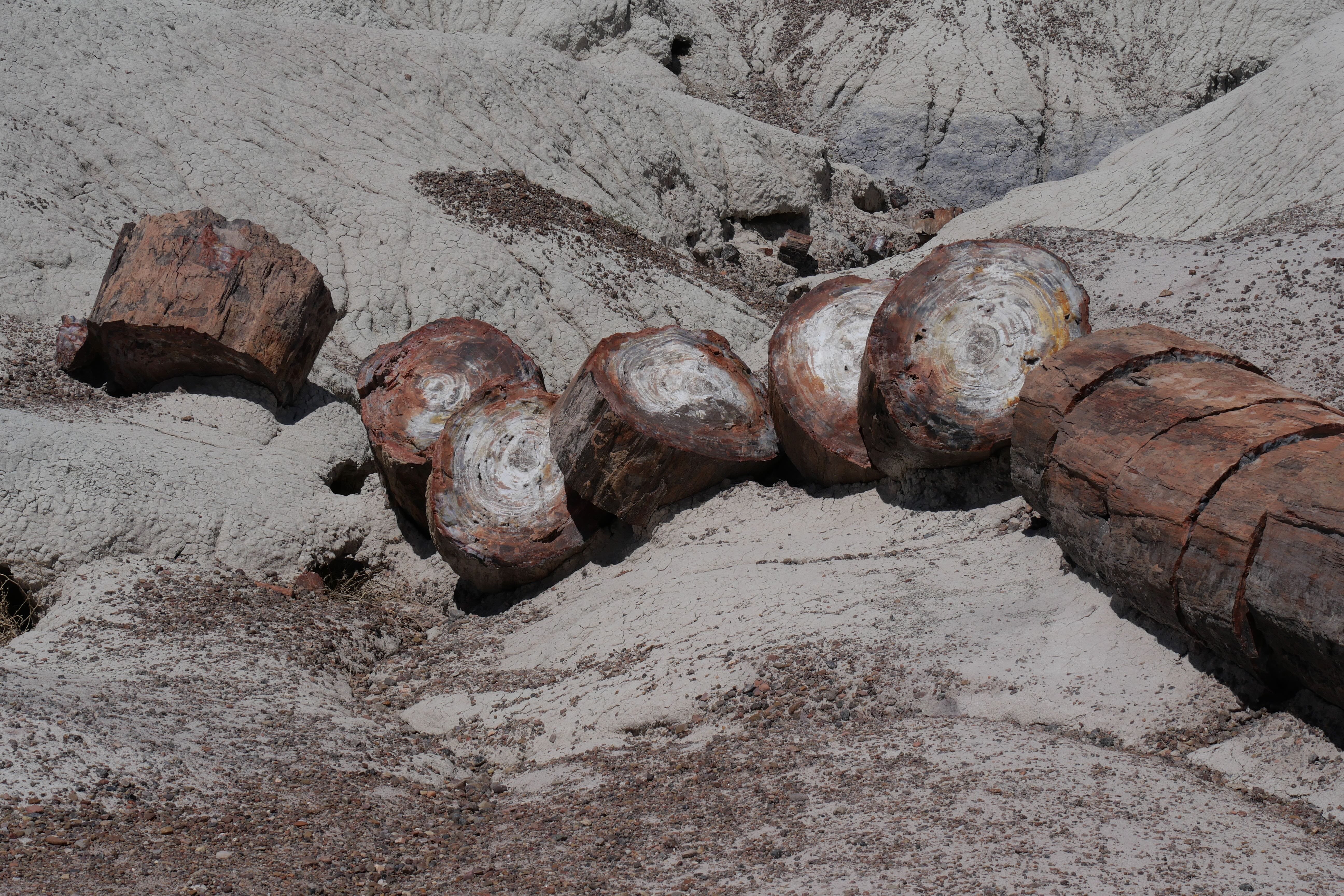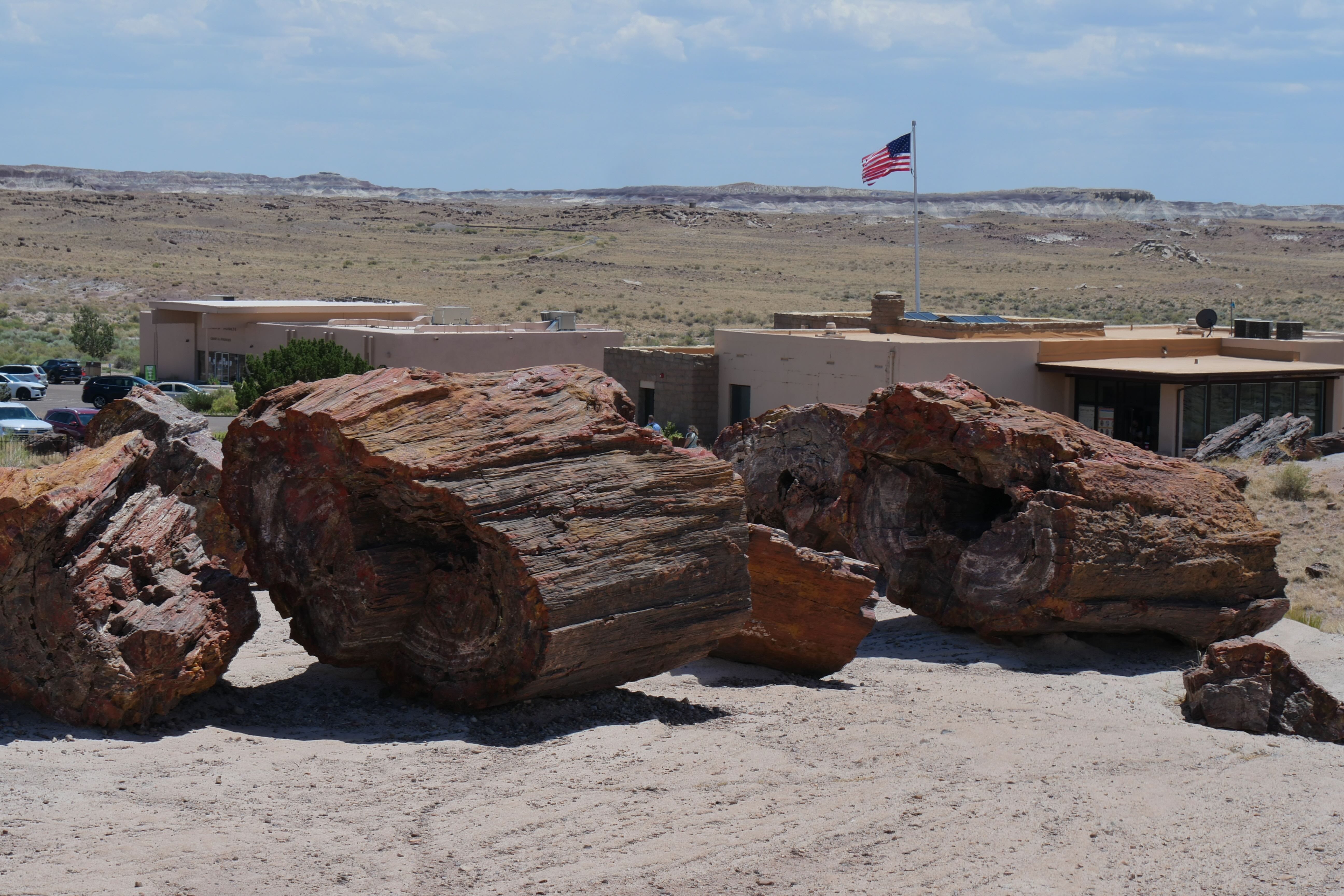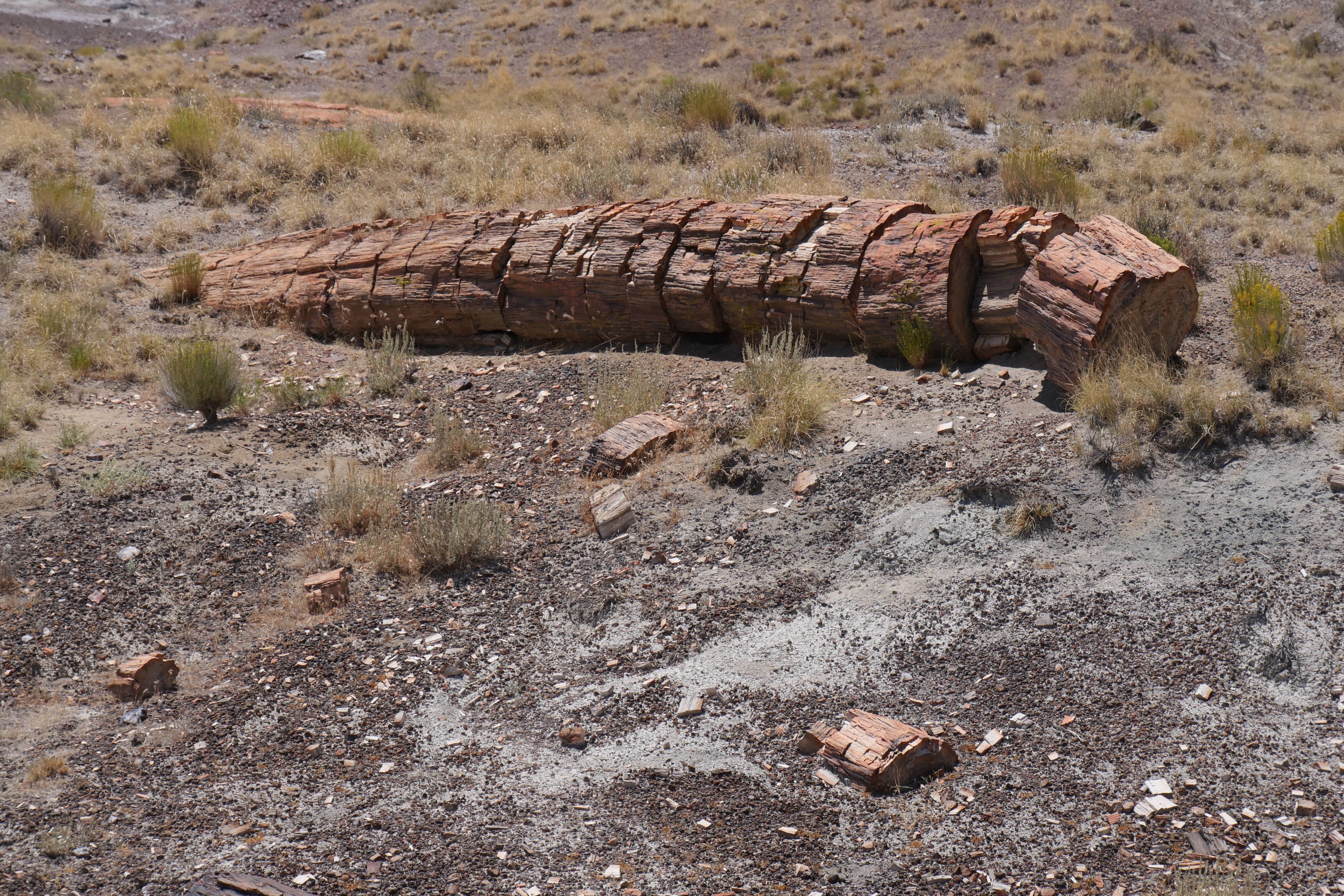 Nous ferons ensuite deux autres courtes randonnées : Crystal Forest Trail et Giant Logs Trails qui comme leurs noms l’indiquent sont pour l’une, une forte concentration de troncs pétrifiés brillant tels des cristaux; et pour l’autre d’immenses troncs pétrifiés. La chaleur, associée à la fatigue de ce début de troisième semaine, et la nuit difficile que nous avions passée, nous aurons convaincu de nous arrêter là. On aura en tout cas apprécié que plus notre découverte avançait, plus les arbres pétrifiés étaient impressionnants, ne nous donnant pas l’impression d’avoir vu le meilleur au début du parc, et nous poussant ainsi vers le point suivant.