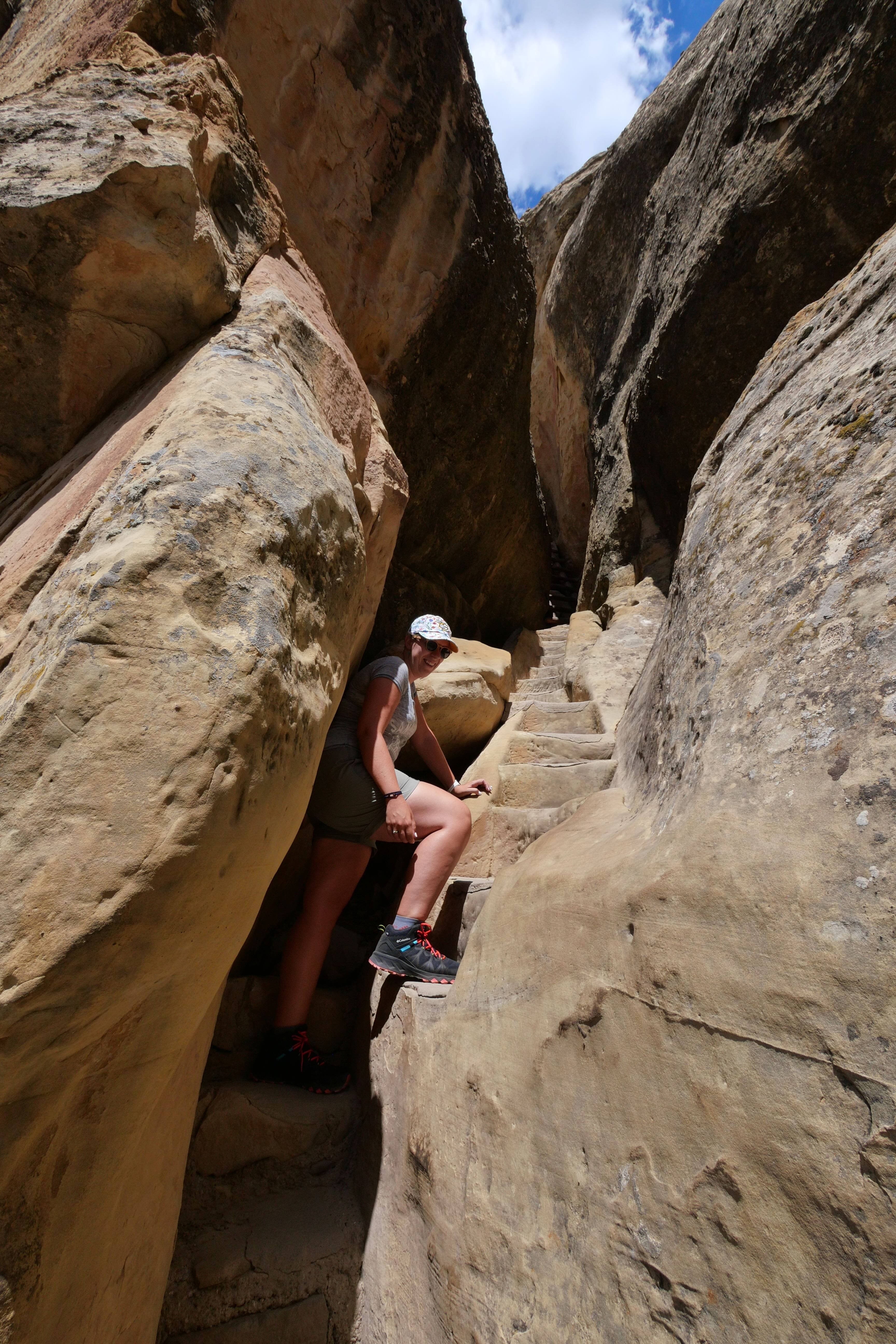 Un tour sur la Mesa Top Loop Road permet d’avoir un premier aperçu de Cliff Palace depuis le Cliff Palace Overlook et d’autres arrêts le long de la route. C’est ce complexe que nous avions choisi de visiter car, d’après les informations glanées sur Roadtrippin, c’était la moins exigeante physiquement comparé à Balcony House. Normalement, d’après ce que nous en avions compris, la visite n’est pas vraiment guidée mais plutôt accompagnée par un ranger qui doit s’assurer que le site ne sera pas détérioré, se postant pour cela à l’entrée du site pendant qu’un autre se trouve à la sortie. Cependant, à l’horaire que nous avions choisi (13h45), un changement de service était en cours. Cela nous a permis d’avoir une ranger prenant le temps de nous donner beaucoup d’informations sur ce que nous pouvions observer autour de nous, faisant ainsi deux-trois petits arrêts pour compléter ses informations avant que nous devions ressortir en grimpant à des échelles de bois. Nous apprendrons notamment que le choix des Pueblos, de construire leurs habitations dans les falaises, était basé sur plusieurs raisons. Premièrement, se protéger des animaux sauvages bien sûr, mais aussi des éléments, tels que la pluie, le soleil ou le froid en hiver. Ces maisons particulières permettaient de rester relativement au sec et à une température correcte peu importe la météo extérieure. Cela était essentiel également pour le stockage de leurs réserves de nourriture, ces peuples étant de grands agriculteurs.