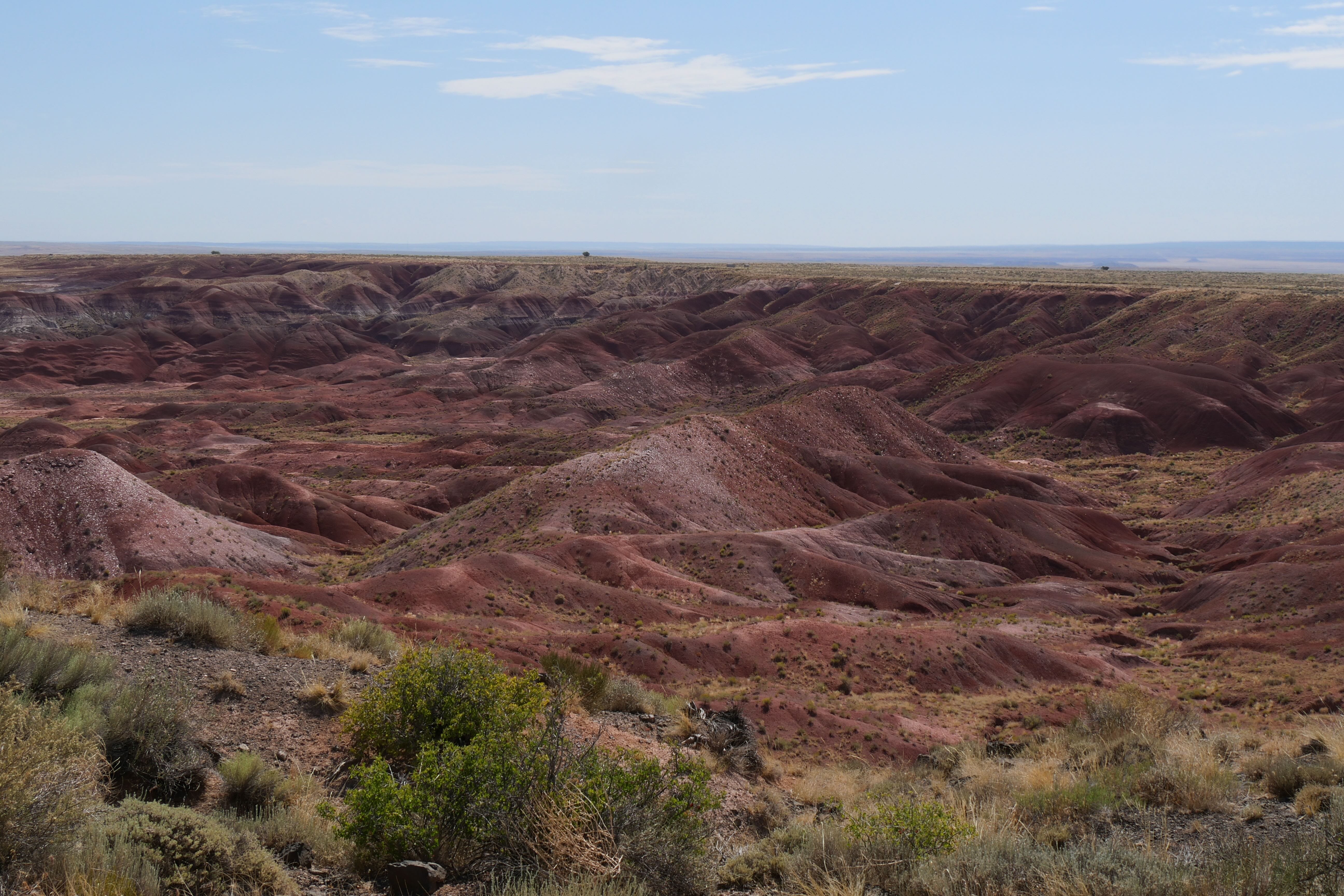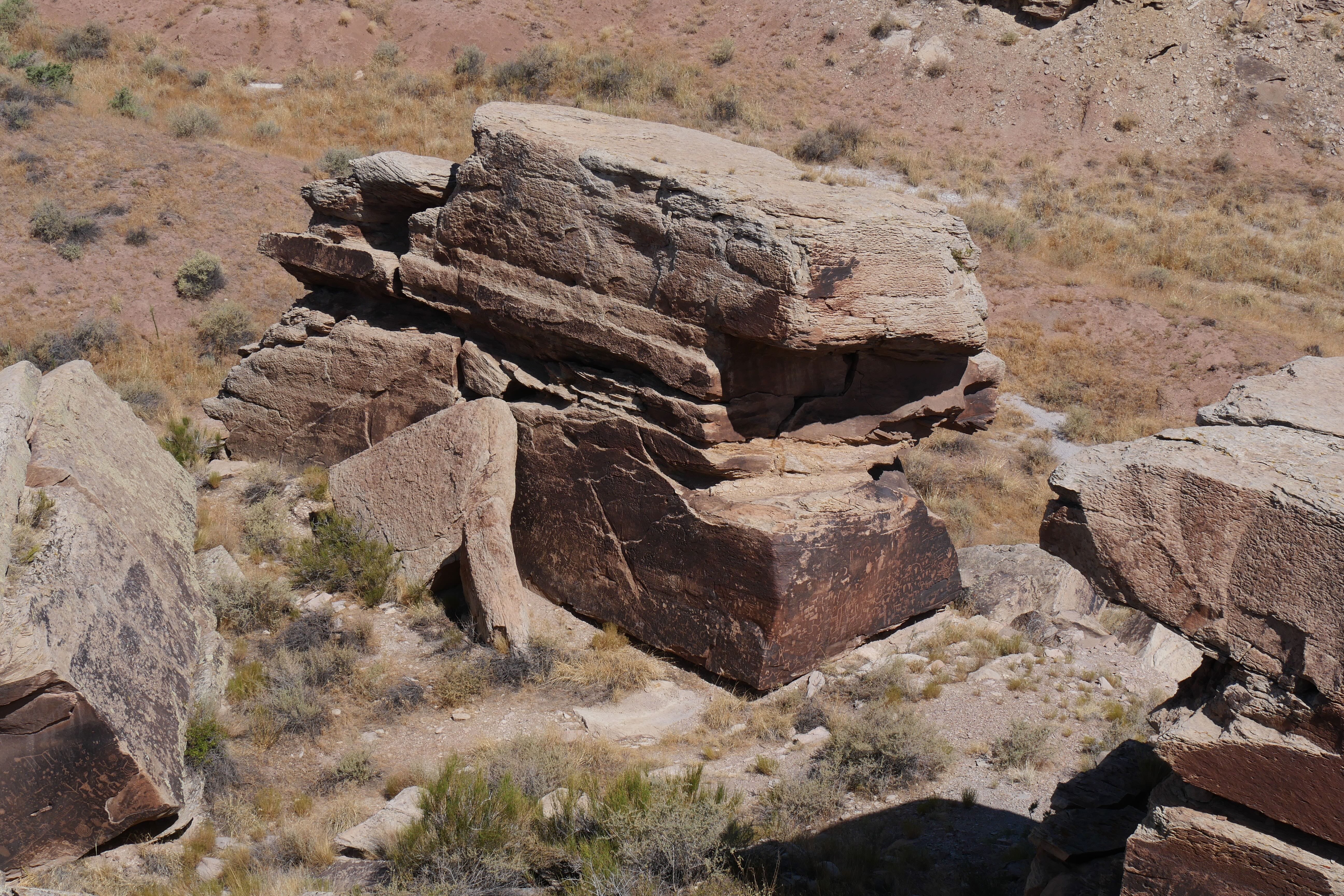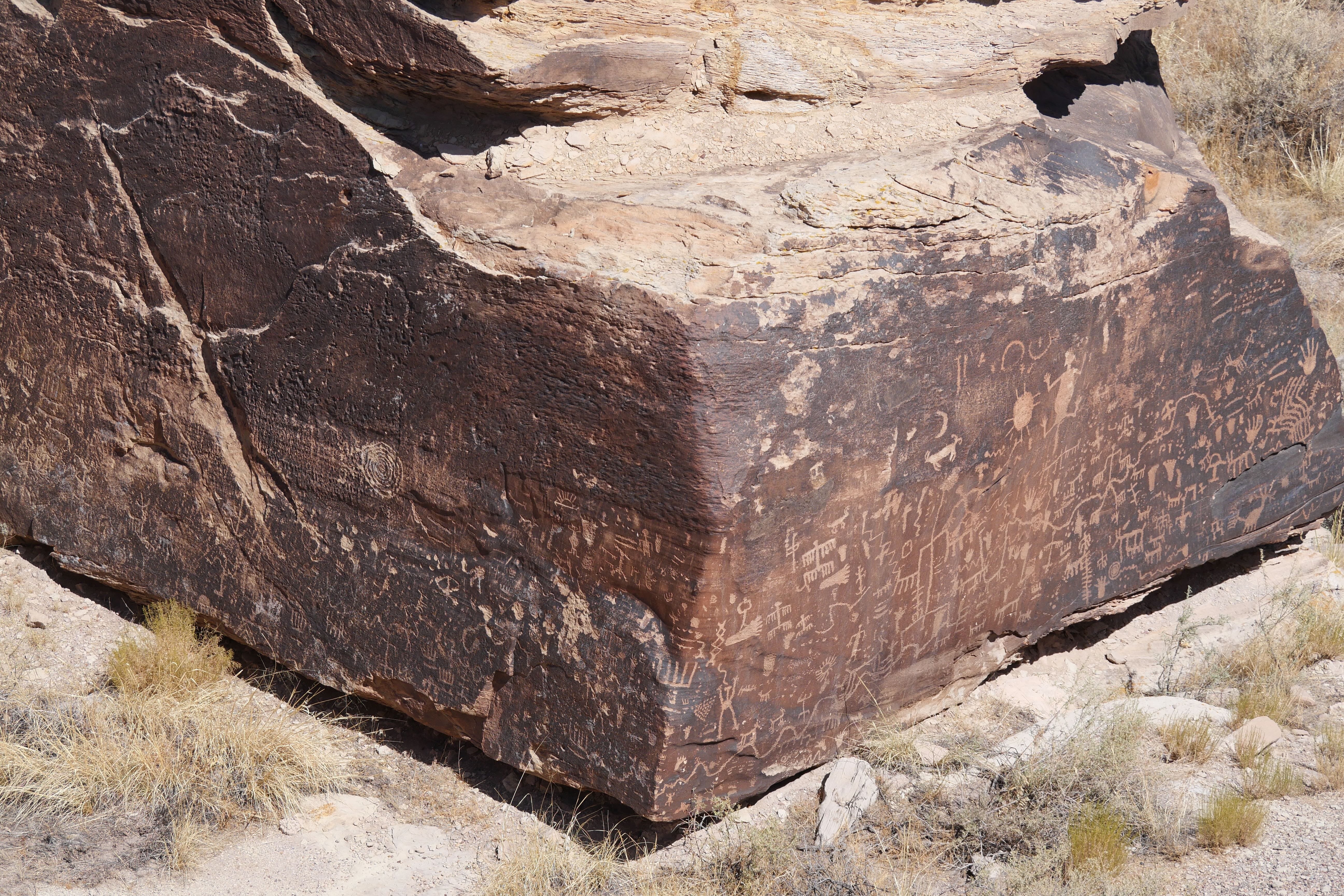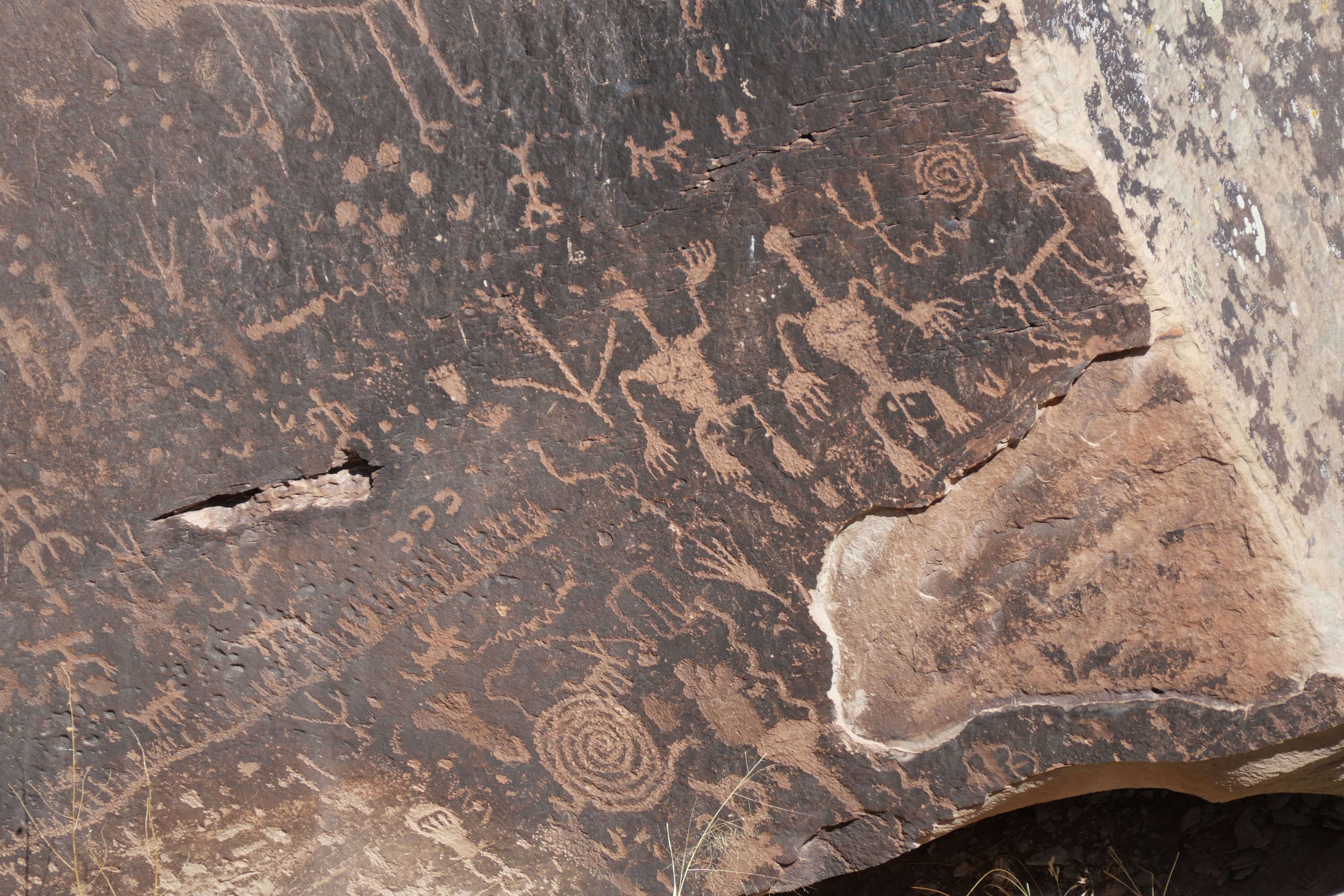 Nous nous lancerons ensuite à l’assaut de Petrified Forest NP avec pour commencer, Newspaper Rock. Ce n’est ni un journal, ni une seule pierre comme son nom semble l’indiquer. Il n’est pas possible de s’en approcher de très près mais seulement de voir ce site depuis une plateforme en hauteur. Il s’agit en fait de plusieurs rochers couverts de pétroglyphes gravés par les Pueblos ancestraux qui ont vécu à cet endroit il y a plusieurs centaines d’années.