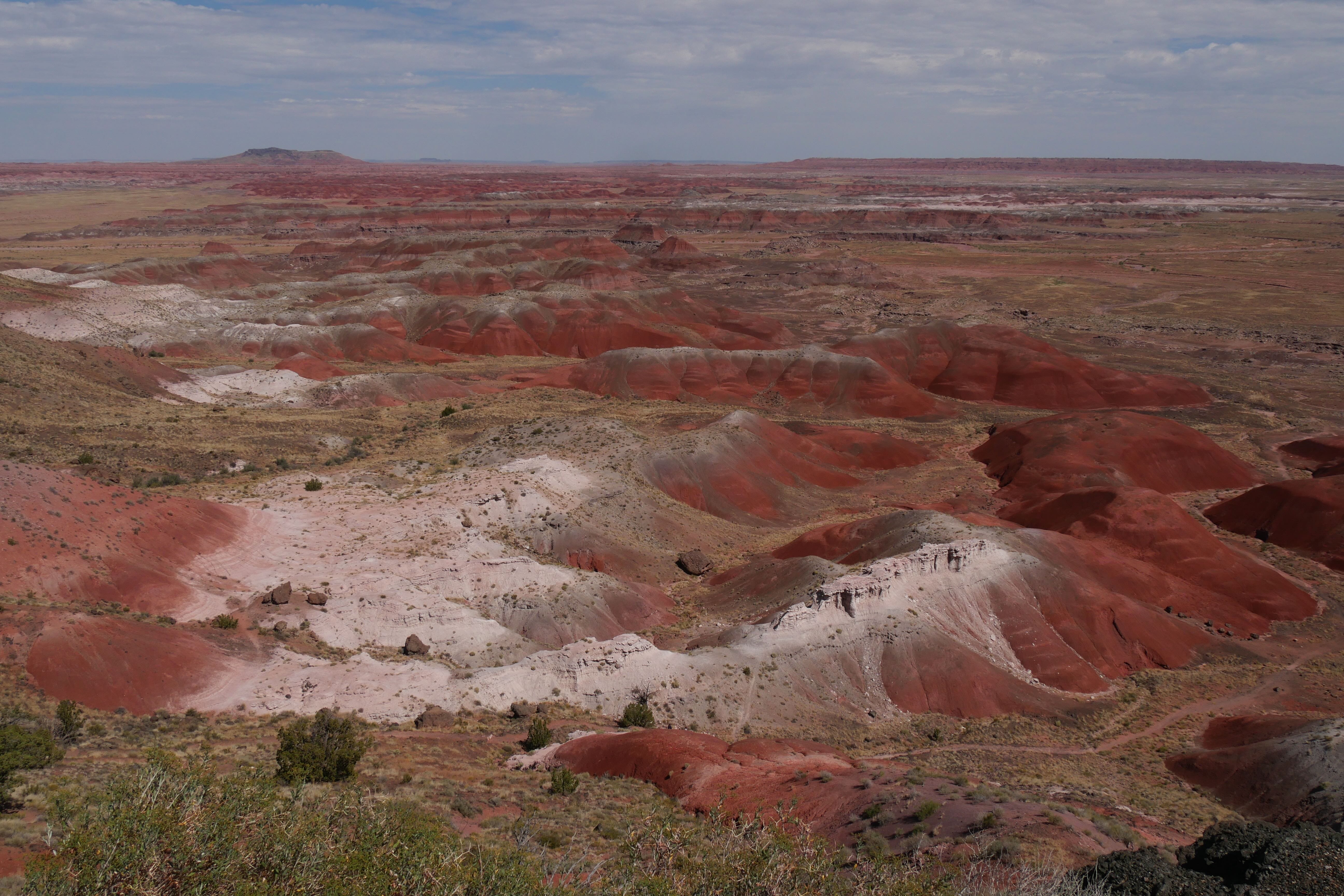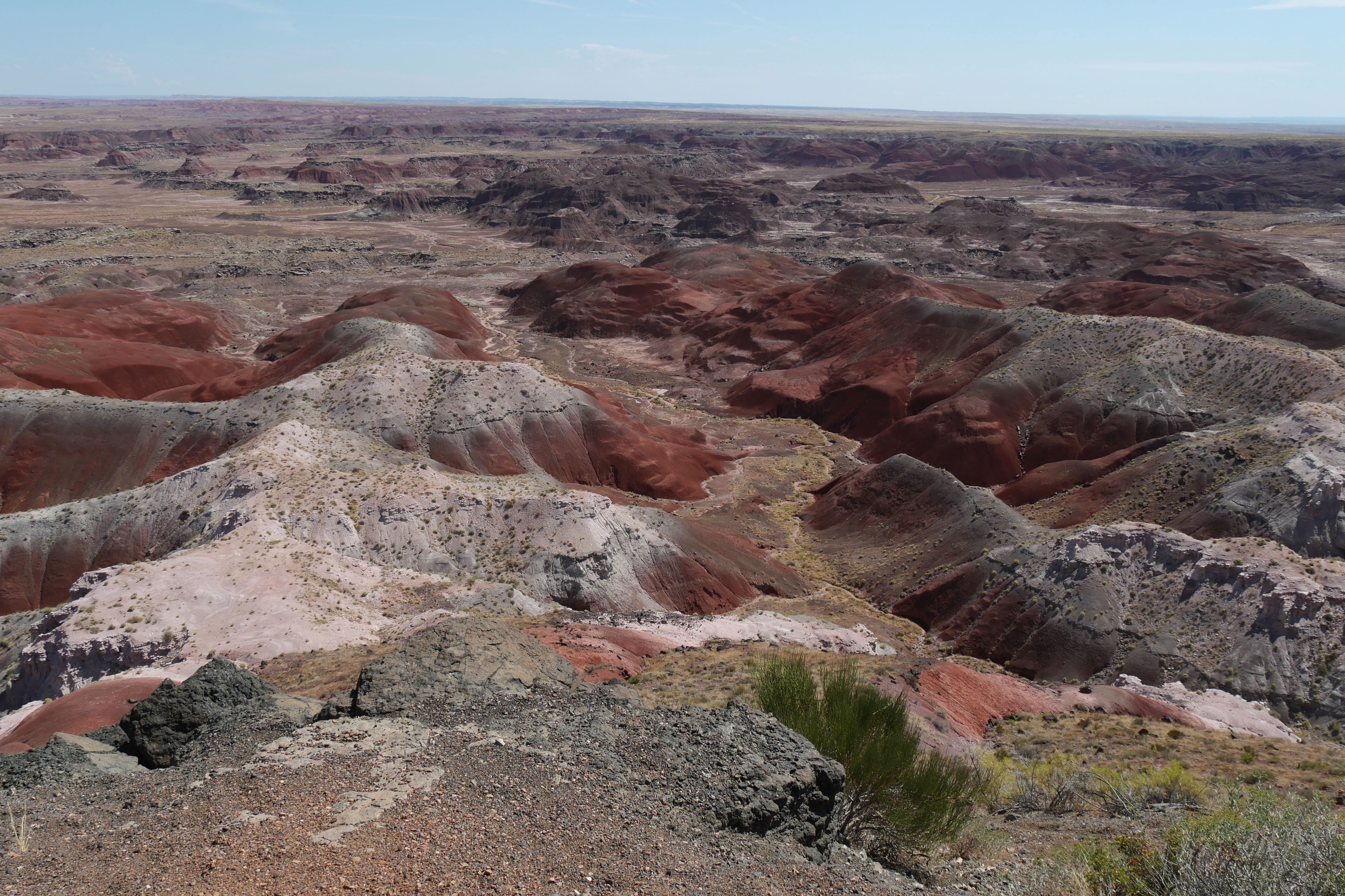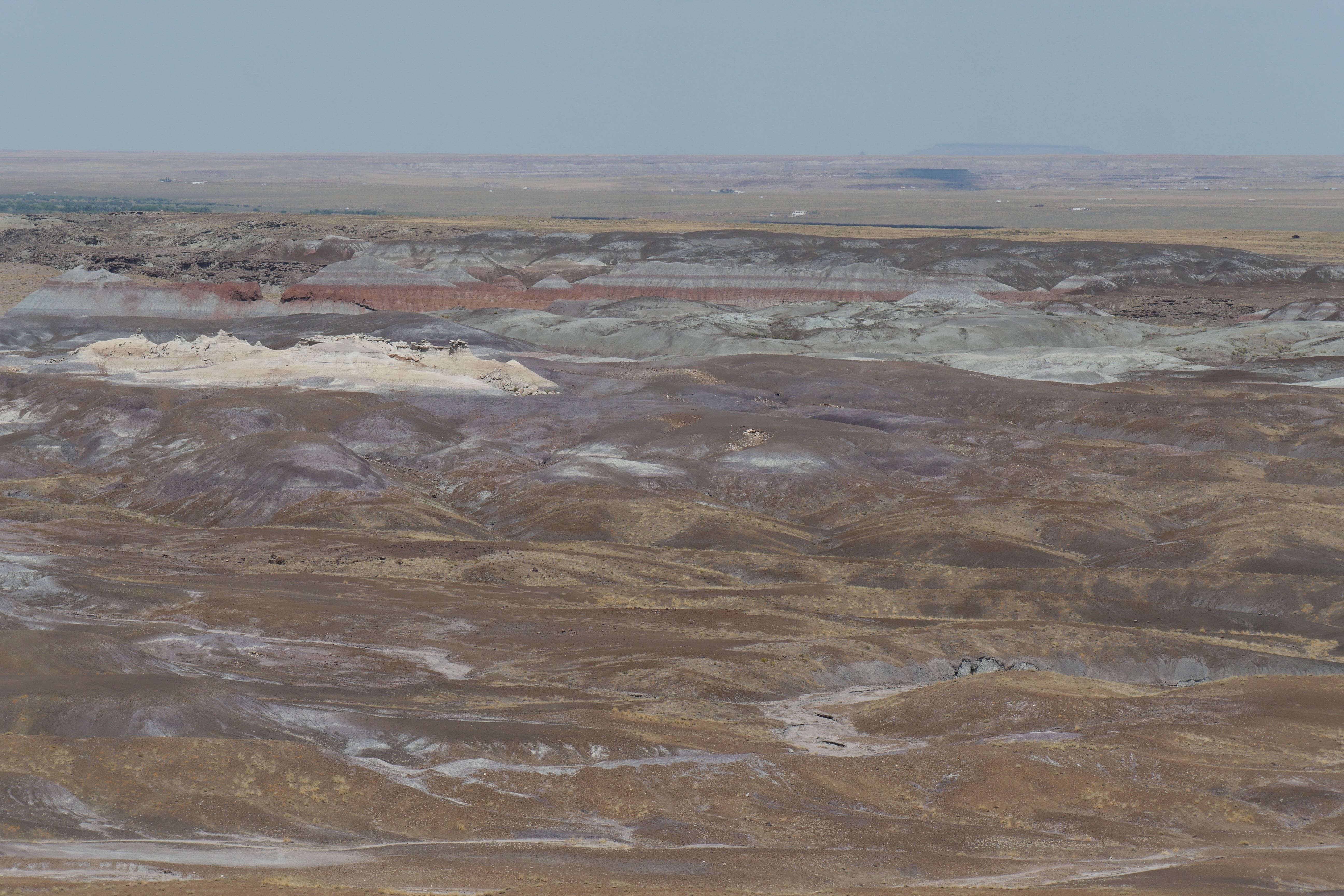 En arrivant à proximité du parc, nous prendrons d’abord la direction Nord vers Painted Desert. A noter que dès l’entrée dans le parc, il est clairement expliqué qu’il est interdit de collecter des morceaux de bois pétrifié et qu’une fouille du véhicule pourra être effectuée par un ranger à la sortie. Inutile donc de tenter le diable, surtout que l’idée est de favoriser la préservation de ces zones afin de permettre aux générations futures d’en profiter comme nous l’avons fait aujourd’hui. Cette première zone offre des panoramas à perte de vue et aux couleurs saisissantes. Il est possible de faire une petite randonnée le long du Painted Desert Rim Trail pour rejoindre Kachina Point depuis Tawa Point ou inversement. Pour notre part, nous ne ferons ces arrêts qu’en voiture, faire cette partie en aller-retour, le long de la route, à pied n’apportant pas grand chose. Nous ferons de même à Tiponi Point.