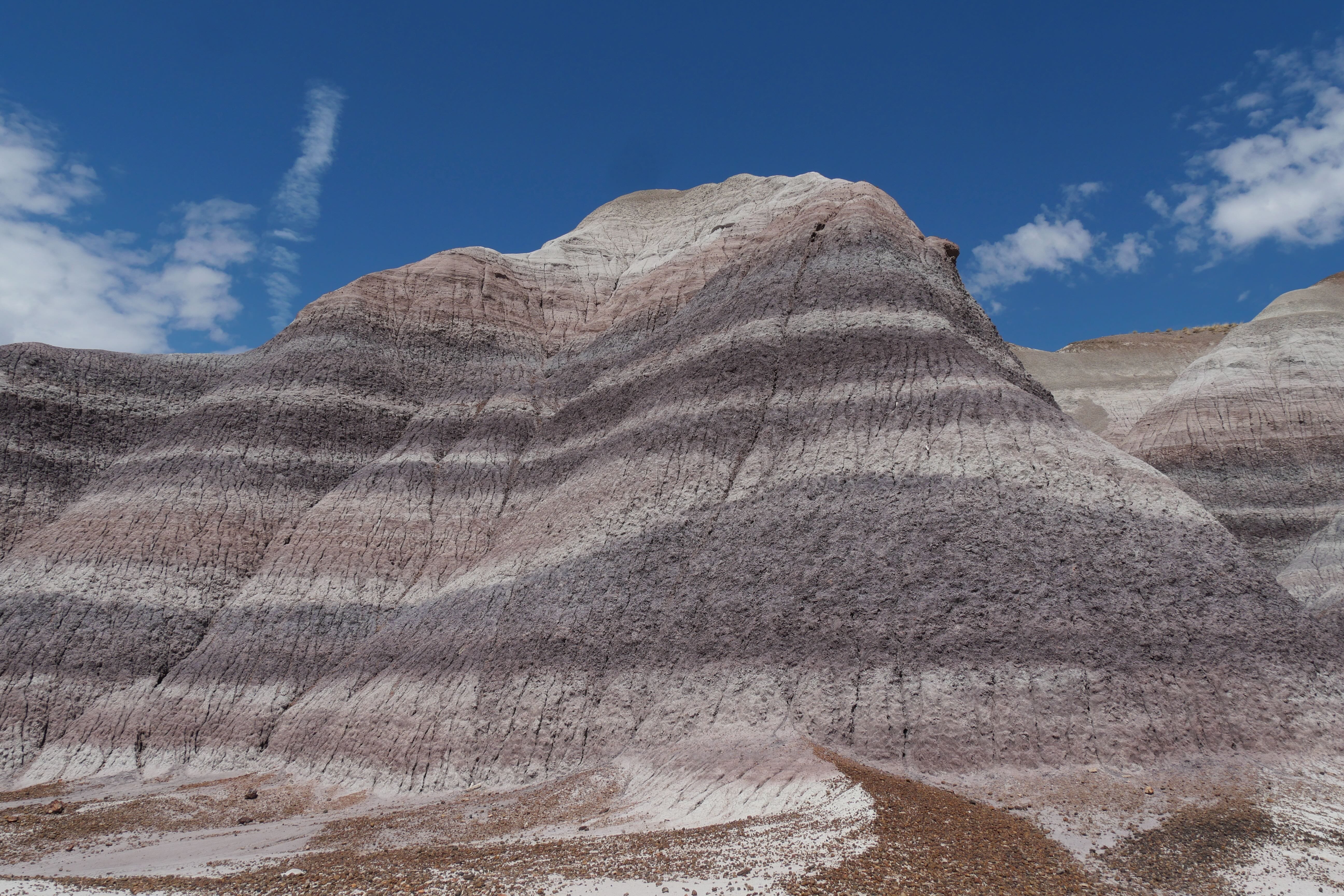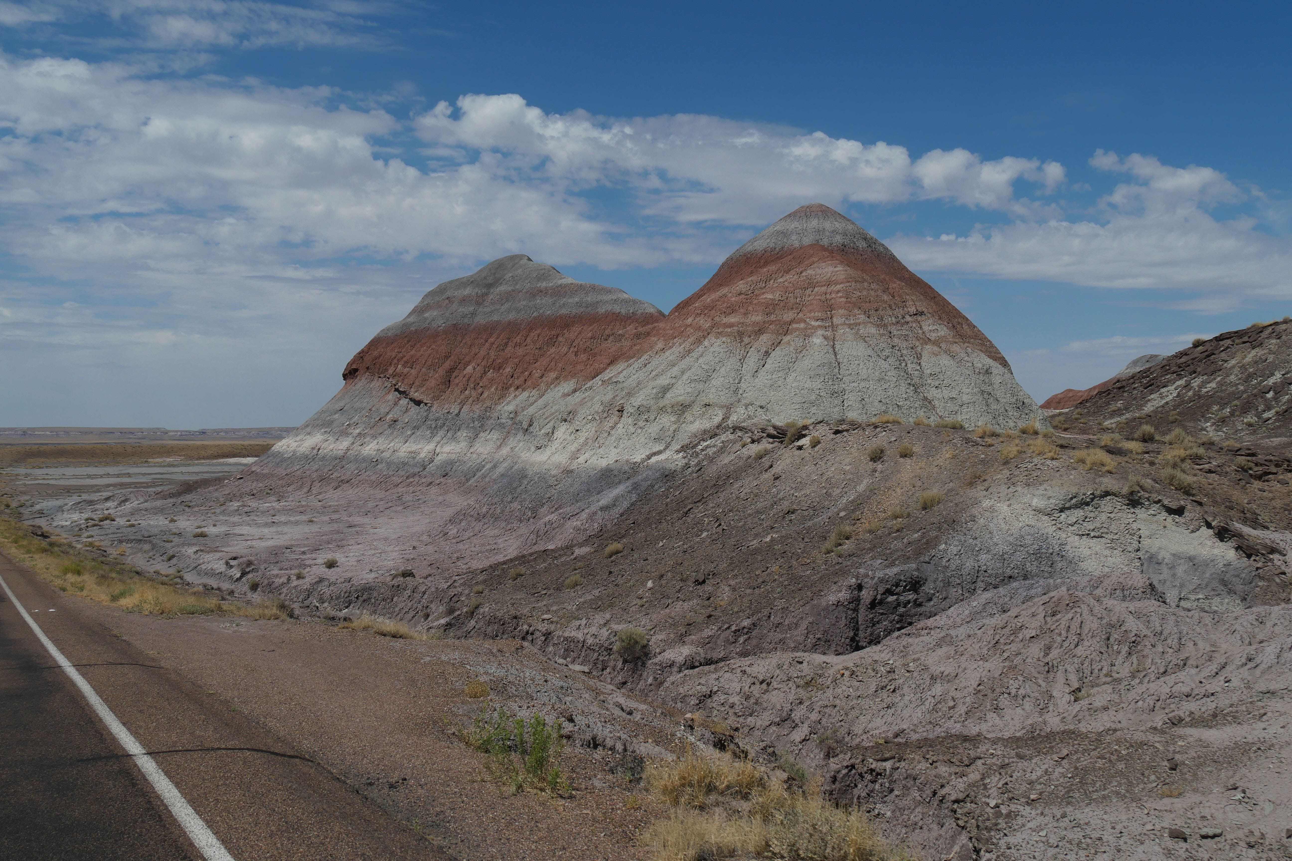 L’intérêt principal d’un parc comme Petrified Forest, ce sont justement les arbres qui avec le temps, et certaines conditions spécifiques, ont fini par se transformer en pierre. On y trouve une très grande concentration de ces arbres pétrifiés qui datent de plusieurs millions d’années. C’est en parcourant le Blue Mesa Trail que nous apercevrons les premiers spécimens. La randonnée est assez courte et plutôt facile, si on fait abstraction de la pente ardue qu’il faudra descendre pour rejoindre la partie principale du trail (sans oublier de devoir la remonter à la fin) et de la chaleur omniprésente à cette période. Comme d’habitude dans les parcs nationaux, allez y bien équipés et préparés et tout se passera bien. On appréciera, ici, les paysages aux dégradés bleus et violets ainsi que les centaines de troncs pétrifiés aux nuances indescriptibles, et on se souviendra de la totale quiétude qui y régnait, étant, le temps de la visite presque seuls au monde.