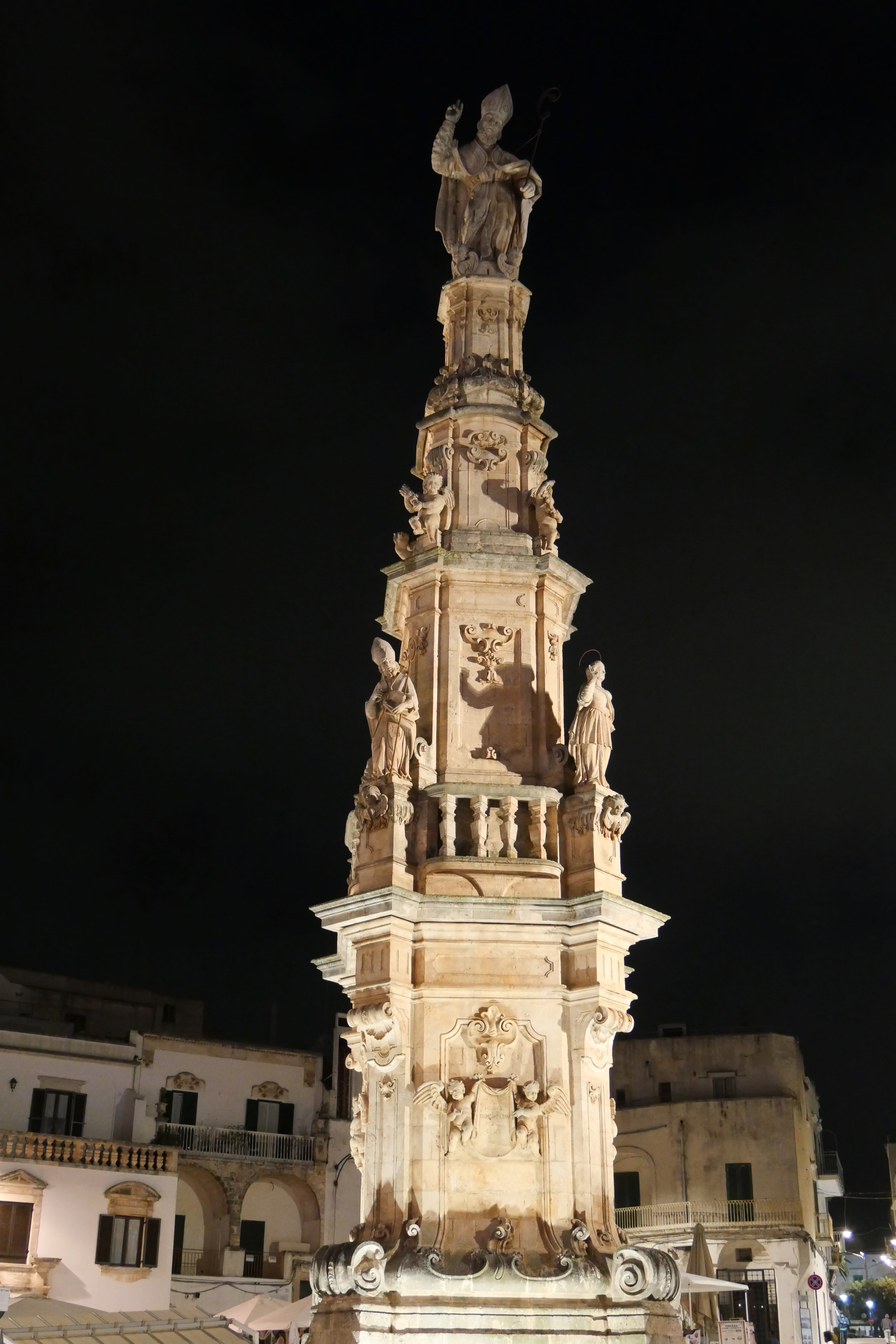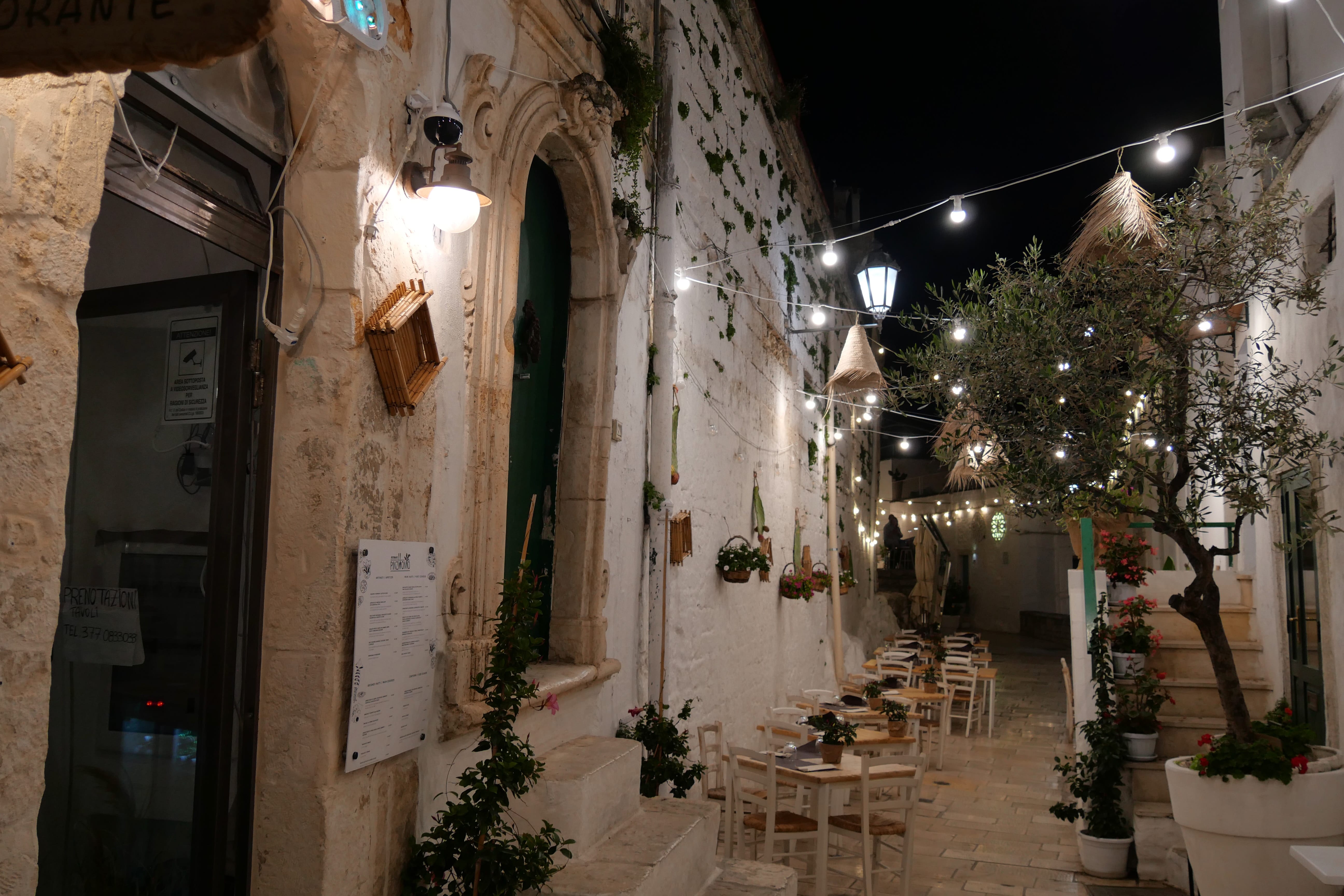 Ostuni, c’est une ville à quelques kilomètres de la mer, perchée sur une colline, dont le plein cœur se mérite en arpentant ses petites ruelles qui n’en finissent jamais de monter, et ce dès la Colonna di Sant’Oronzo, qui marque la fin des rues et le début des petites ruelles où seules les plus petites voitures des locaux accèdent facilement. Depuis le perron de l’hôtel, nous apercevions la cité blanche comme on la surnomme, à la fois proche et loin, ne sachant pas trop estimer la distance qui nous en séparait. C’est finalement quelques centaines de mètres pour en rejoindre la zone piétonne, qui remonte plus ou moins doucement vers le Duomo di Santa Maria Assunta. On n’y a finalement pas passé beaucoup de temps, mais on a apprécié la vue qu’elle offrait sur la campagne environnante, et sur la mer en contrebas, au loin. Plusieurs restaurants ou bars offrent d’ailleurs la possibilité de boire un verre dans une configuration un peu atypique de terrasses sur différents niveaux. Nous avons, de notre côté, opté pour un restaurant un peu plus traditionnel, Pinzimonio, très sympathique au final.