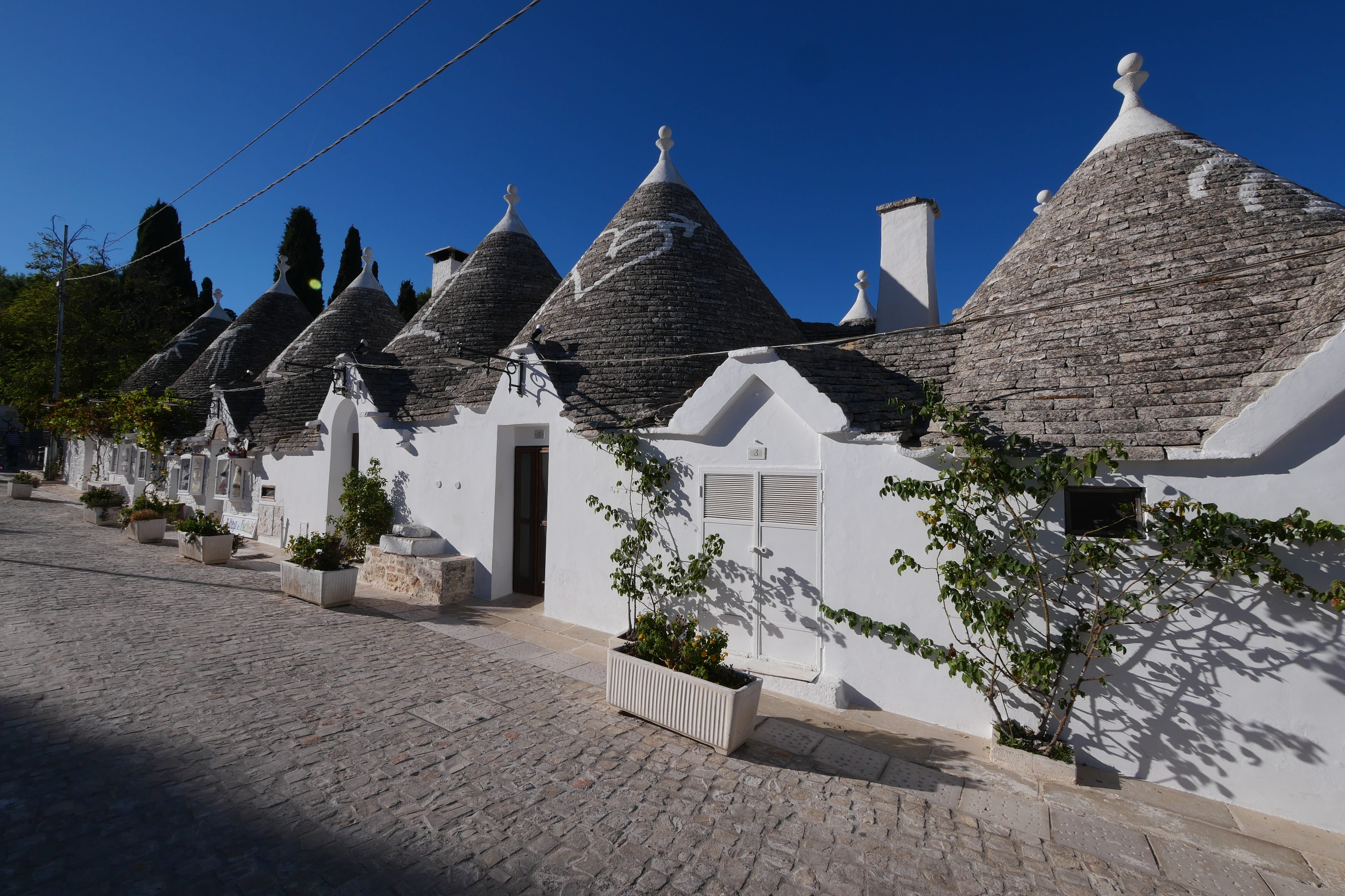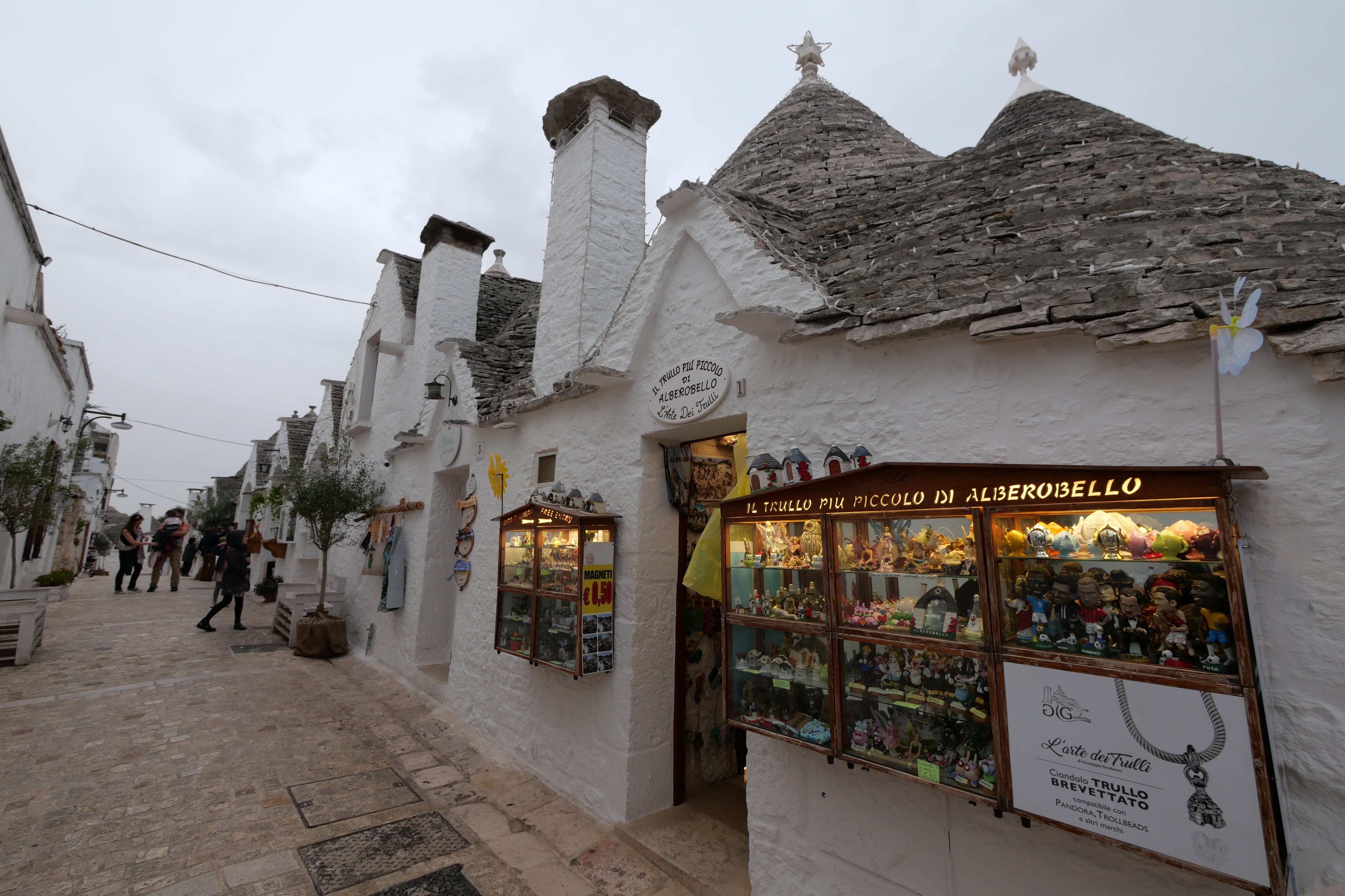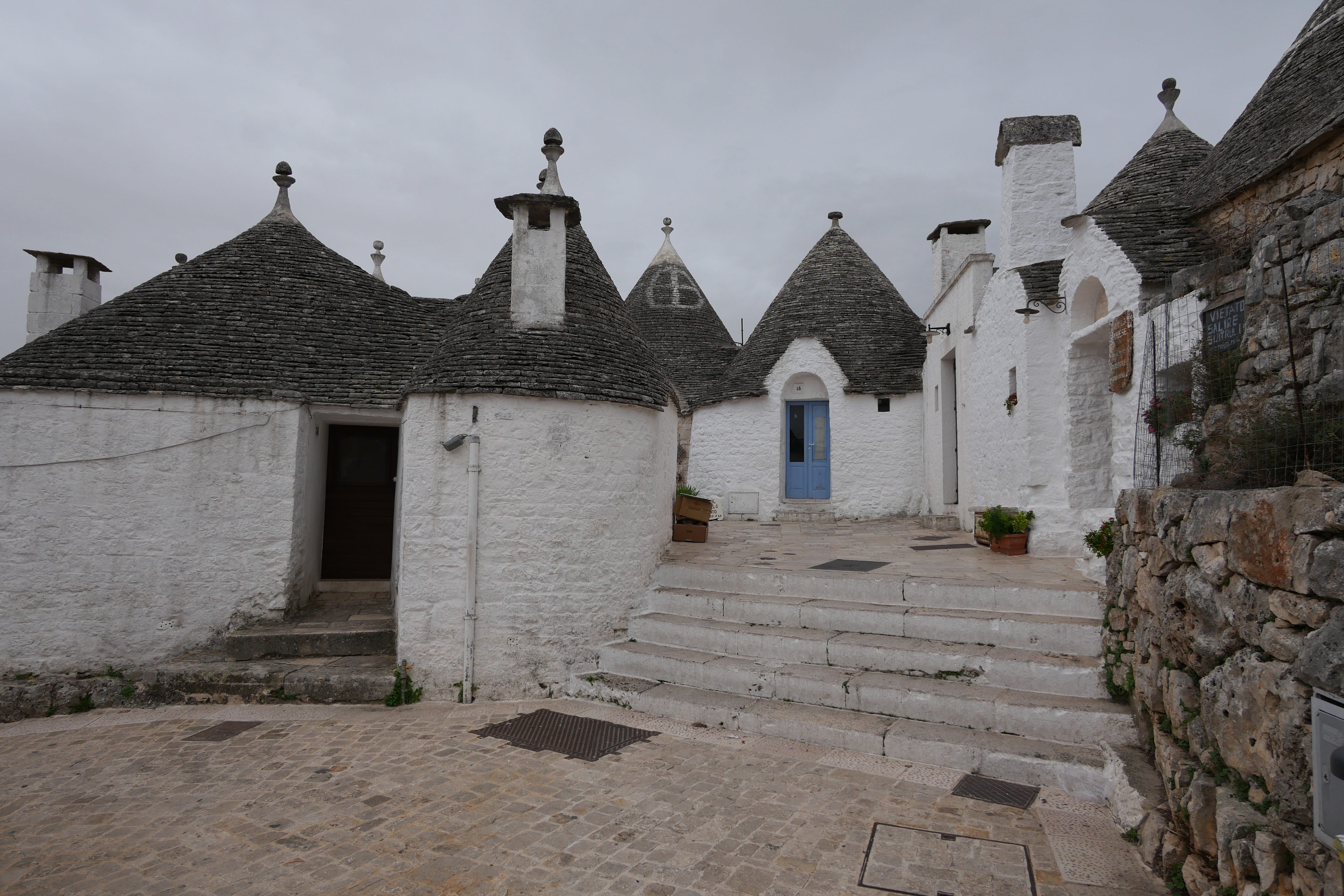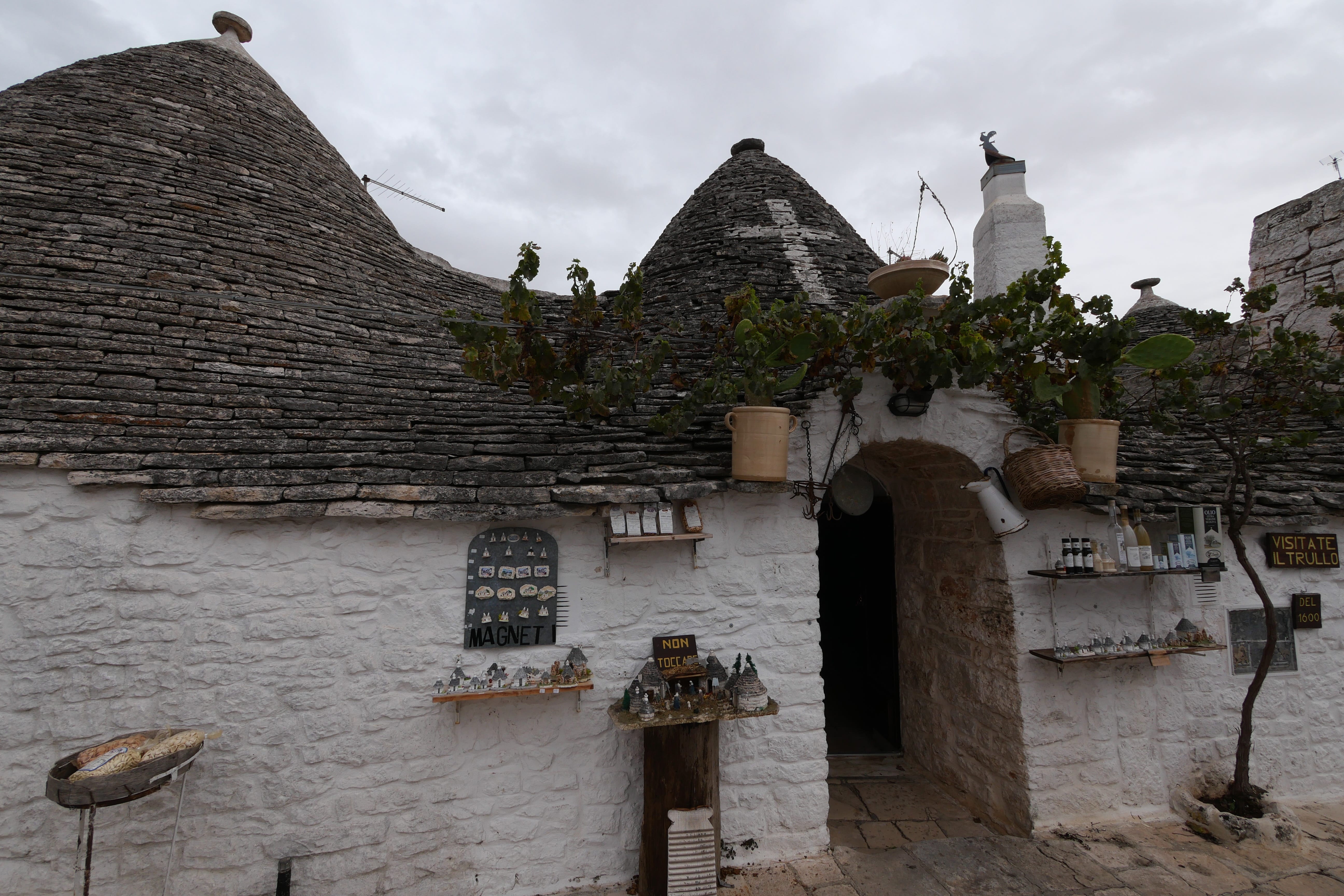 Les trulli sont des habitations en pierres calcaires typiques des Pouilles. Les toits sont reconnaissables par leur formes coniques recouverts de plaques calcaires dites en encorbellement. Cela donne donc un contraste entre les pierres de l’habitation, blanchies à la chaux, et les plaques du toit qui sont généralement foncées. Leur forme particulière et leur concentration sur l’espace de quelques rues rendent l’endroit charmant et vous fait vous sentir hors du temps. Nous en ferons une première approche très rapide, un déluge de pluie s’abattant sur nous au bout de quelques minutes. La météo ne prévoyant pas de s’éclairer ce jour-là, nous abrègerons notre visite pour mieux revenir quelques jours plus tard sous un grand soleil. Certains trulli permettent un accès à leur « terrasse panoramique ». Malheureusement, tous les accès étaient fermés quand nous y étions. Et chaque trullo rivalise pour attirer les touristes : le plus vieux, le plus petit, le plus beau… Ça reste un endroit extrêmement touristique, de par l’architecture atypique bien sûr, mais aussi parce que beaucoup ont été transformés en boutiques ou restaurants. On y trouve même une chaîne de salon de thé italienne. On a du mal à donner un avis vraiment objectif sur cette visite. Les guides et les réseaux sociaux présentent Alberobello comme un joyau, une ville unique pleine de charme et d’authenticité. La réalité est bien différente et il faut s’y préparer pour ne pas être trop déçu. La zone des trulli n’est pas une ville en elle-même, ce n’en est qu’une toute petite partie. Les touristes sont très nombreux et c’est mission quasi impossible de faire des photos sans personne dessus à moins de s’y déplacer très tôt le matin. C’est effectivement très original et agréable mais il n’y a pas de quoi y passer plus d’une heure ou deux d’après nous.