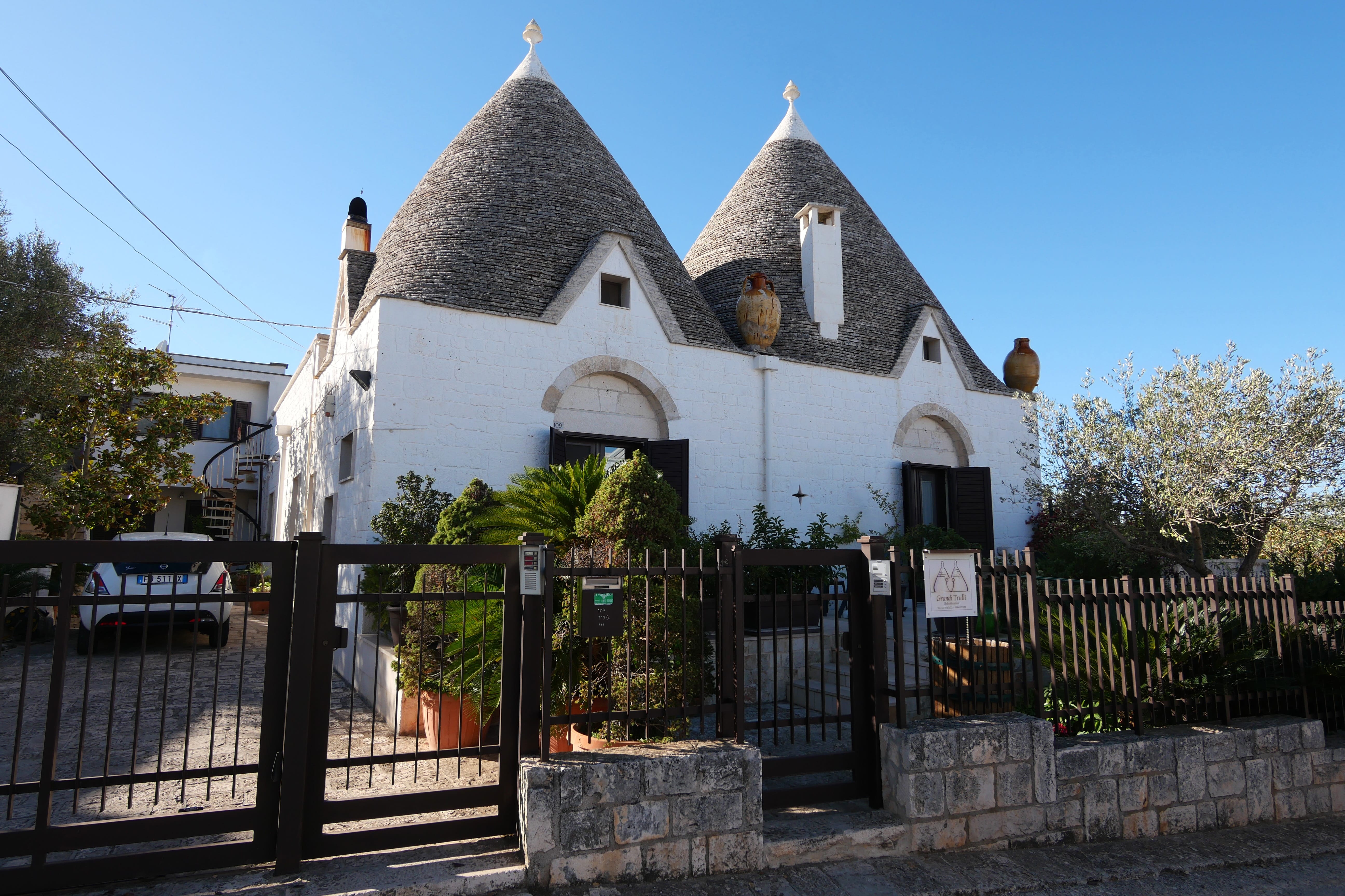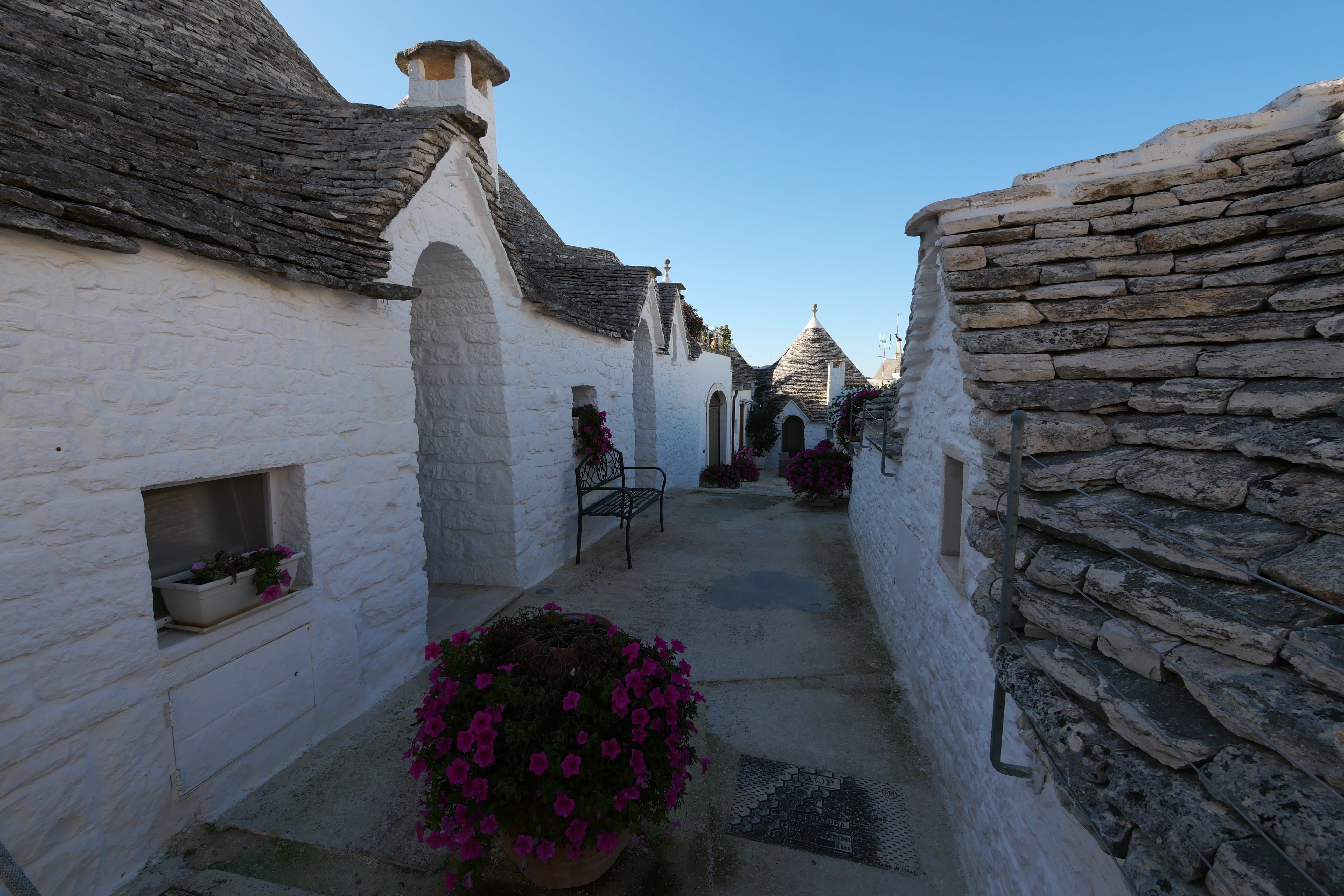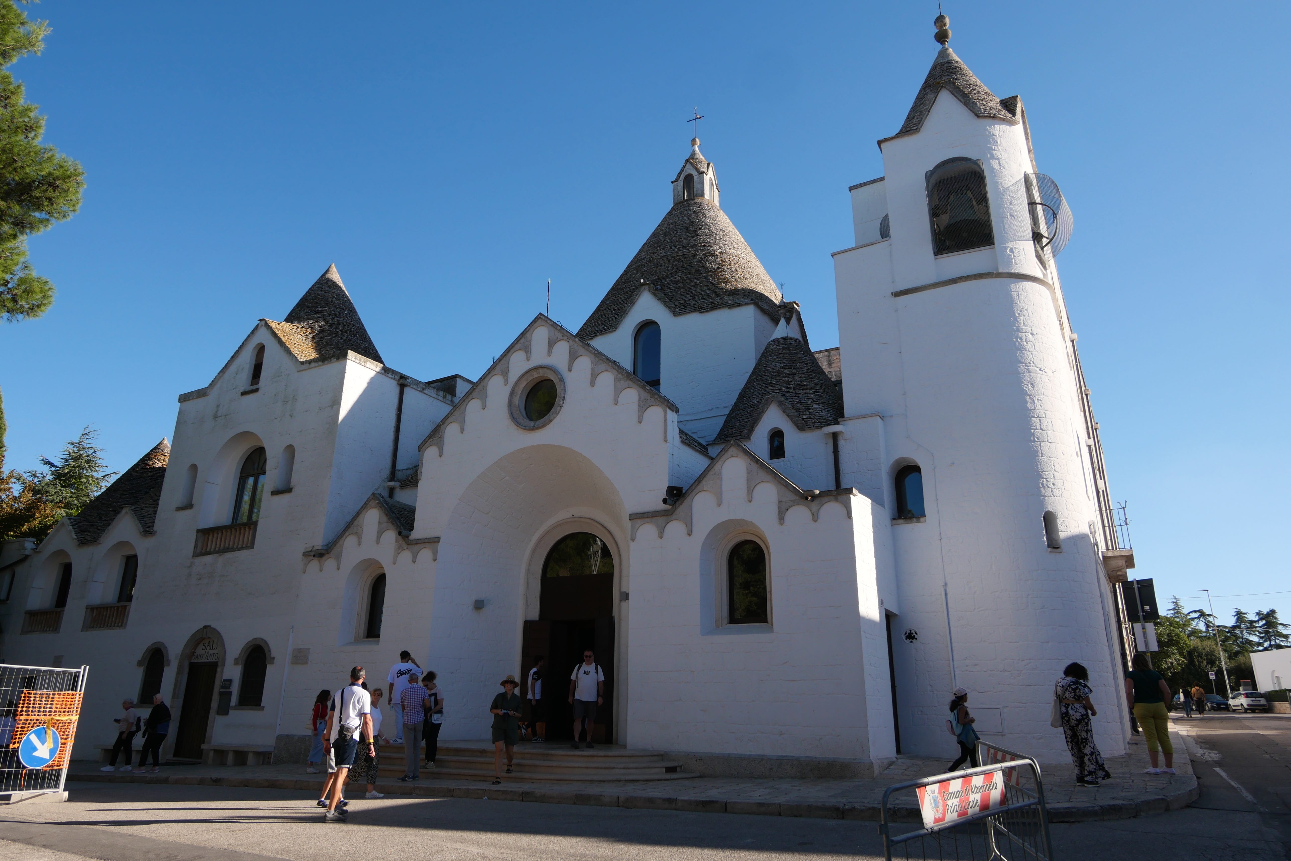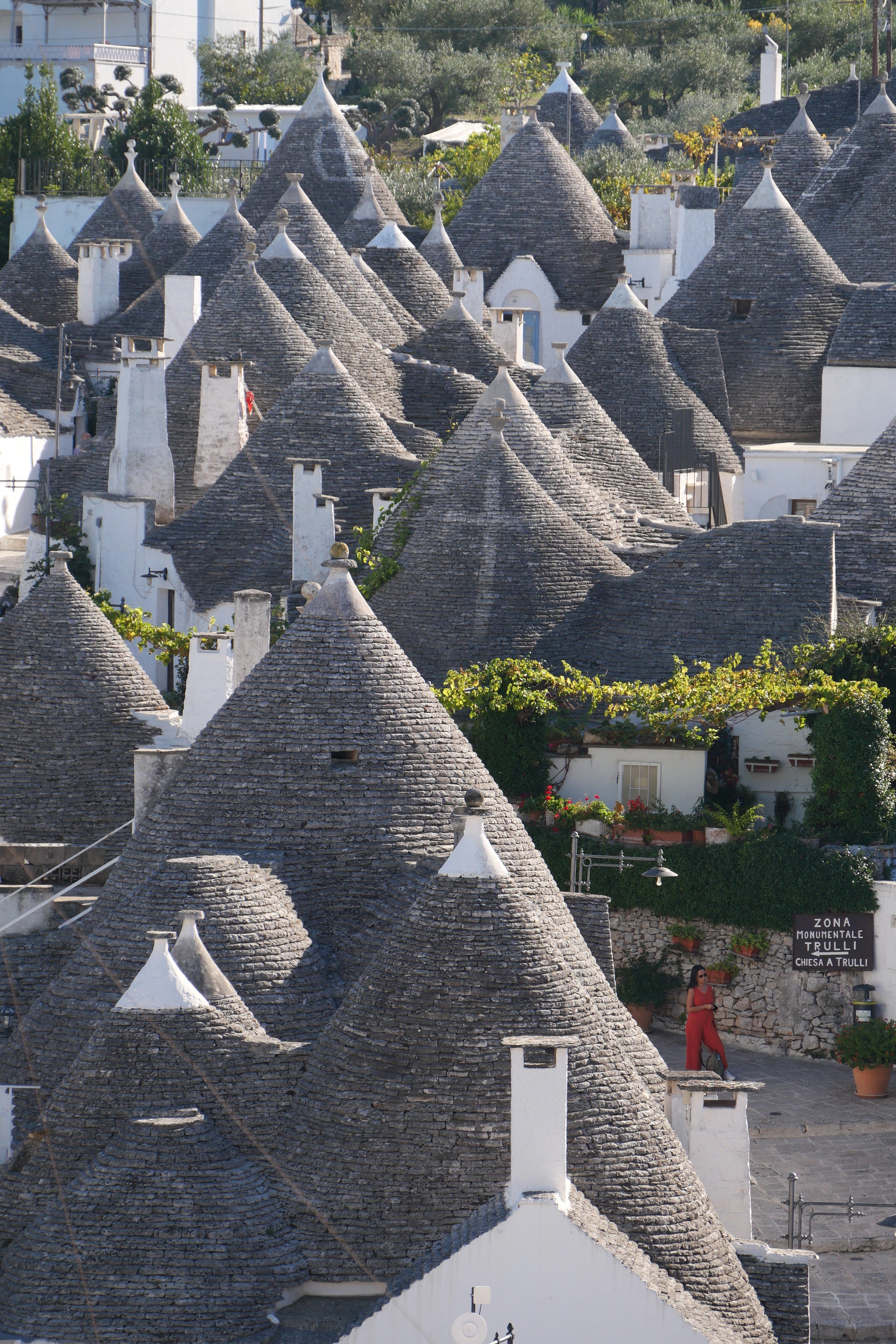 Les trulli sont des habitations en pierres calcaires typiques des Pouilles. Les toits sont reconnaissables par leur formes coniques recouverts de plaques calcaires dites en encorbellement. Cela donne donc un contraste entre les pierres de l’habitation, blanchies à la chaux, et les plaques du toit qui sont généralement foncées. Leur forme particulière et leur concentration sur l’espace de quelques rues rendent l’endroit charmant et vous fait vous sentir hors du temps. Nous en ferons une première approche très rapide, un déluge de pluie s’abattant sur nous au bout de quelques minutes. La météo ne prévoyant pas de s’éclairer ce jour-là, nous abrègerons notre visite pour mieux revenir quelques jours plus tard sous un grand soleil. Certains trulli permettent un accès à leur « terrasse panoramique ». Malheureusement, tous les accès étaient fermés quand nous y étions. Et chaque trullo rivalise pour attirer les touristes : le plus vieux, le plus petit, le plus beau… Ça reste un endroit extrêmement touristique, de par l’architecture atypique bien sûr, mais aussi parce que beaucoup ont été transformés en boutiques ou restaurants. On y trouve même une chaîne de salon de thé italienne. On a du mal à donner un avis vraiment objectif sur cette visite. Les guides et les réseaux sociaux présentent Alberobello comme un joyau, une ville unique pleine de charme et d’authenticité. La réalité est bien différente et il faut s’y préparer pour ne pas être trop déçu. La zone des trulli n’est pas une ville en elle-même, ce n’en est qu’une toute petite partie. Les touristes sont très nombreux et c’est mission quasi impossible de faire des photos sans personne dessus à moins de s’y déplacer très tôt le matin. C’est effectivement très original et agréable mais il n’y a pas de quoi y passer plus d’une heure ou deux d’après nous.